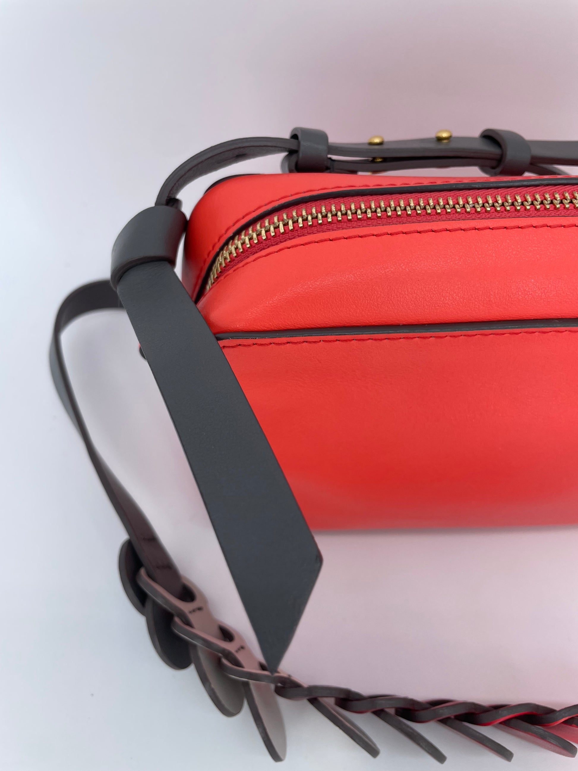 This is a lovely Anya Hindmarch small Circle Camera Crossbody bag in a salmon pink sleek leather (orange/pink) The multicoloured carry strap with circle disk detailing adds interest to this bag. This lightweight and compact cross-body bag can be worn on the shoulder or crossbody.
