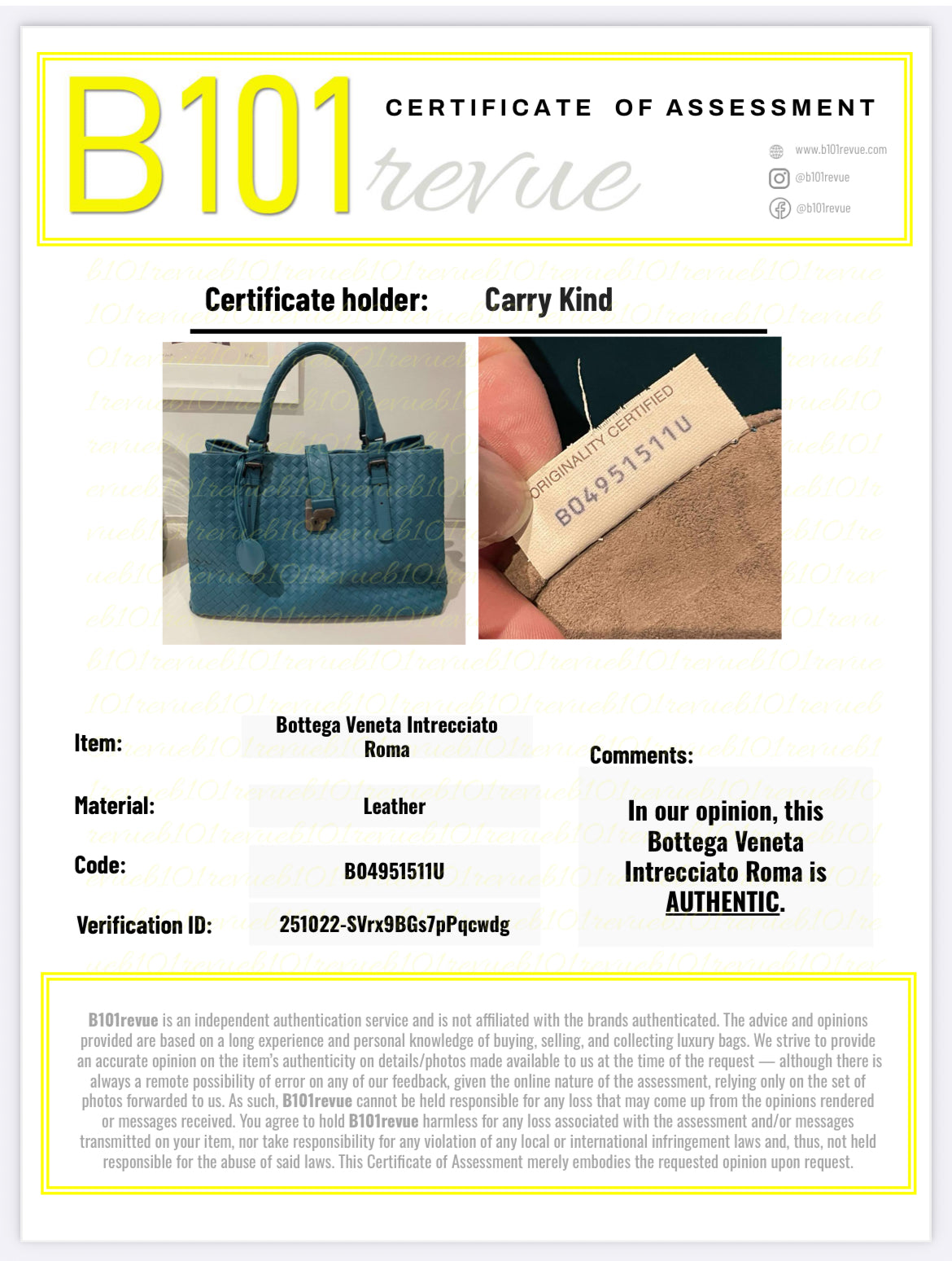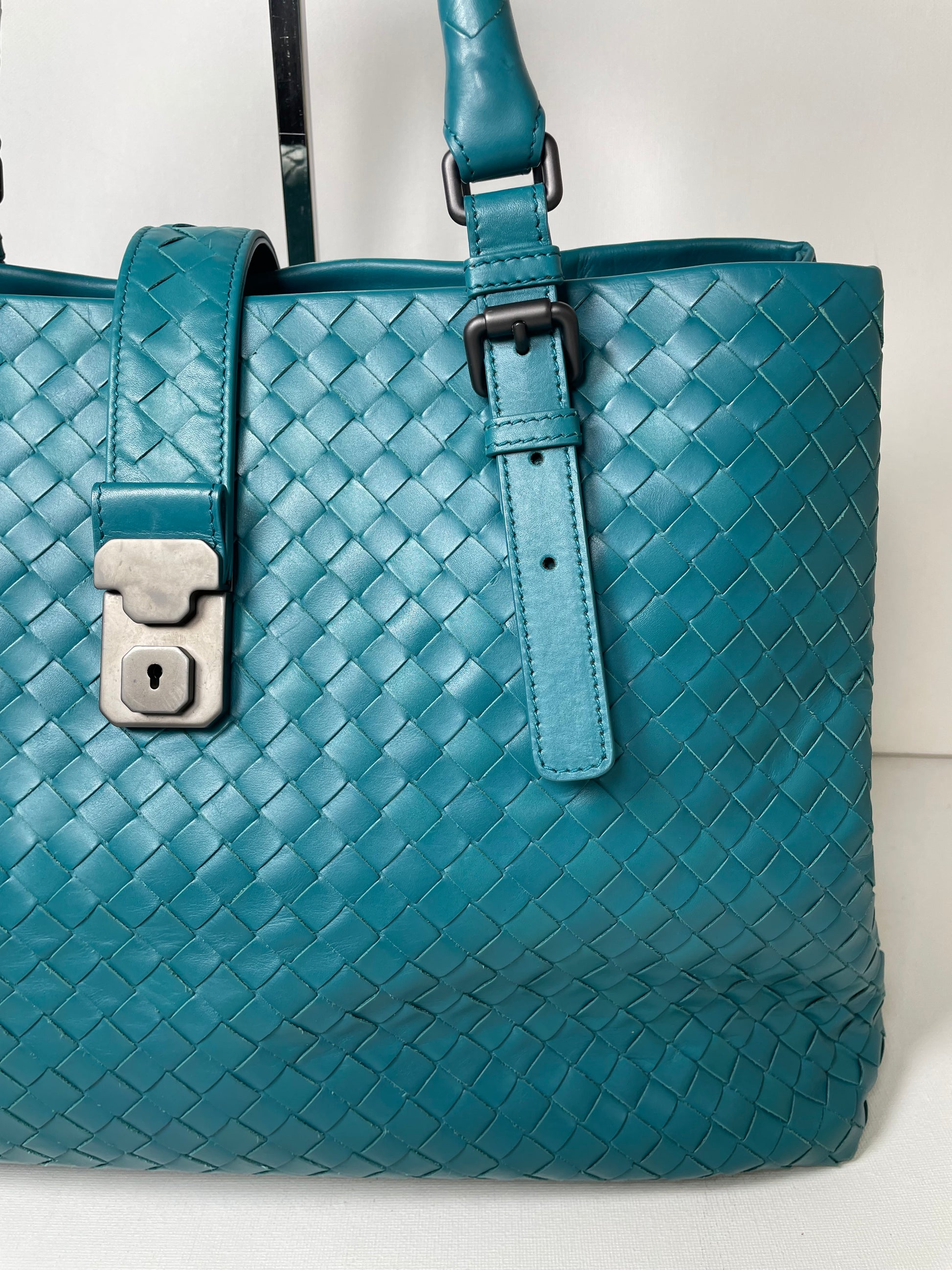 This is a great Bottega Veneta Roma tote. It’s is beautifully crafted from leather and designed in signature Intrecciato pattern while being held by two top handles. The bag is secured with a flap push-lock closure which opens to three suede lined compartments . Adjustable handle drop