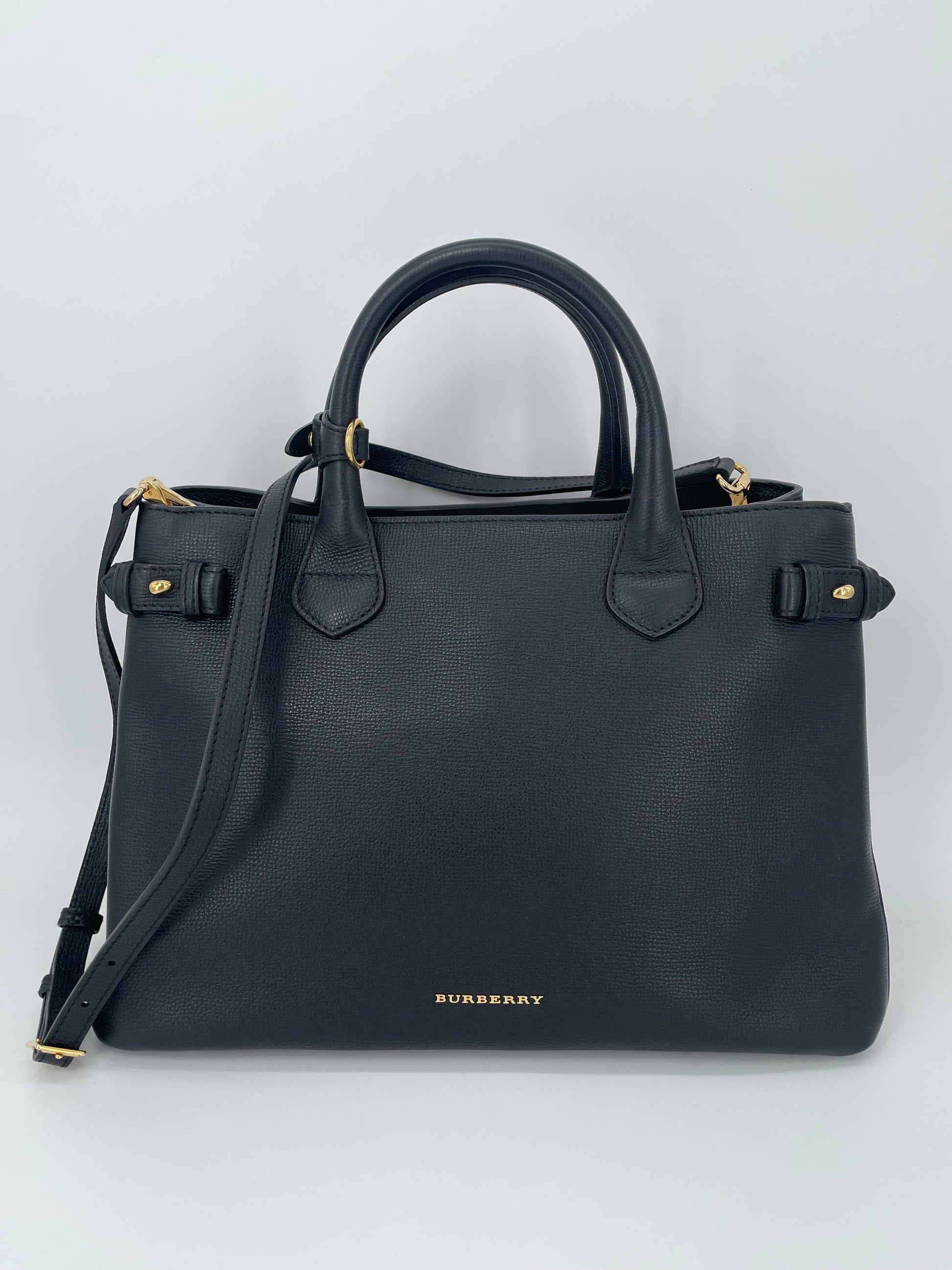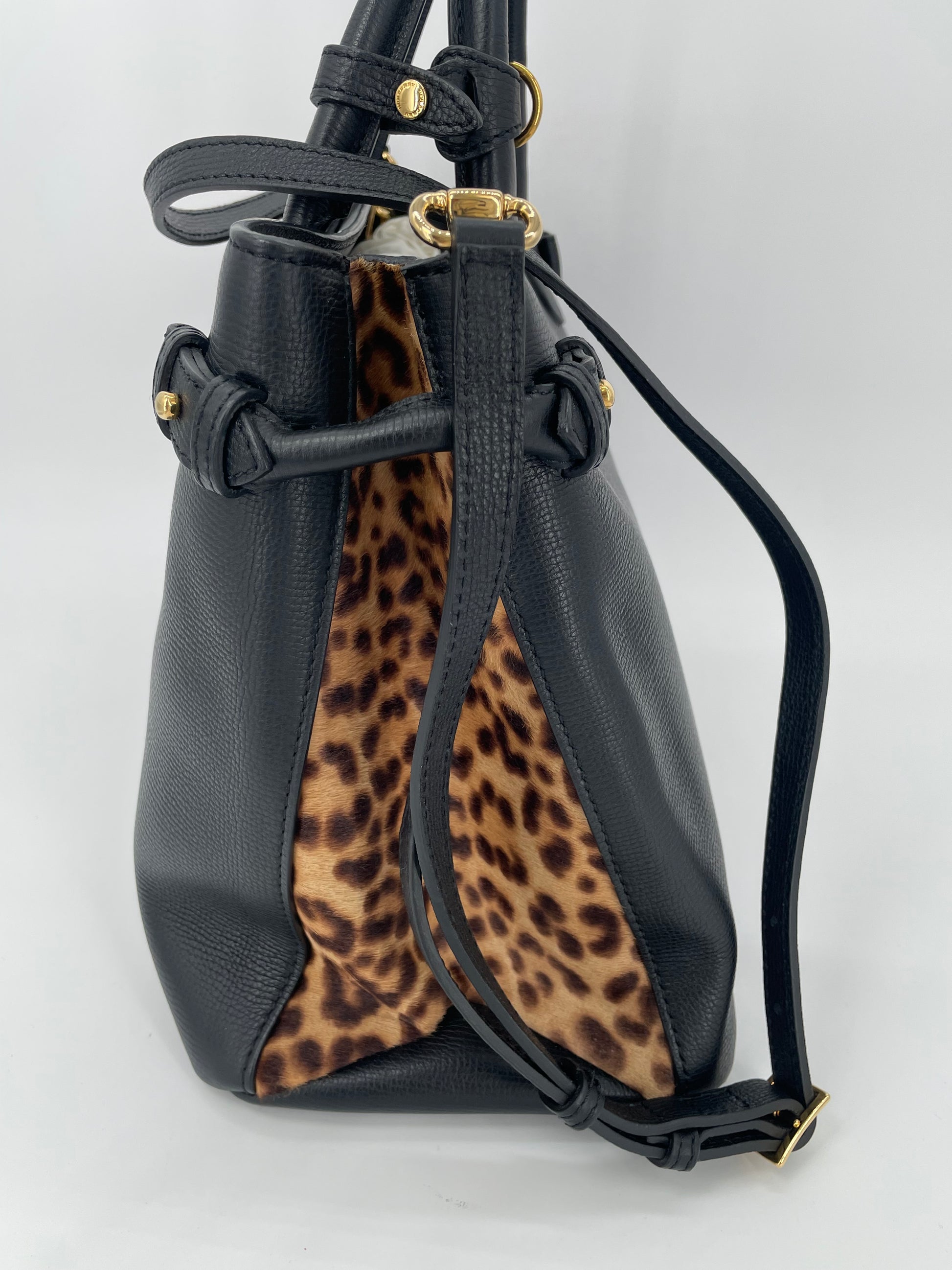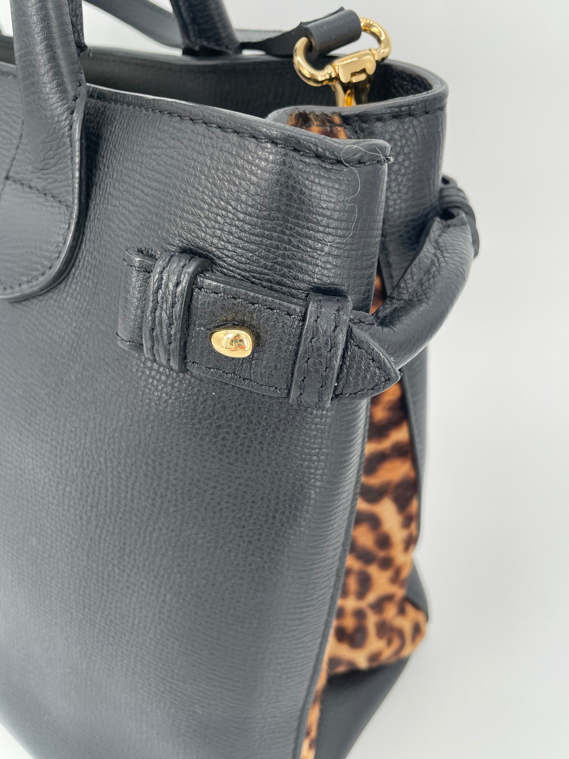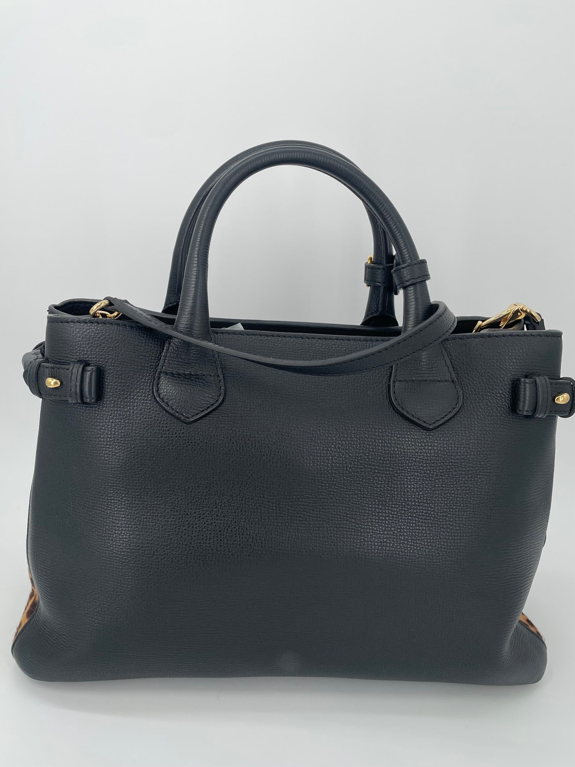 This is a classic and elegant medium Burberry Banner Tote Bag in grainy black leather with Leopard print detailing on the side panels, along with gold tone hardware. The shoulder bag features rolled leather top handles with side belts. There is an optional, adjustable leather shoulder strap which allows it to be carried on the shoulder for hands free convenience. Inside has the iconic fabric lining with 2 open compartments and a central zip pocket. Back zip close pocket and two front slip pockets.