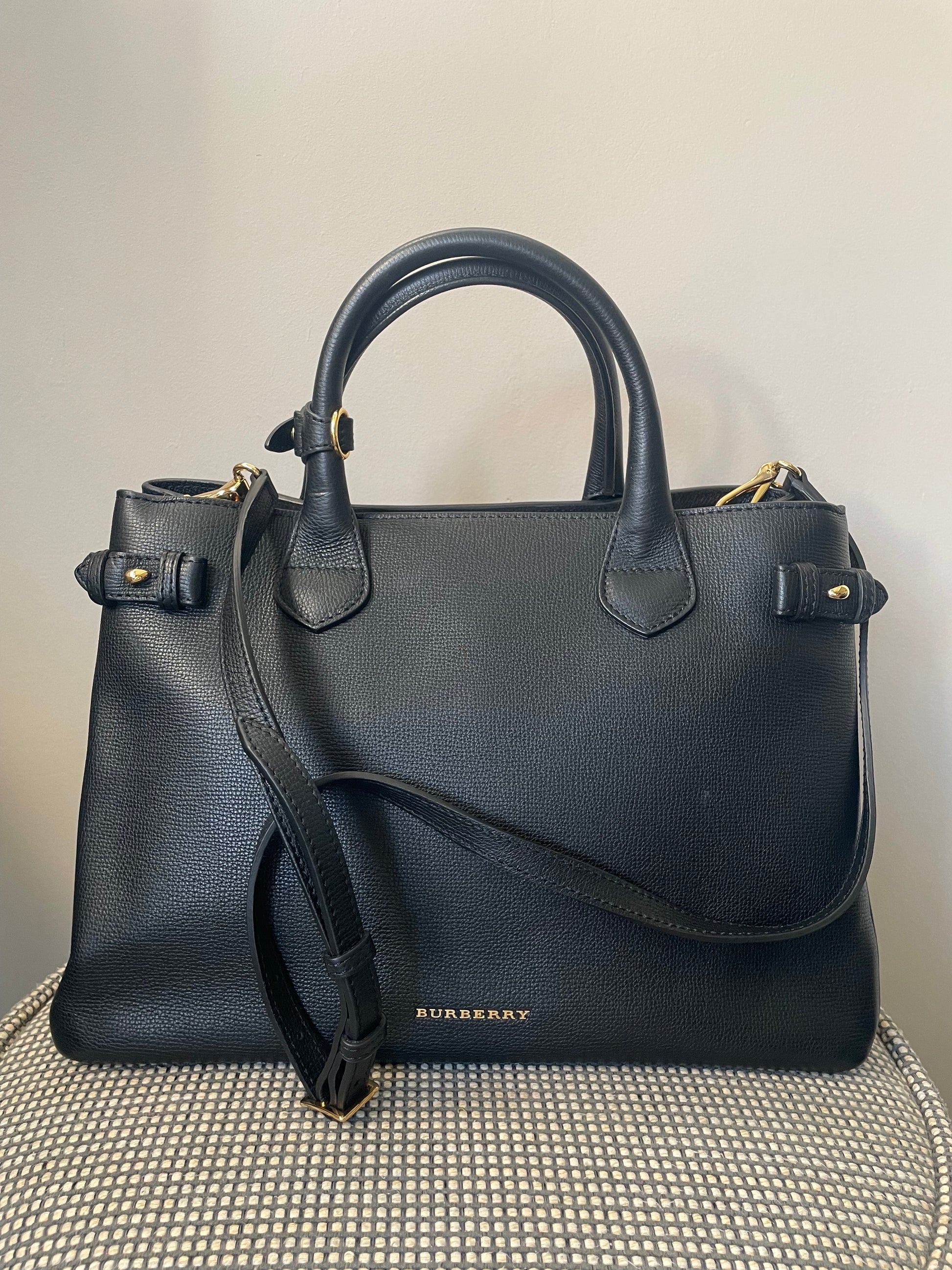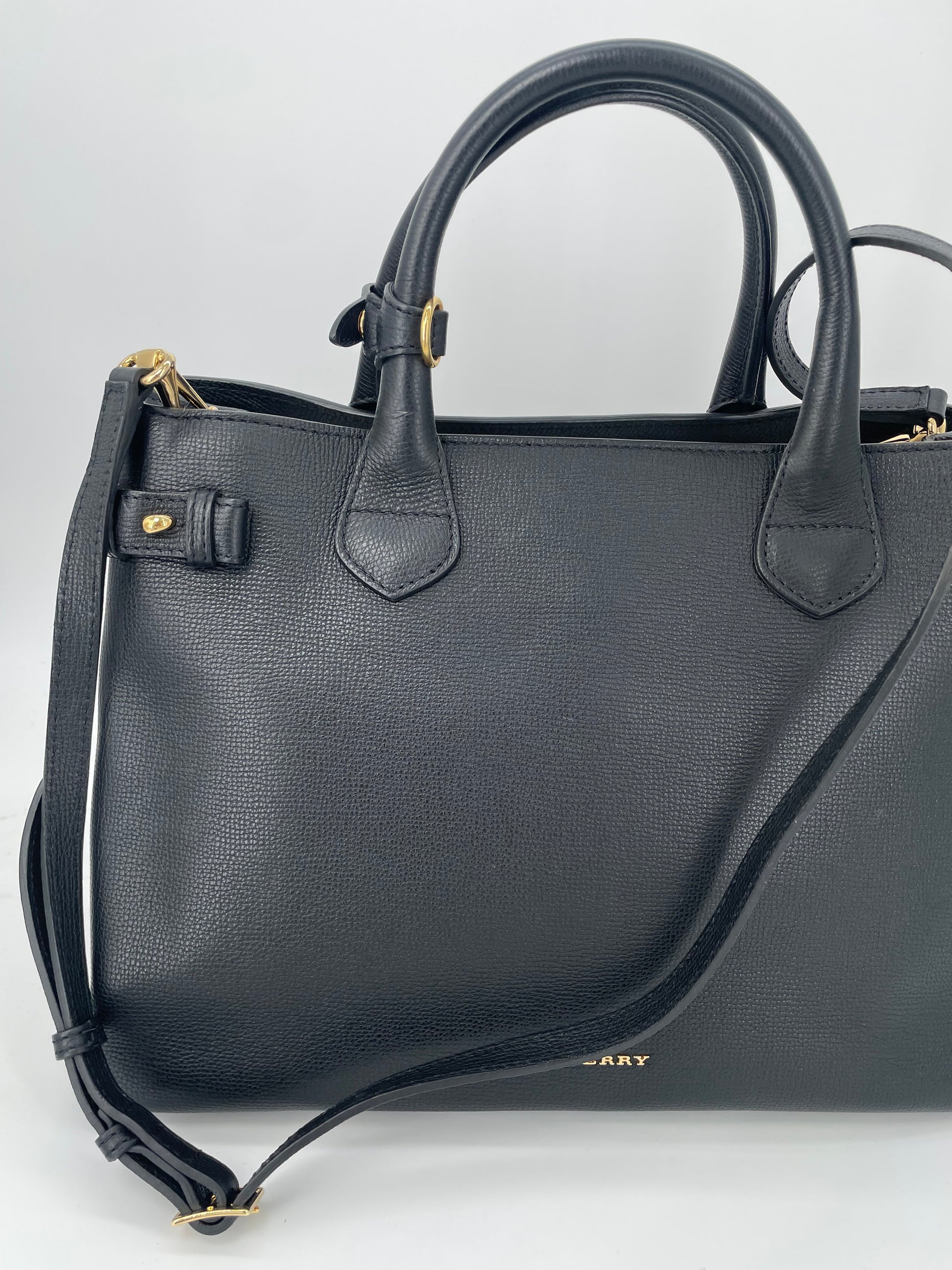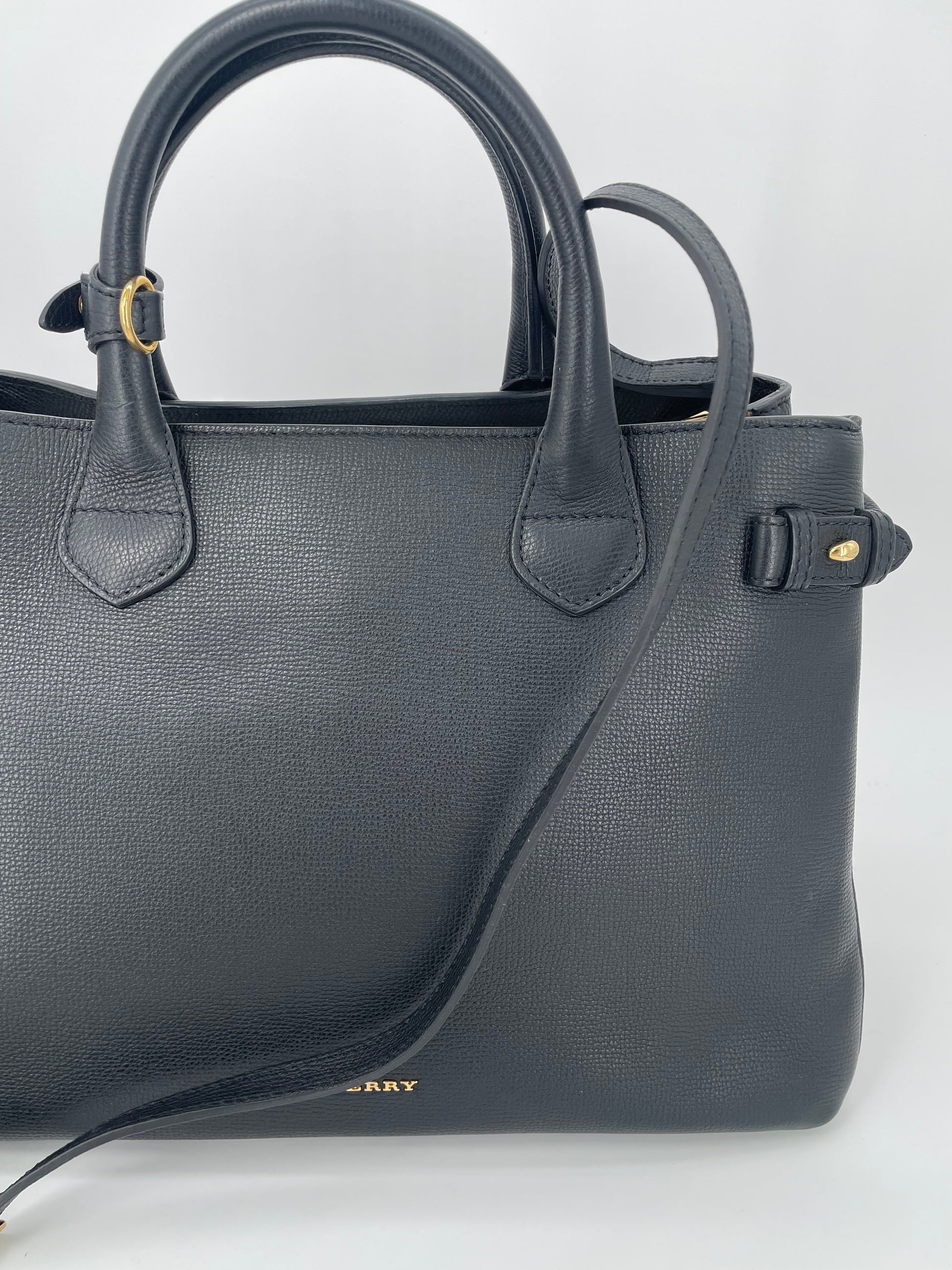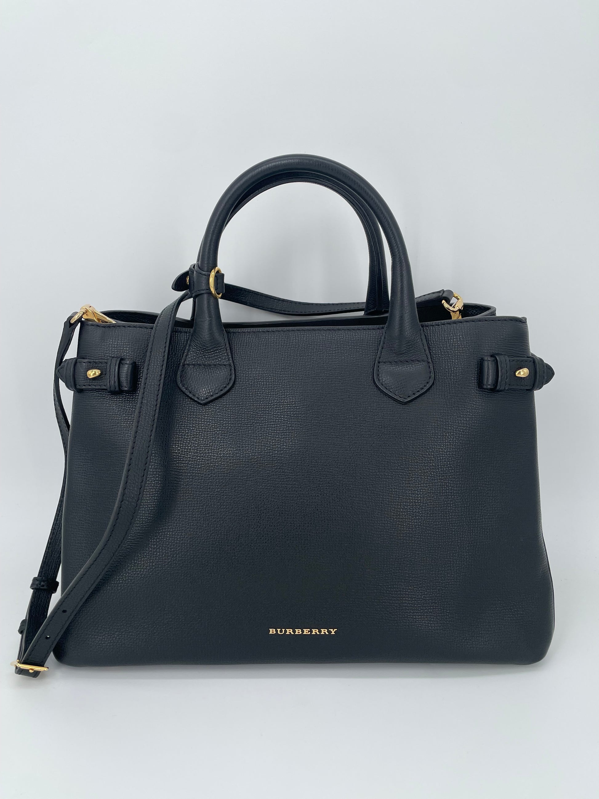 This is a classic and elegant medium Burberry Banner Tote Bag in grainy black leather with Leopard print detailing on the side panels, along with gold tone hardware. The shoulder bag features rolled leather top handles with side belts. There is an optional, adjustable leather shoulder strap which allows it to be carried on the shoulder for hands free convenience. Inside has the iconic fabric lining with 2 open compartments and a central zip pocket. Back zip close pocket and two front slip pockets.