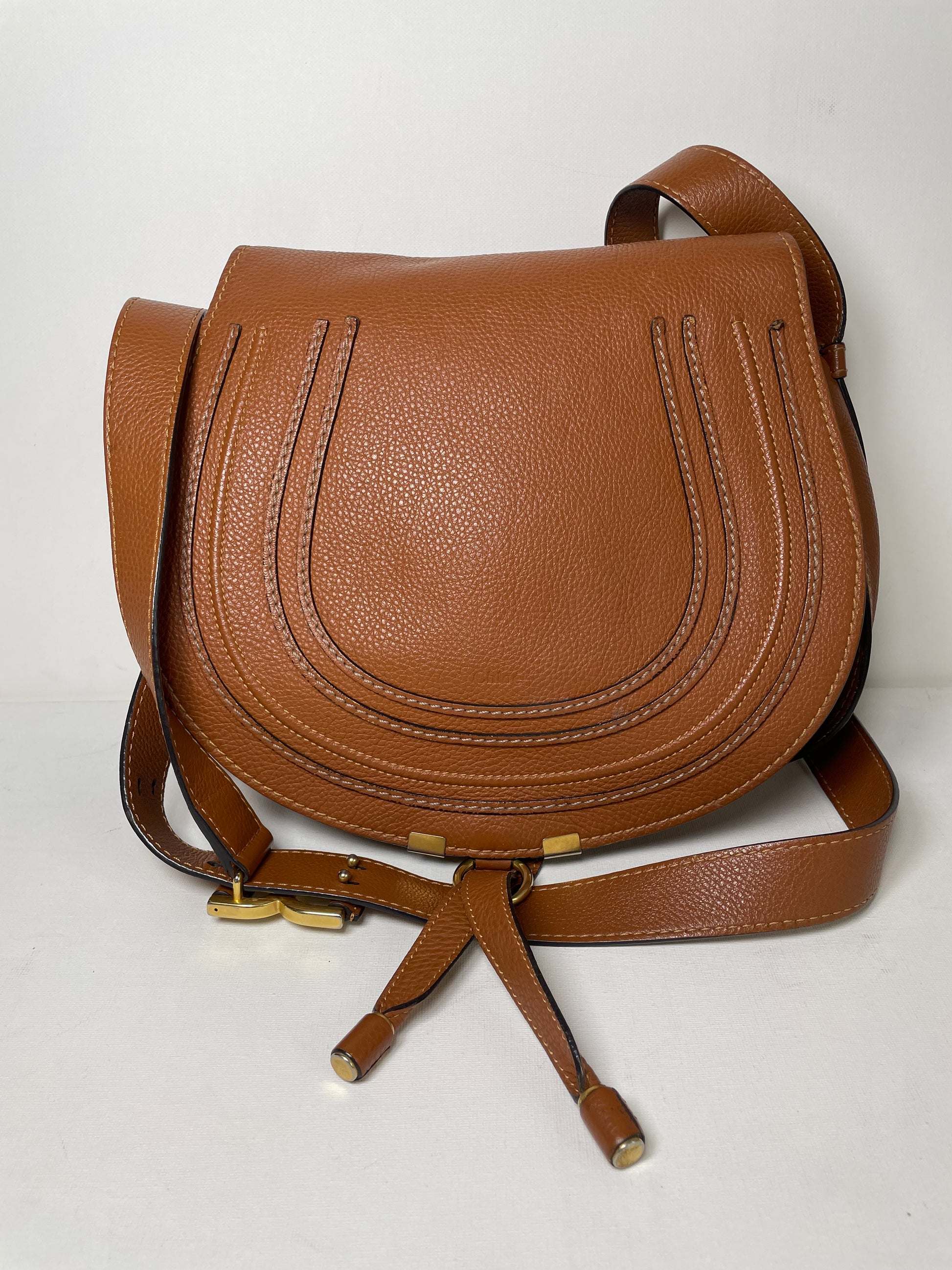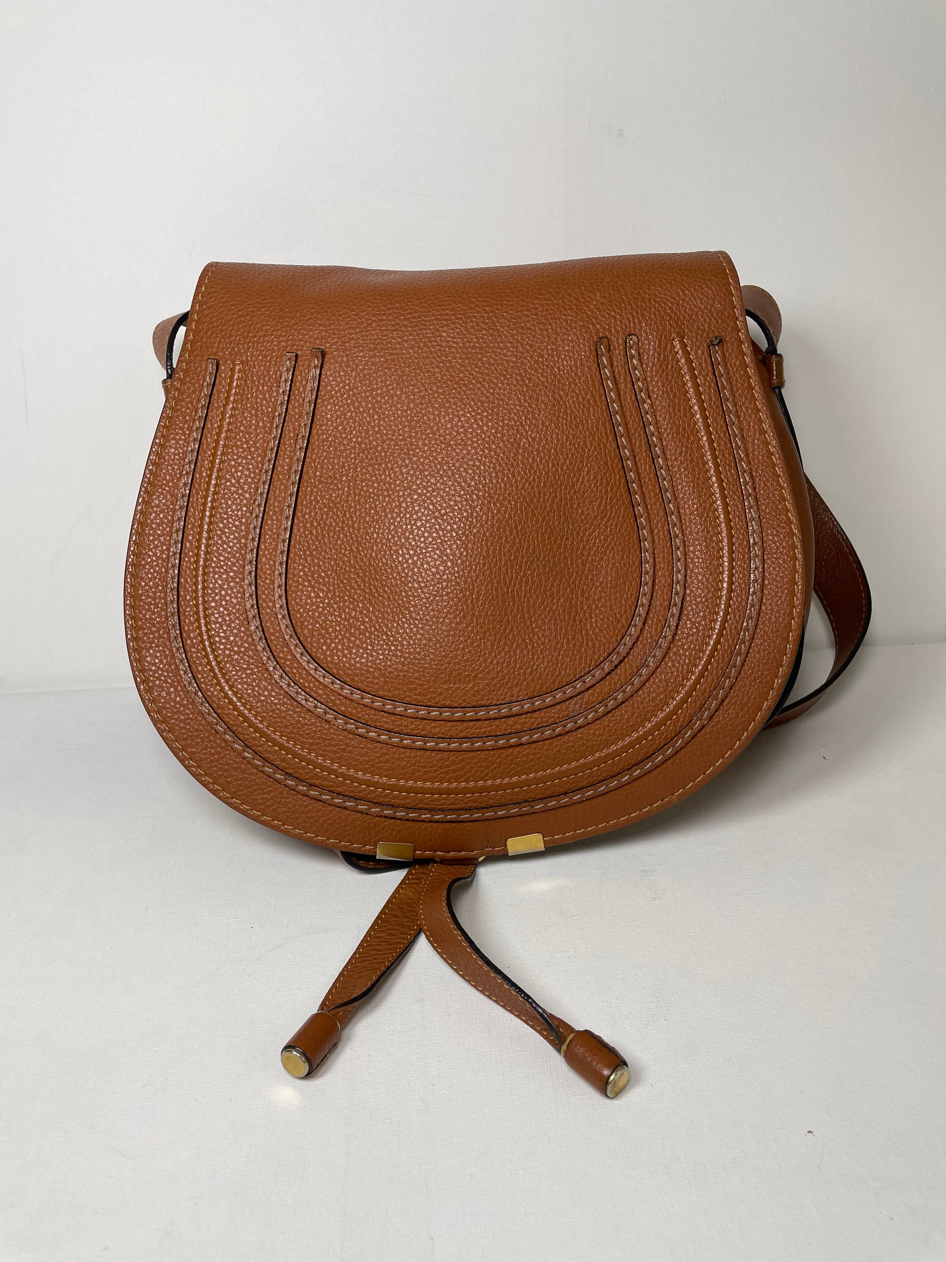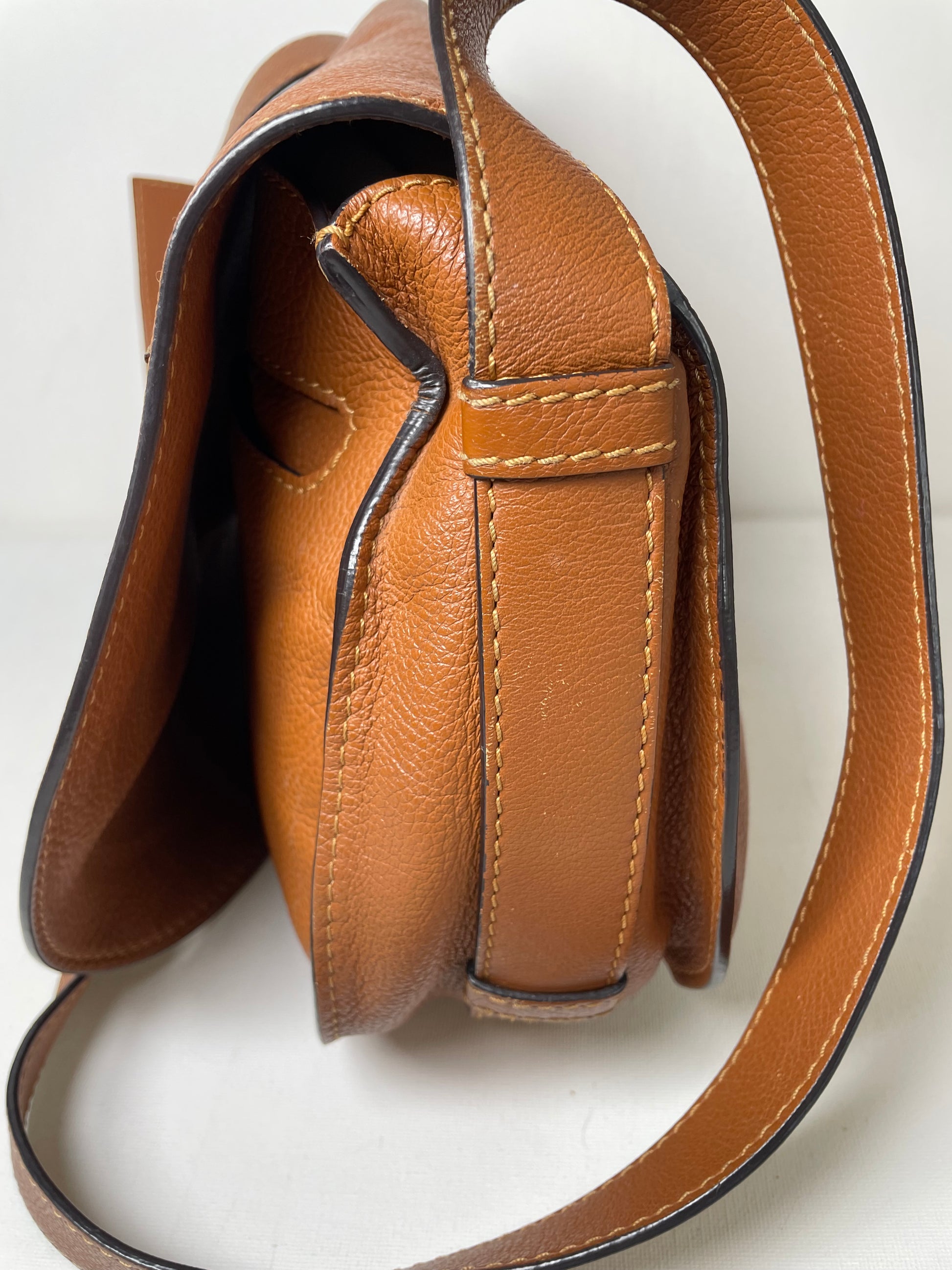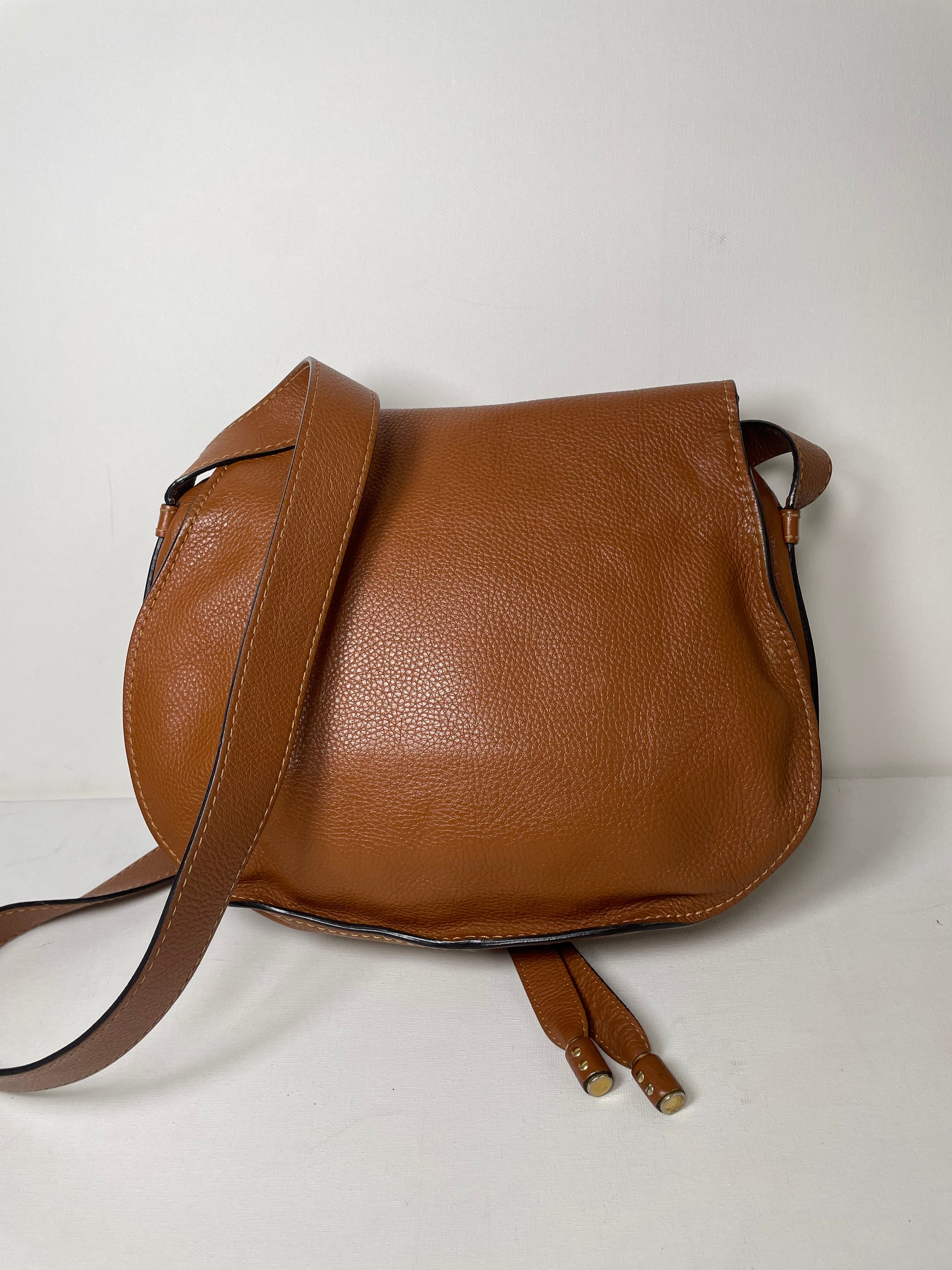 This is a lovely Chloe Marcie Medium Crossbody in a warm Tan brown coloured grainy leather. This crossbody bag features Antiqued goldtone hardware and a horseshoe-stitched flap with a slide-ring tassel closure. The top flap opens to an olive green fabric interior with a slip pocket. Exterior slip pocket under opening flap.