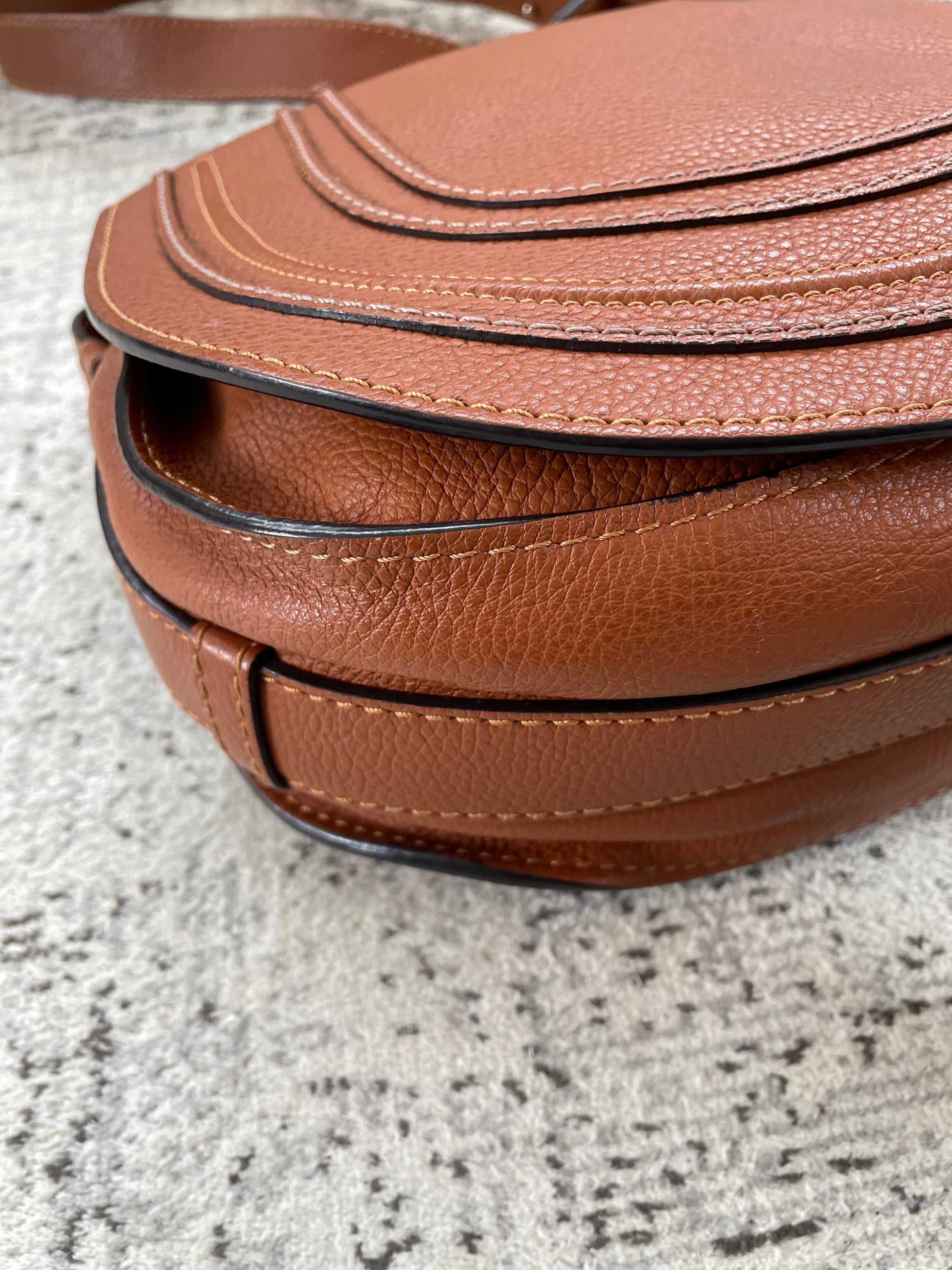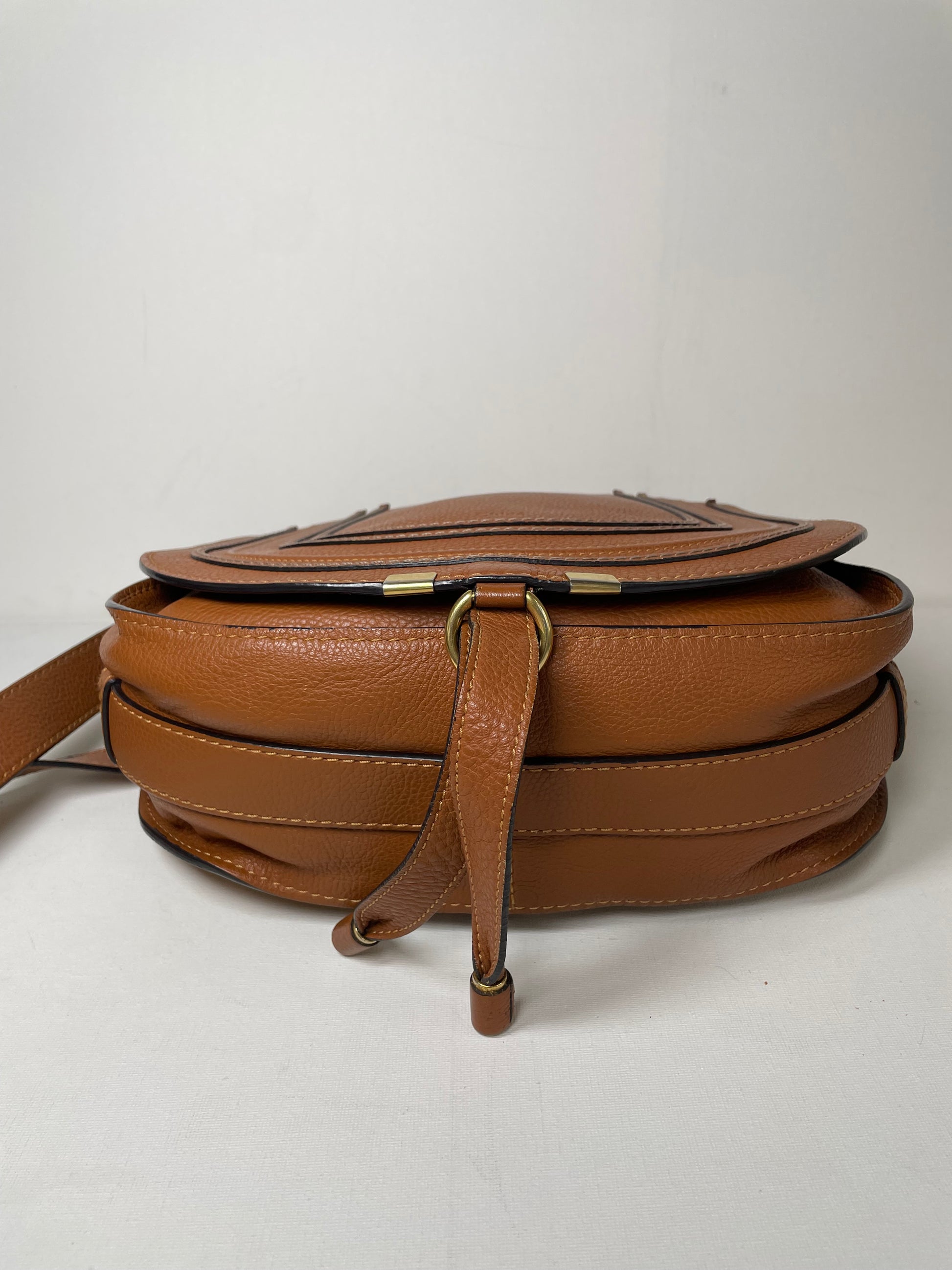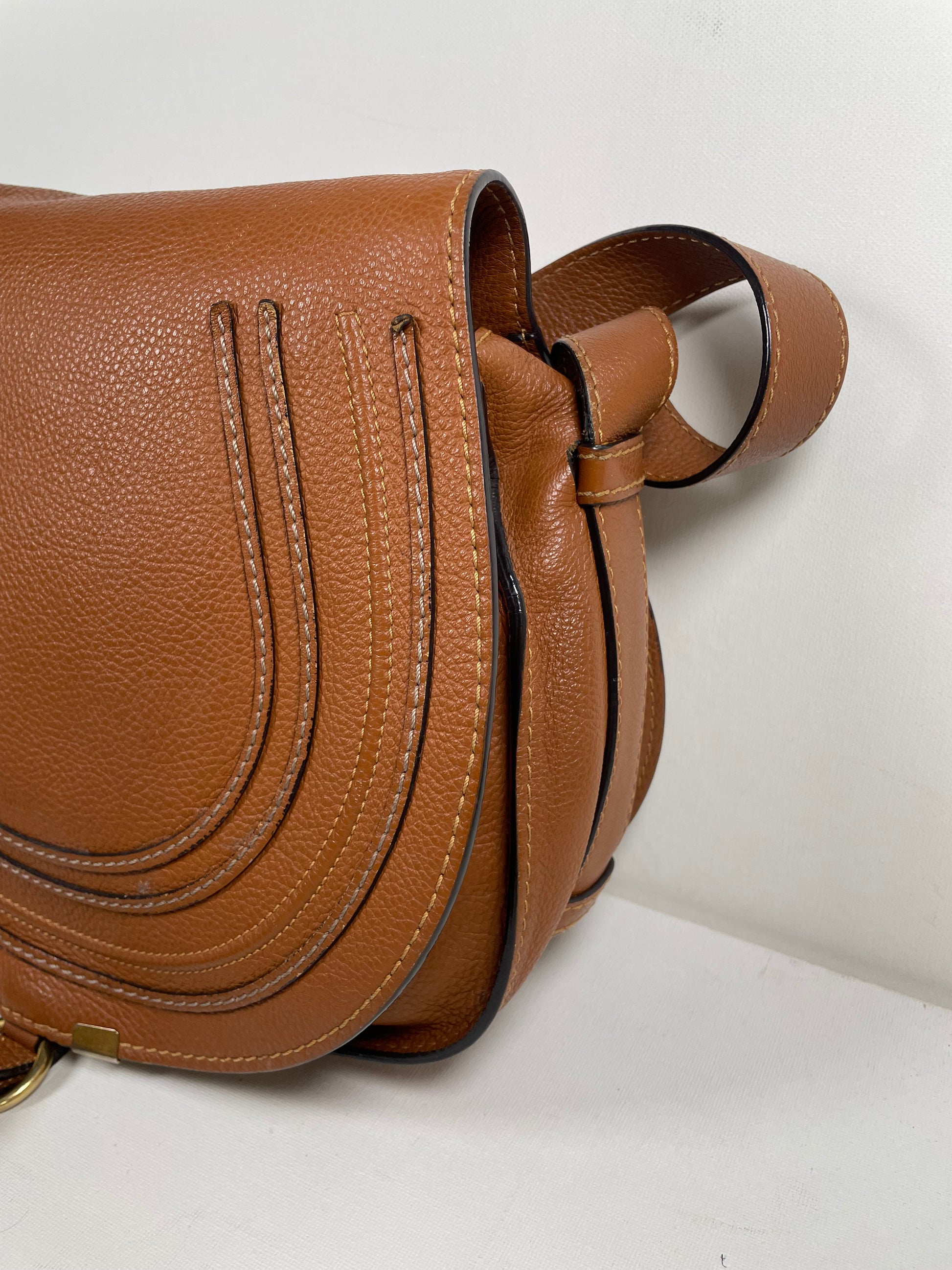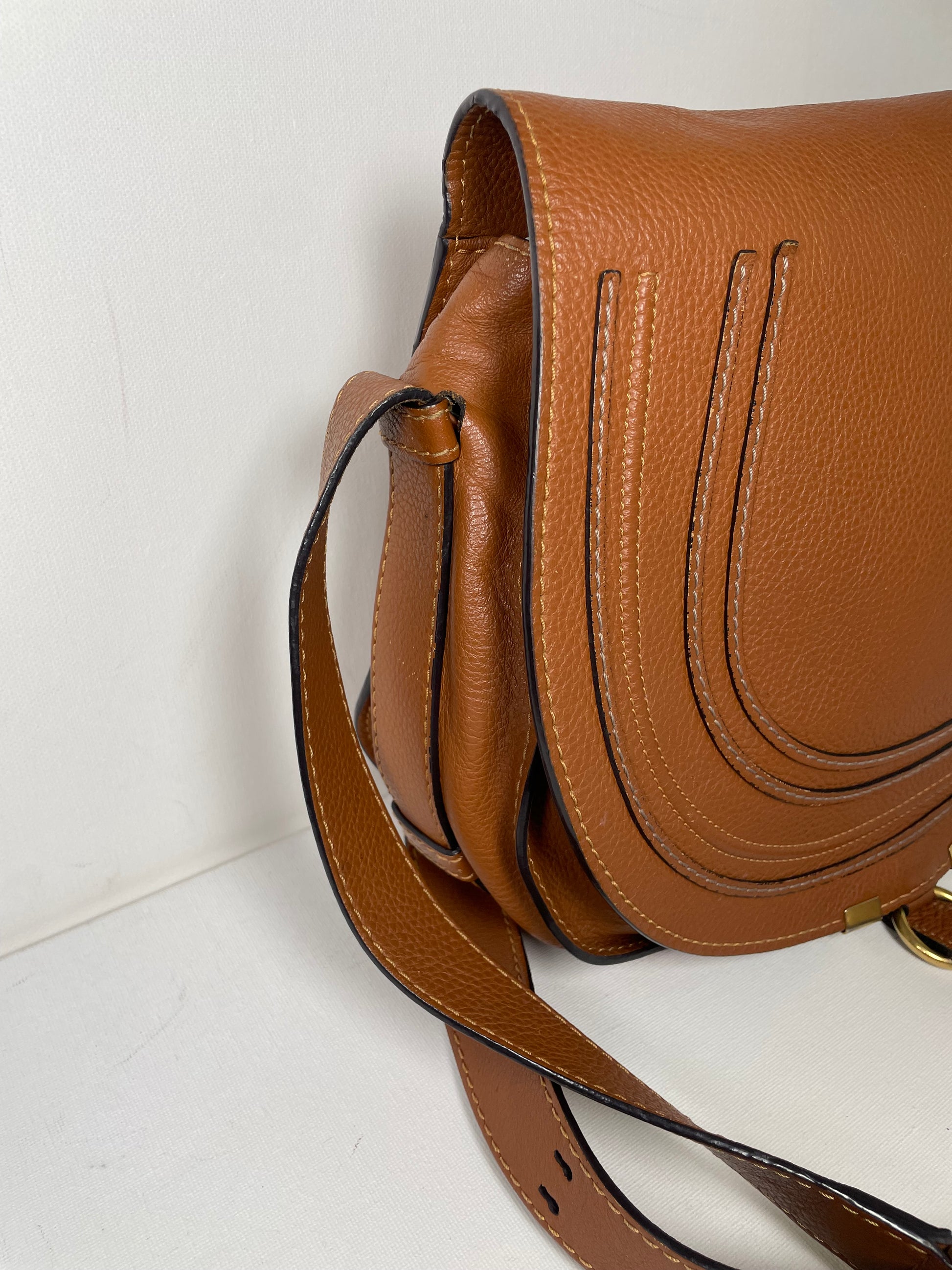This is a lovely Chloe Marcie Medium Crossbody in a warm Tan brown coloured grainy leather. This crossbody bag features Antiqued goldtone hardware and a horseshoe-stitched flap with a slide-ring tassel closure. The top flap opens to an olive green fabric interior with a slip pocket. Exterior slip pocket under opening flap.