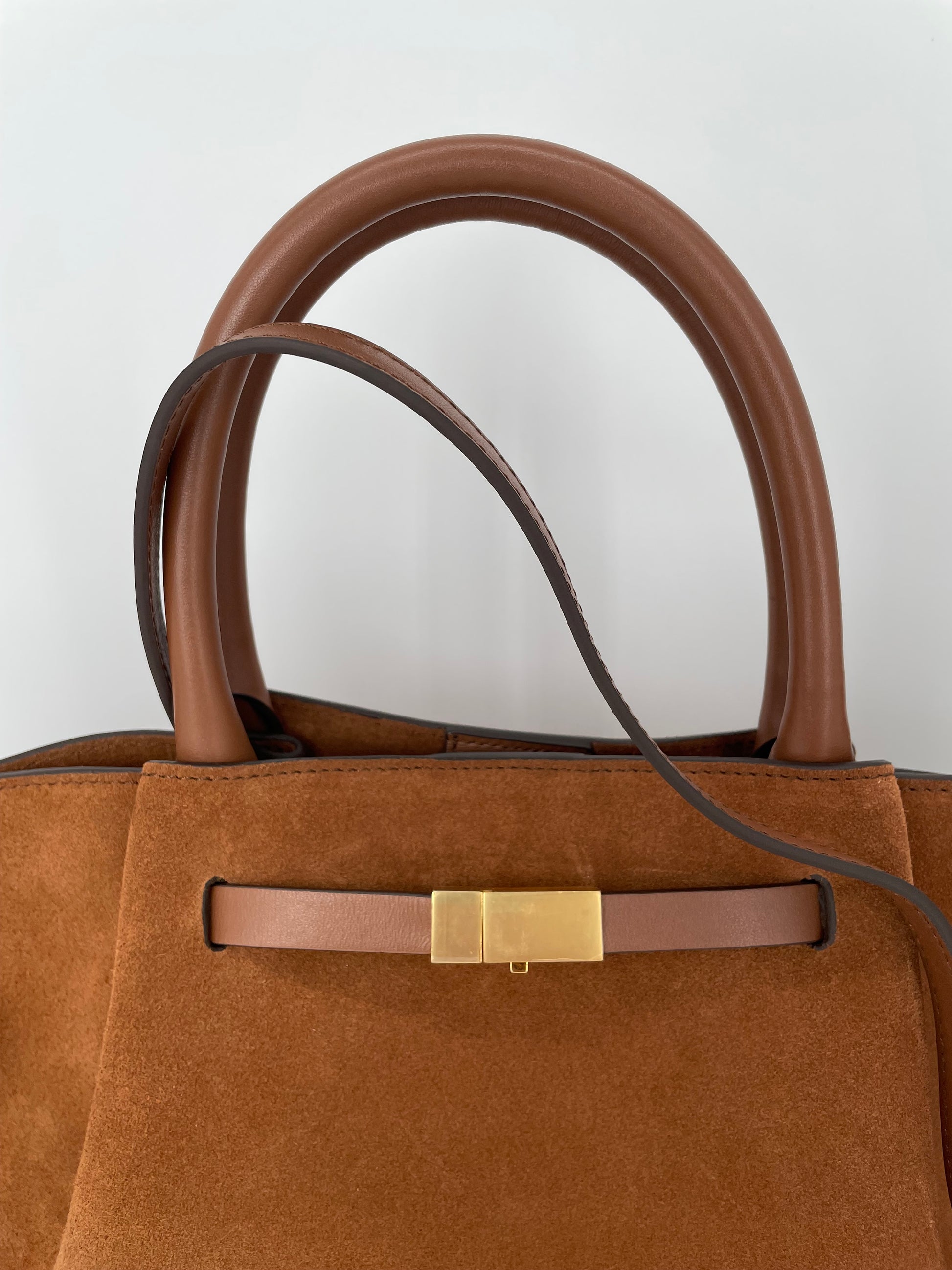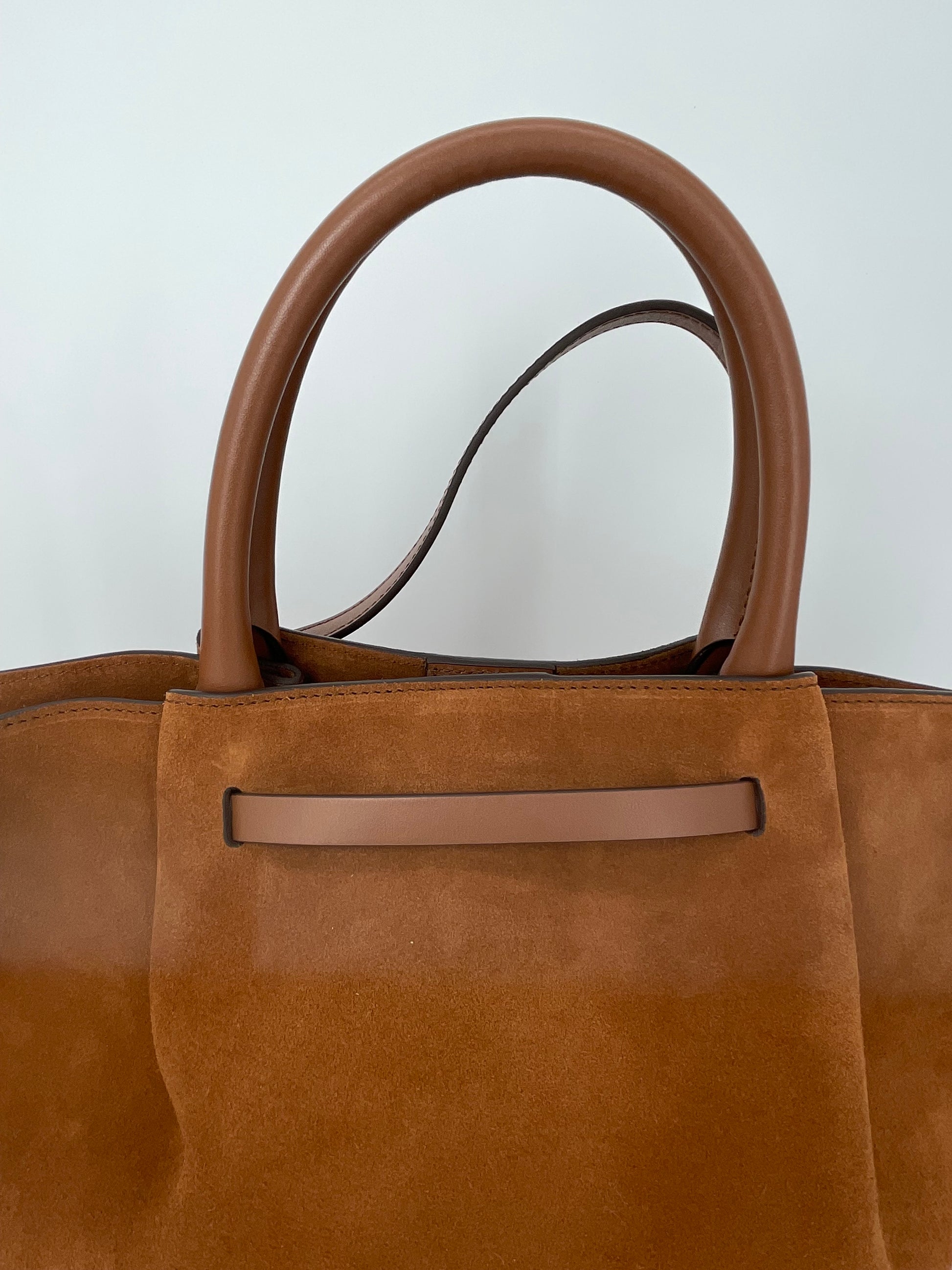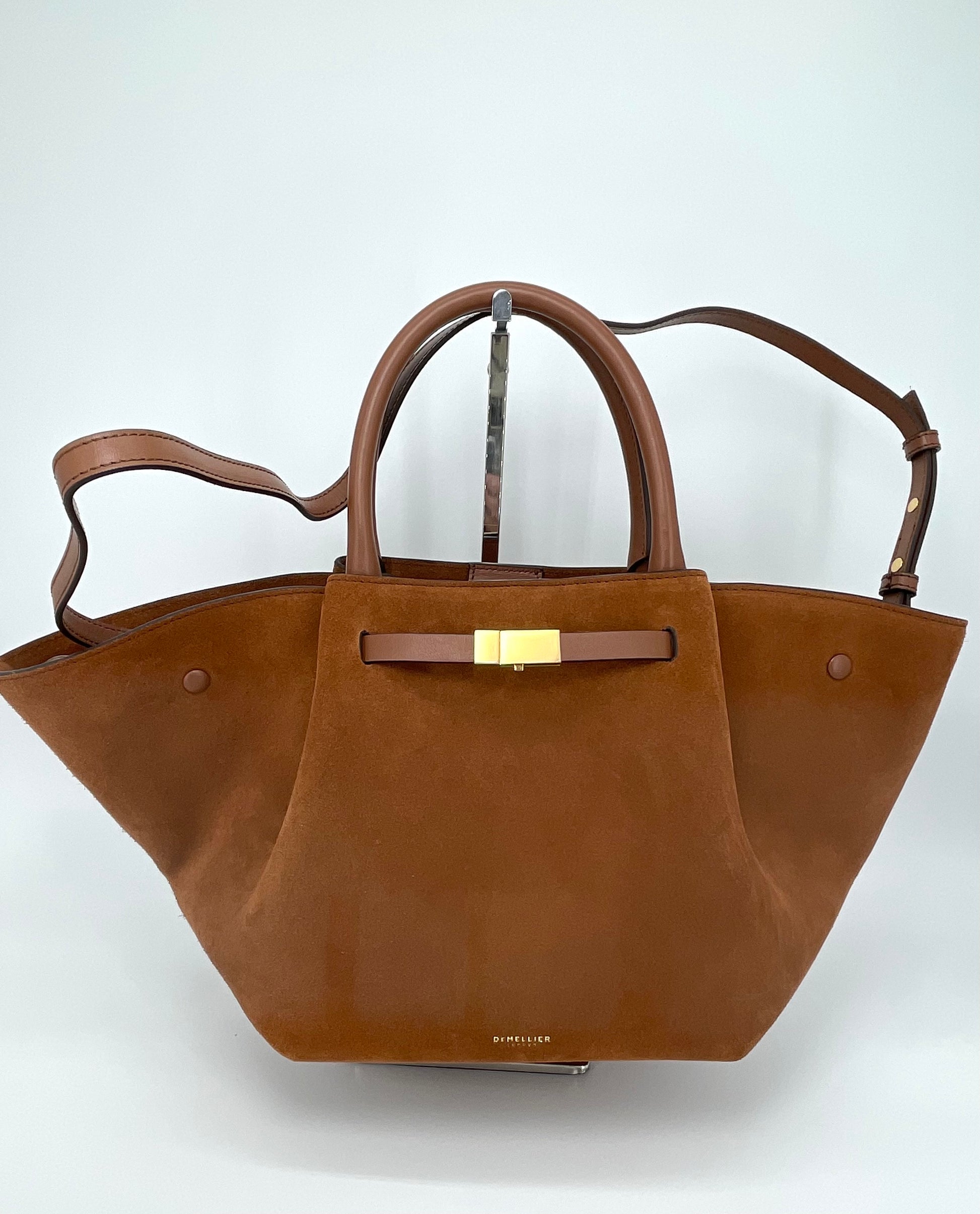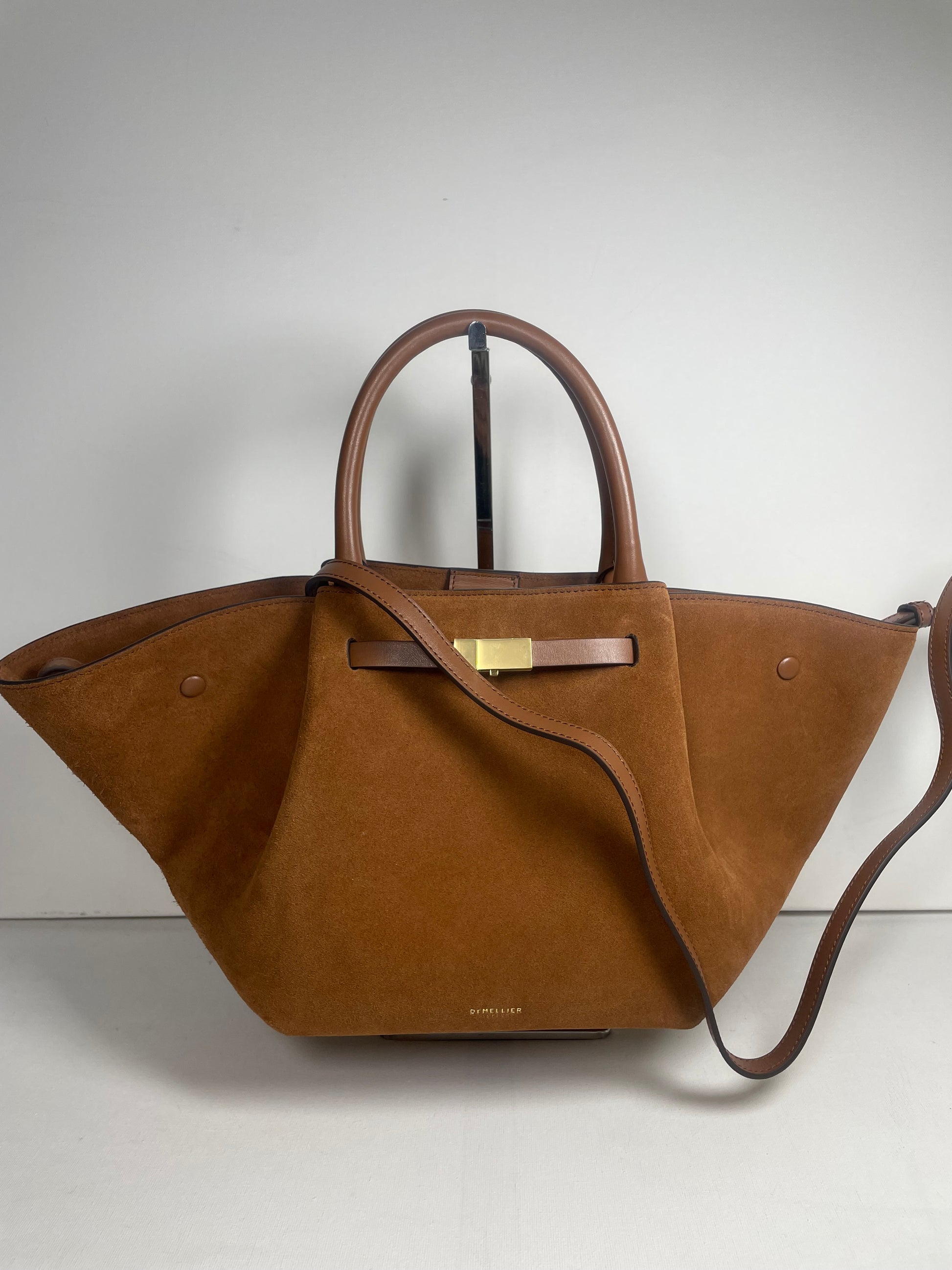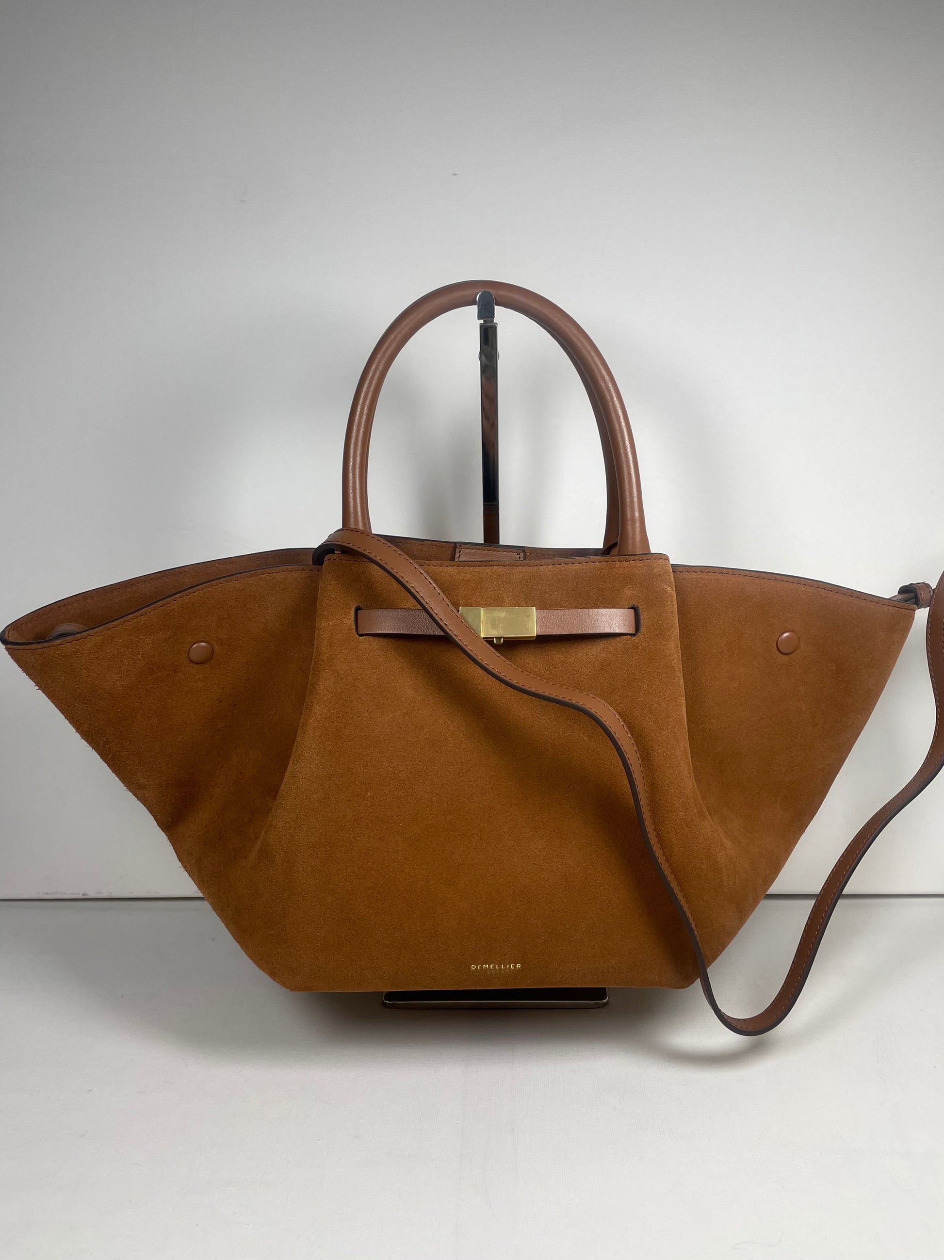 The DeMellier Midi New York tote bag is both modern and elegant . Inspired by the vibrancy of the city of New York, its timeless silhouette and luxurious finish make it the perfect bag. The interior can be safely closed off with a central snap closure and the zip close pocket is ideal for valuables. The handles make it a perfect grab bags and can sit perfectly in the crook of your elbow or crossbody with the long carry strap for hands free convenience. The suede is a rich, warm, honey brown.