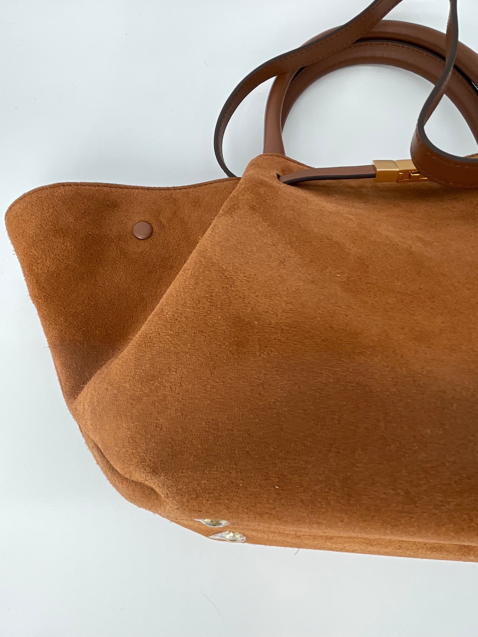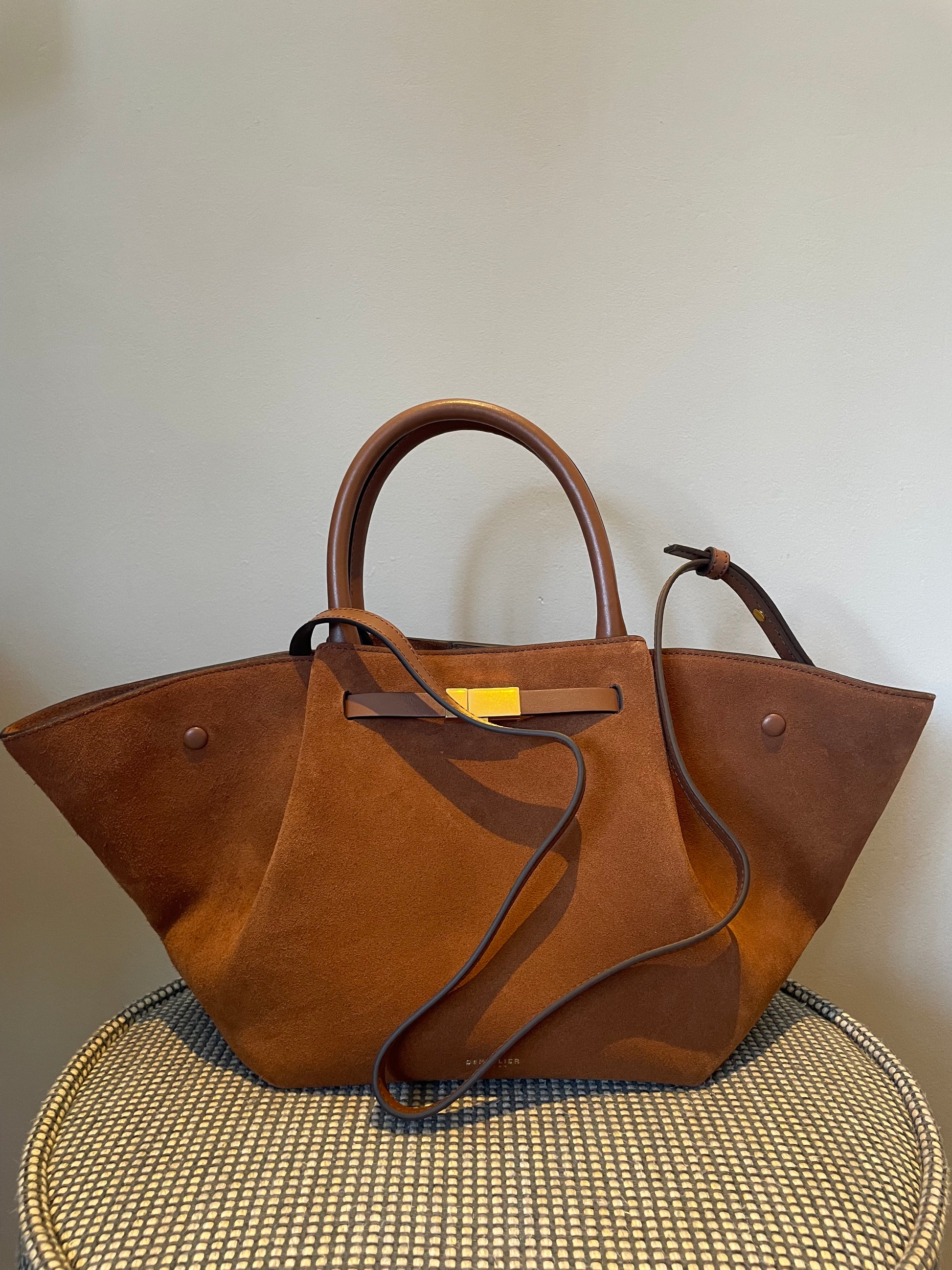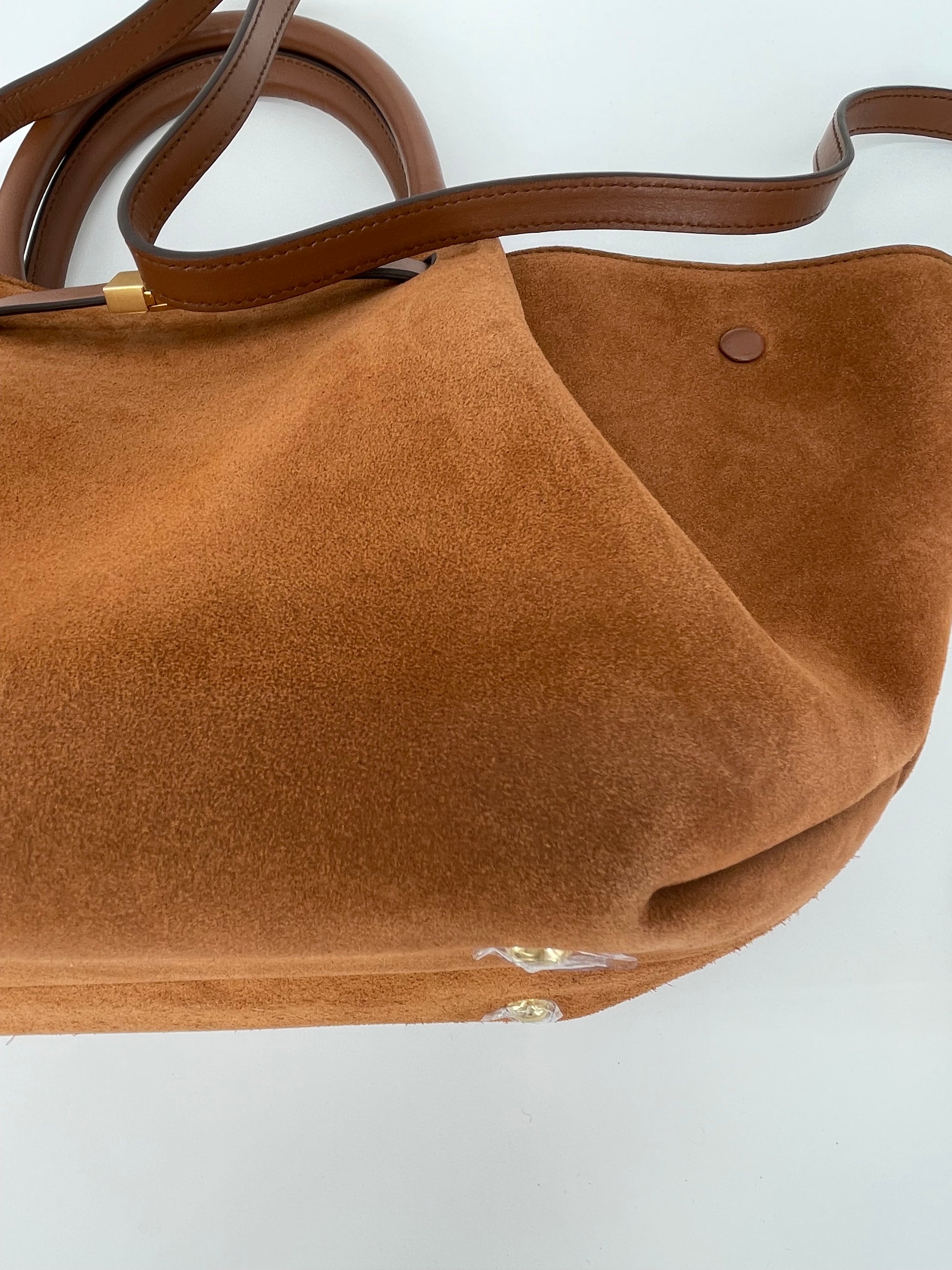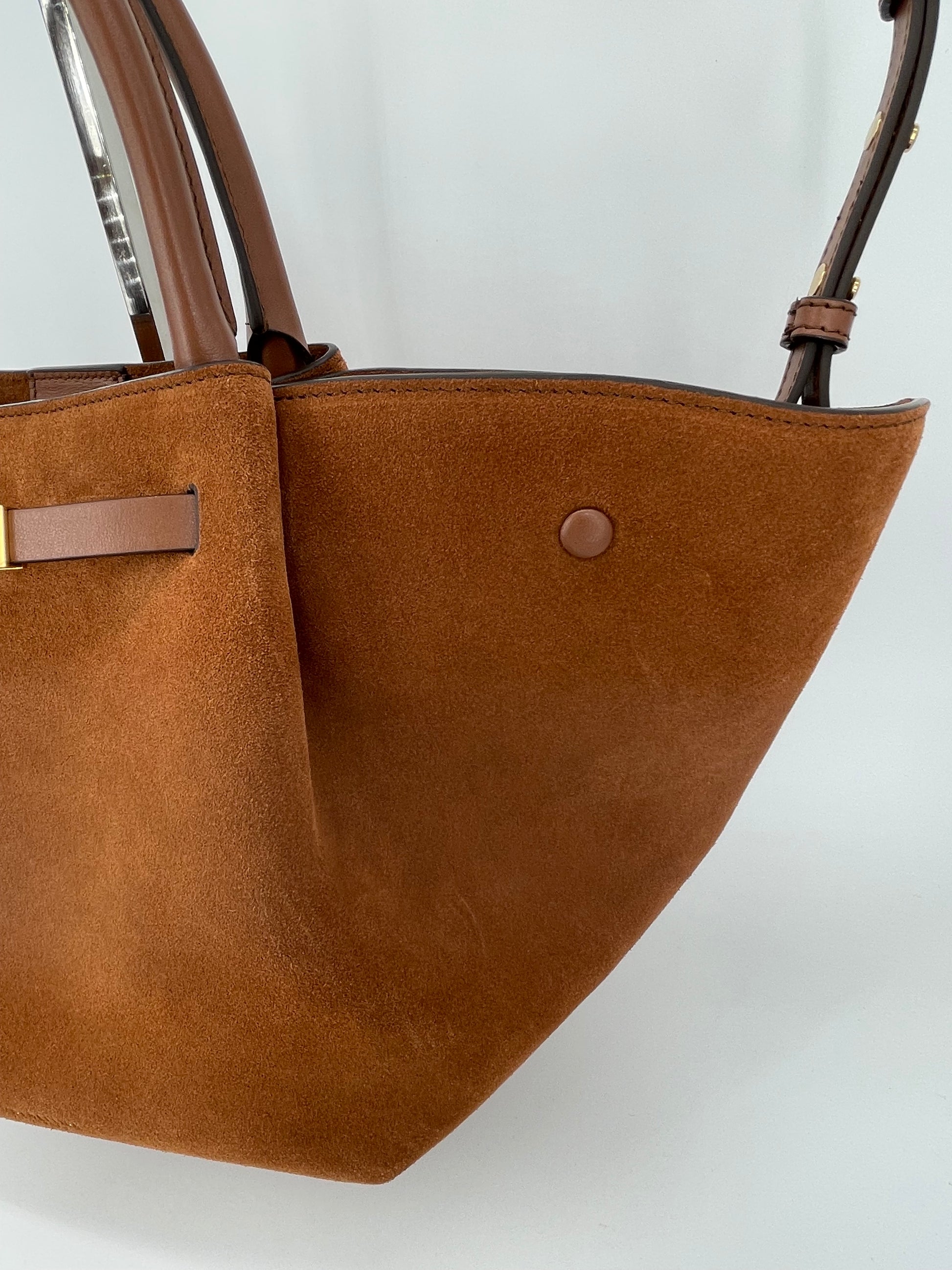 The DeMellier Midi New York tote bag is both modern and elegant . Inspired by the vibrancy of the city of New York, its timeless silhouette and luxurious finish make it the perfect bag. The interior can be safely closed off with a central snap closure and the zip close pocket is ideal for valuables. The handles make it a perfect grab bags and can sit perfectly in the crook of your elbow or crossbody with the long carry strap for hands free convenience. The suede is a rich, warm, honey brown.