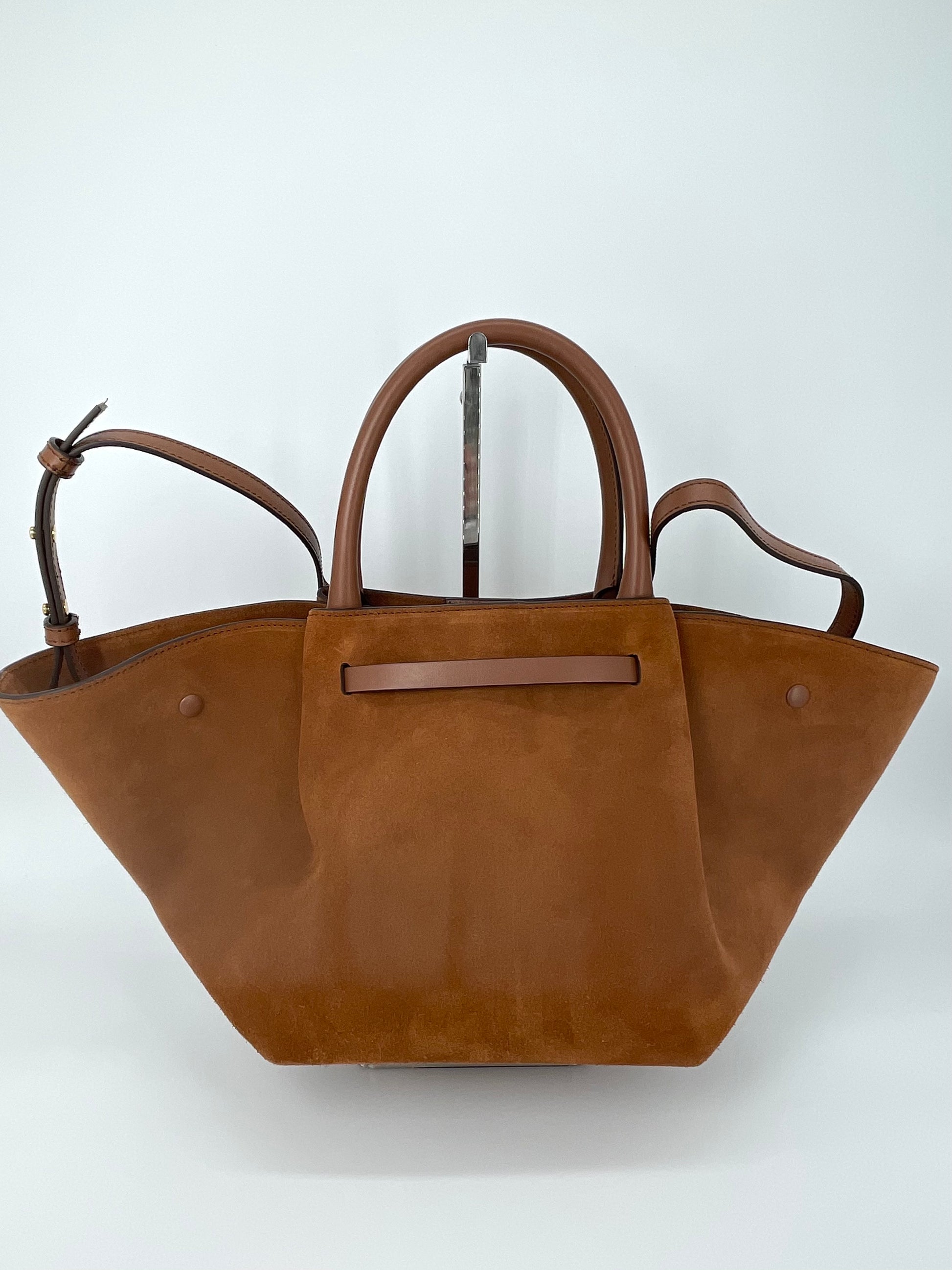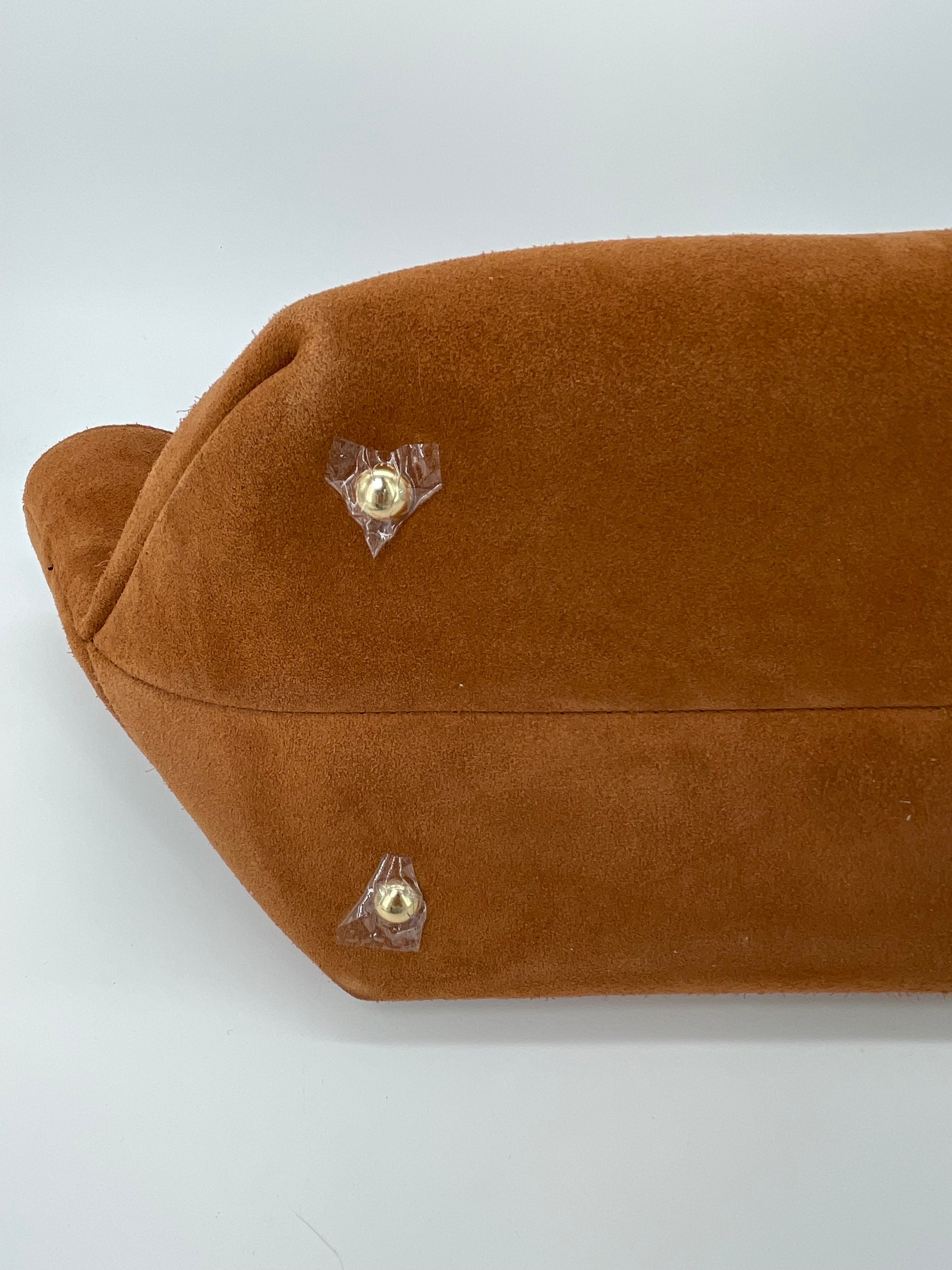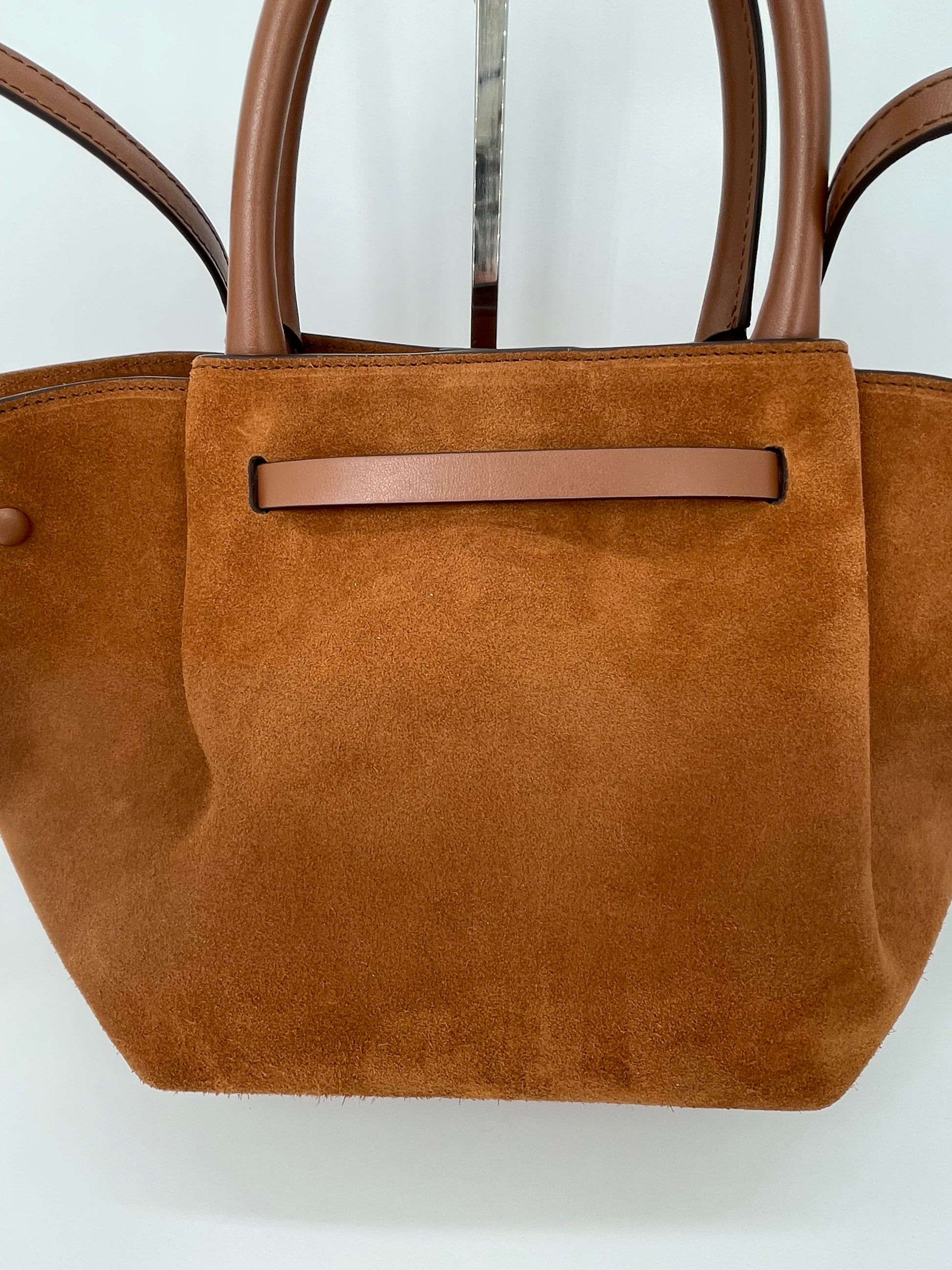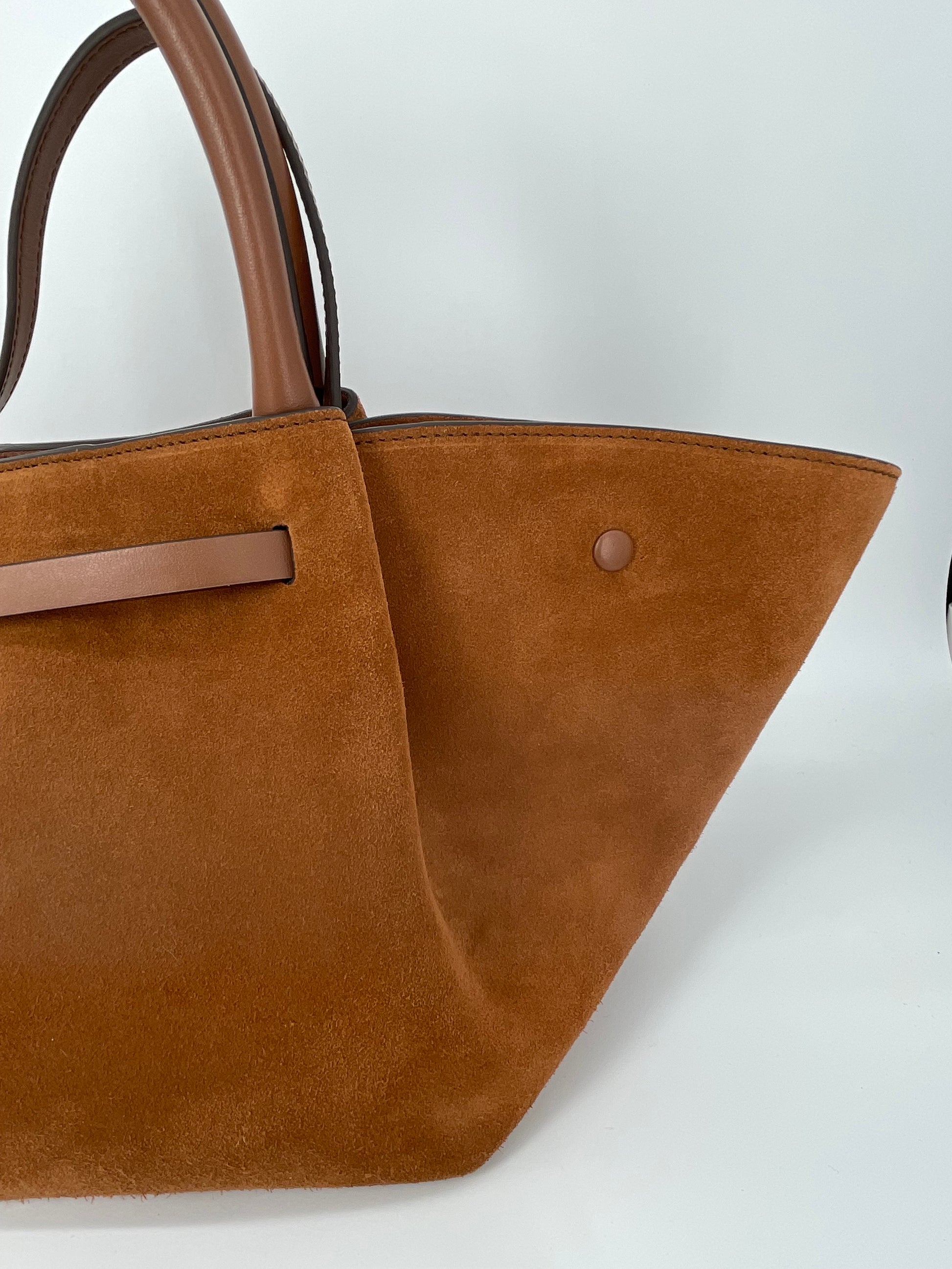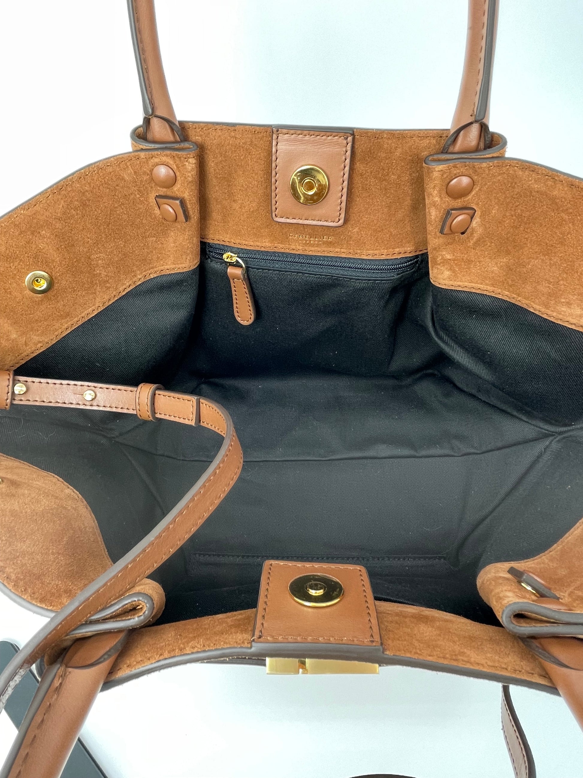 The DeMellier Midi New York tote bag is both modern and elegant . Inspired by the vibrancy of the city of New York, its timeless silhouette and luxurious finish make it the perfect bag. The interior can be safely closed off with a central snap closure and the zip close pocket is ideal for valuables. The handles make it a perfect grab bags and can sit perfectly in the crook of your elbow or crossbody with the long carry strap for hands free convenience. The suede is a rich, warm, honey brown.