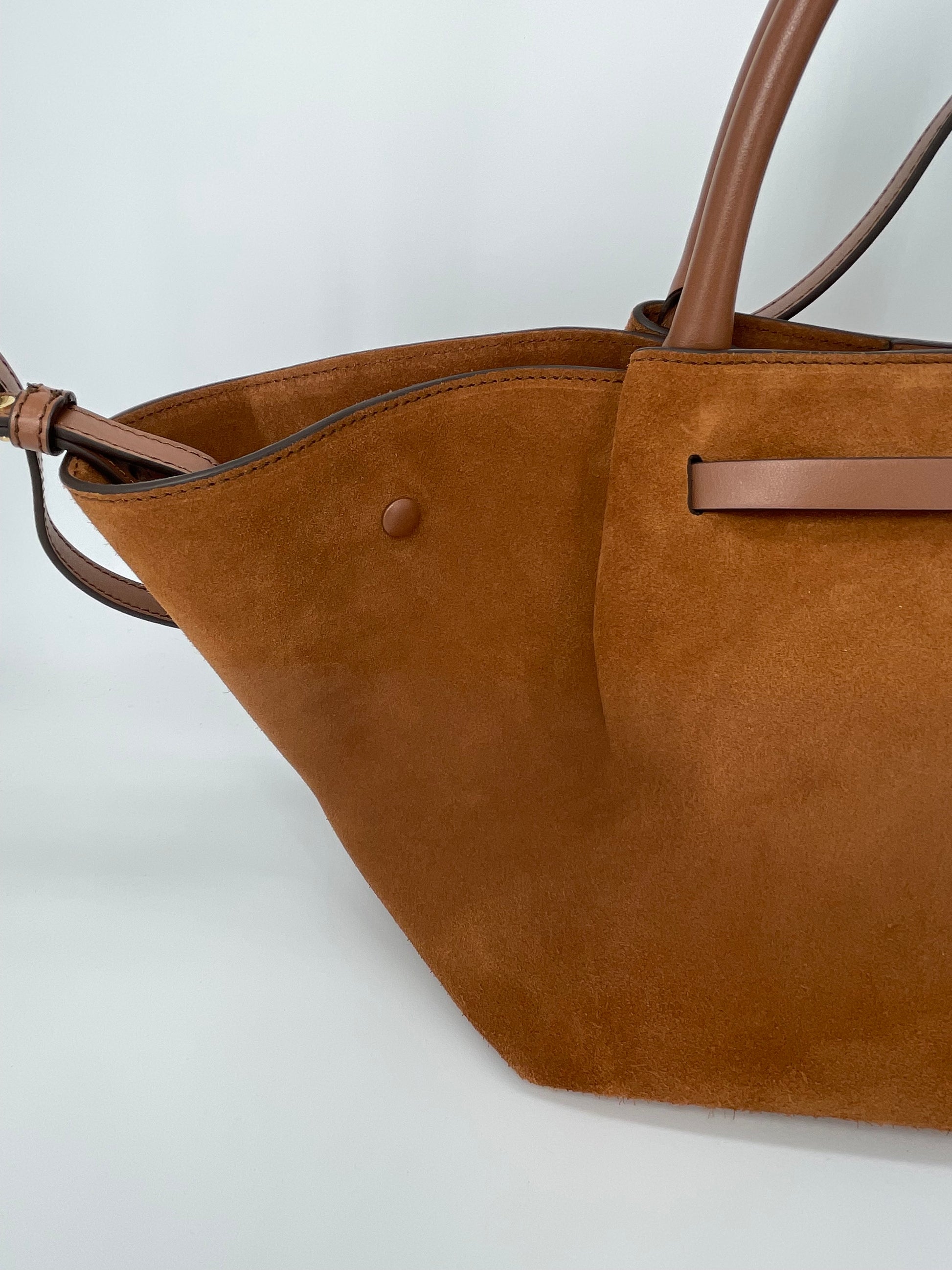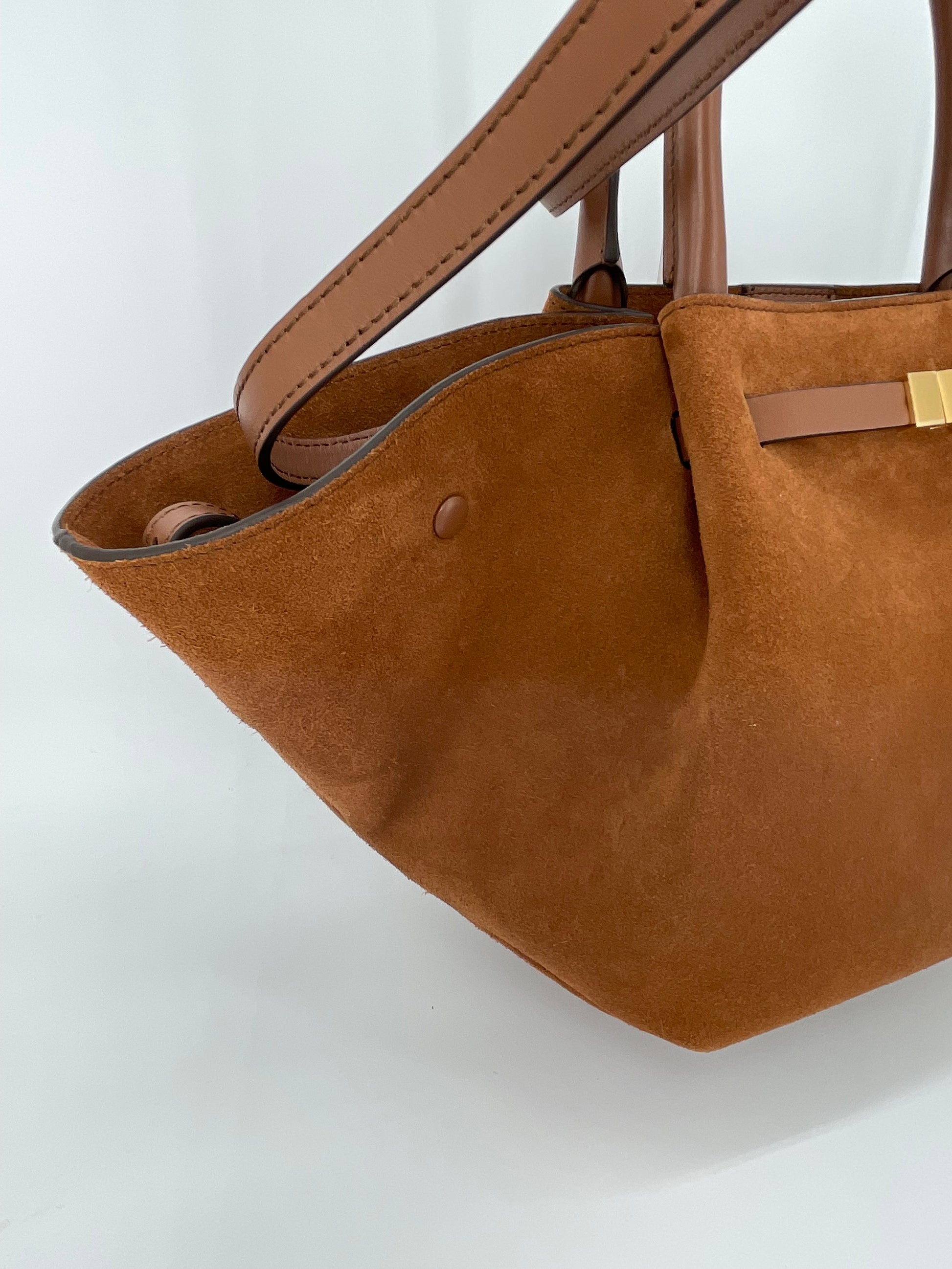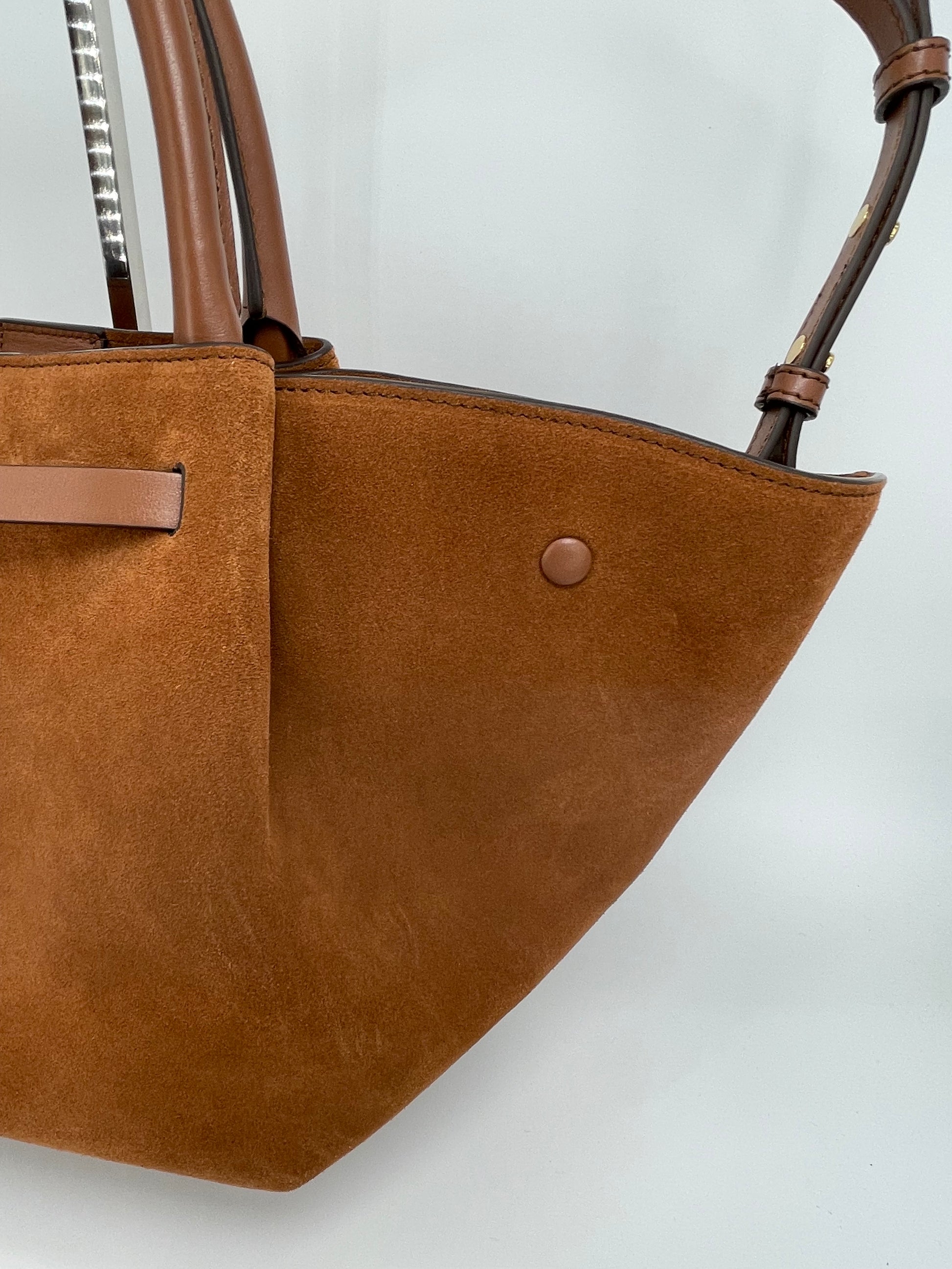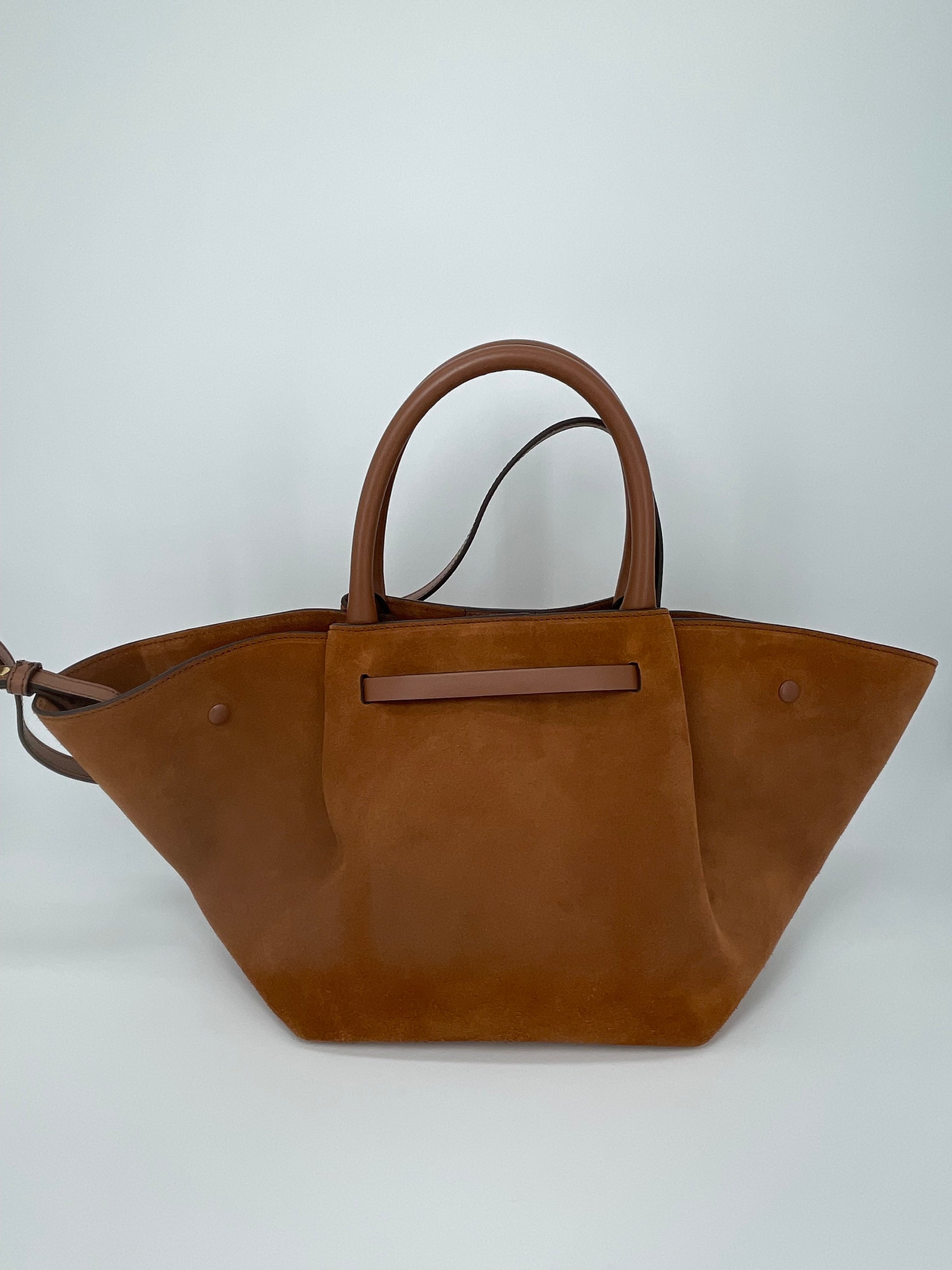 The DeMellier Midi New York tote bag is both modern and elegant . Inspired by the vibrancy of the city of New York, its timeless silhouette and luxurious finish make it the perfect bag. The interior can be safely closed off with a central snap closure and the zip close pocket is ideal for valuables. The handles make it a perfect grab bags and can sit perfectly in the crook of your elbow or crossbody with the long carry strap for hands free convenience. The suede is a rich, warm, honey brown.