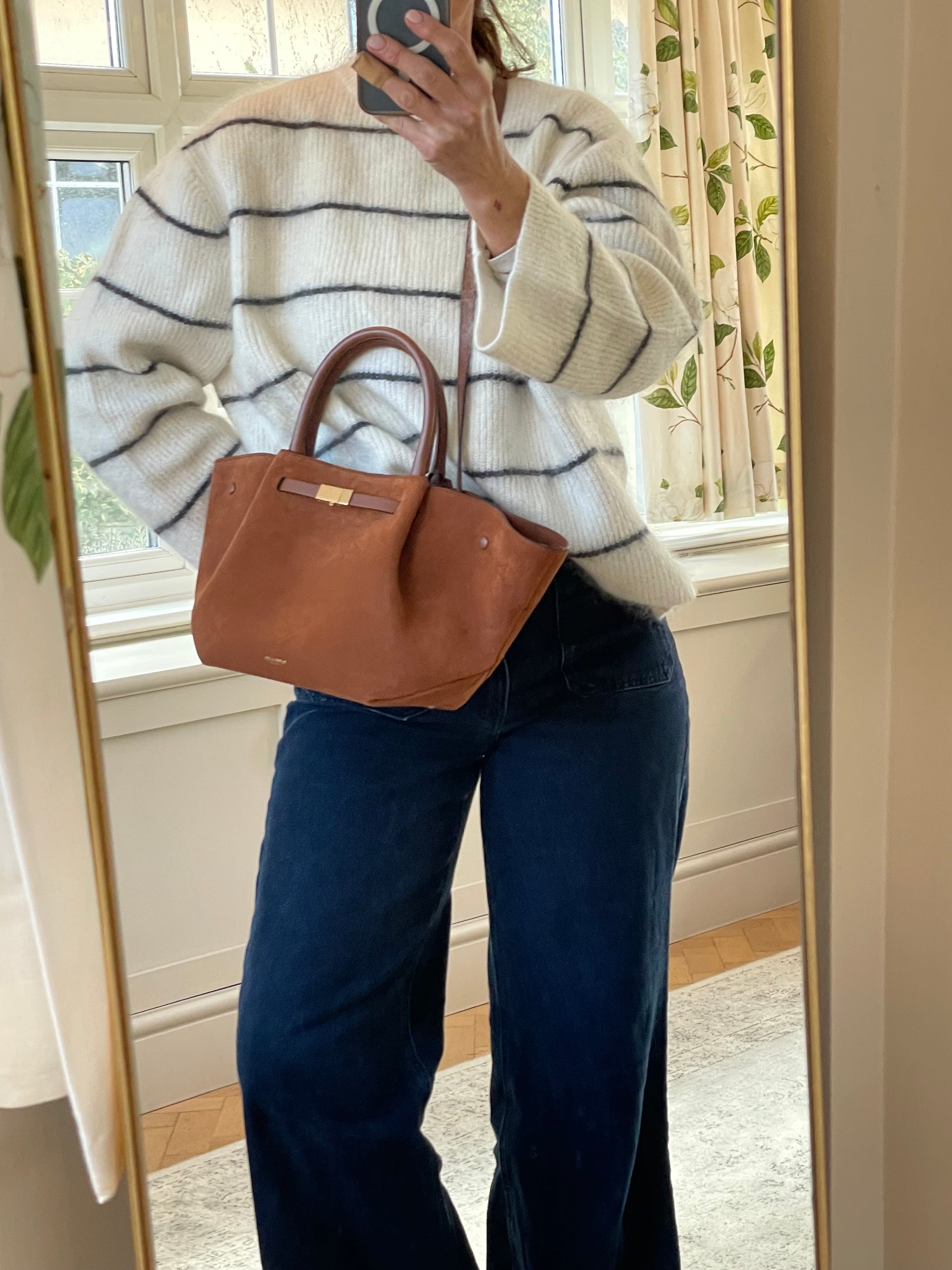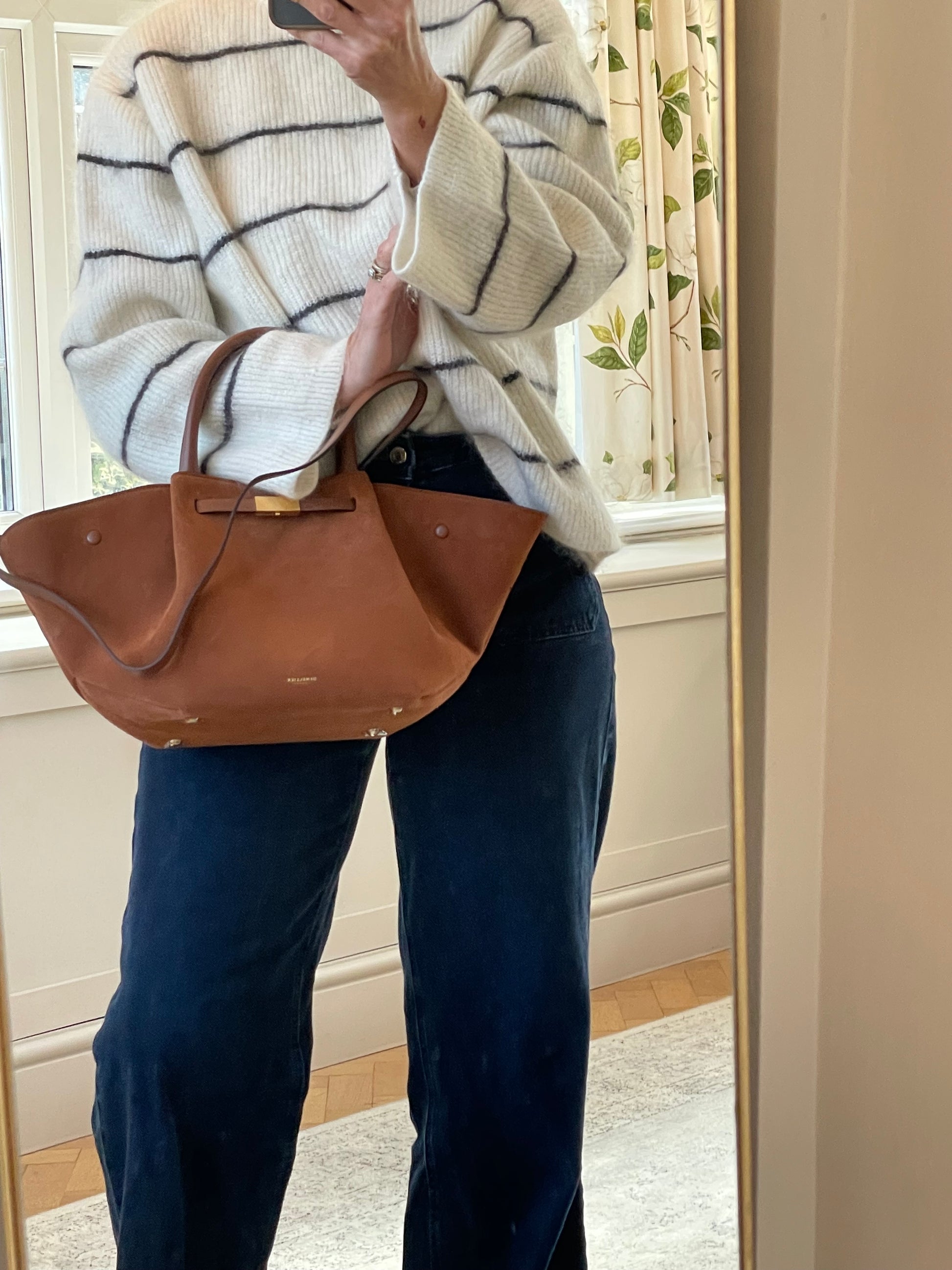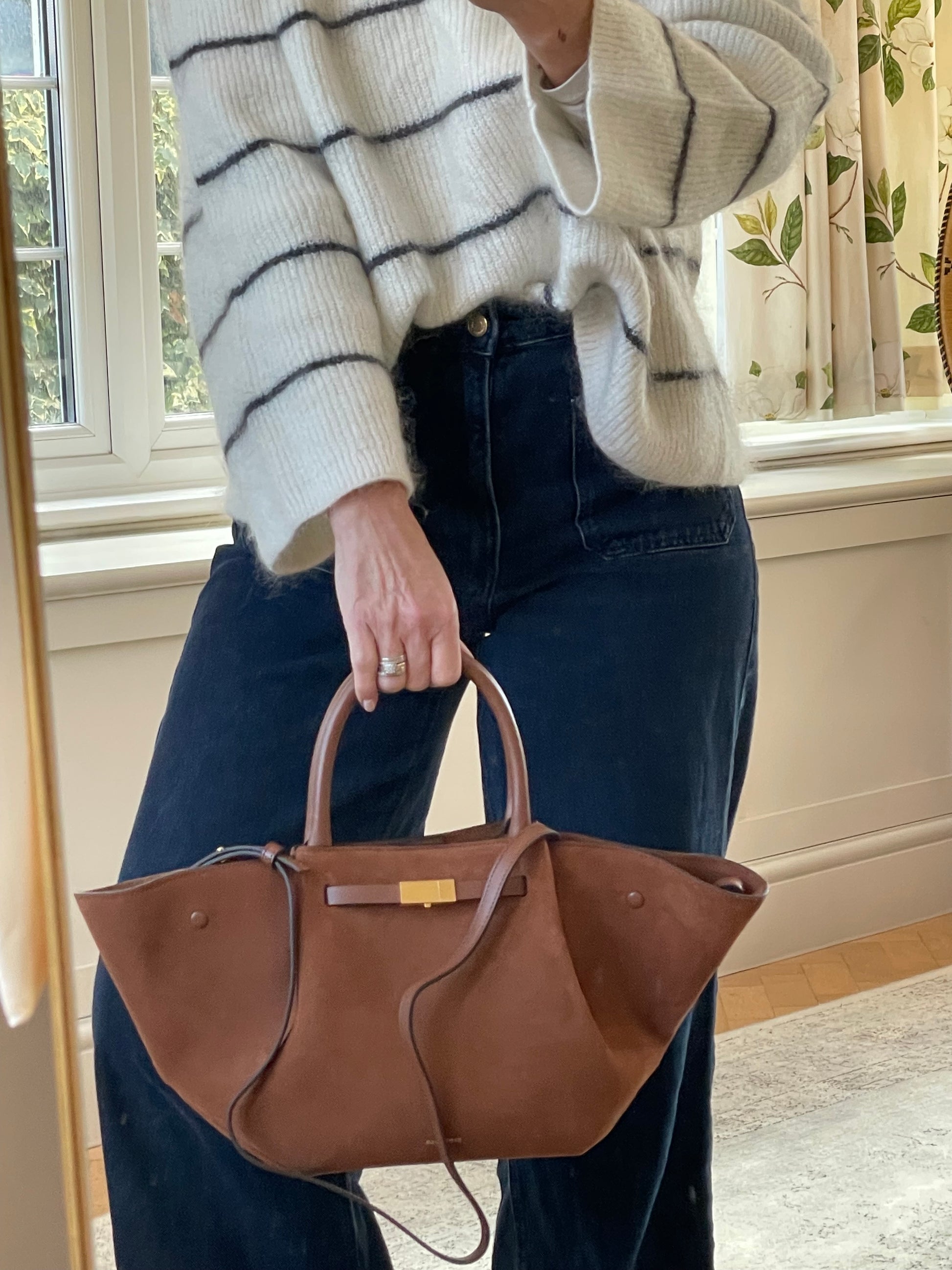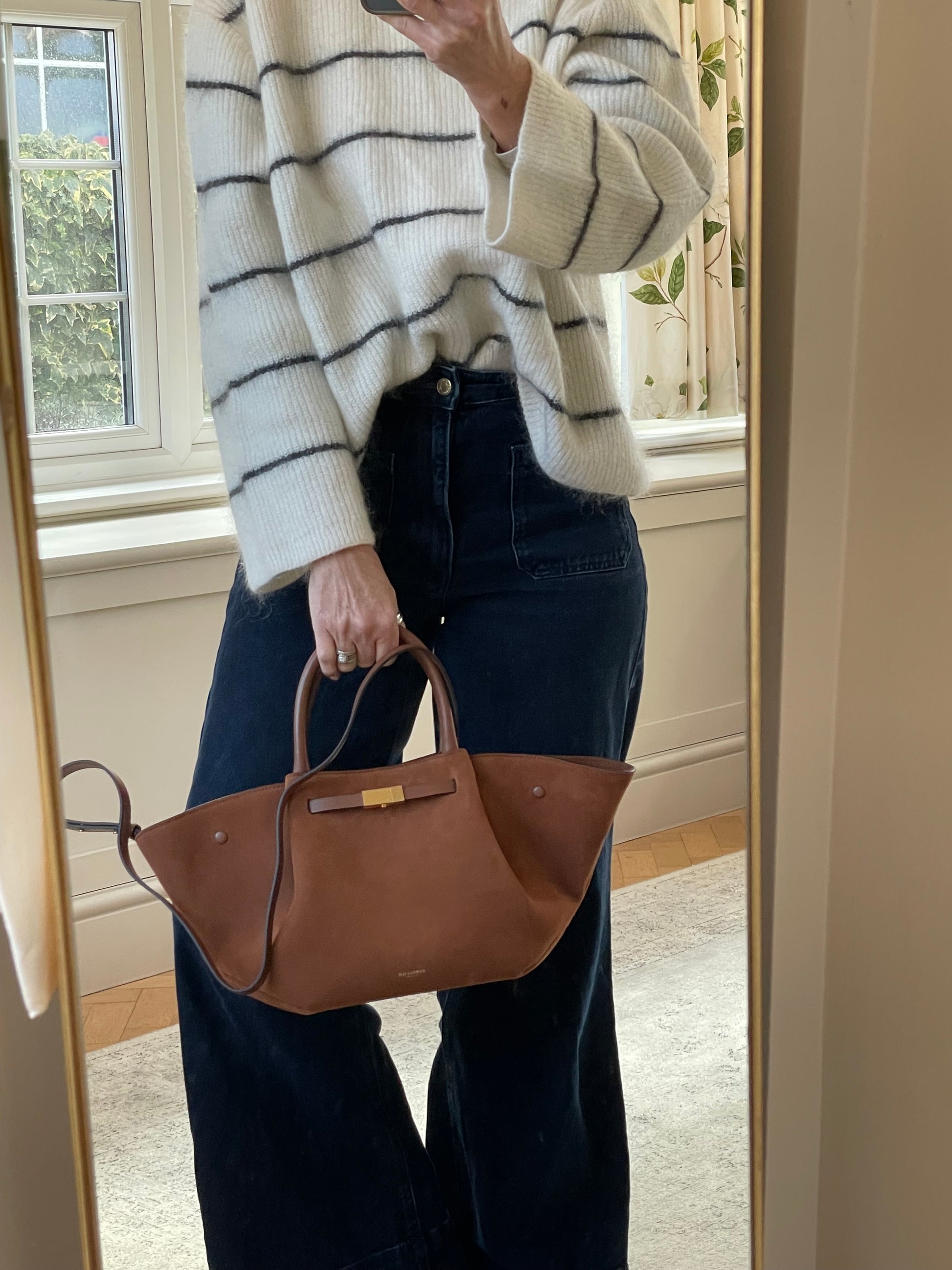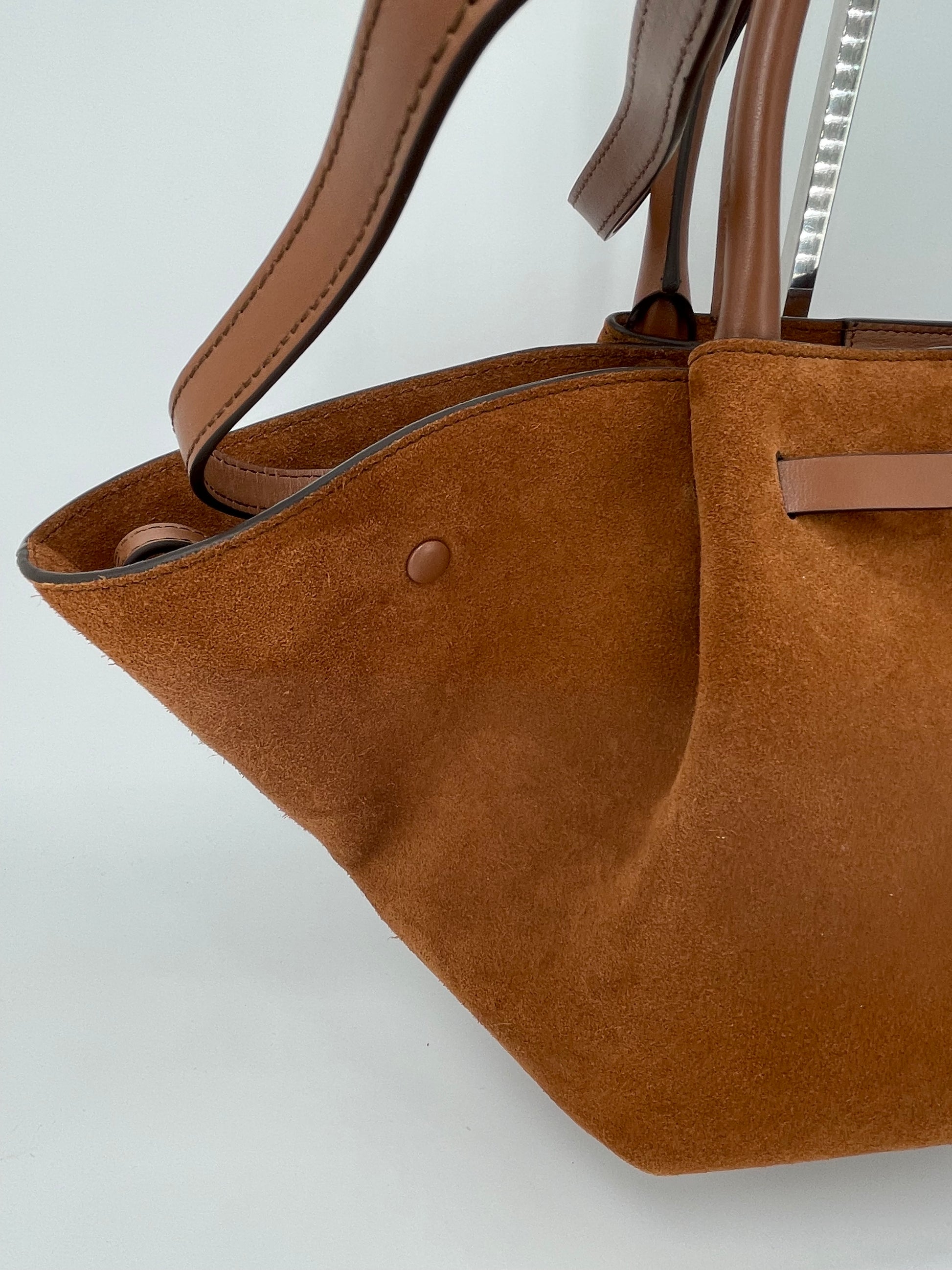 The DeMellier Midi New York tote bag is both modern and elegant . Inspired by the vibrancy of the city of New York, its timeless silhouette and luxurious finish make it the perfect bag. The interior can be safely closed off with a central snap closure and the zip close pocket is ideal for valuables. The handles make it a perfect grab bags and can sit perfectly in the crook of your elbow or crossbody with the long carry strap for hands free convenience. The suede is a rich, warm, honey brown.