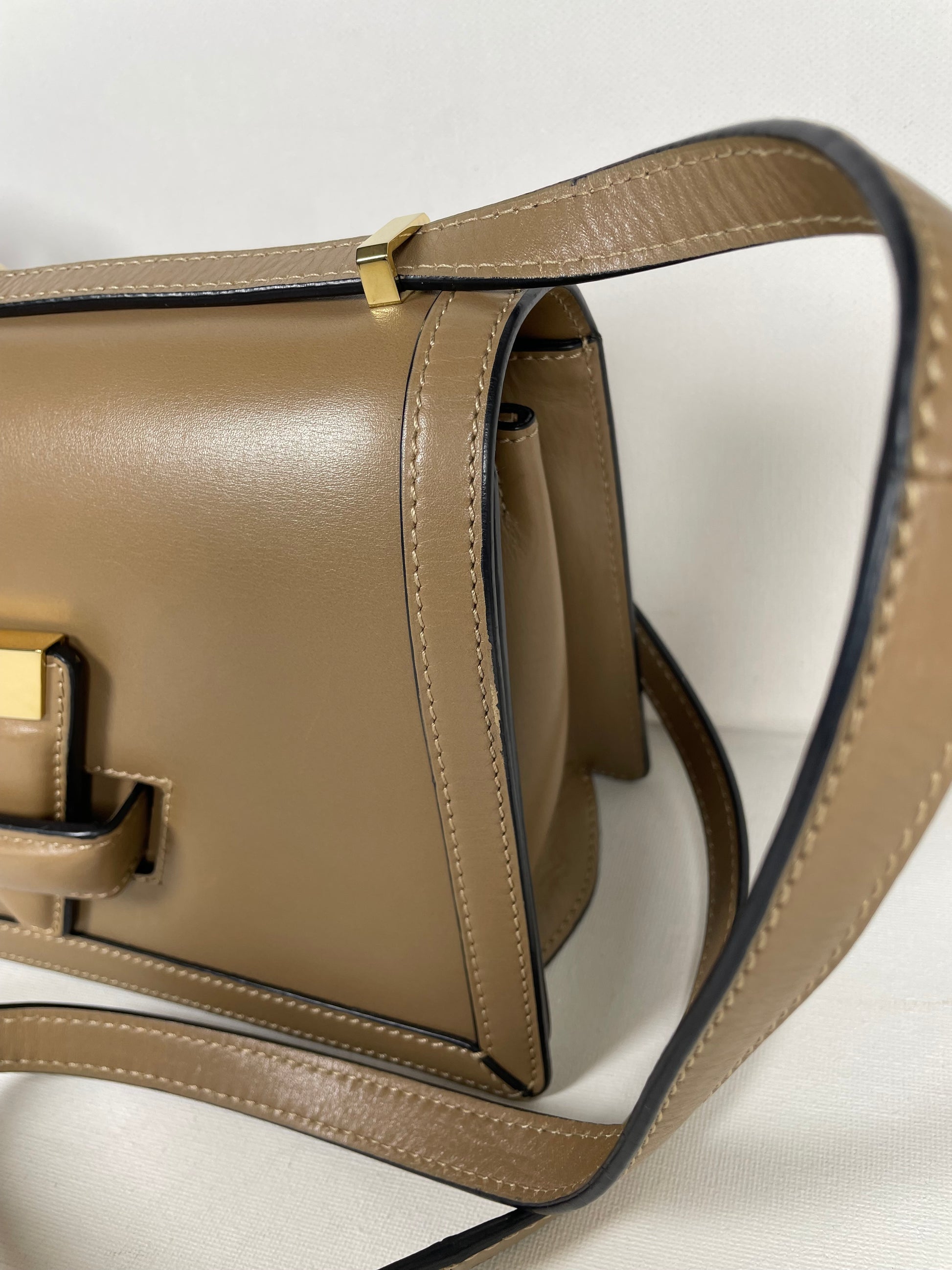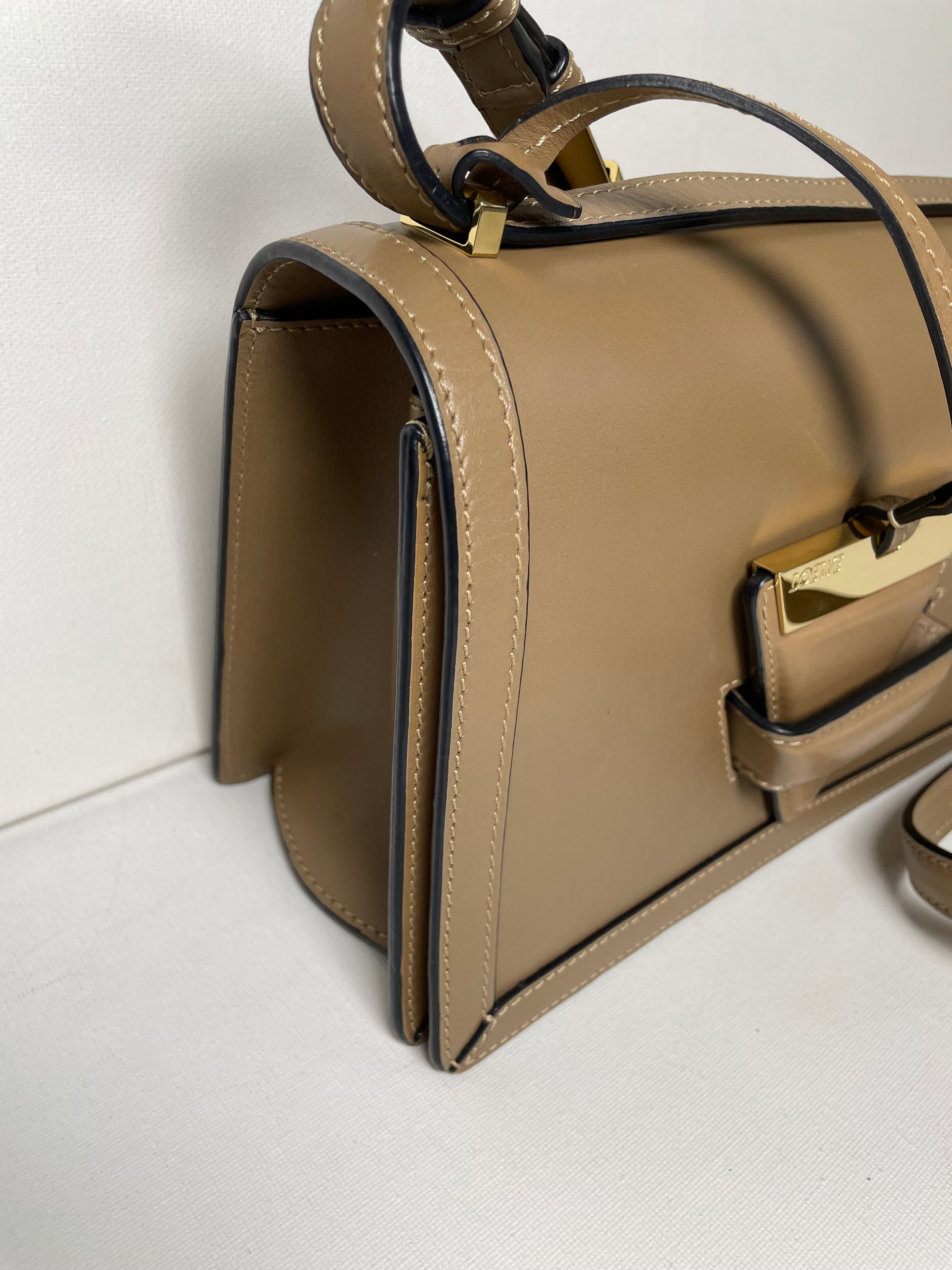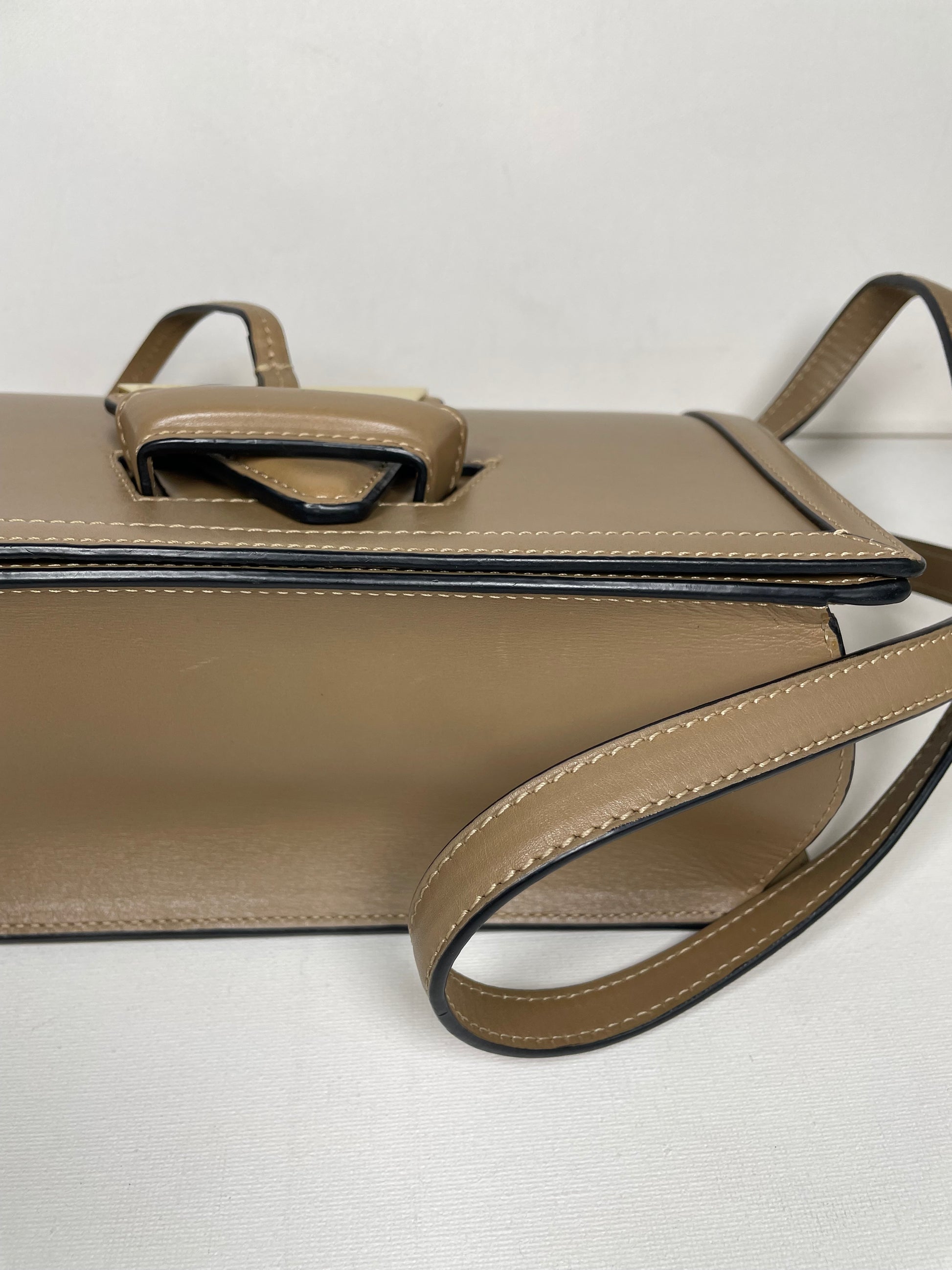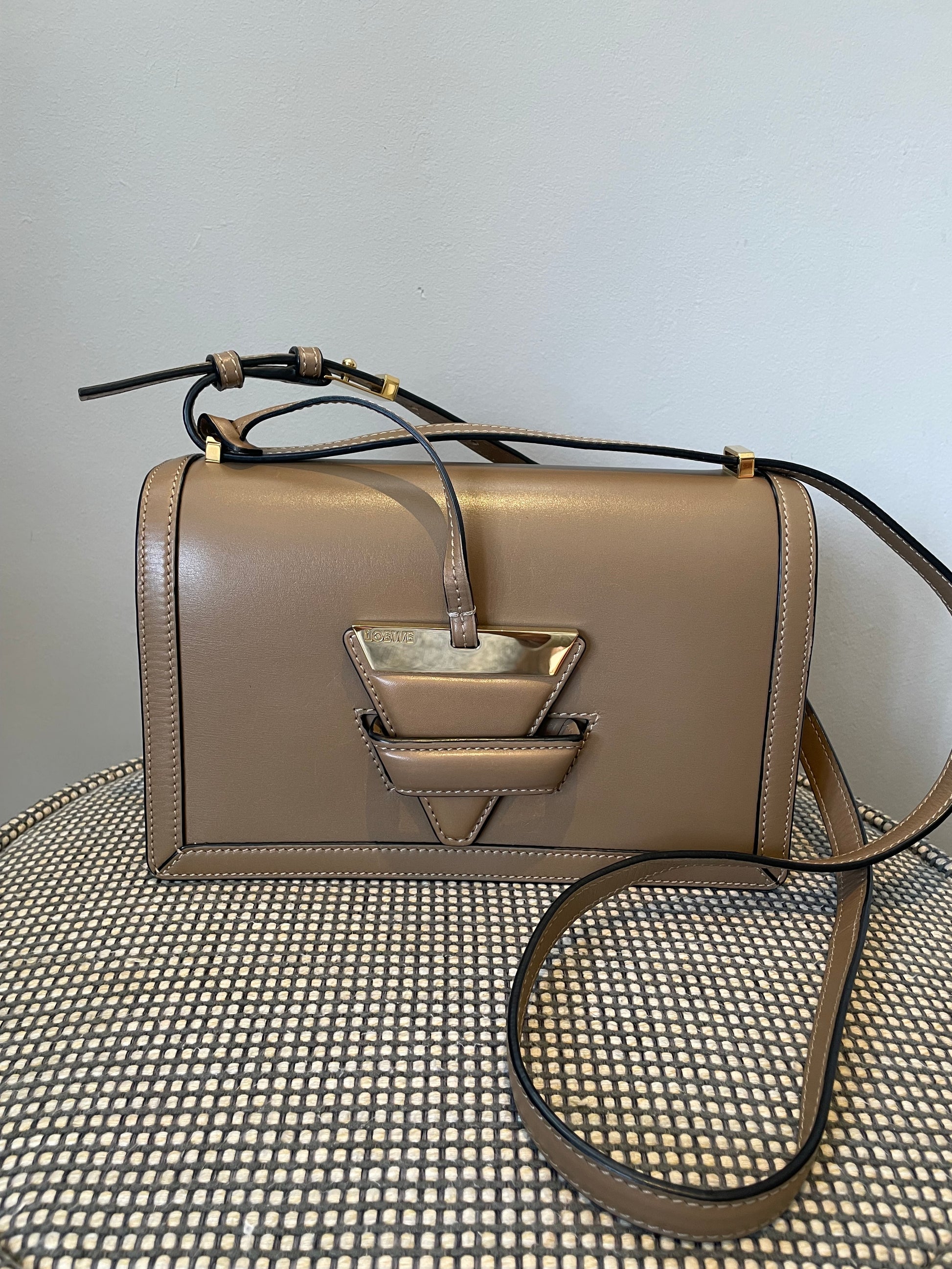 This is a beautiful Loewe Calfskin Medium Barcelona Shoulder Bag in warm beige/taupe leather. This elegant shoulder bag is crafted of smooth calfskin leather in with contrasting goldtone hardware. The front flap is secured with logo engraved triangle closure, which opens to an all leather interior with a main compartment and open slip pockets. The bag features an adjustable leather shoulder strap so can be worn on the shoulder or crossbody.