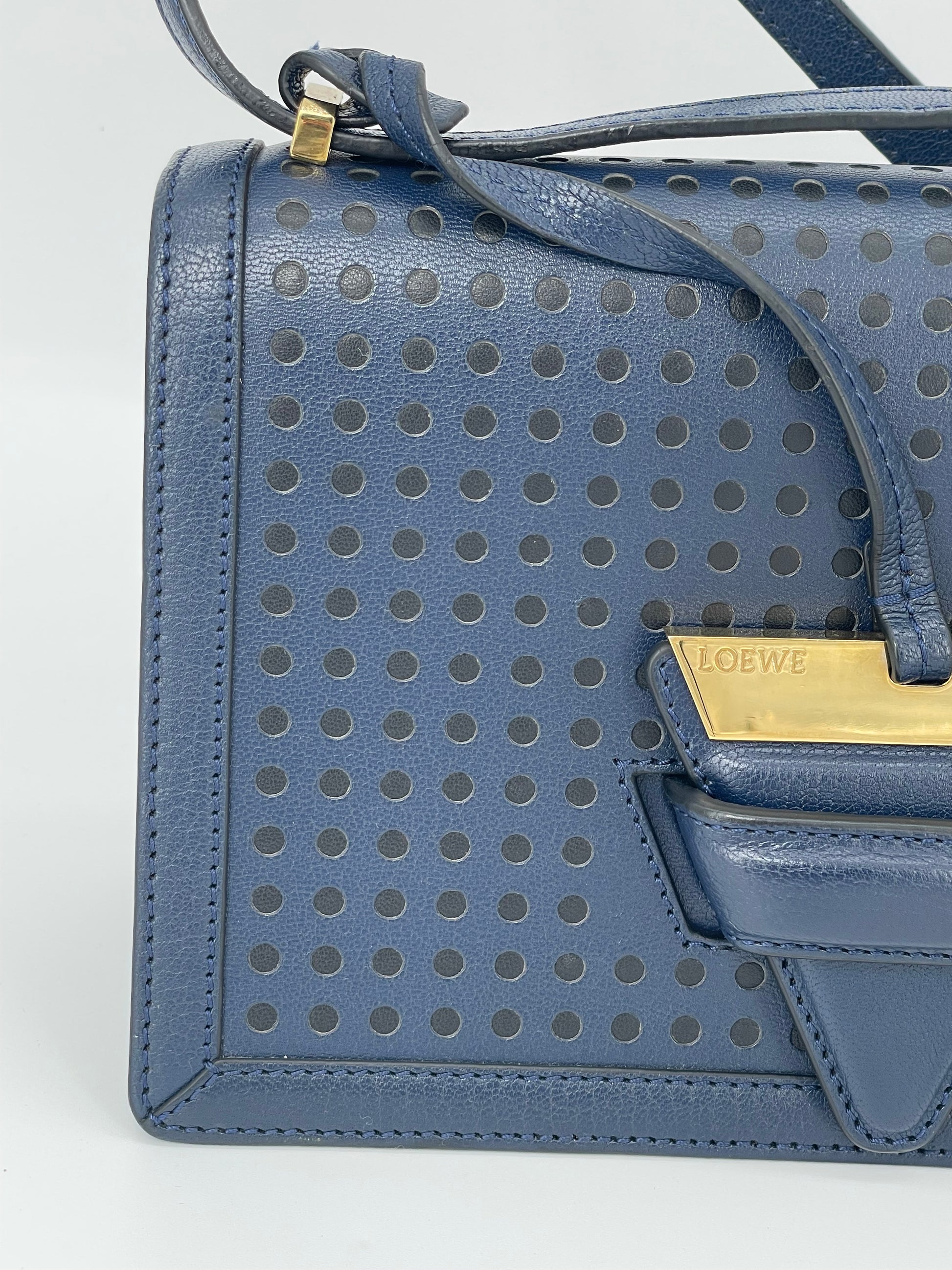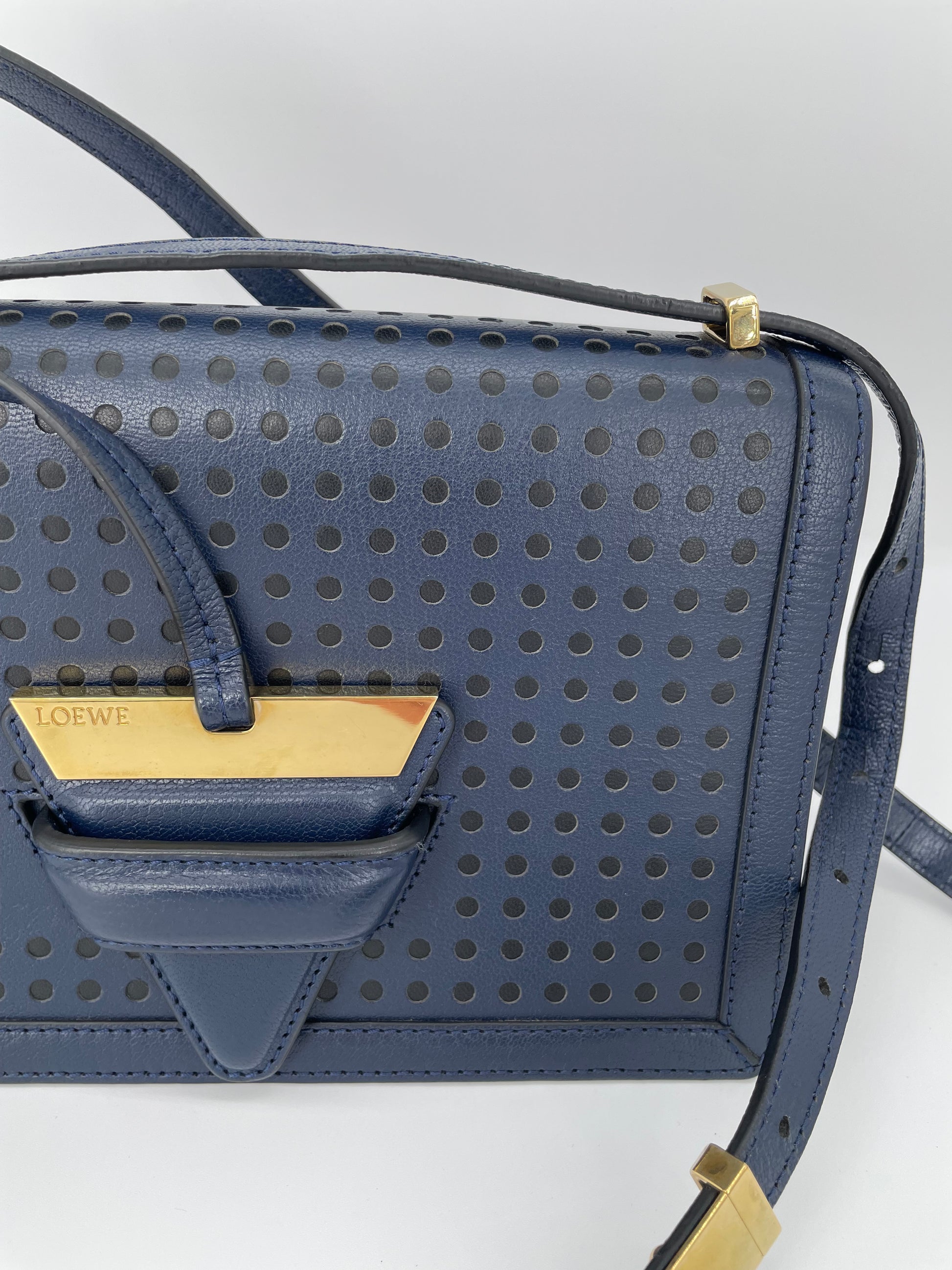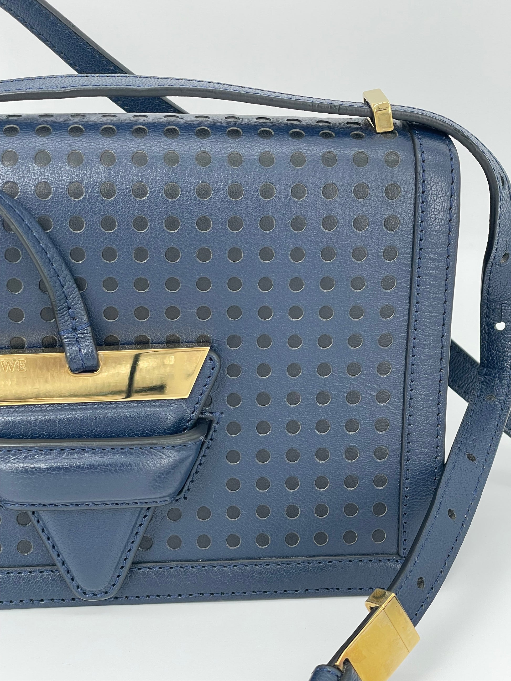 This is a beautiful Loewe Barcelona bag in navy leather with a perforated pattern and gold-tone hardware. This elegant shoulder bag is crafted from grainy calfskin leather with dotted perforated dealing with contrasting goldtone hardware. The front flap is secured with logo engraved triangle closure, which opens to an all leather interior with a main compartment and open slip pockets. The bag features an adjustable leather shoulder strap so can be worn on the shoulder or crossbody.