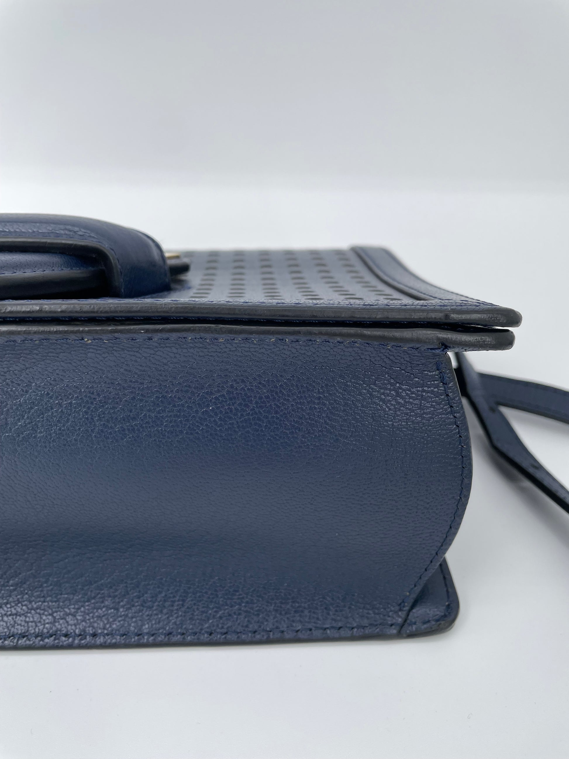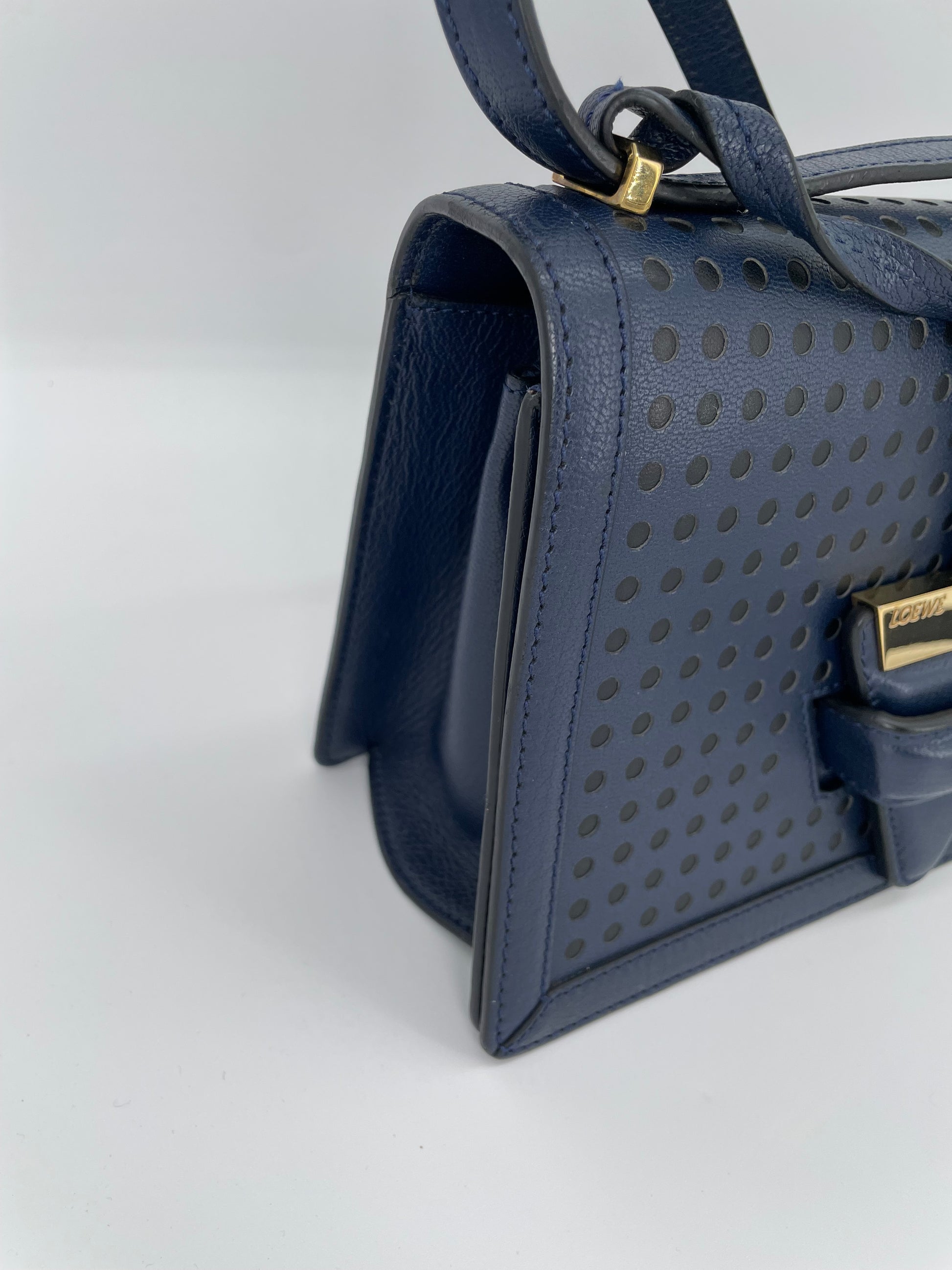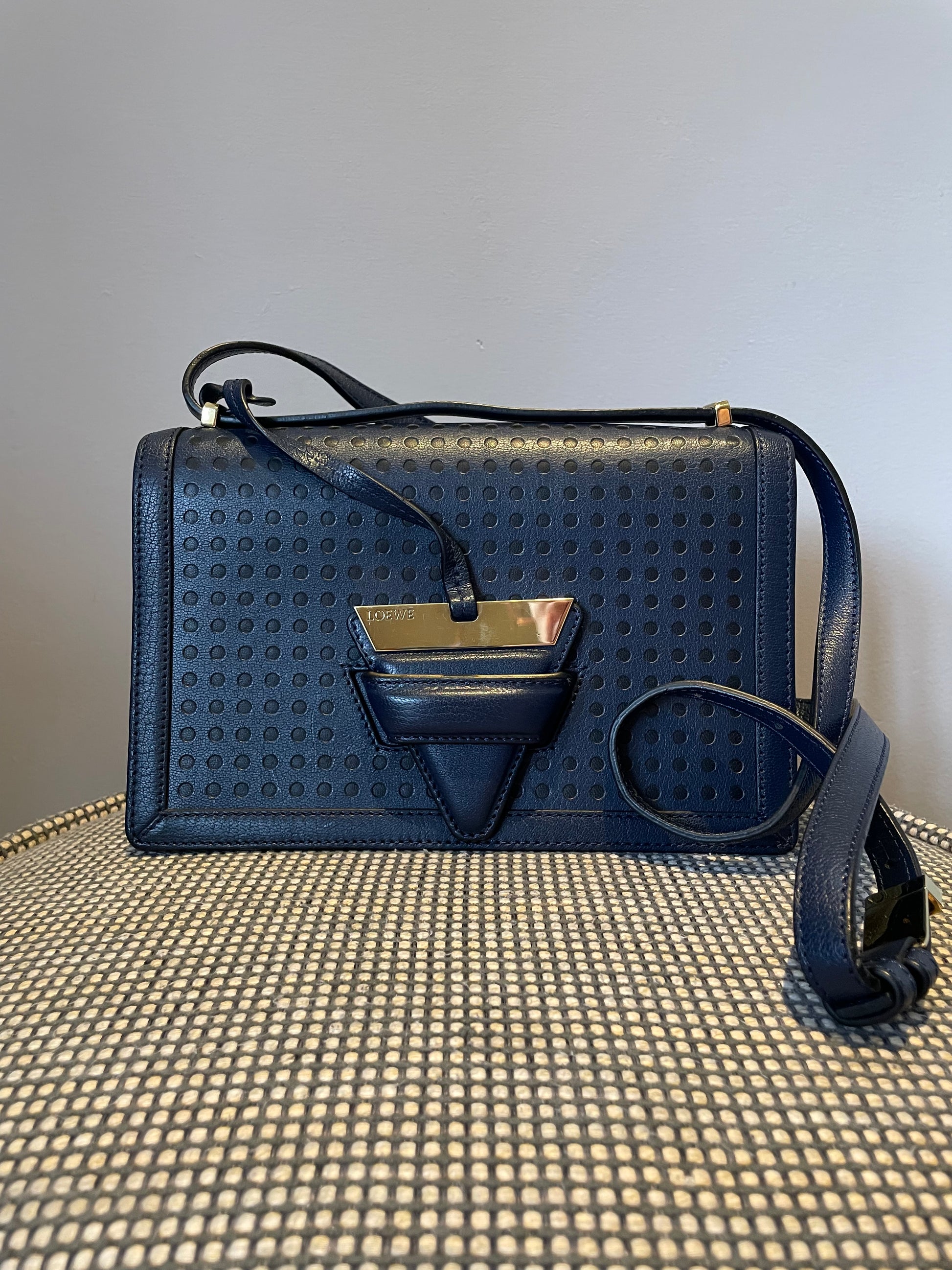 This is a beautiful Loewe Barcelona bag in navy leather with a perforated pattern and gold-tone hardware. This elegant shoulder bag is crafted from grainy calfskin leather with dotted perforated dealing with contrasting goldtone hardware. The front flap is secured with logo engraved triangle closure, which opens to an all leather interior with a main compartment and open slip pockets. The bag features an adjustable leather shoulder strap so can be worn on the shoulder or crossbody.