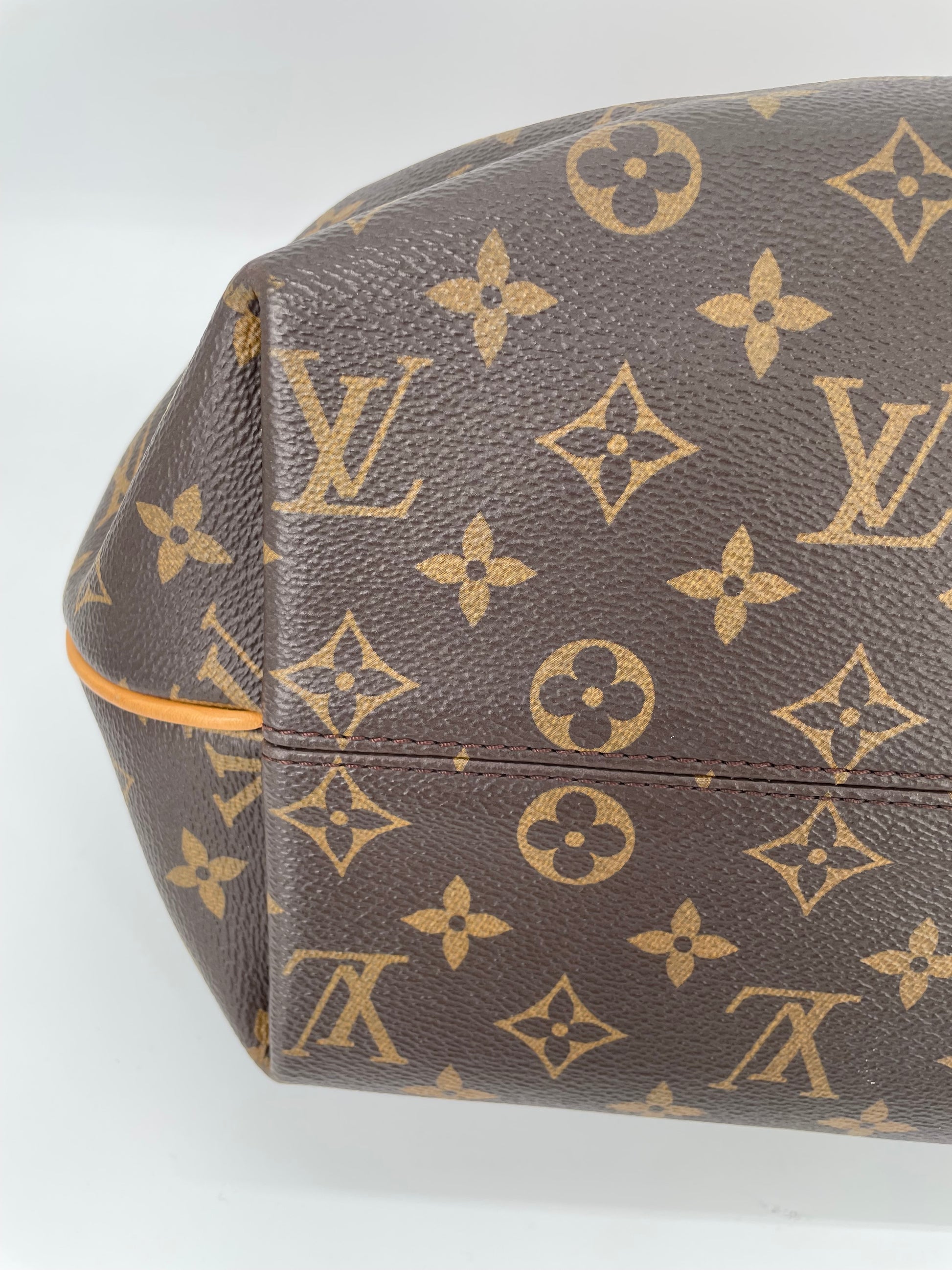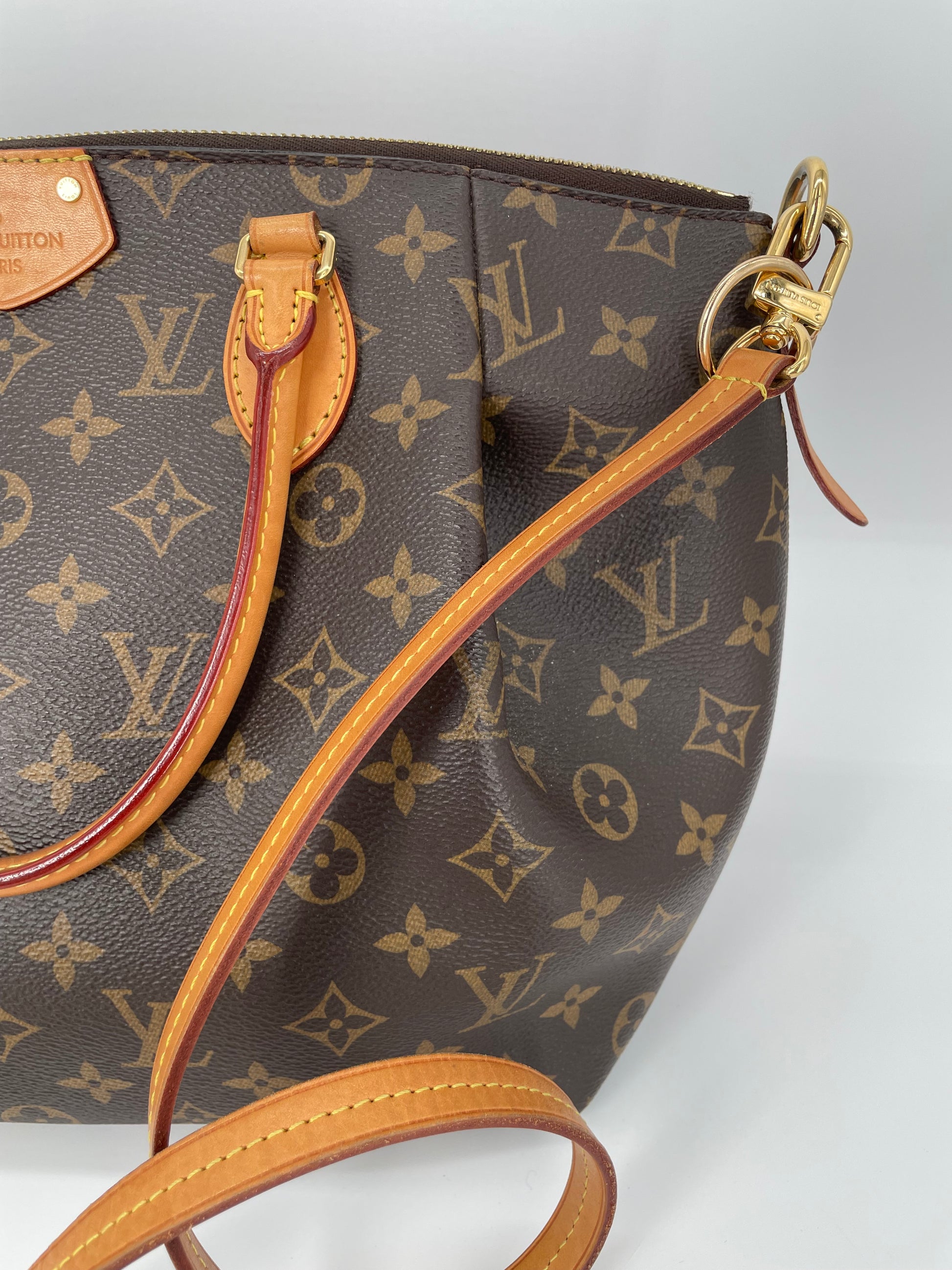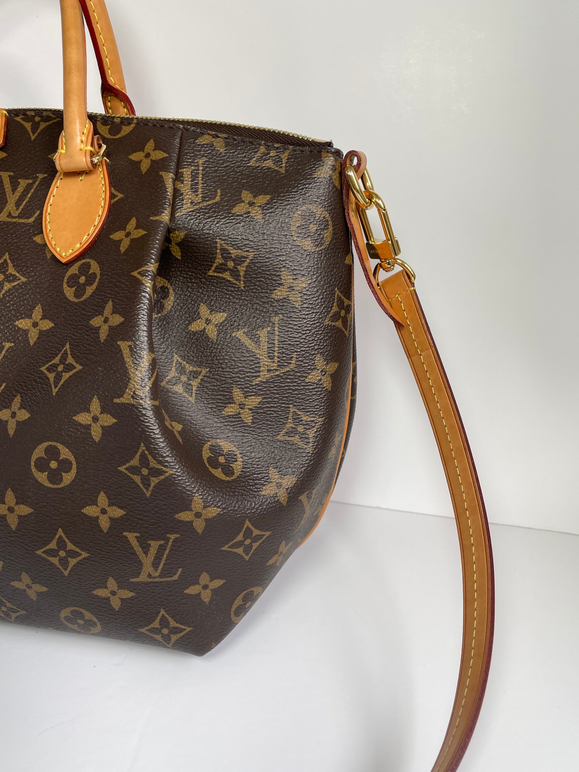 This is a stylish, versatile and beautiful Louis Vuitton Monogram Turenne MM Tote Bag. This stylish tote is crafted of Louis Vuitton monogram canvas. The bag features rolled vachetta leather top handles with goldtone links, an optional shoulder strap and pleated sides. The zip top closure opens to a bordeaux fabric interior with three open slip pockets.