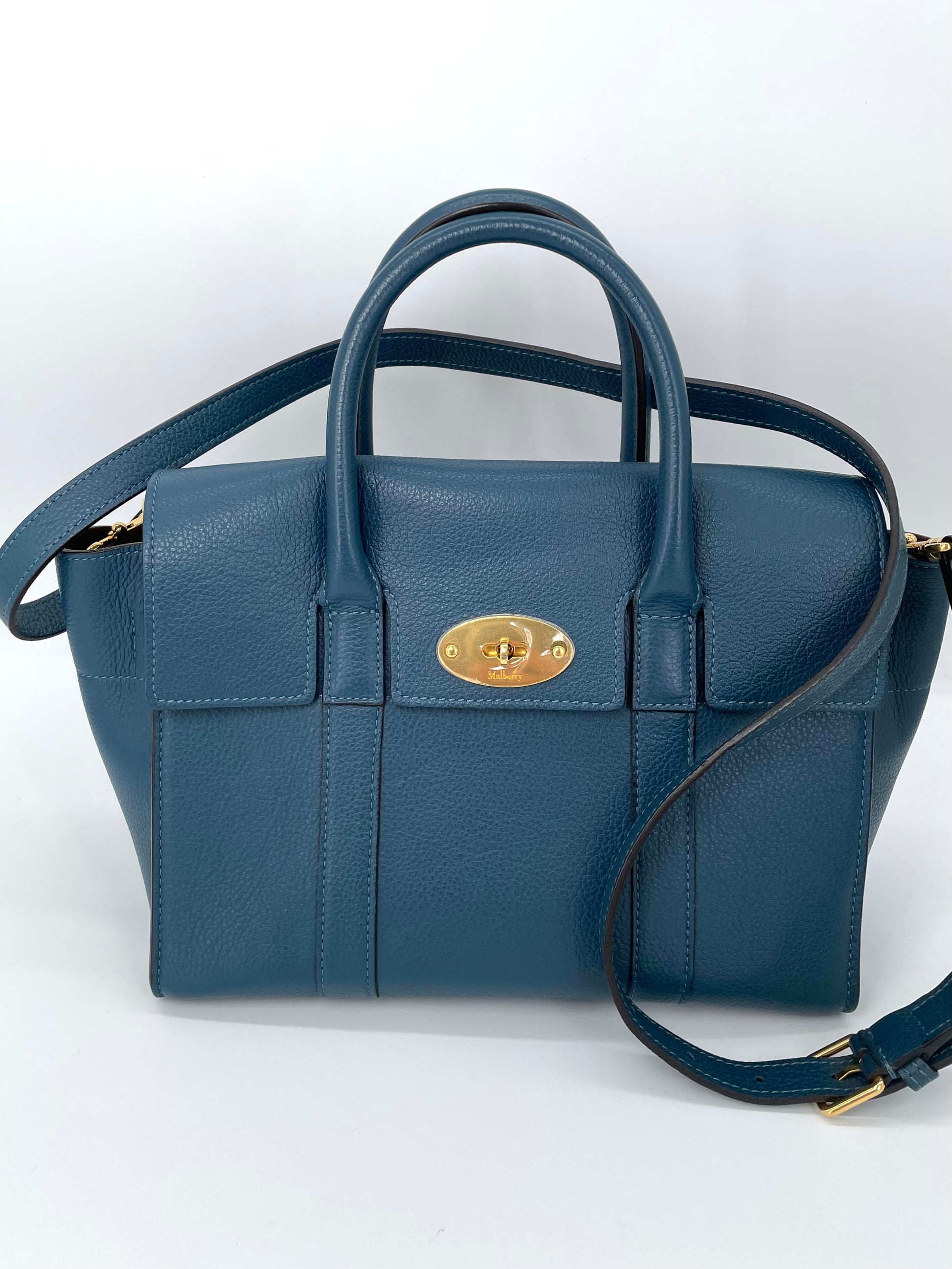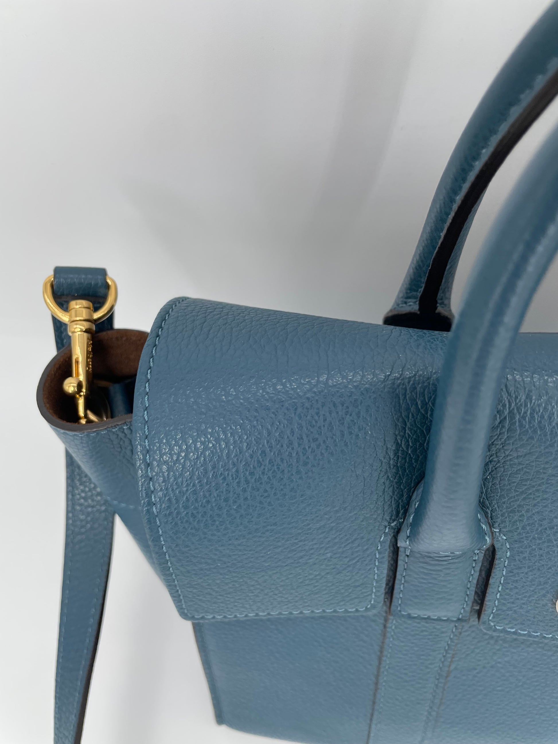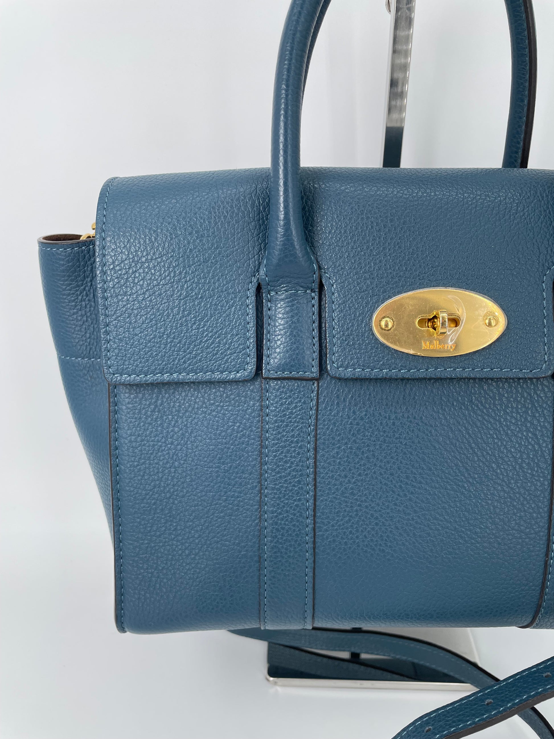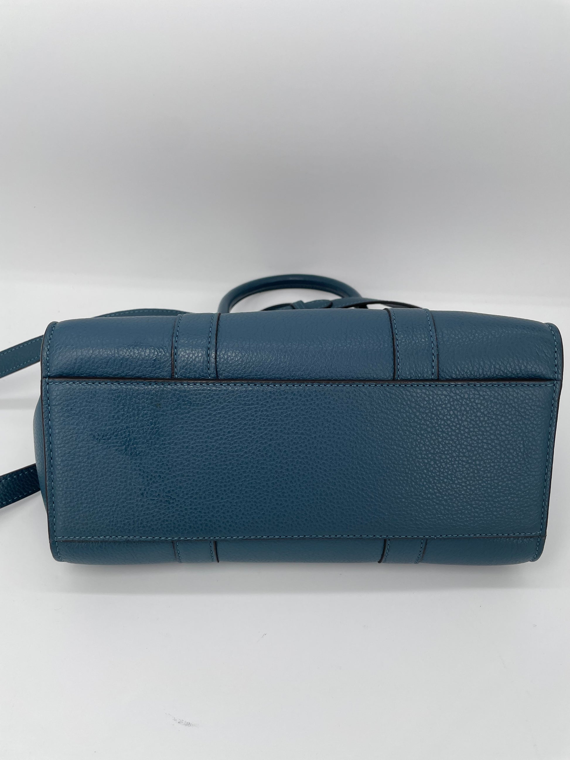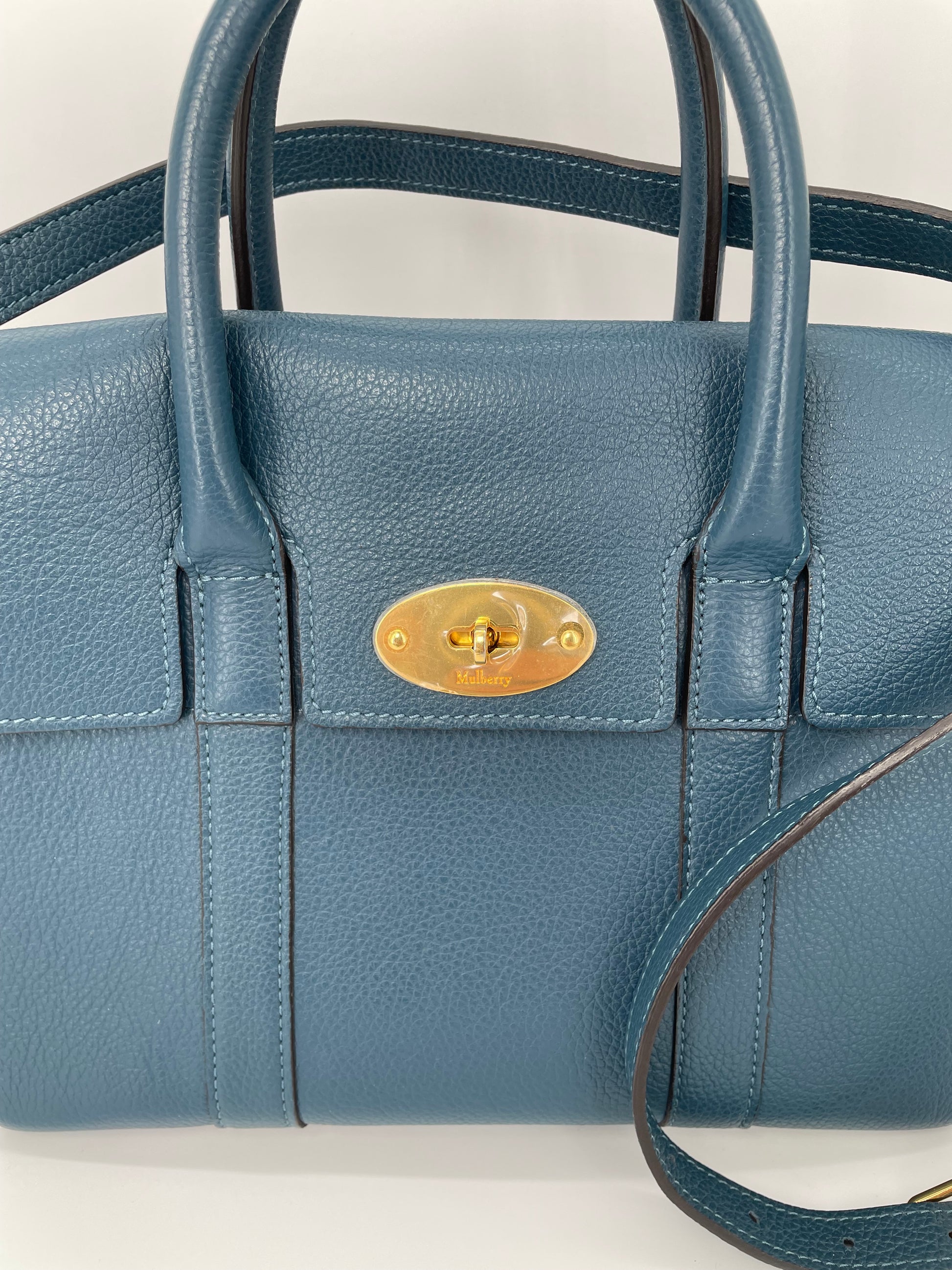 This is a beautiful small Mulberry Bayswater satchel bag in grainy deep blue leather and silvertone hardware (the colour is Deep Sea Blue) Smaller in size, this version has been thoughtfully constructed to ensure it can still hold all you need.