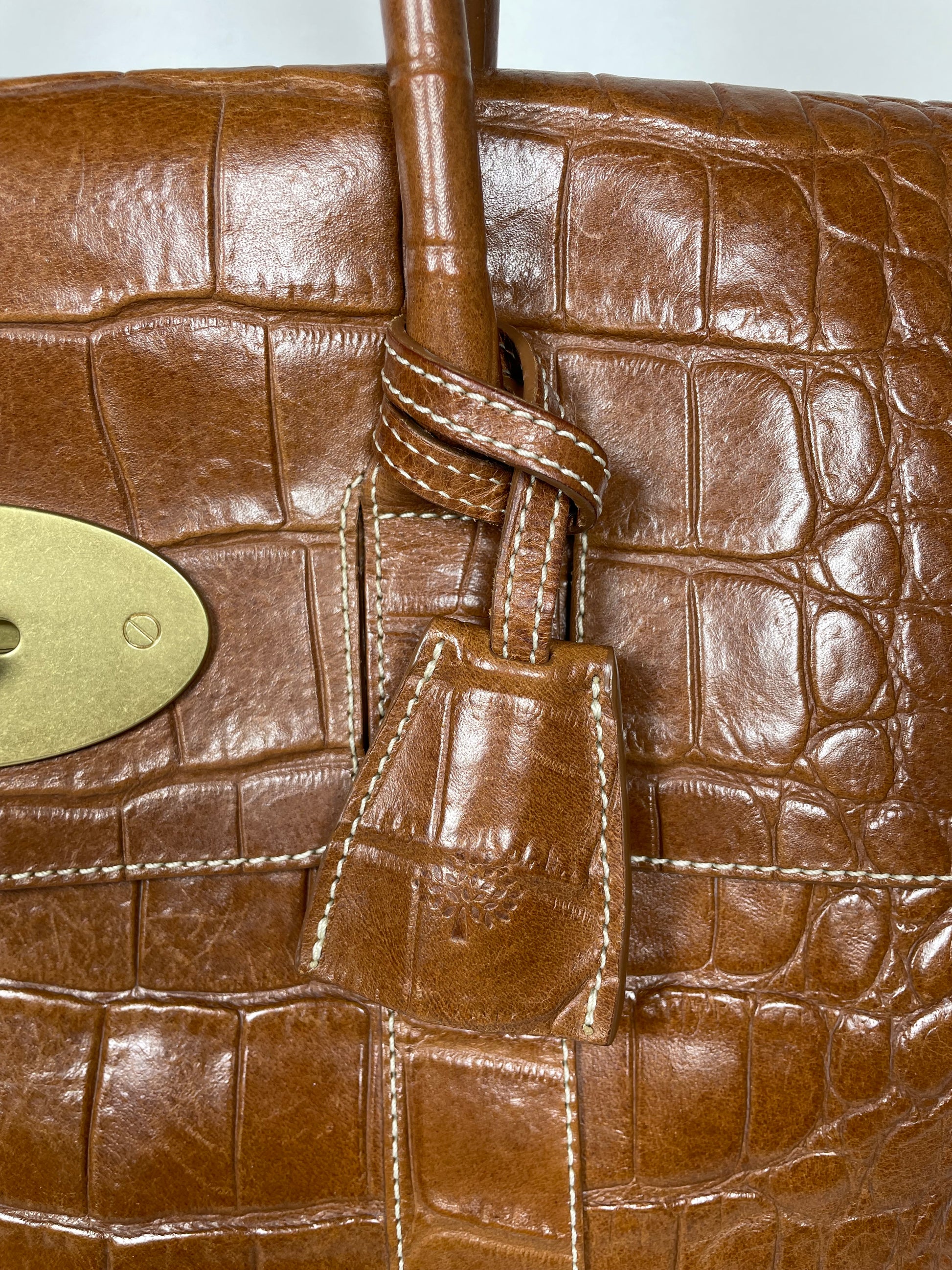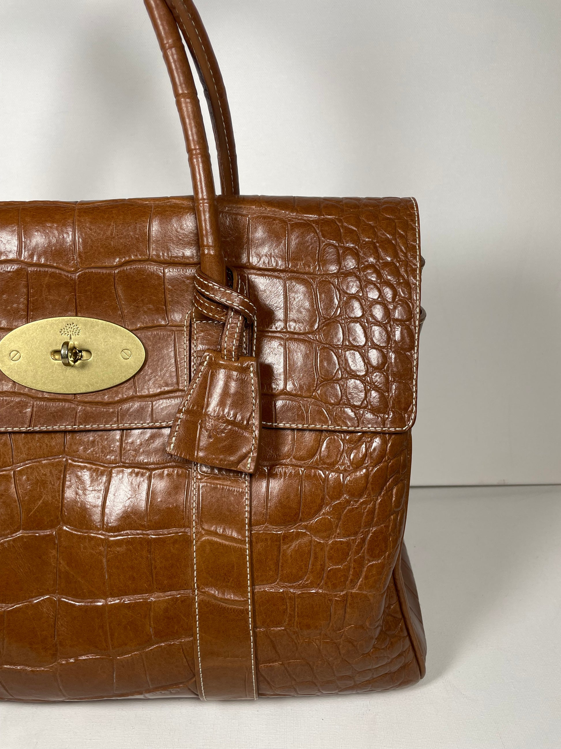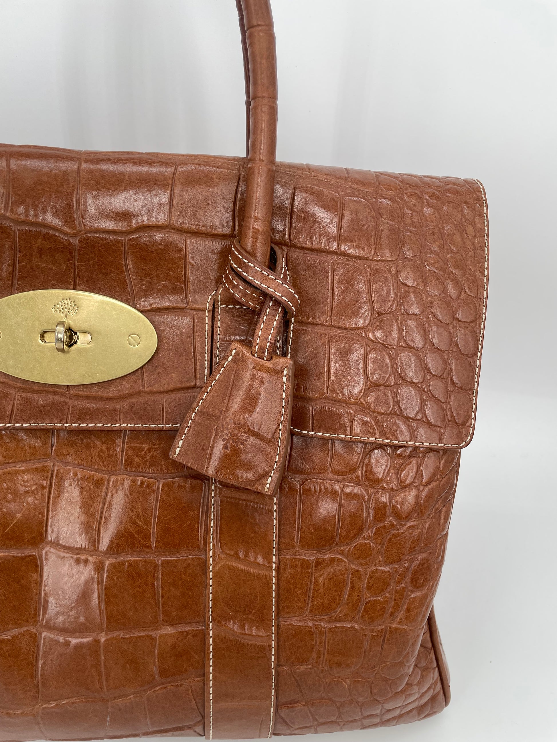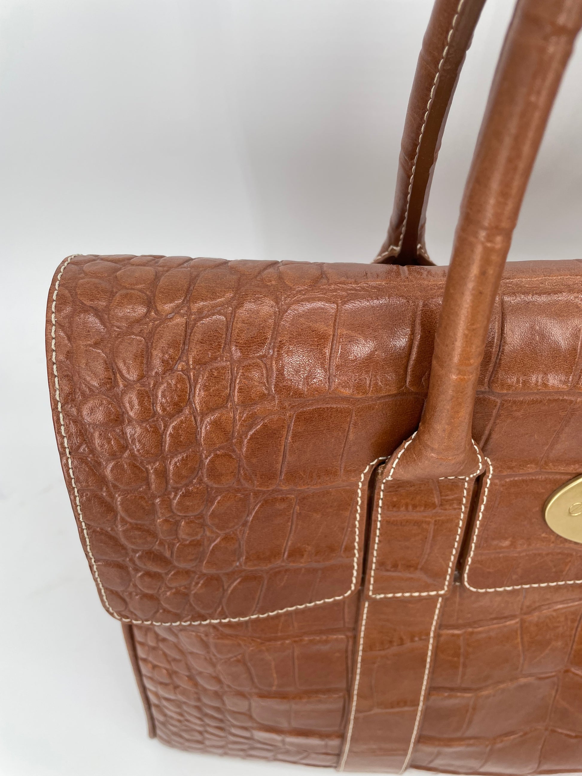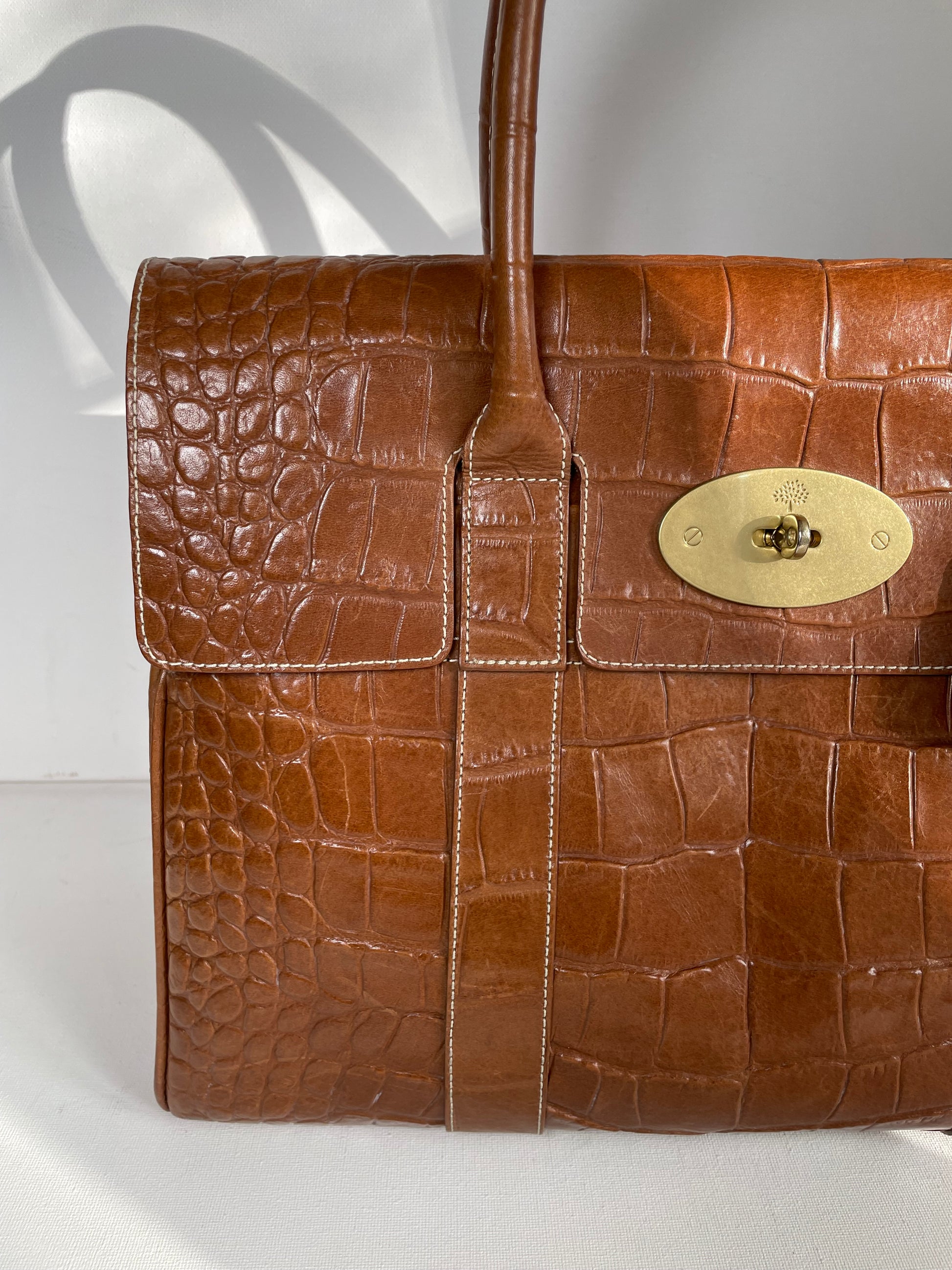 This is a lovely, Iconic Vintage Classic Heritage Mulberry Bayswater in Large. This Moc Croc leather bag in Oak is crafted from hardwearing leather that allows the structure to be maintained beautifully. This is an iconic silhouette, its simple structure, timeless design and signature postman's lock make it instantly recognisable. The front flap opens to an unlined suede interior with a secure zipped pocket and two open slip pockets .