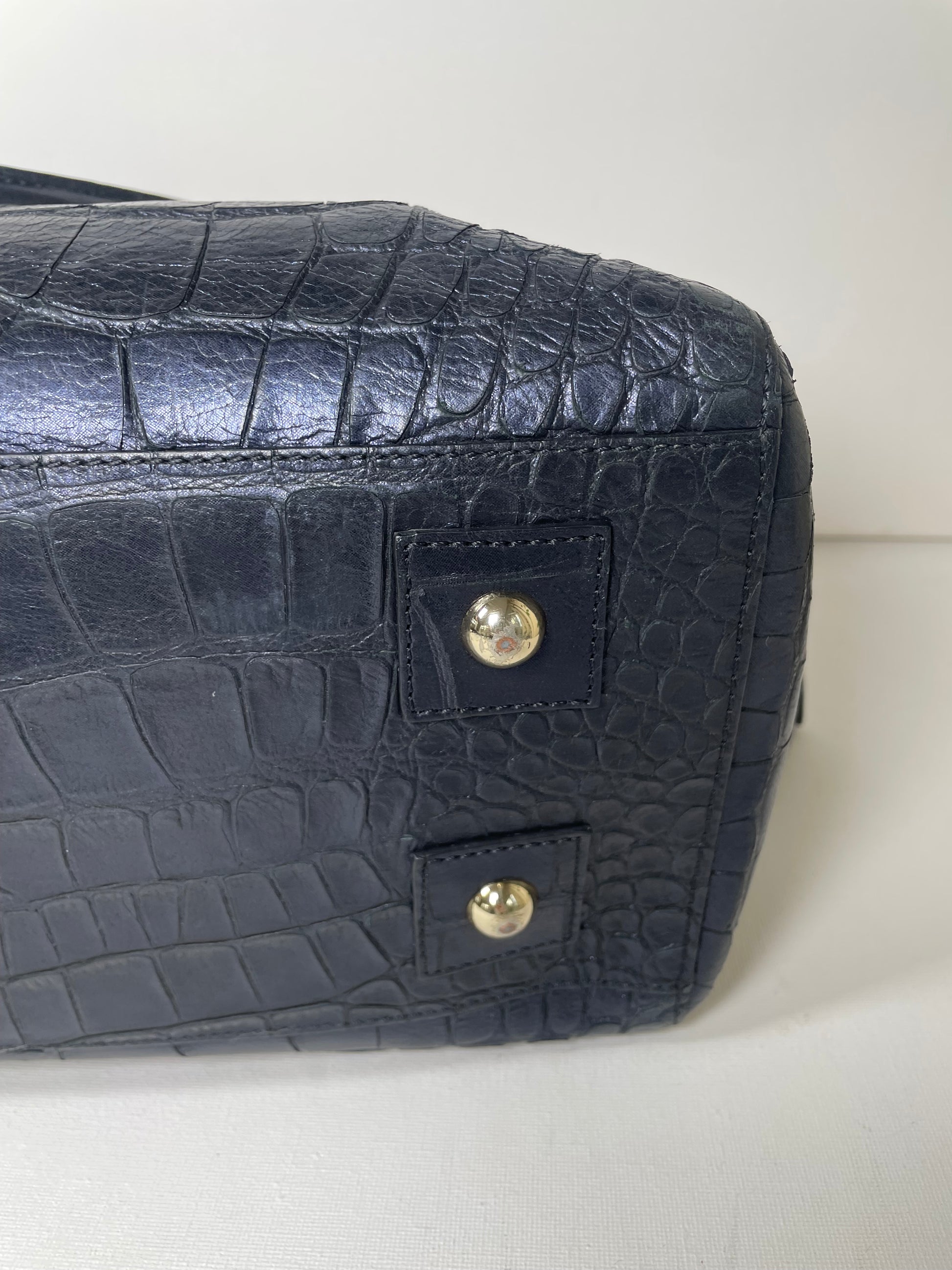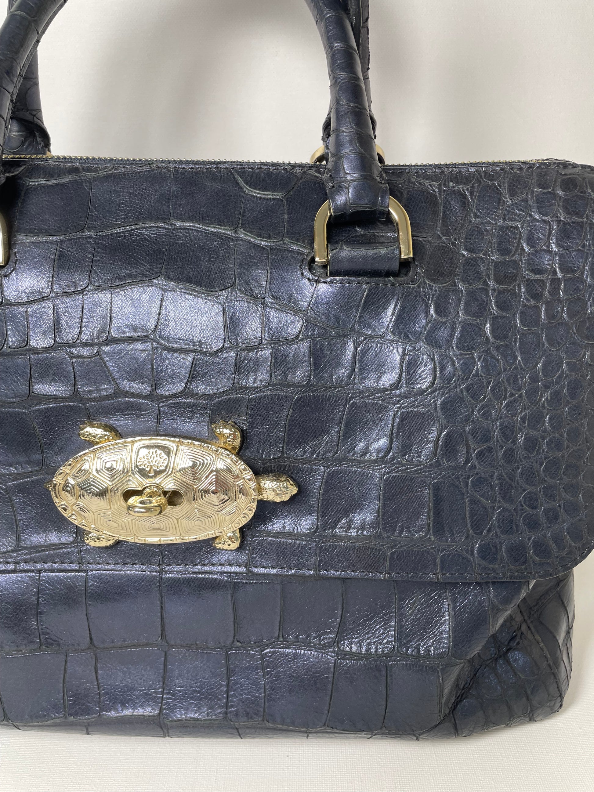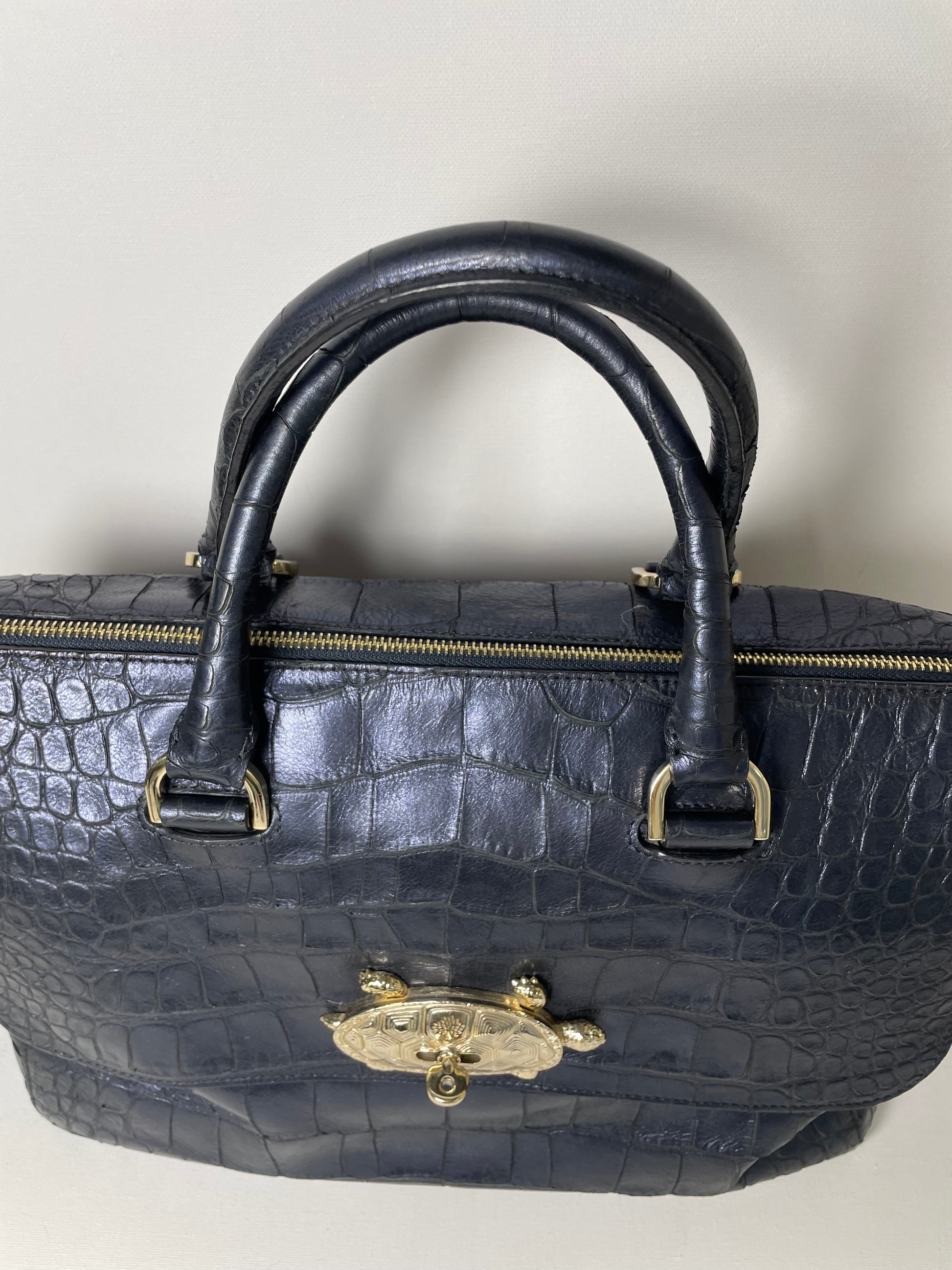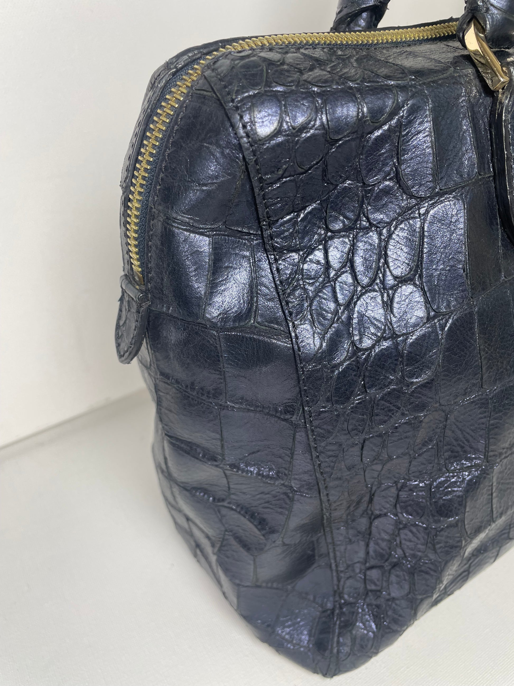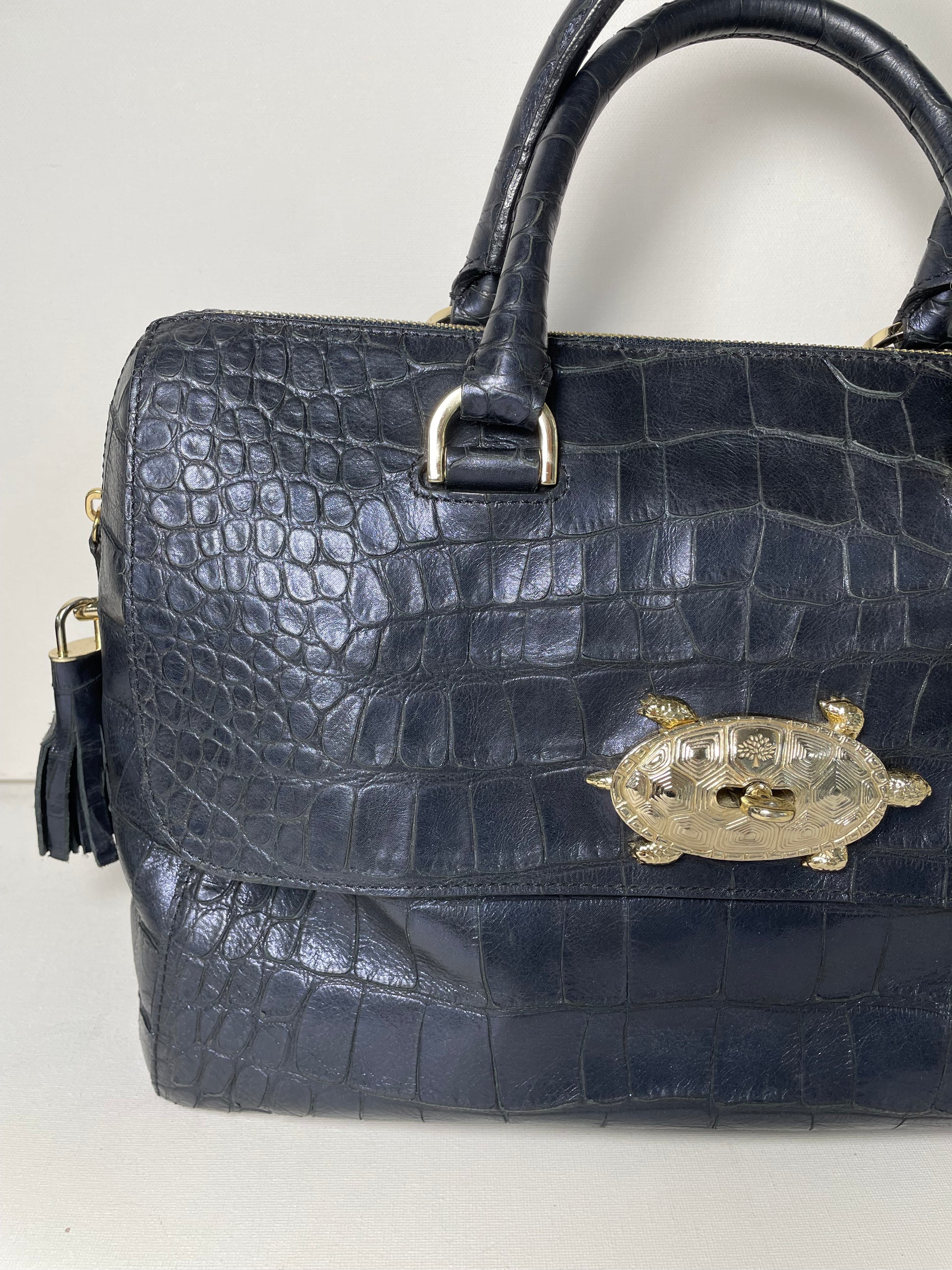 The Mulberry Del Rey bag is a classic, simple and elegant bag . This Boston Bag is in a moc croc embossed Ink Blue Sparkle Calfskin with a Shiny Gold Tone Turtle Plaque Lock and Feature Tassle. This head turning top handle Boston was produced in limited numbers and has become a highly sought after piece. This bag has a zip top closure, a handy front pocket and two top handles. Inside is lined in black coloured Mulberry fabric with a zip close pocket and open slip pocket.