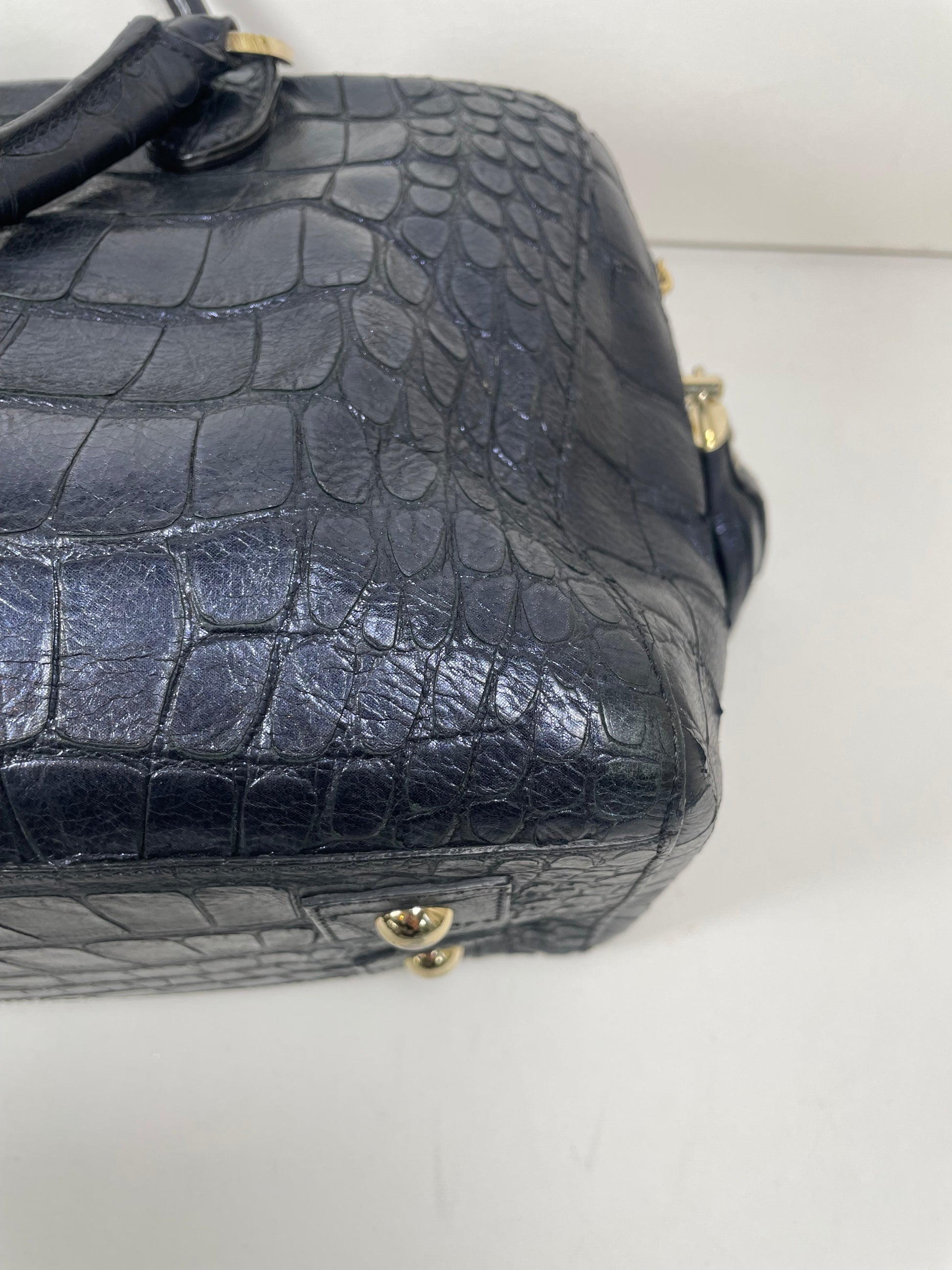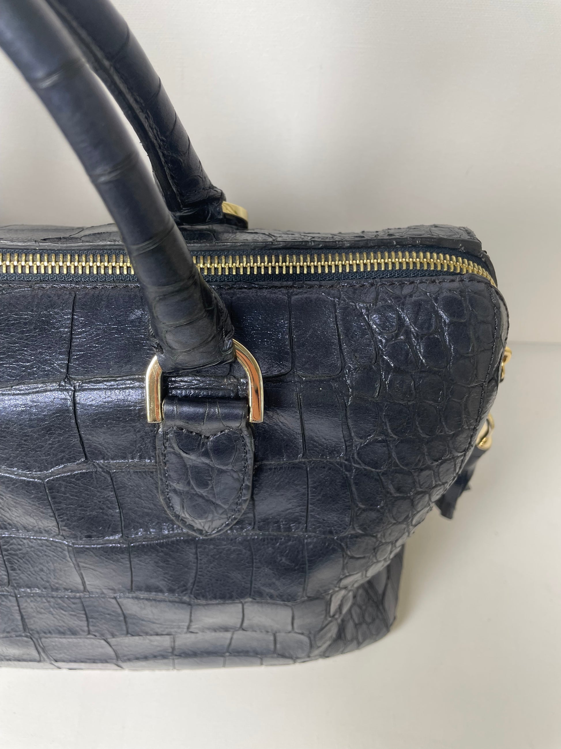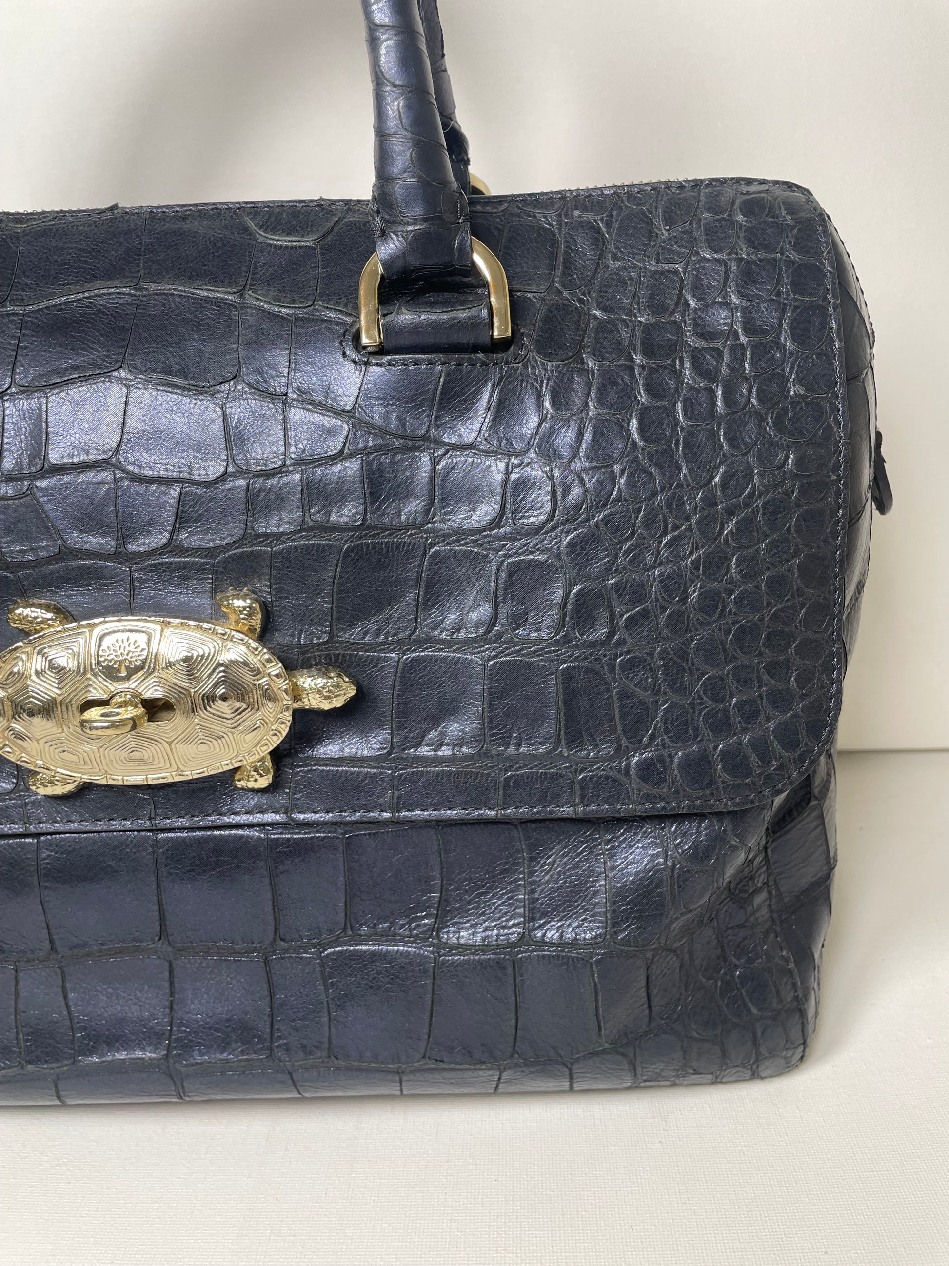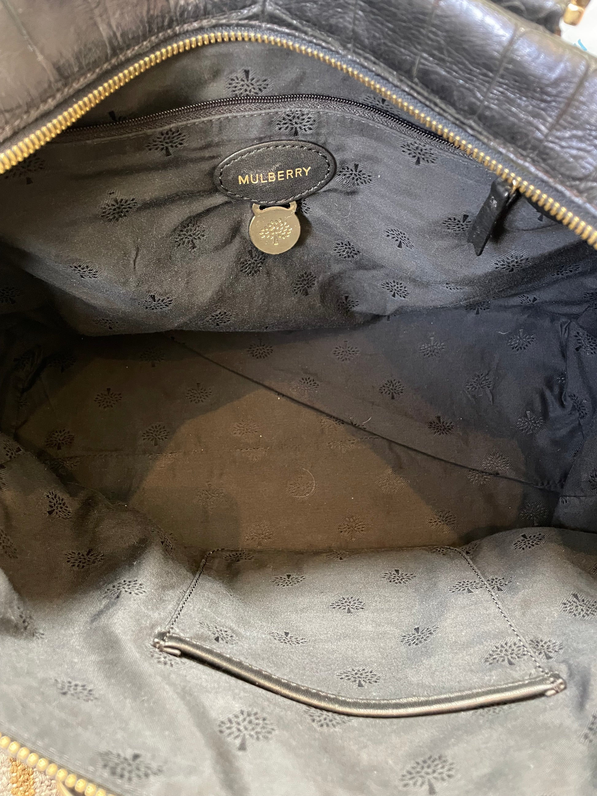 The Mulberry Del Rey bag is a classic, simple and elegant bag . This Boston Bag is in a moc croc embossed Ink Blue Sparkle Calfskin with a Shiny Gold Tone Turtle Plaque Lock and Feature Tassle. This head turning top handle Boston was produced in limited numbers and has become a highly sought after piece. This bag has a zip top closure, a handy front pocket and two top handles. Inside is lined in black coloured Mulberry fabric with a zip close pocket and open slip pocket.