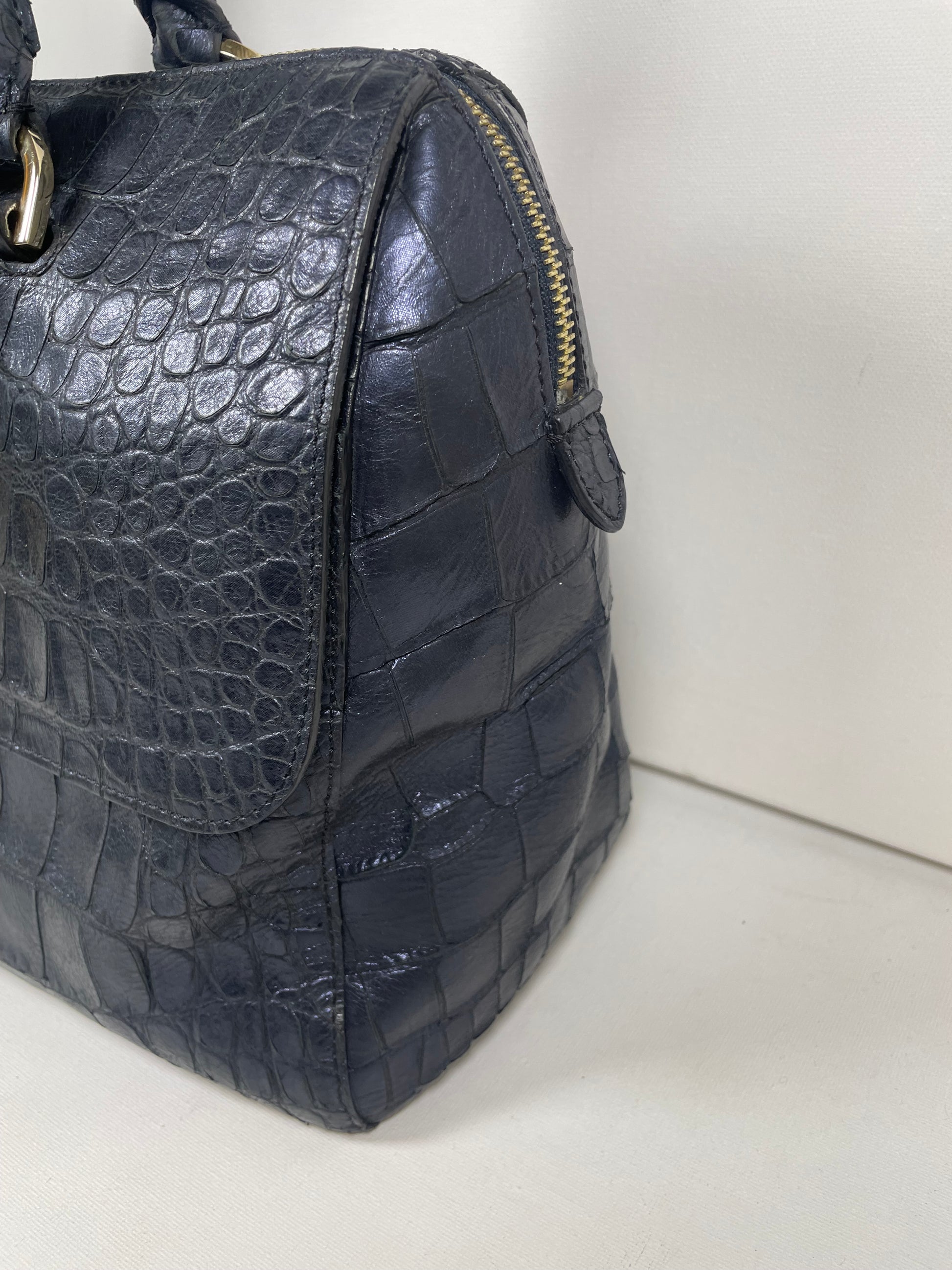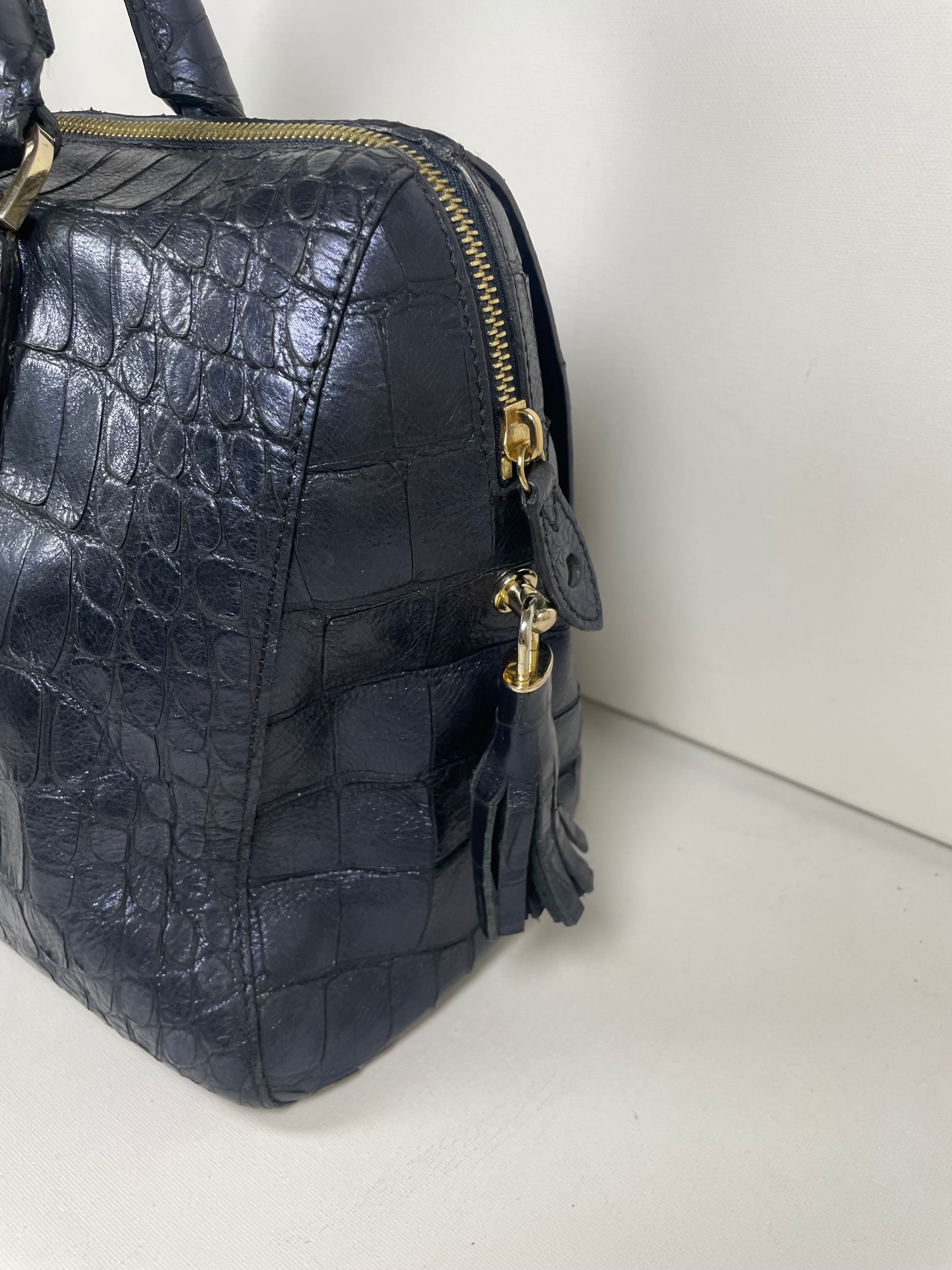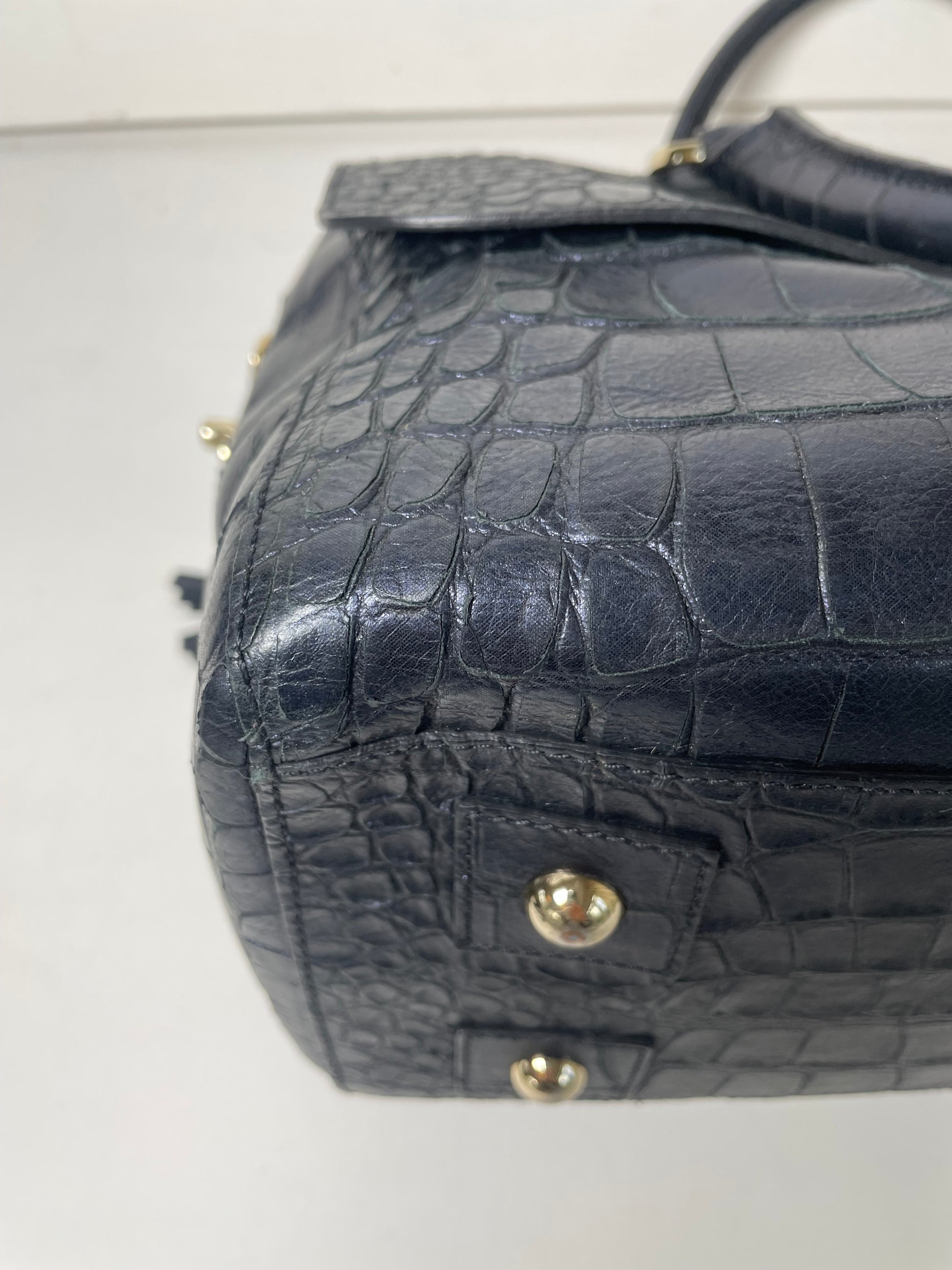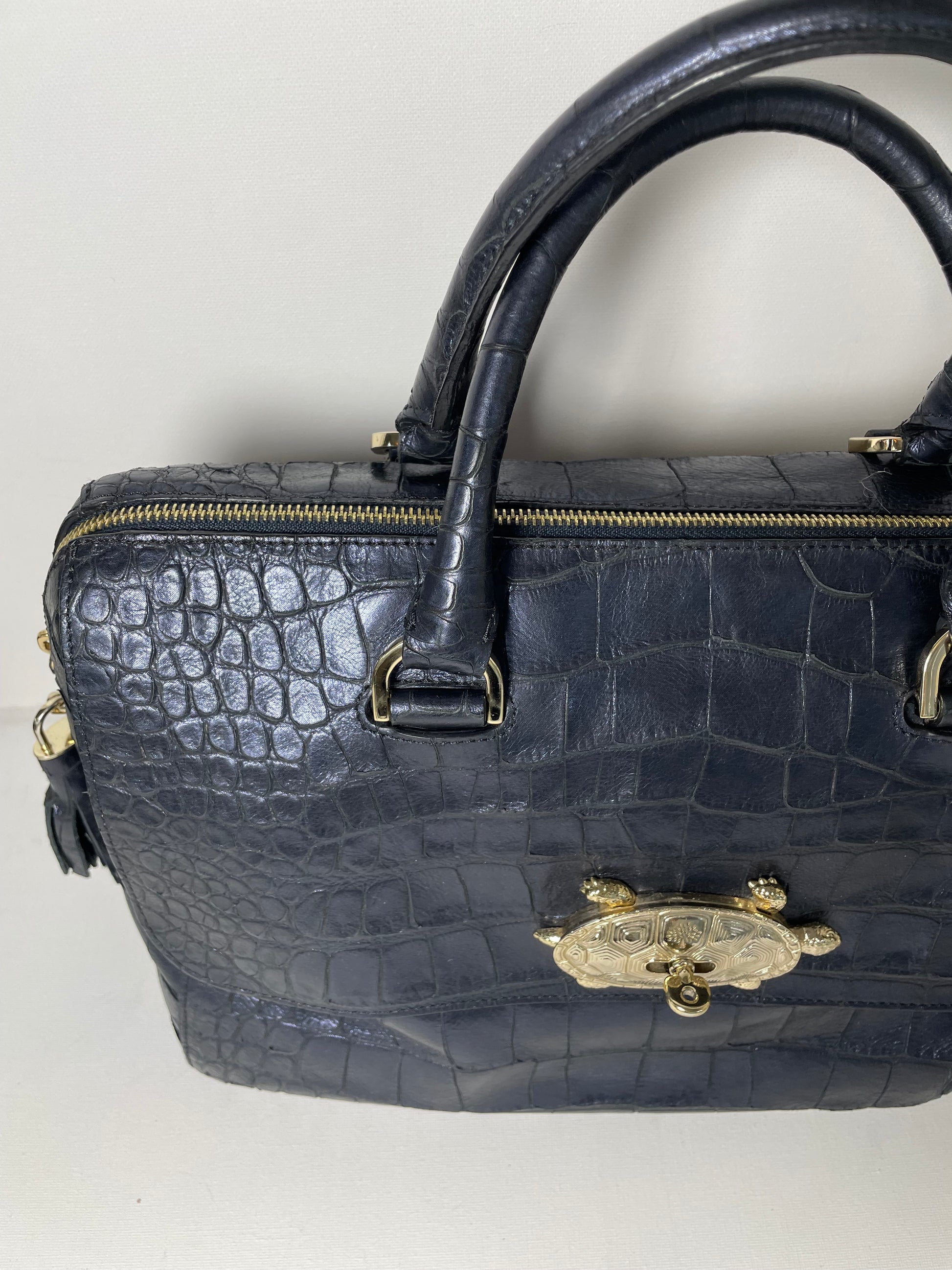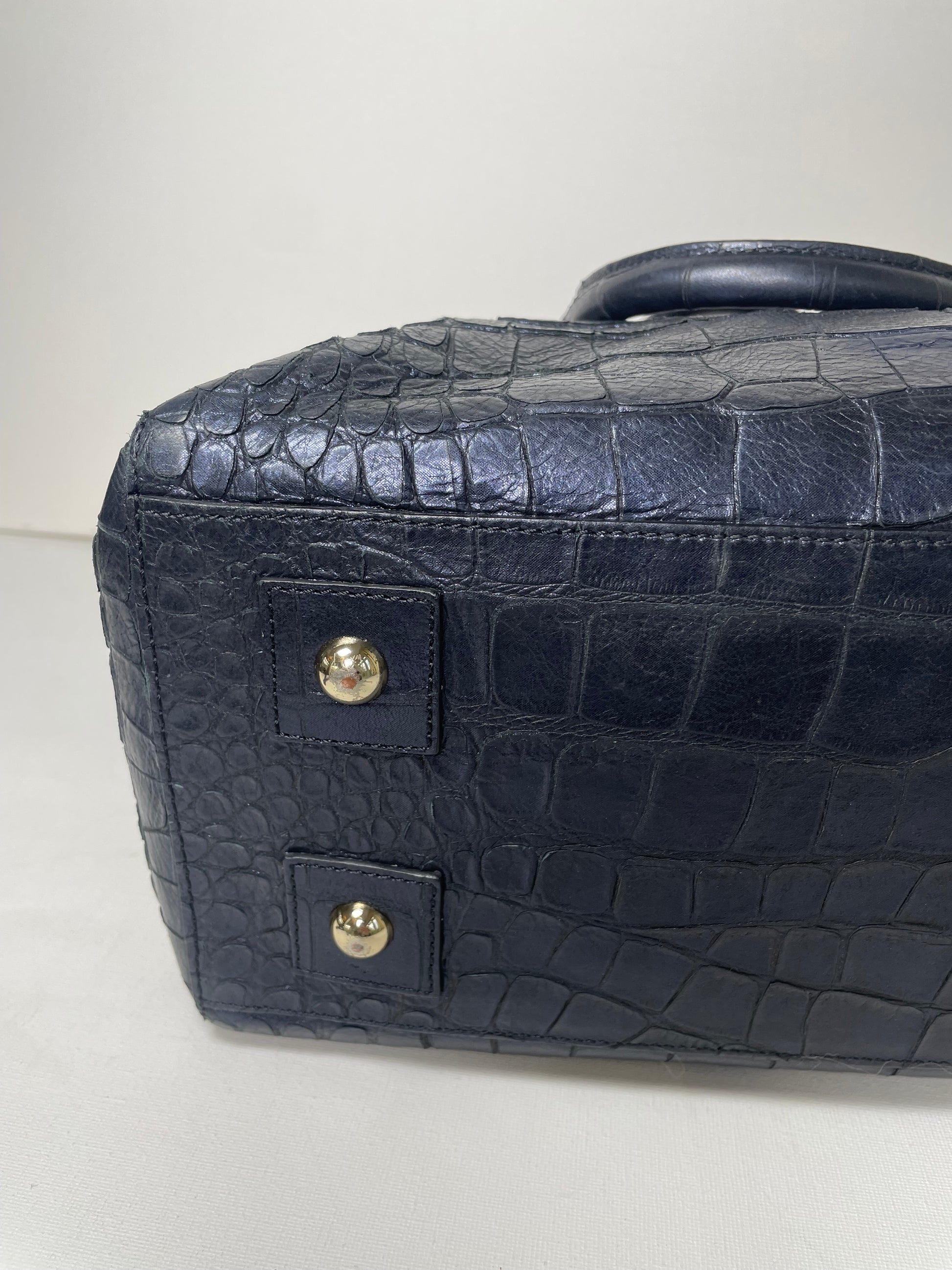 The Mulberry Del Rey bag is a classic, simple and elegant bag . This Boston Bag is in a moc croc embossed Ink Blue Sparkle Calfskin with a Shiny Gold Tone Turtle Plaque Lock and Feature Tassle. This head turning top handle Boston was produced in limited numbers and has become a highly sought after piece. This bag has a zip top closure, a handy front pocket and two top handles. Inside is lined in black coloured Mulberry fabric with a zip close pocket and open slip pocket.