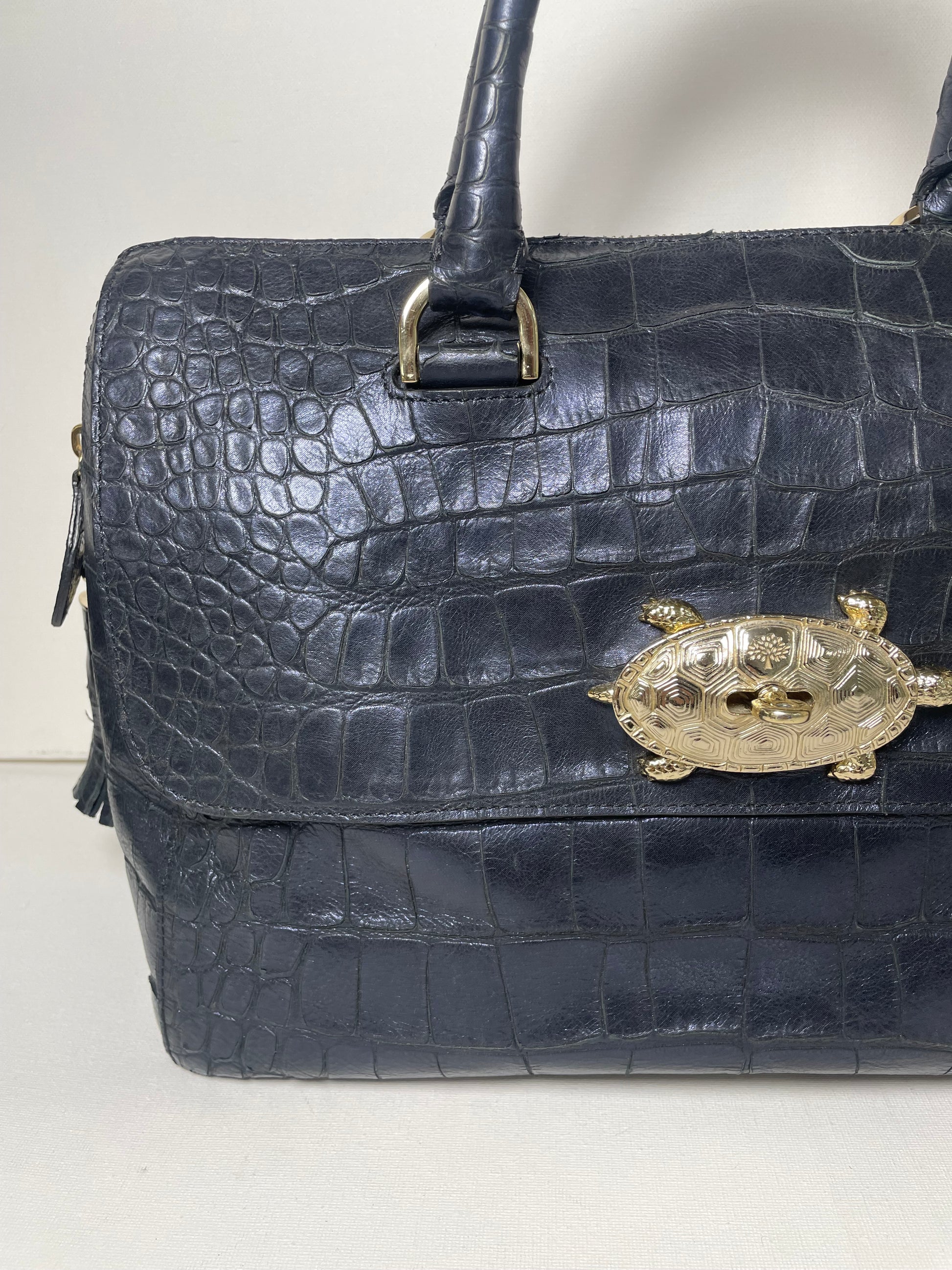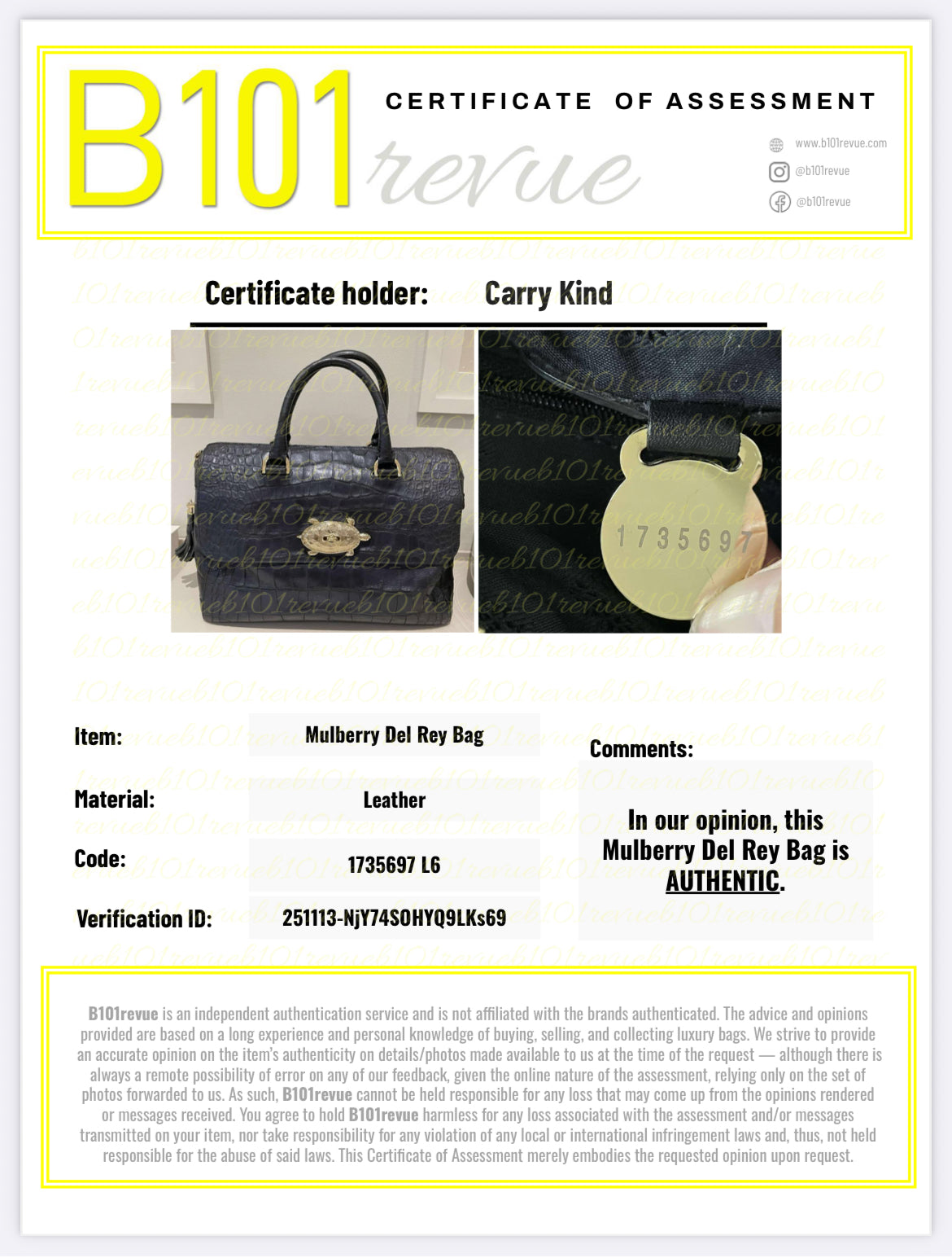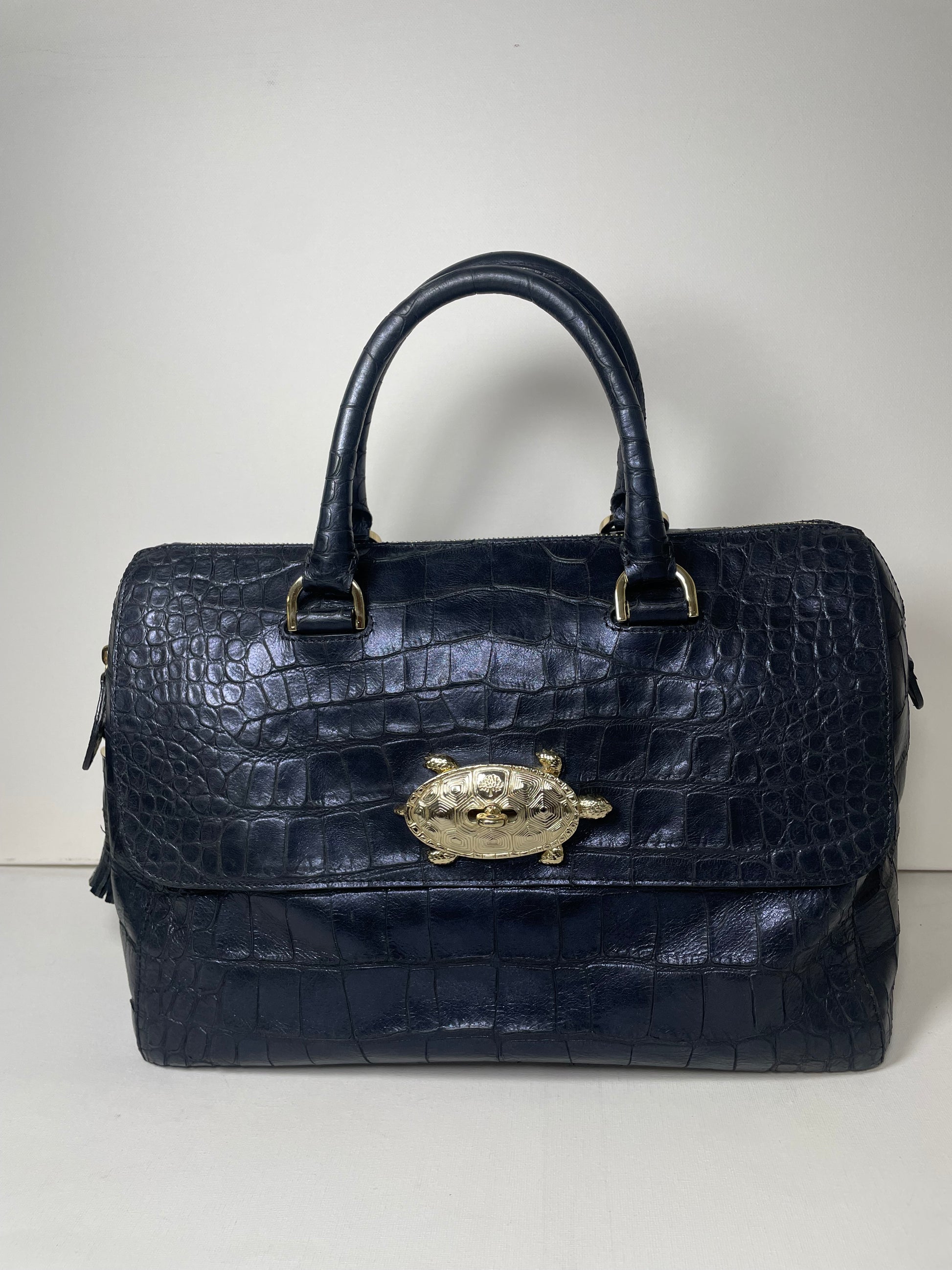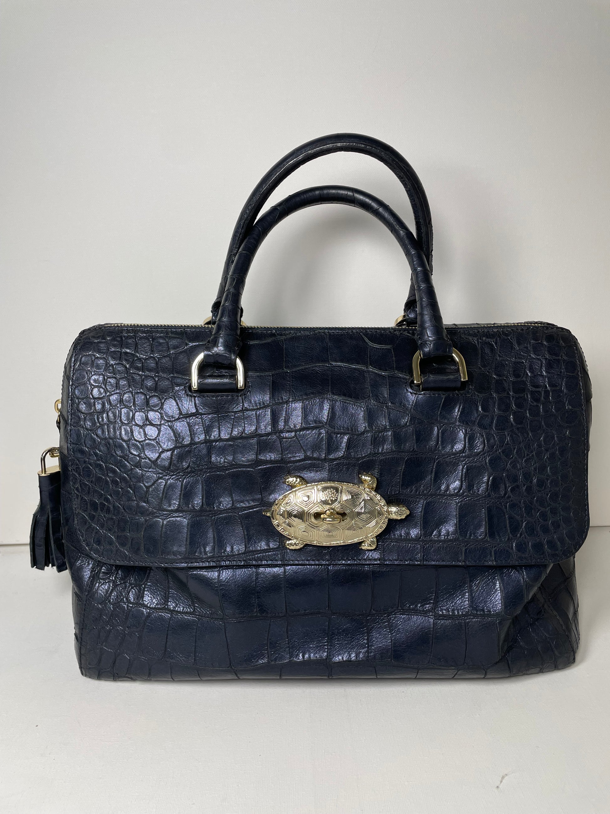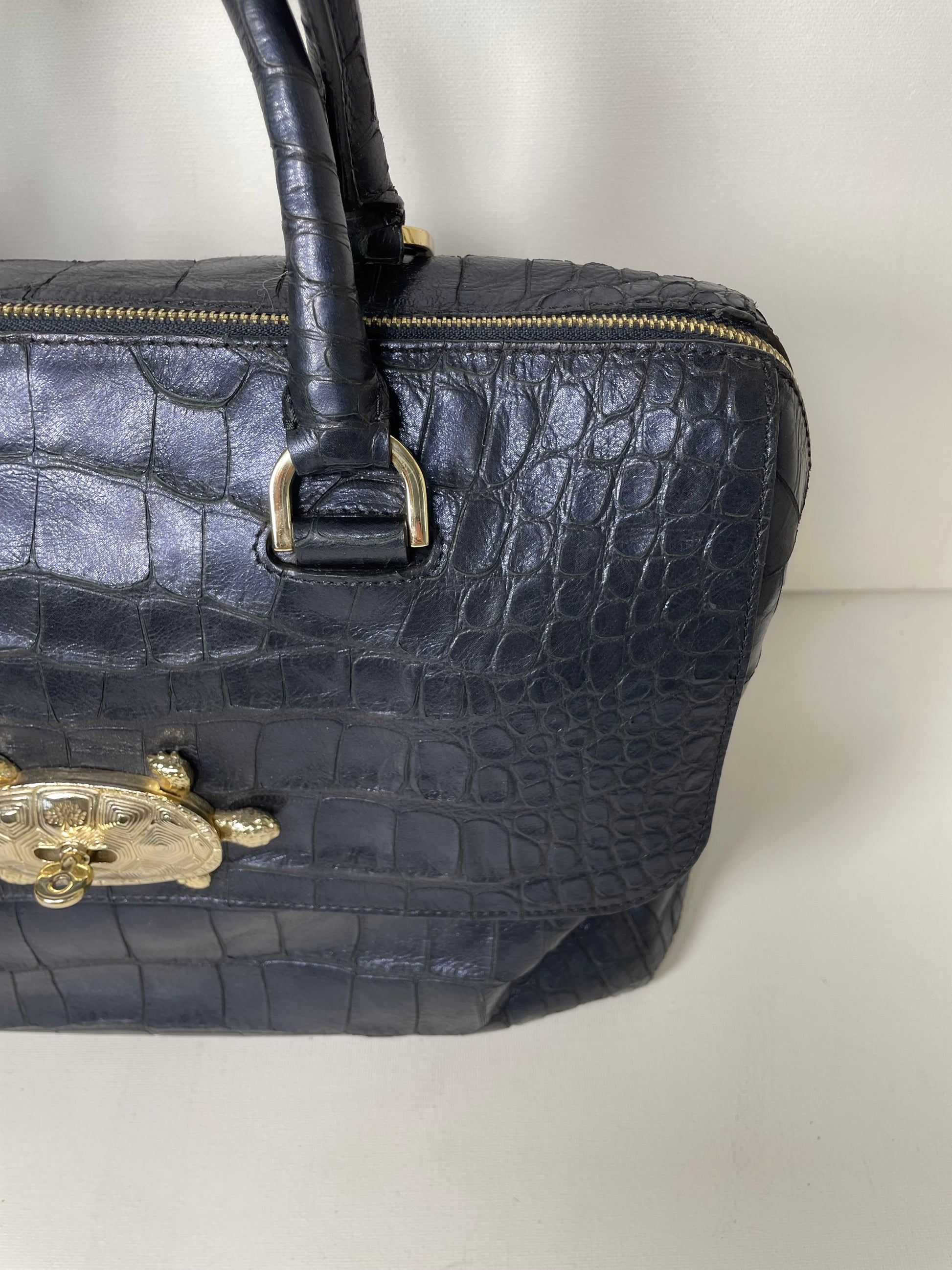 The Mulberry Del Rey bag is a classic, simple and elegant bag . This Boston Bag is in a moc croc embossed Ink Blue Sparkle Calfskin with a Shiny Gold Tone Turtle Plaque Lock and Feature Tassle. This head turning top handle Boston was produced in limited numbers and has become a highly sought after piece. This bag has a zip top closure, a handy front pocket and two top handles. Inside is lined in black coloured Mulberry fabric with a zip close pocket and open slip pocket.