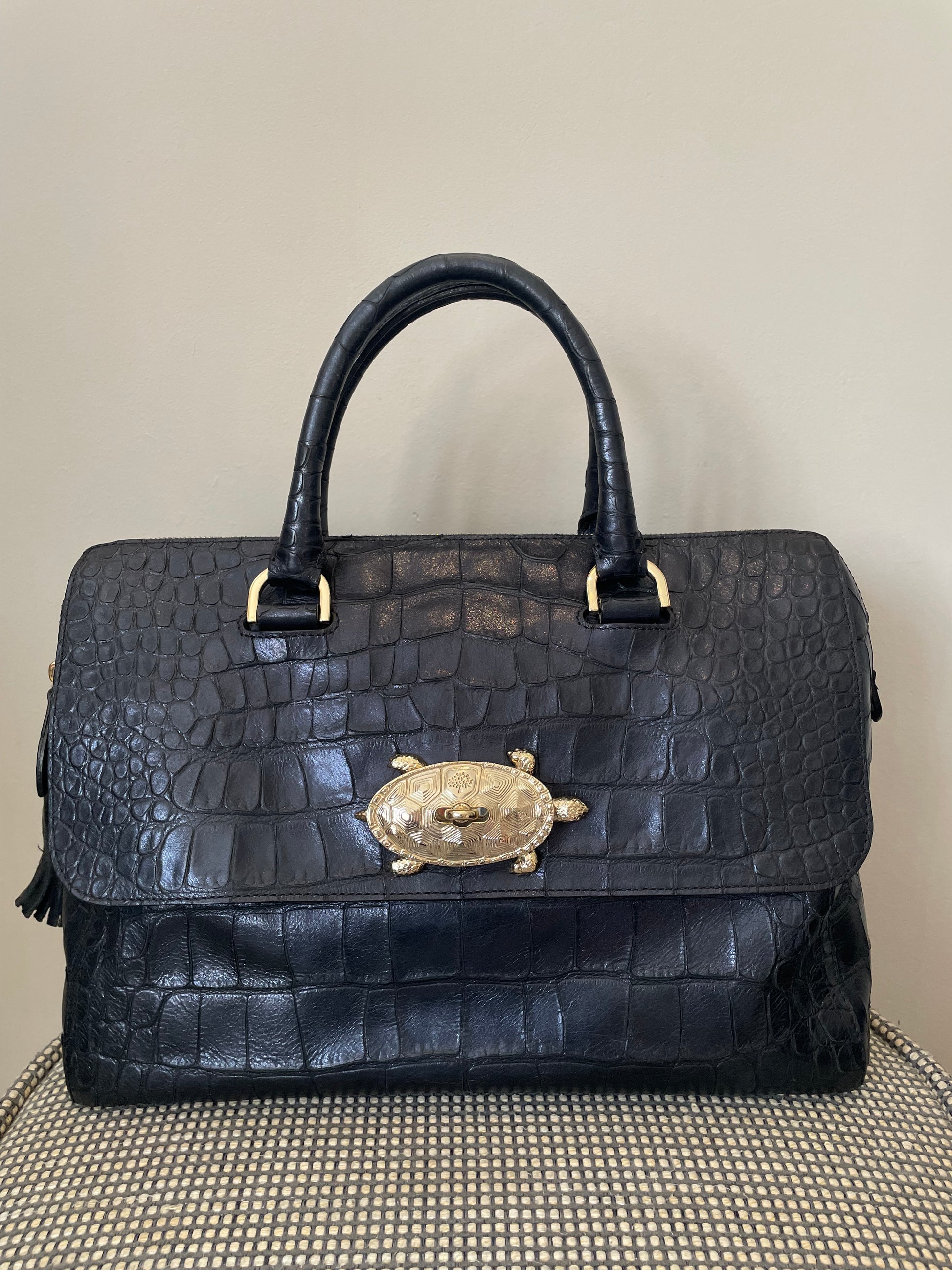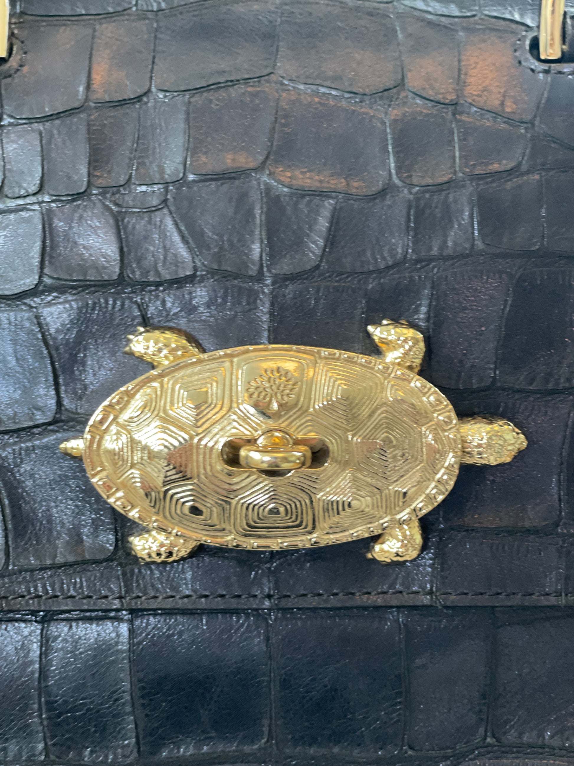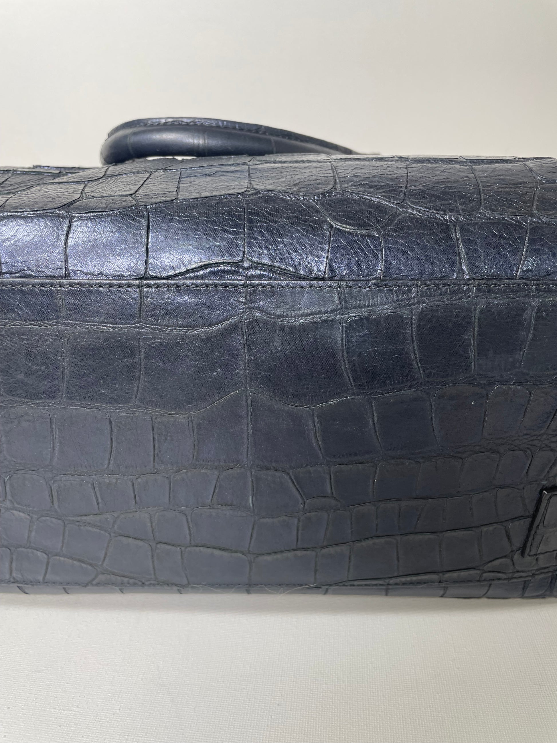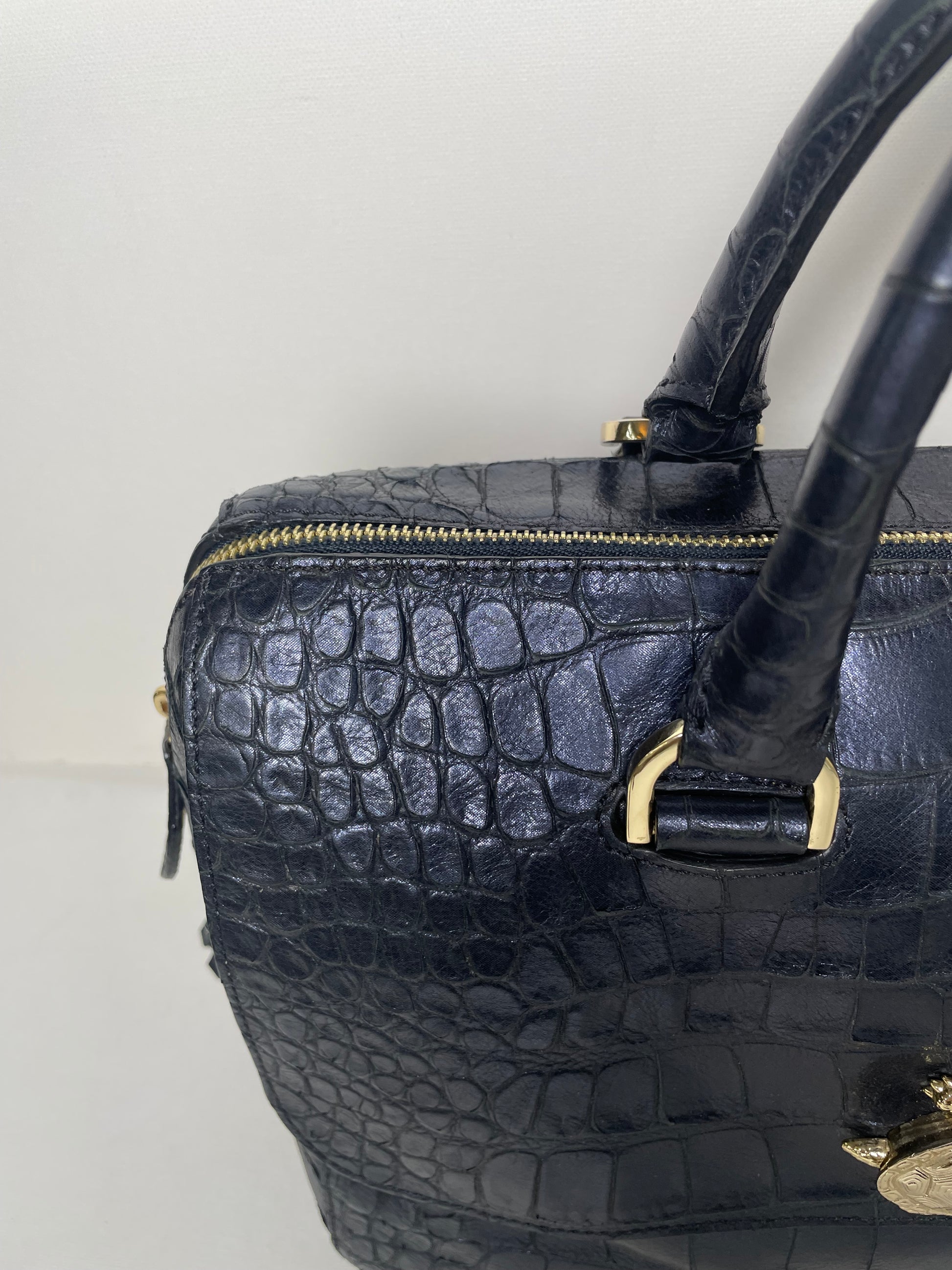 The Mulberry Del Rey bag is a classic, simple and elegant bag . This Boston Bag is in a moc croc embossed Ink Blue Sparkle Calfskin with a Shiny Gold Tone Turtle Plaque Lock and Feature Tassle. This head turning top handle Boston was produced in limited numbers and has become a highly sought after piece. This bag has a zip top closure, a handy front pocket and two top handles. Inside is lined in black coloured Mulberry fabric with a zip close pocket and open slip pocket.