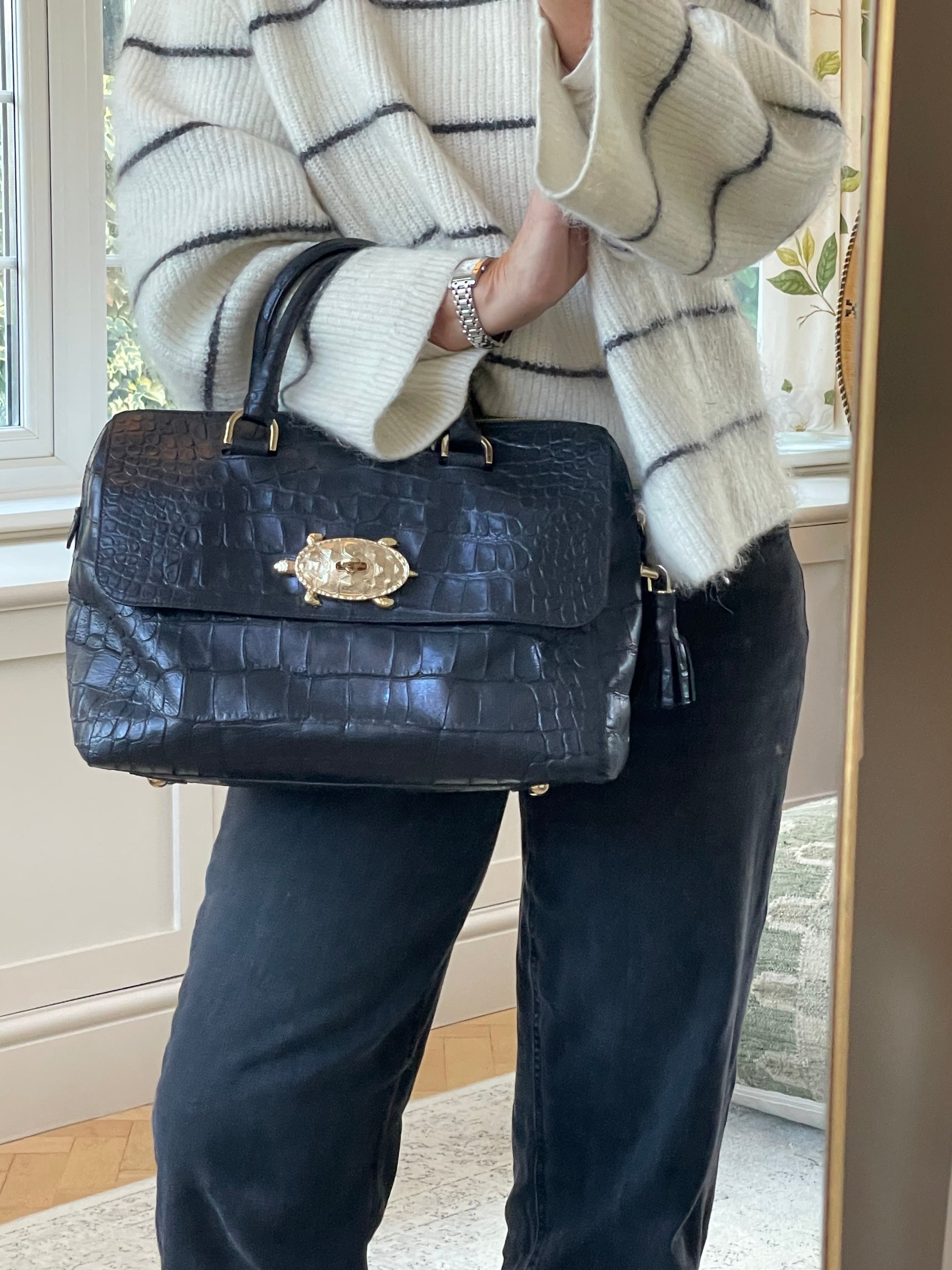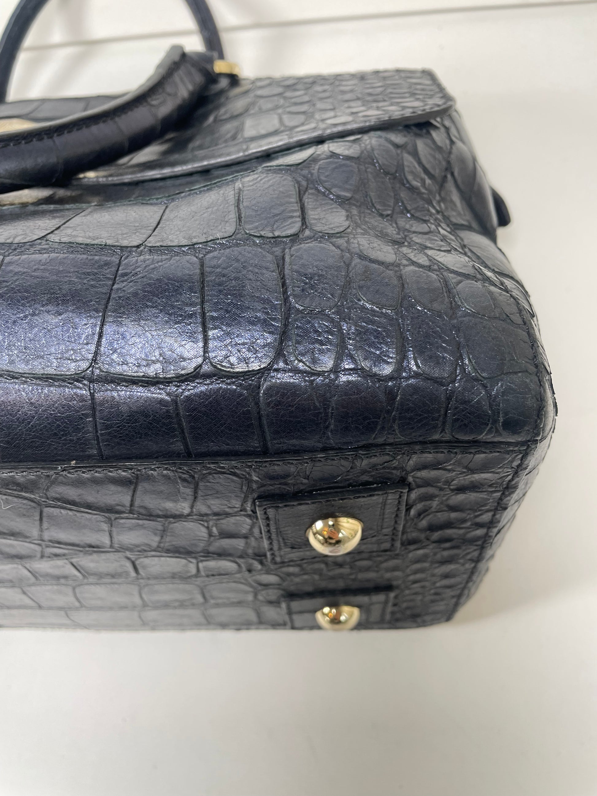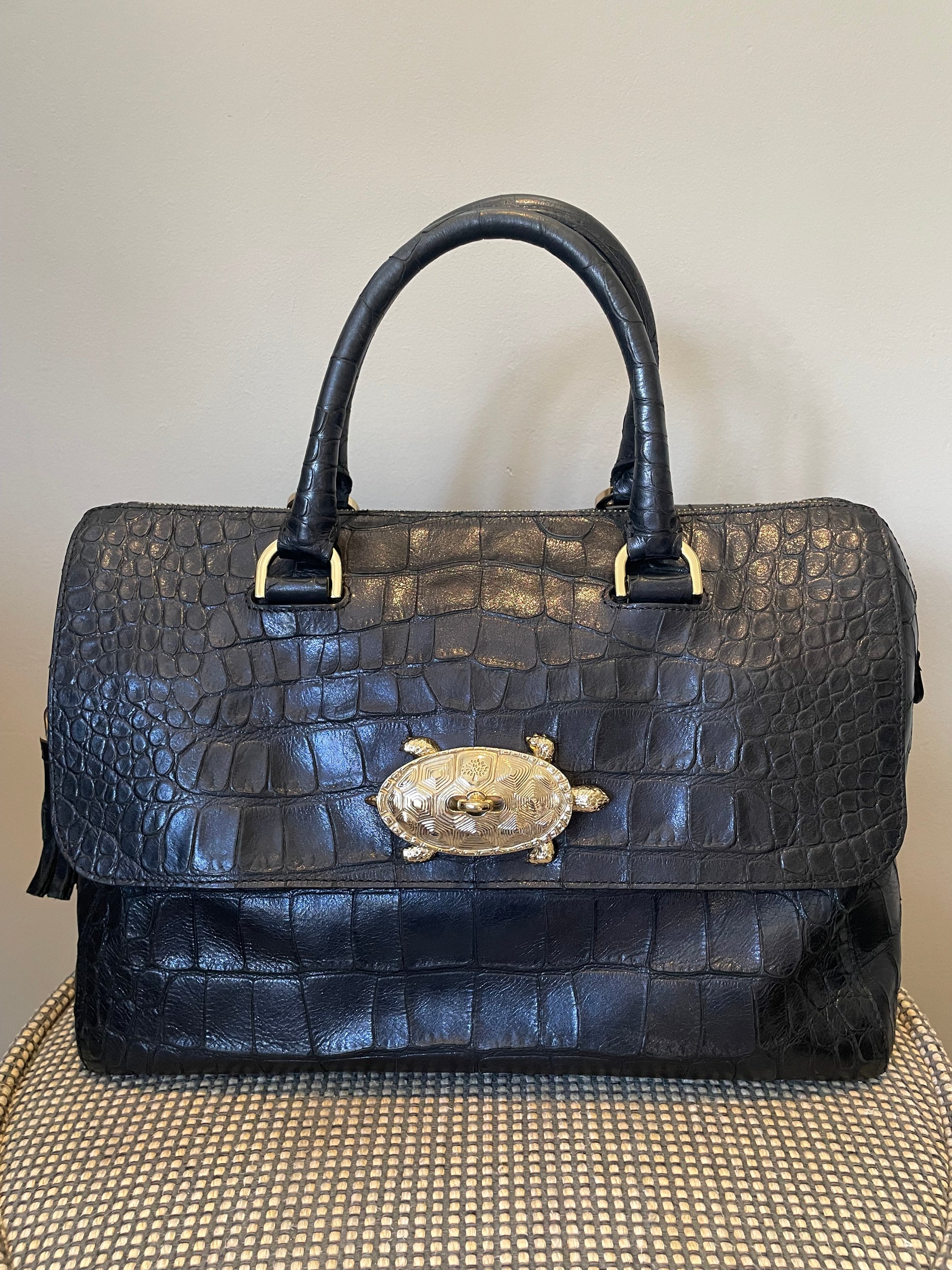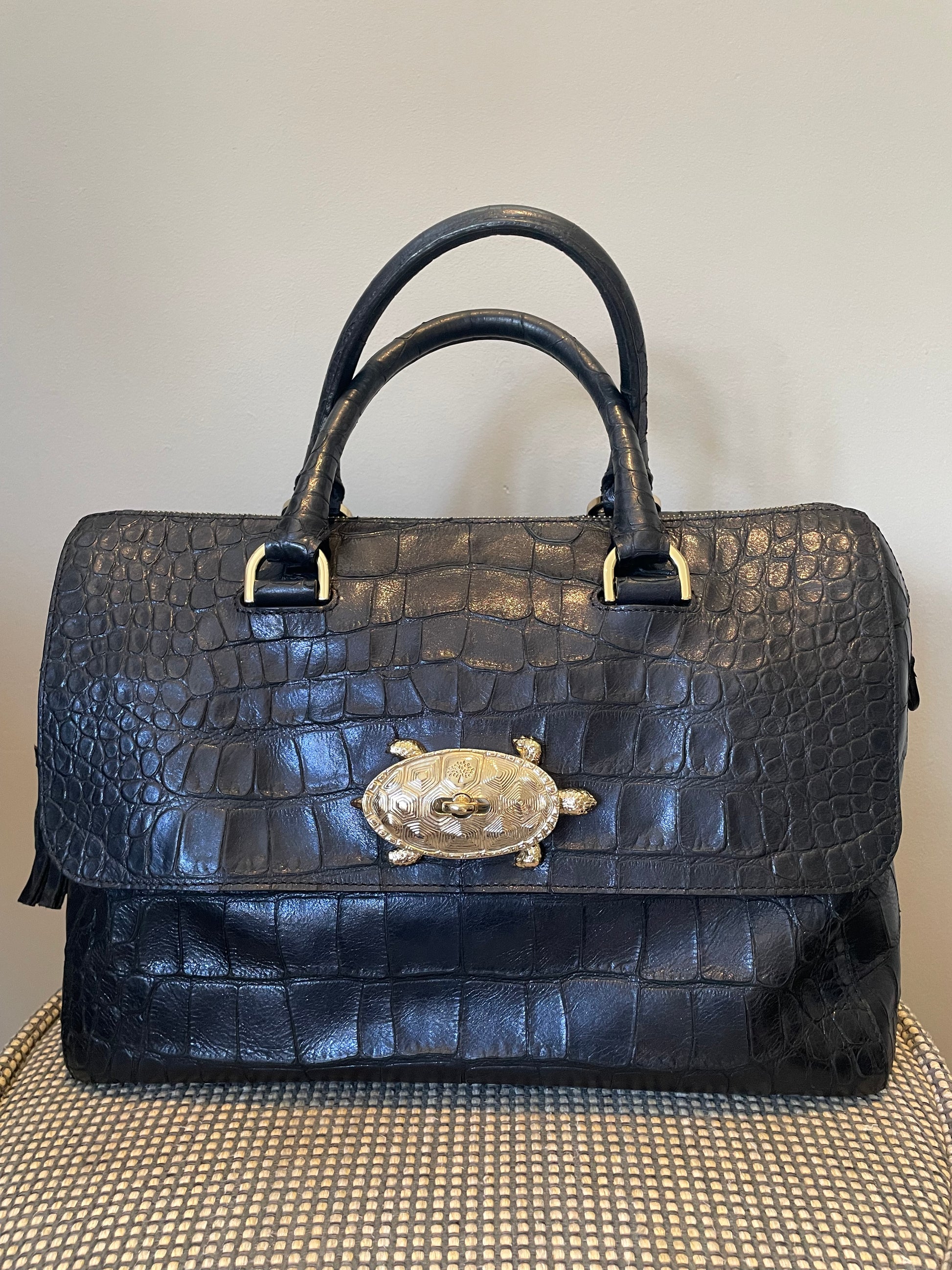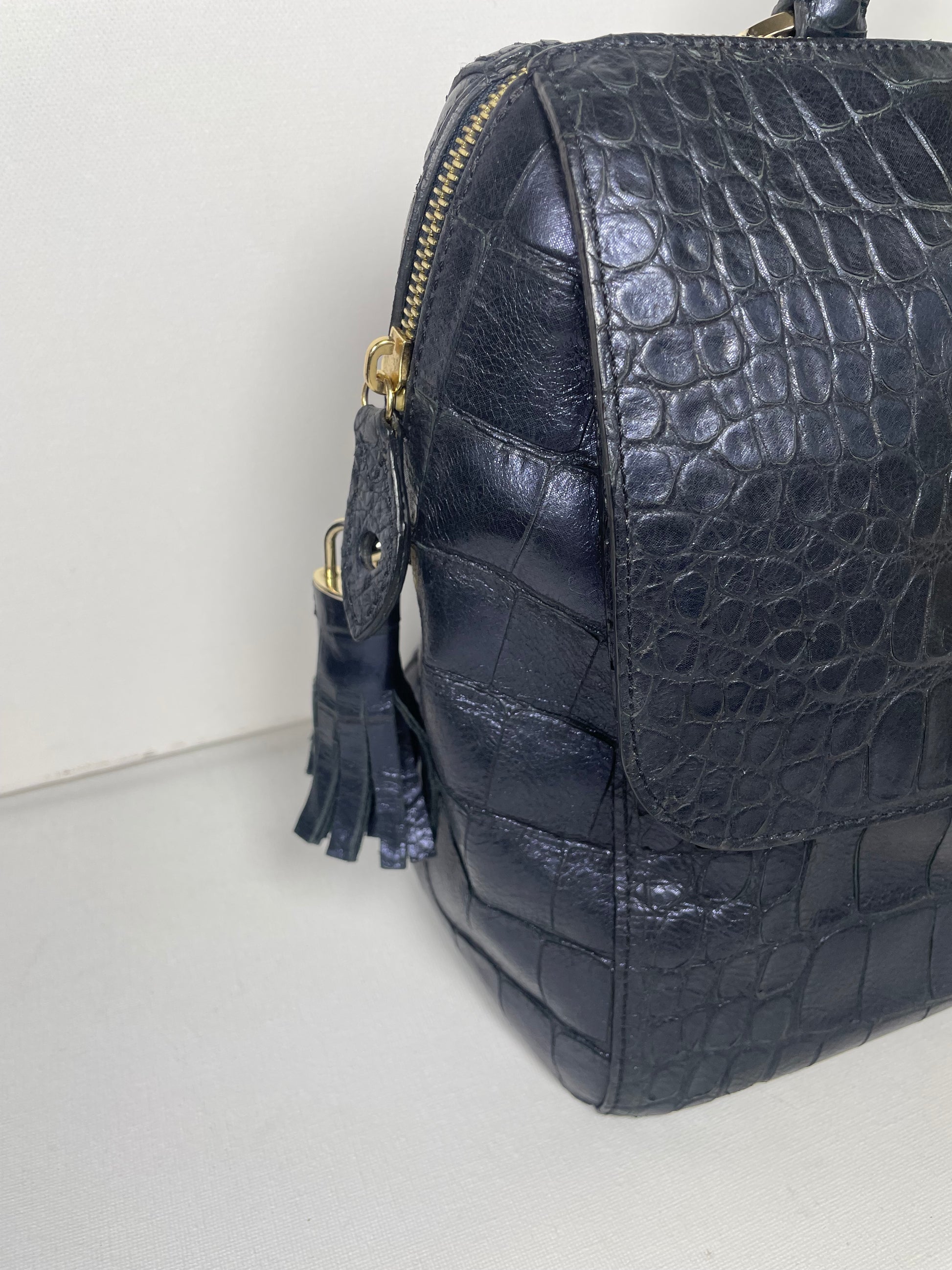 The Mulberry Del Rey bag is a classic, simple and elegant bag . This Boston Bag is in a moc croc embossed Ink Blue Sparkle Calfskin with a Shiny Gold Tone Turtle Plaque Lock and Feature Tassle. This head turning top handle Boston was produced in limited numbers and has become a highly sought after piece. This bag has a zip top closure, a handy front pocket and two top handles. Inside is lined in black coloured Mulberry fabric with a zip close pocket and open slip pocket.