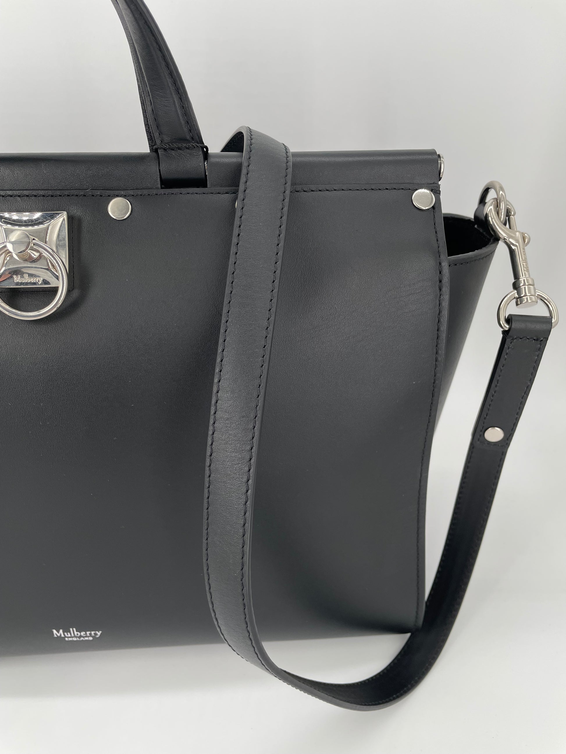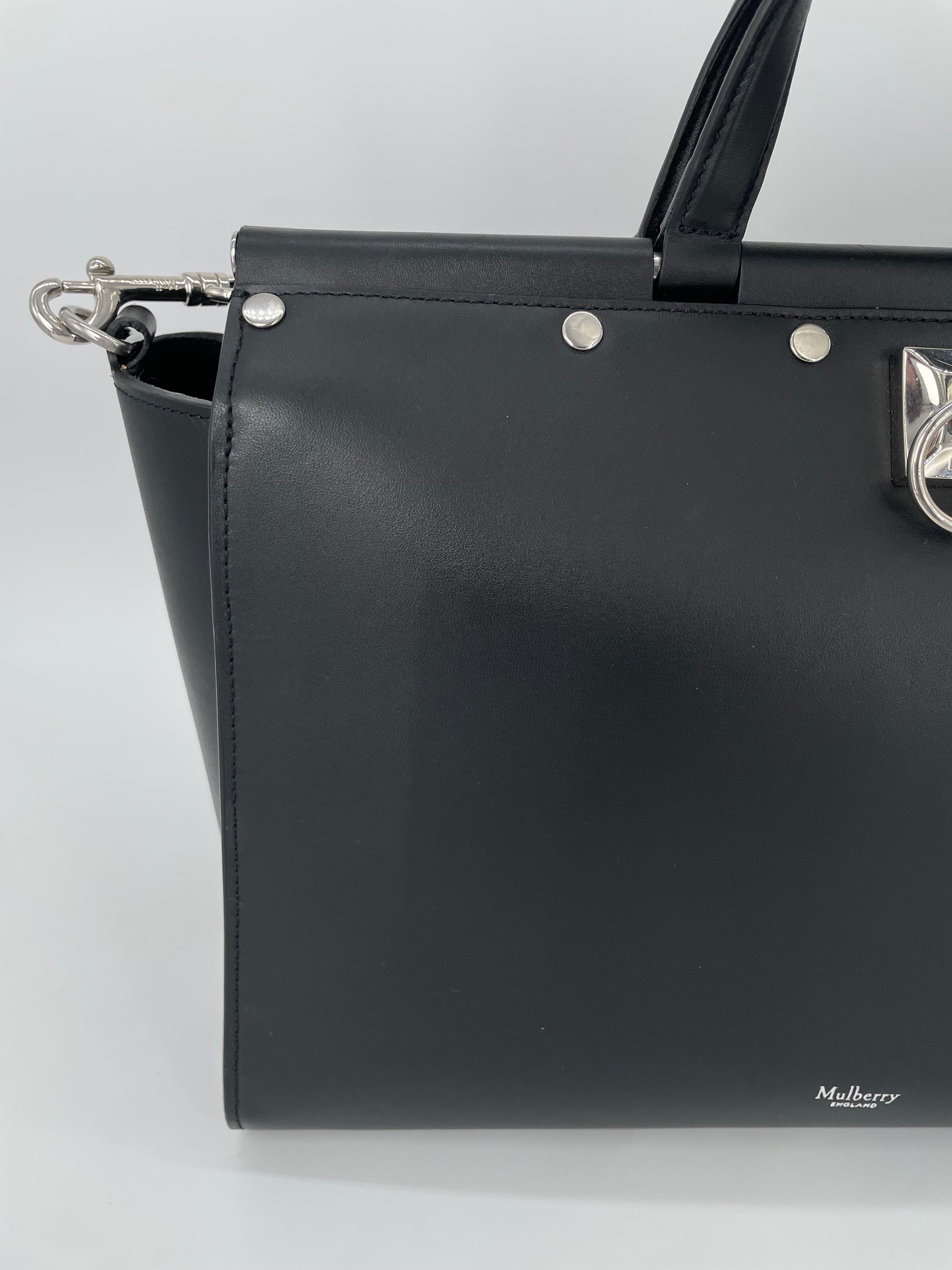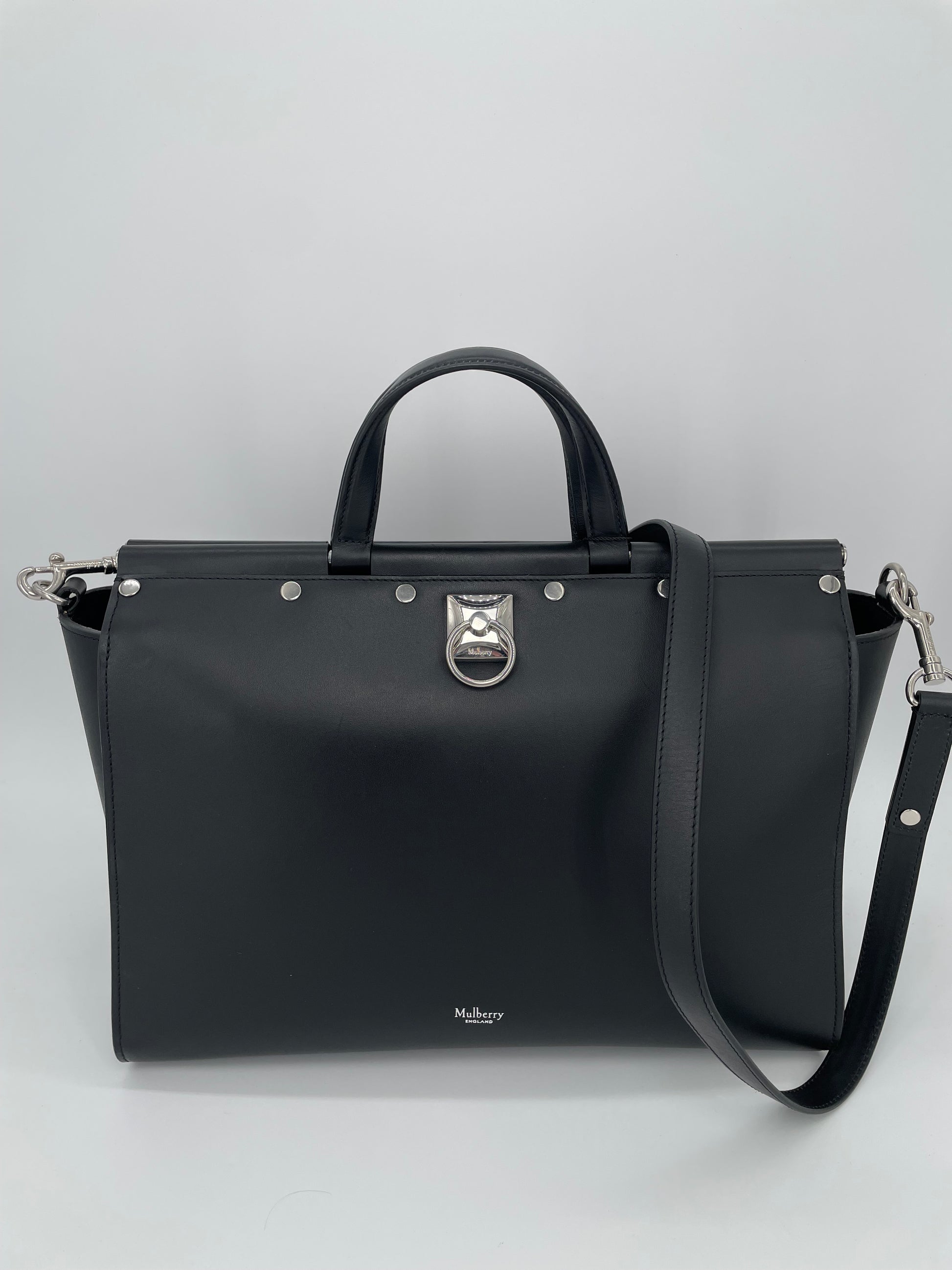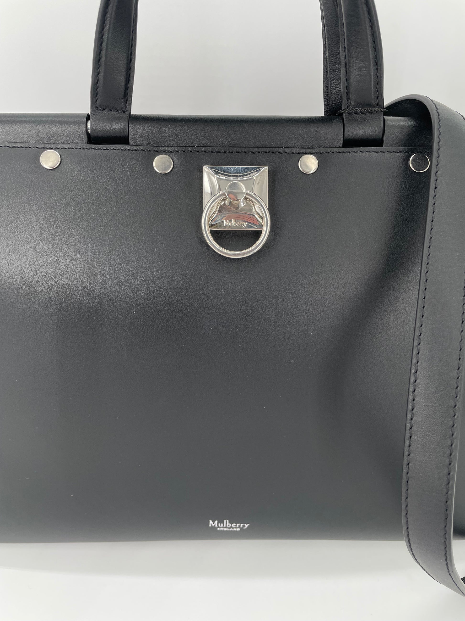 This is an absolutely beautiful Medium Mulberry Iris Top Handle Flat Stud Bag in sleek black leather. This is a sophisticated and structured bag perfect for anytime. The structured day with the contrasting silvertone hardware for day-to-day activities. The eyelet stud detailing and metal rod top pull opening means it’s a striking and elegant bag. The large interior unlined suede compartment and open slip pocket means it’s an easy bag to use.