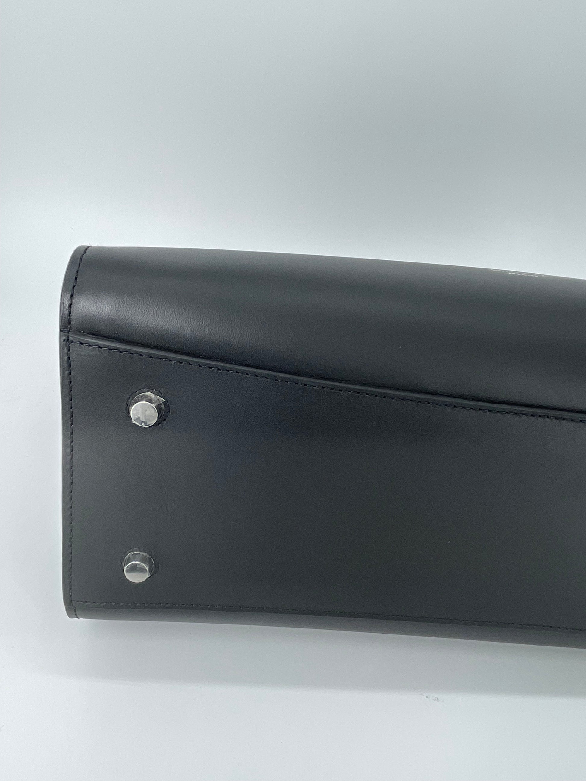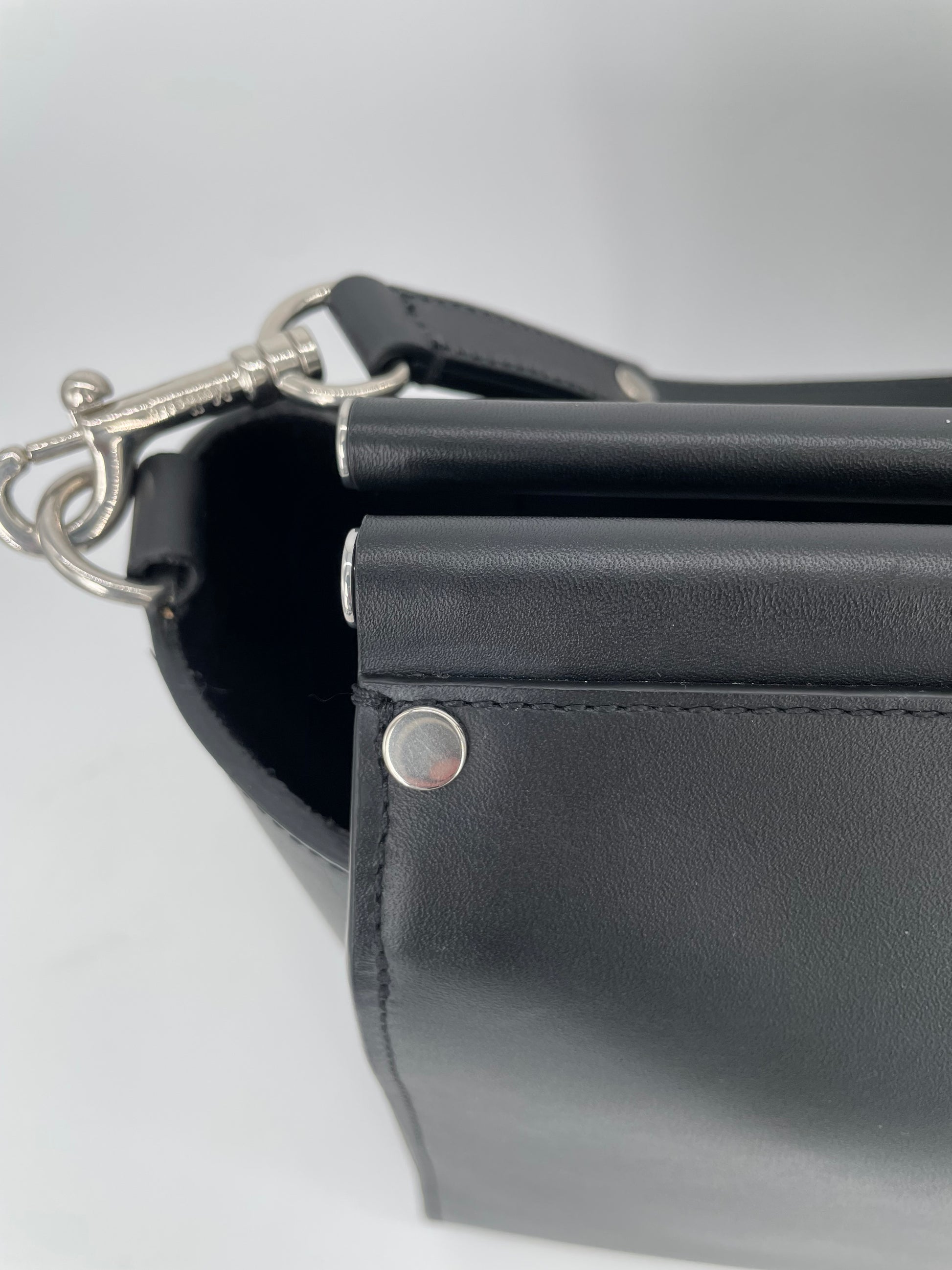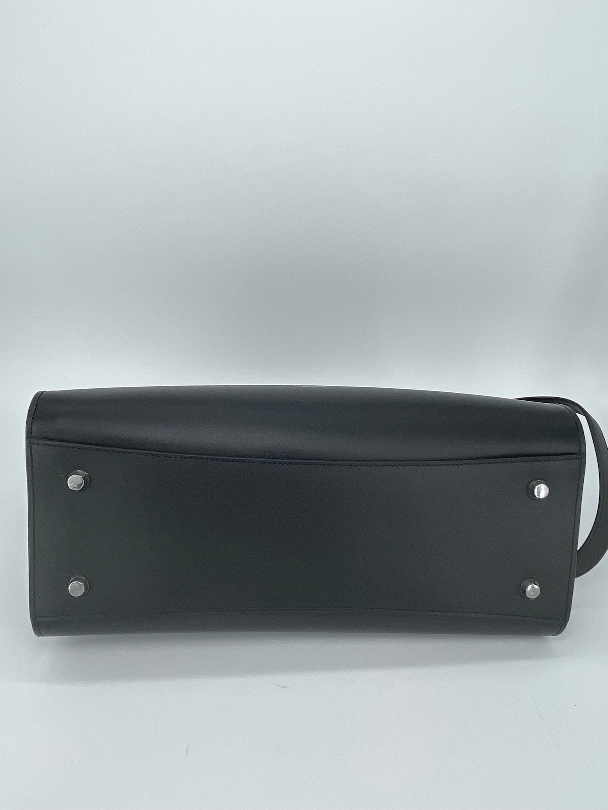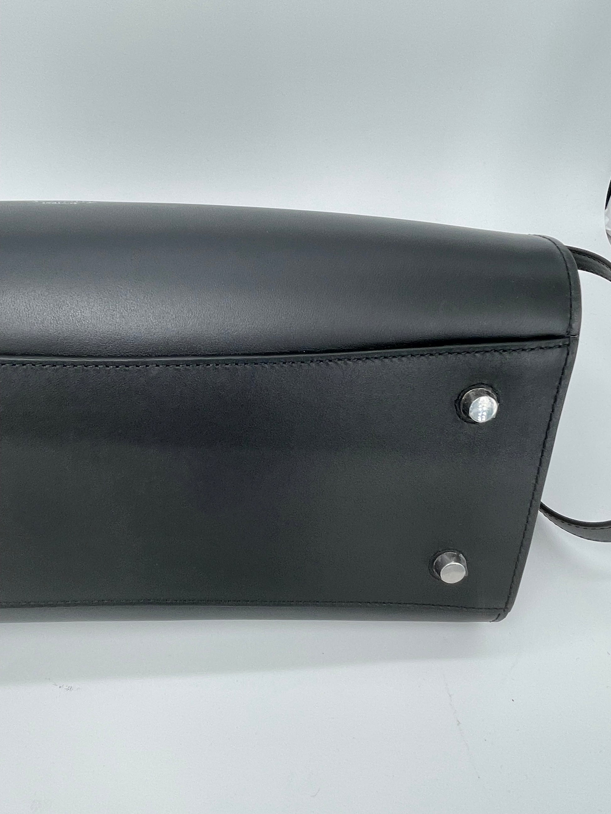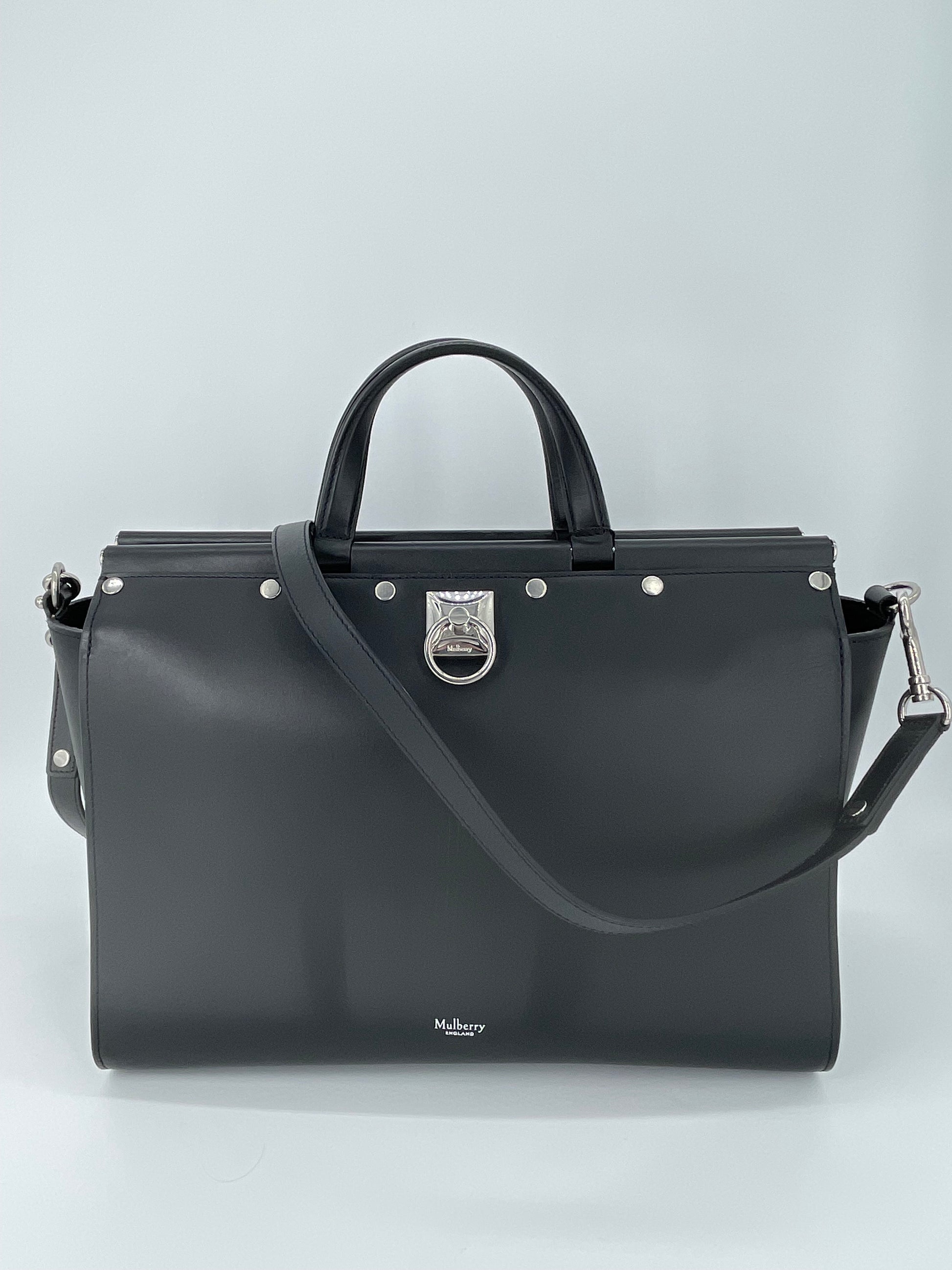 This is an absolutely beautiful Medium Mulberry Iris Top Handle Flat Stud Bag in sleek black leather. This is a sophisticated and structured bag perfect for anytime. The structured day with the contrasting silvertone hardware for day-to-day activities. The eyelet stud detailing and metal rod top pull opening means it’s a striking and elegant bag. The large interior unlined suede compartment and open slip pocket means it’s an easy bag to use.
