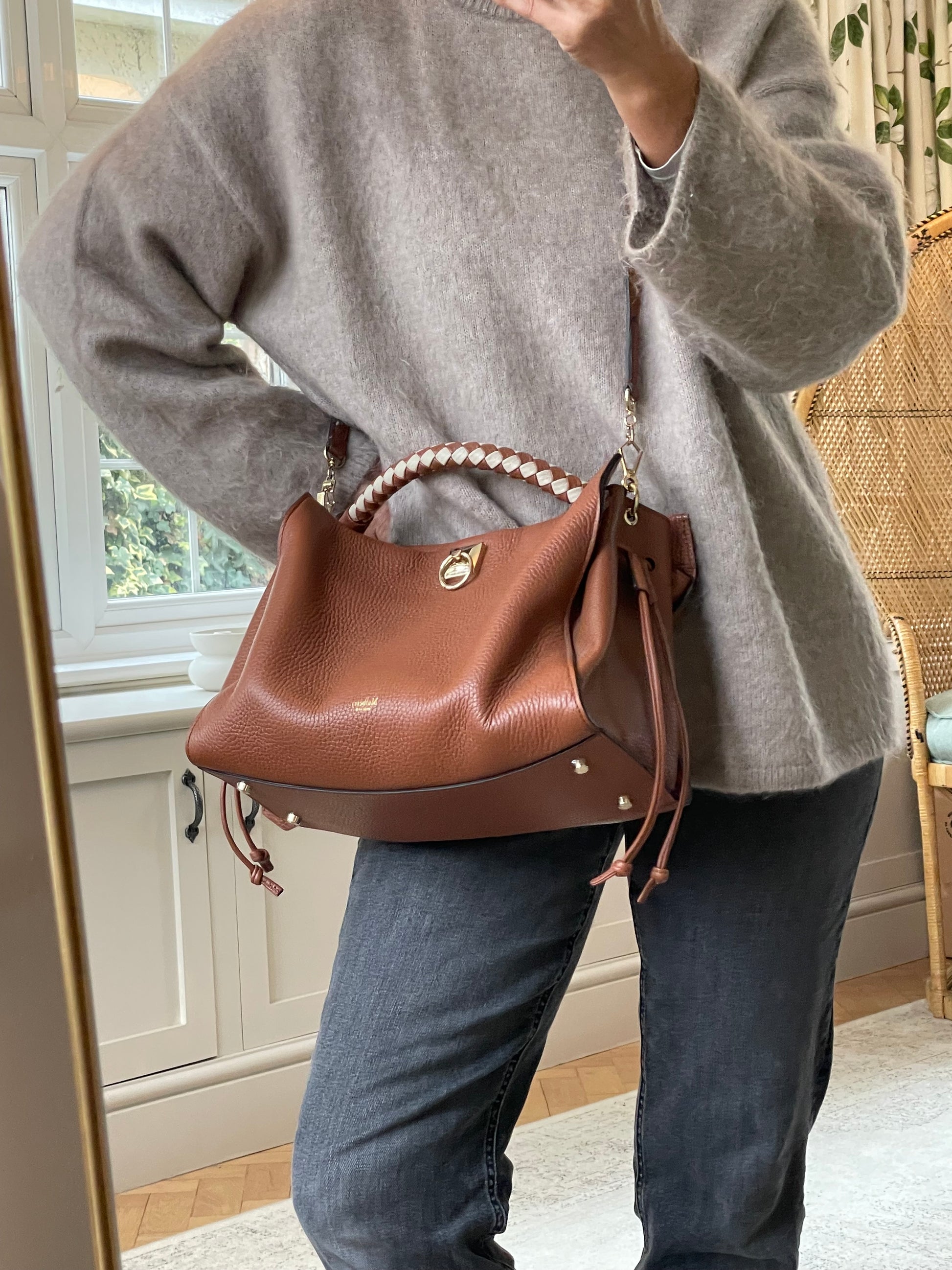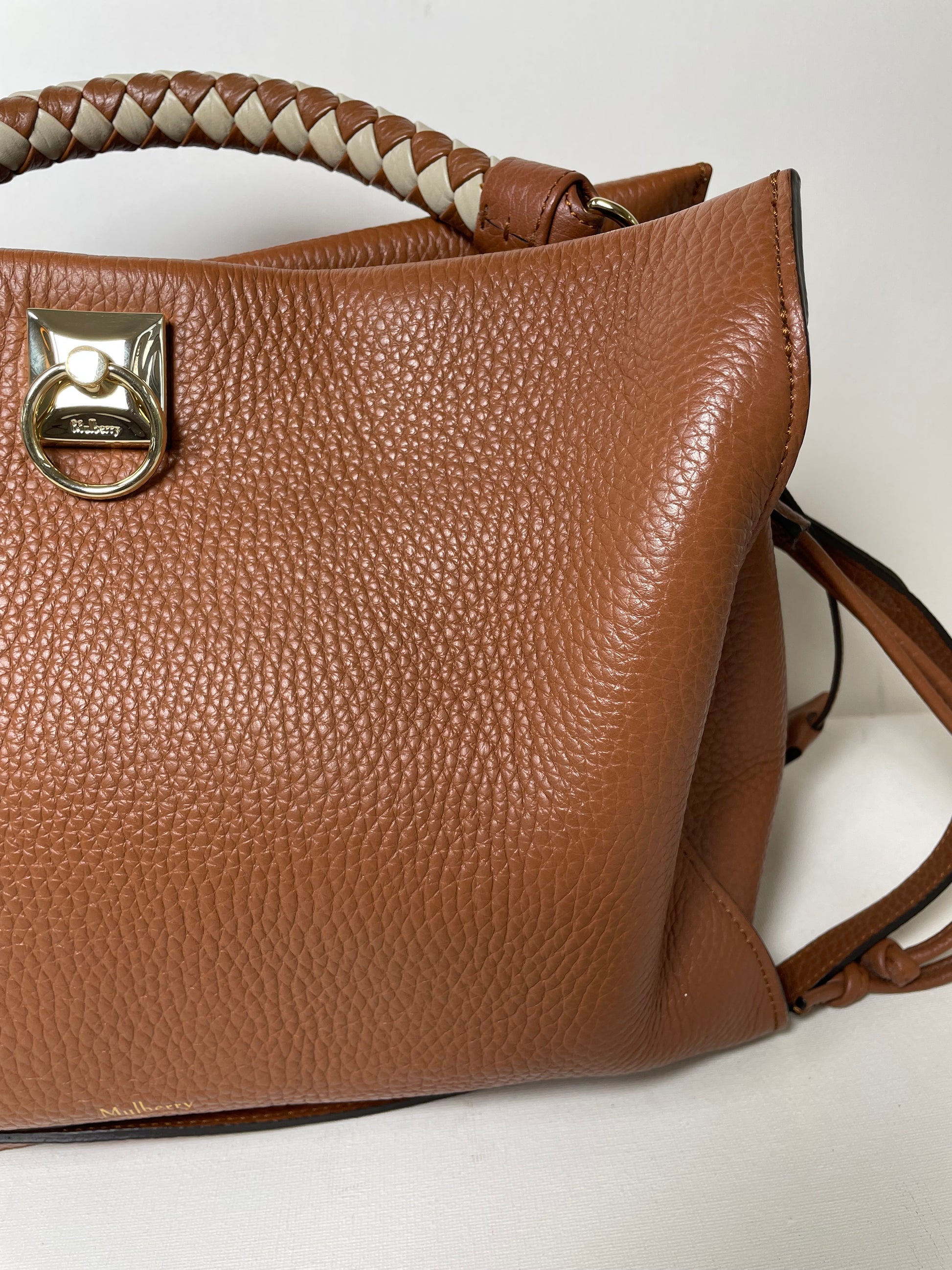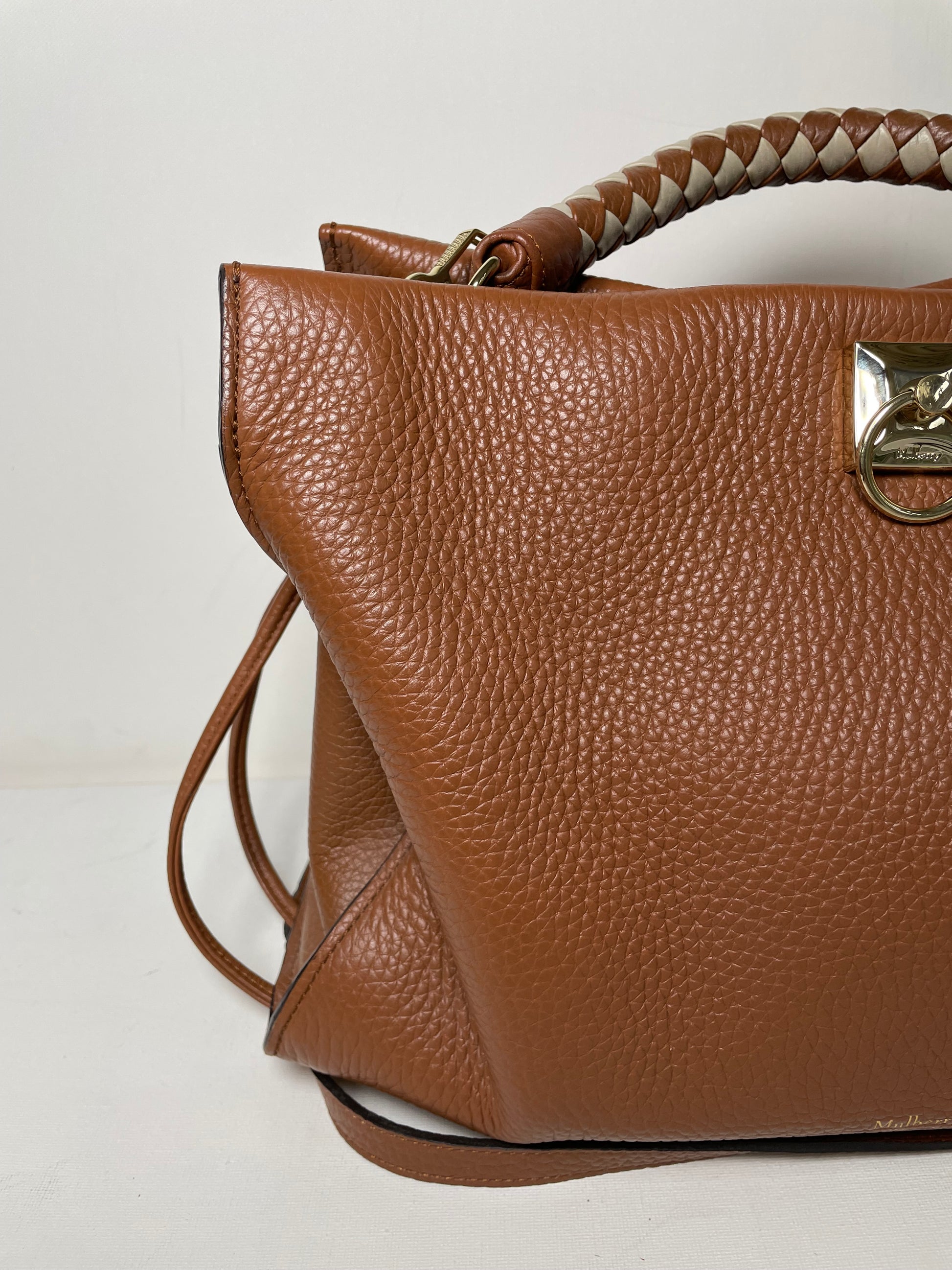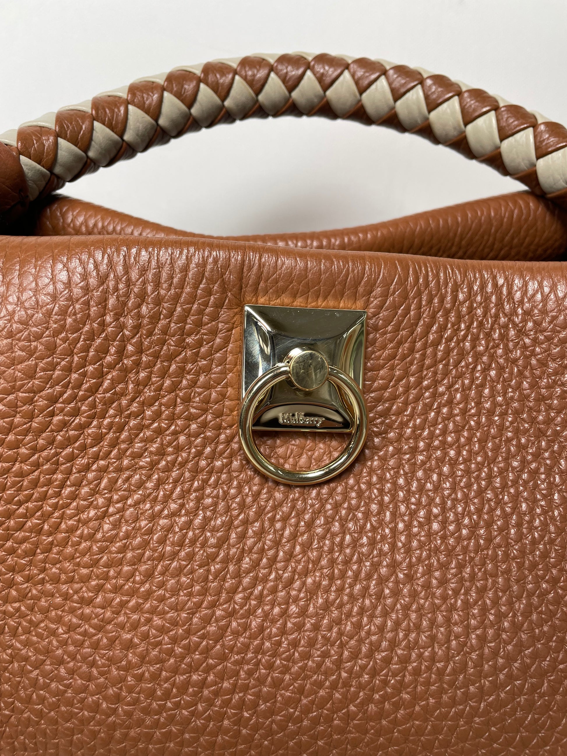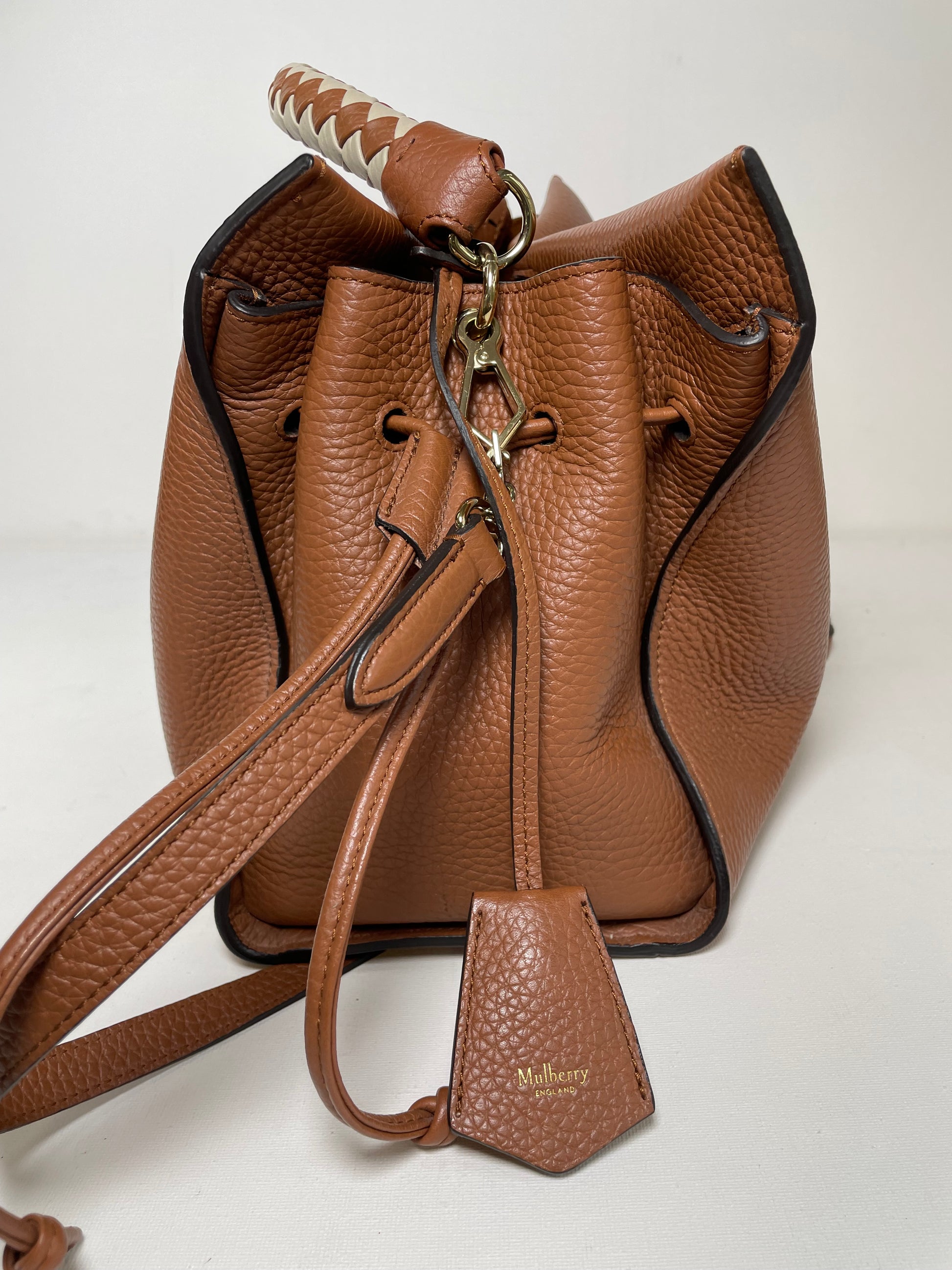 This is a beautiful Large Mulberry Iris bag in grainy tan leather(the colour is oak) This bag has a soft, relaxed look with a braided top handle in brown and cream leather (which can be removed) A long, adjustable shoulder strap means it can be worn on the shoulder or as a crossbody for ease. The drawstring side closure creates a lovely profile and the magnetic closing stud secures the bag. Inside is lined in suede. There is 1 zipped pocket and 1 open slip pocket and a decorative key cloche.