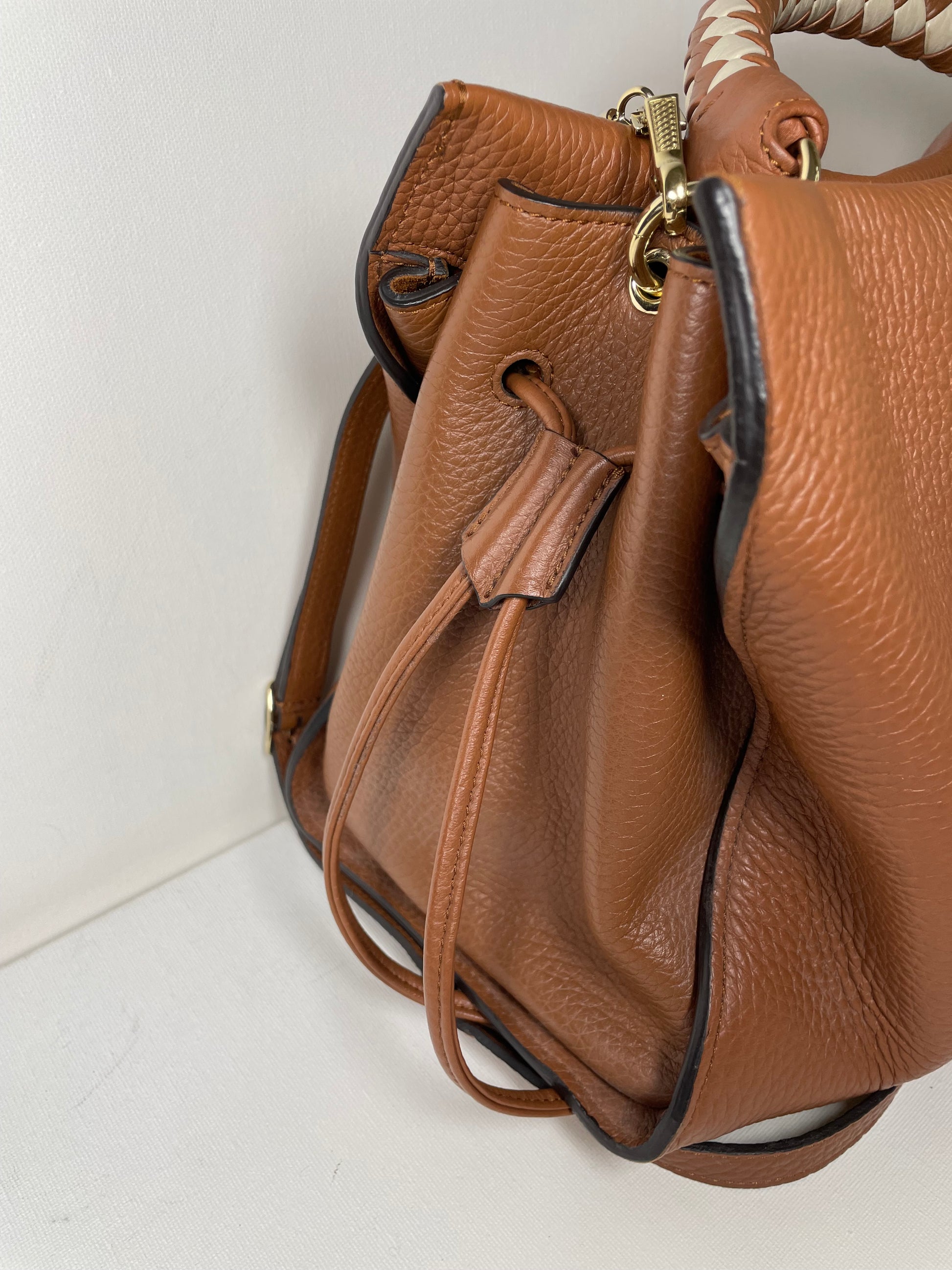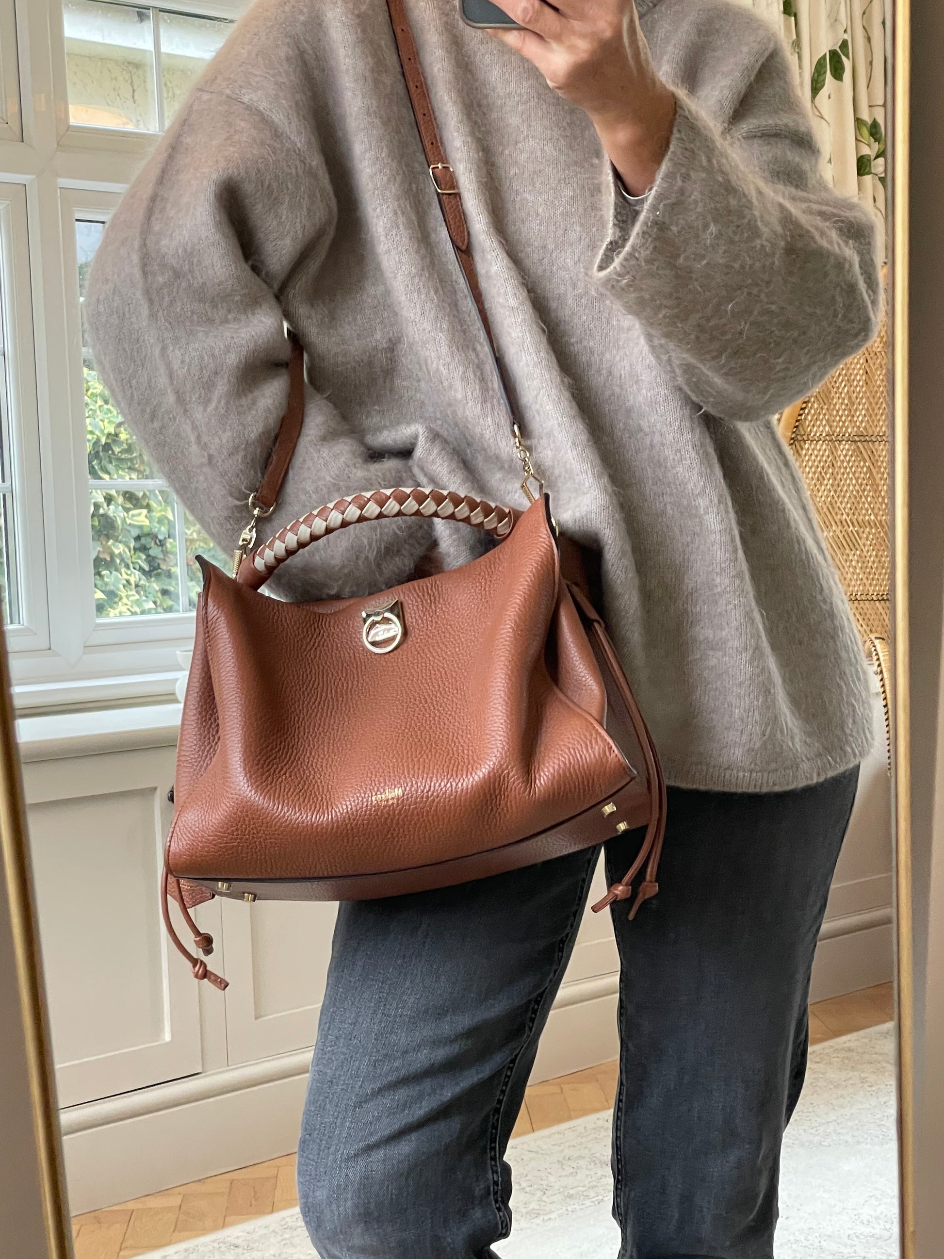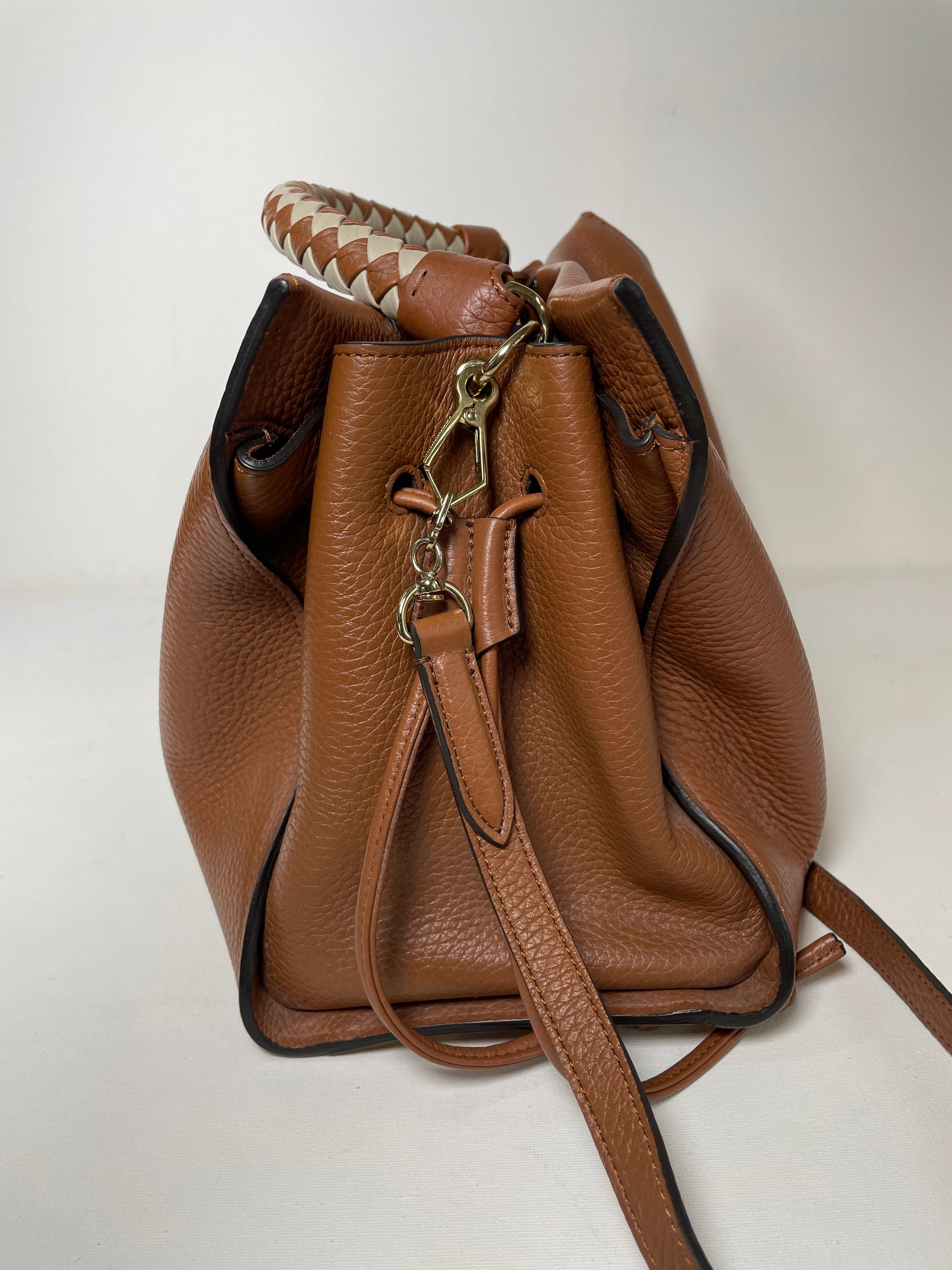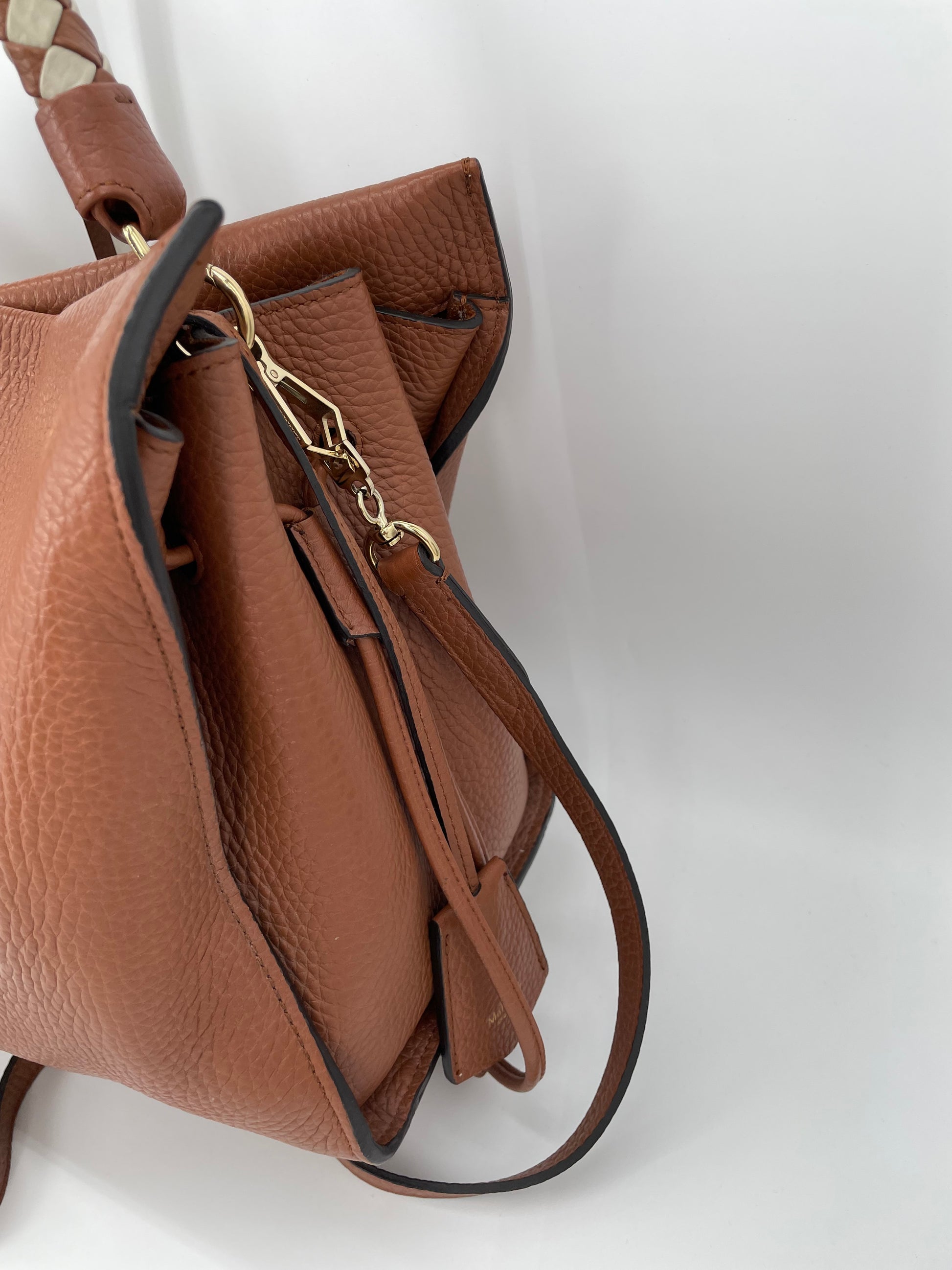 This is a beautiful Large Mulberry Iris bag in grainy tan leather(the colour is oak) This bag has a soft, relaxed look with a braided top handle in brown and cream leather (which can be removed) A long, adjustable shoulder strap means it can be worn on the shoulder or as a crossbody for ease. The drawstring side closure creates a lovely profile and the magnetic closing stud secures the bag. Inside is lined in suede. There is 1 zipped pocket and 1 open slip pocket and a decorative key cloche.