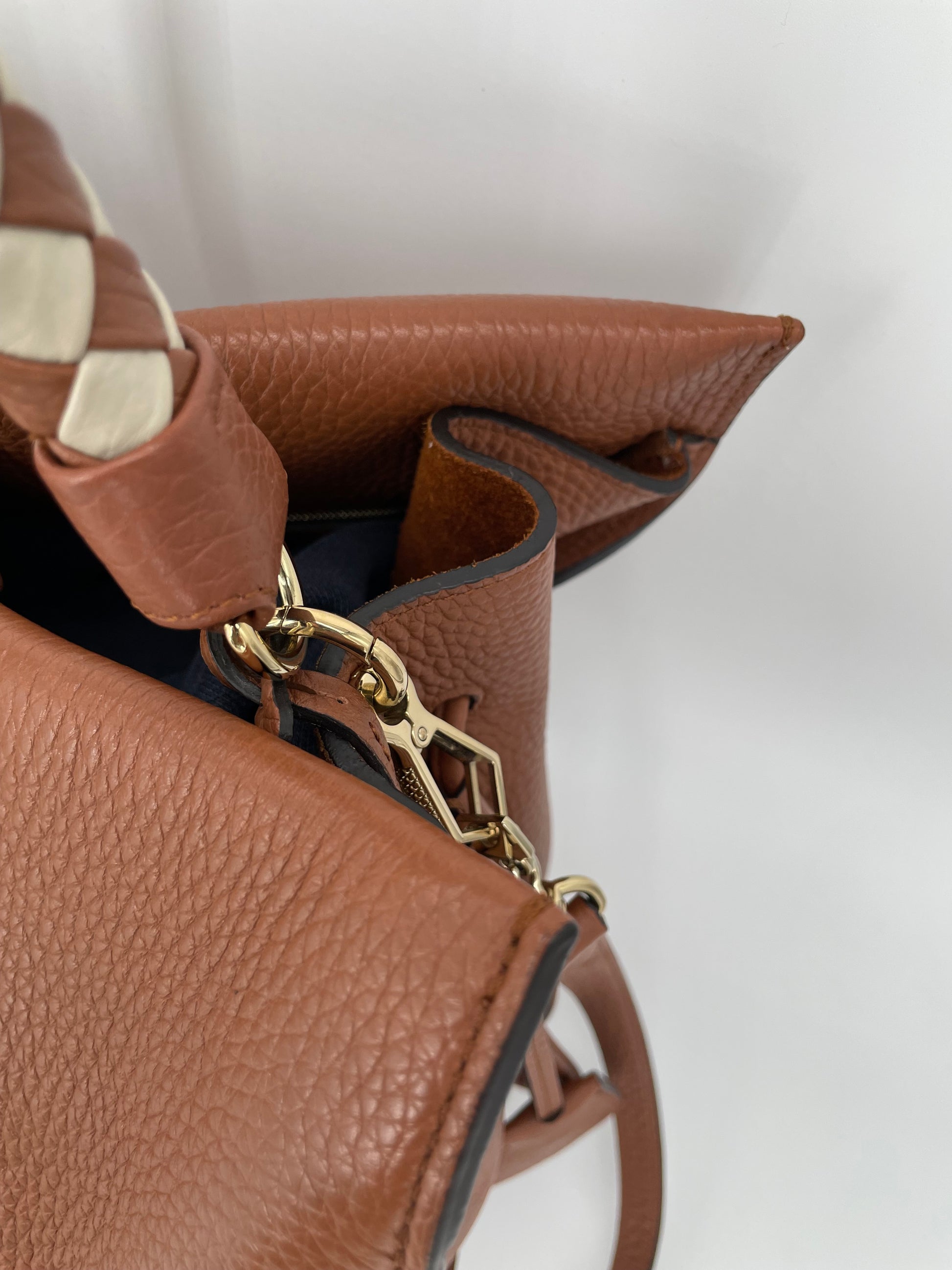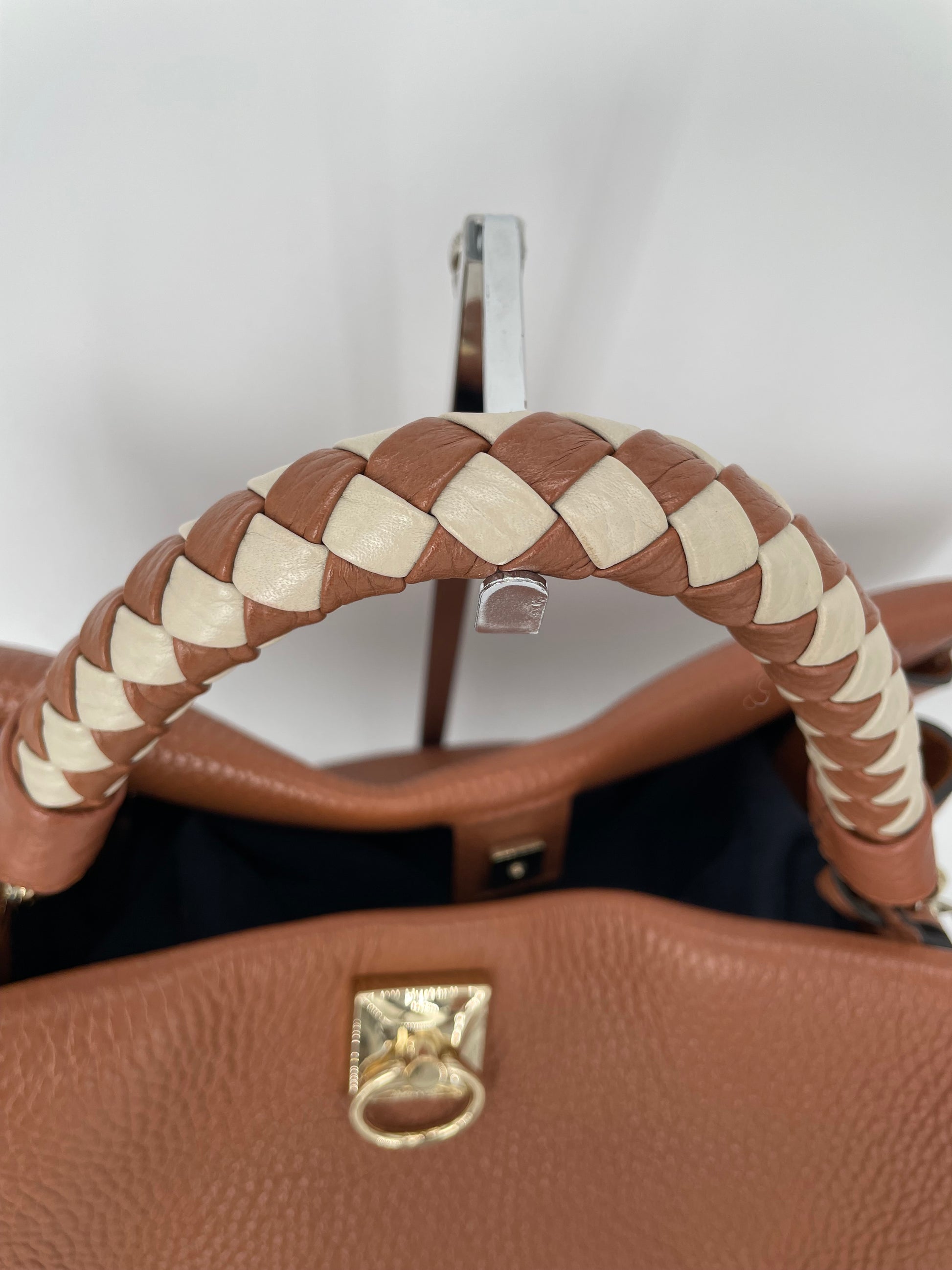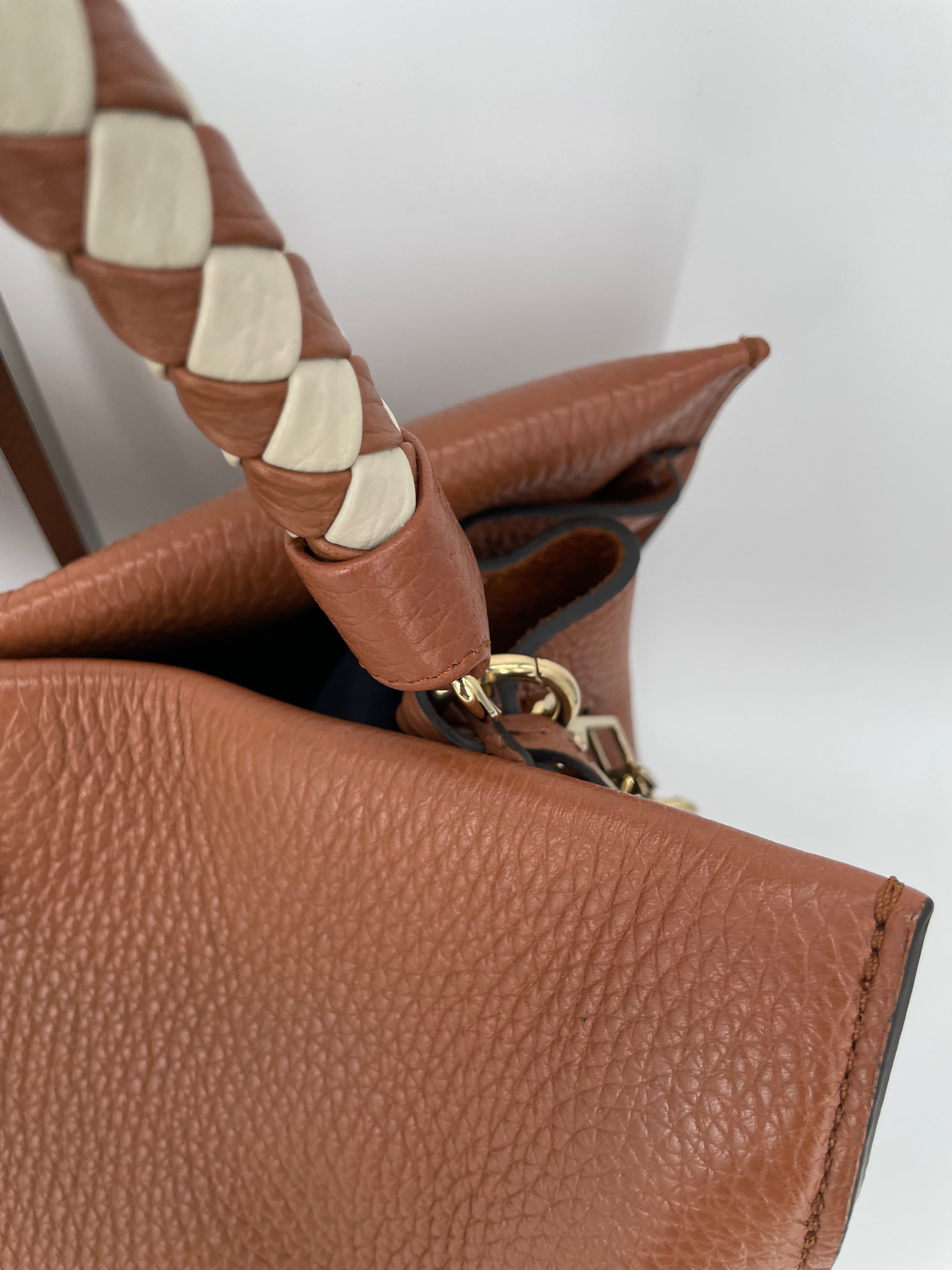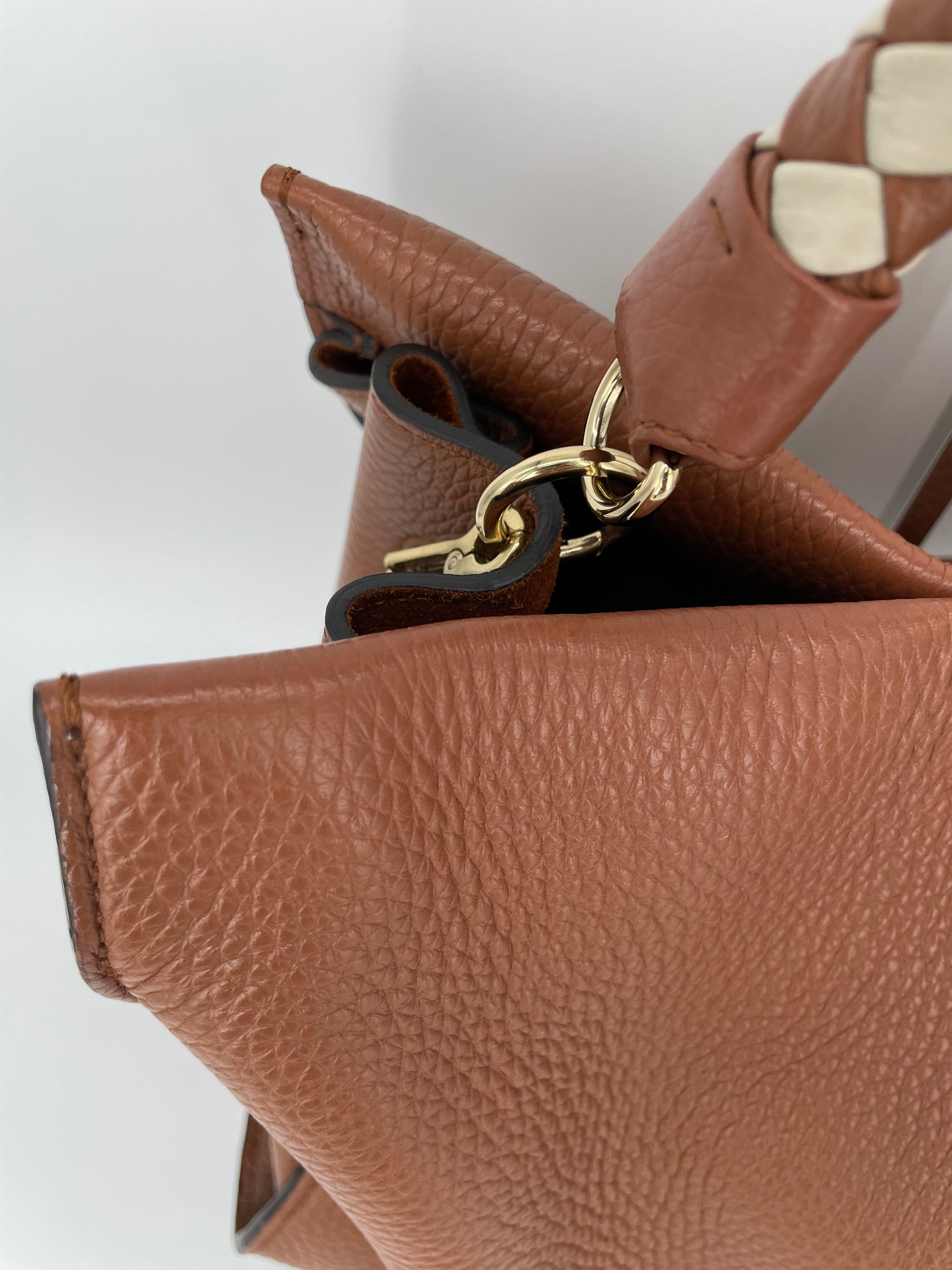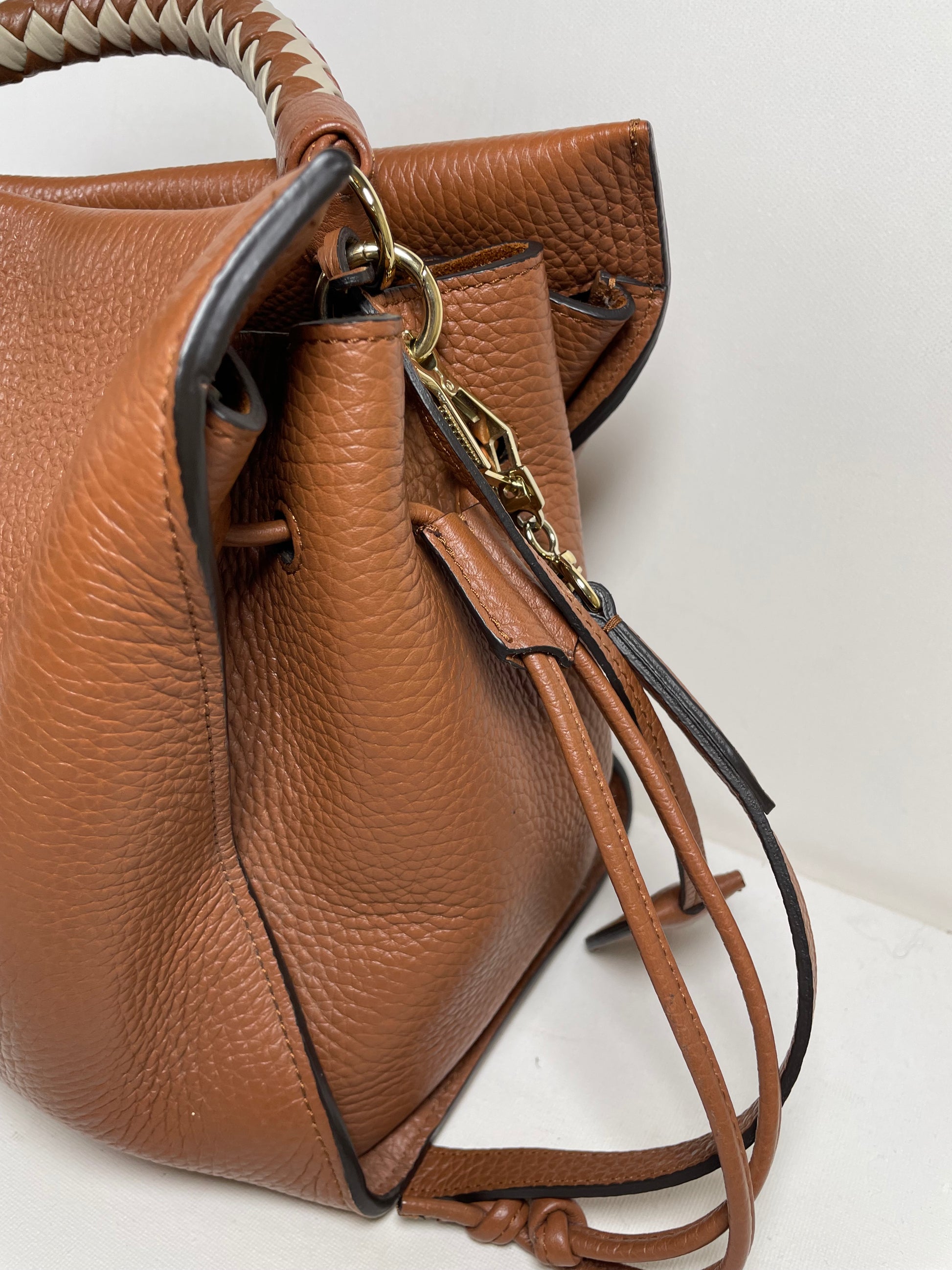 This is a beautiful Large Mulberry Iris bag in grainy tan leather(the colour is oak) This bag has a soft, relaxed look with a braided top handle in brown and cream leather (which can be removed) A long, adjustable shoulder strap means it can be worn on the shoulder or as a crossbody for ease. The drawstring side closure creates a lovely profile and the magnetic closing stud secures the bag. Inside is lined in suede. There is 1 zipped pocket and 1 open slip pocket and a decorative key cloche.