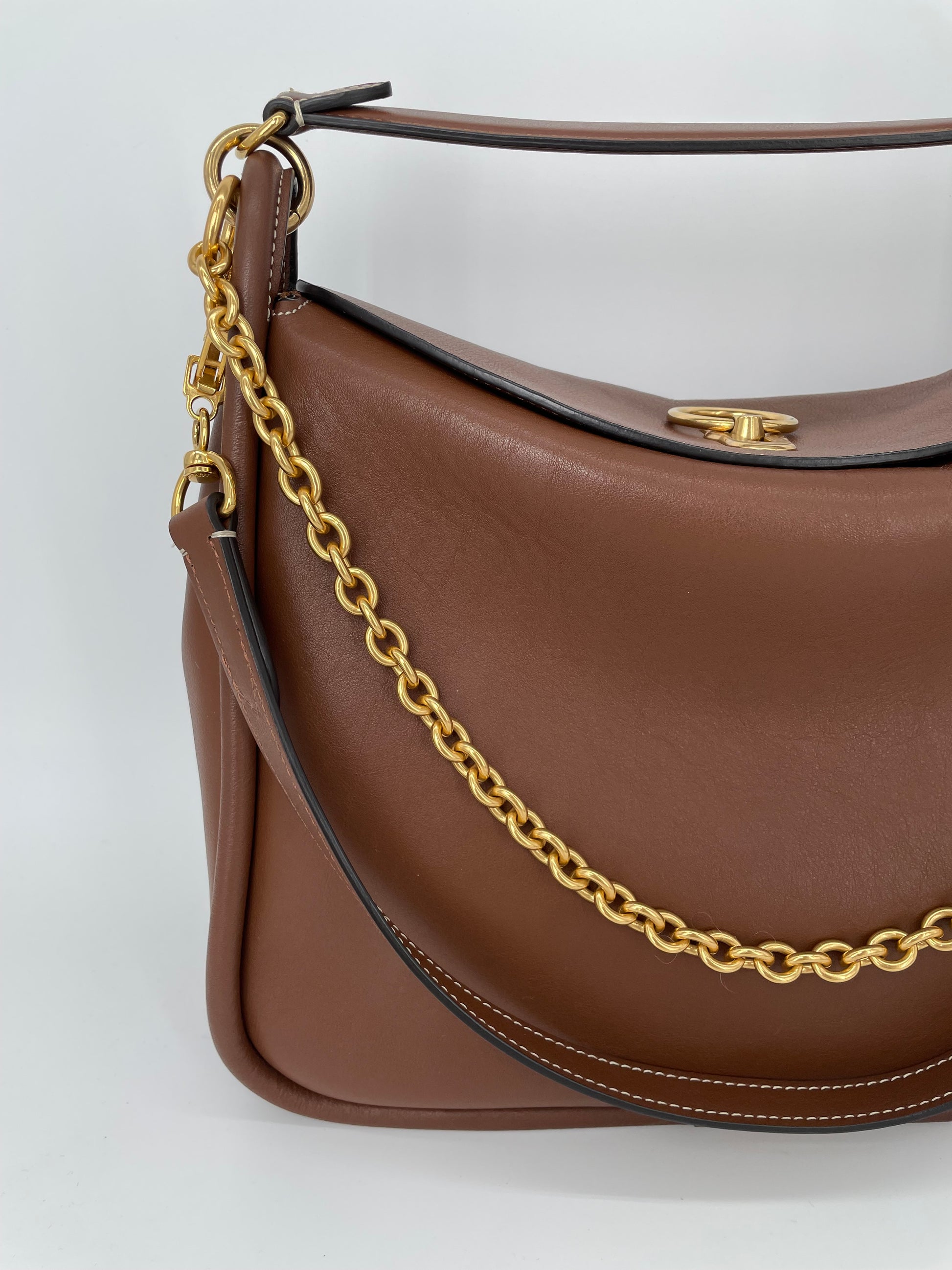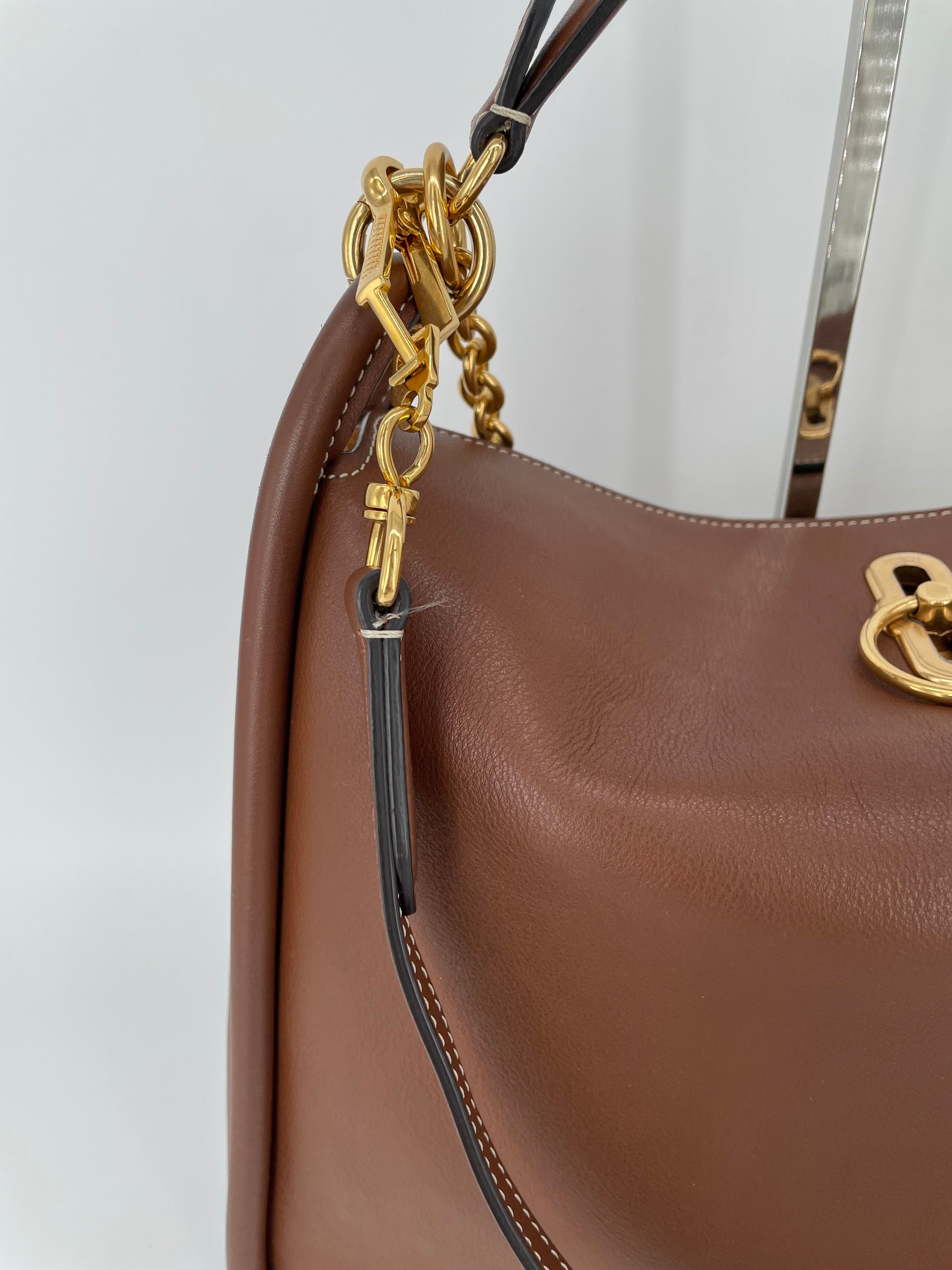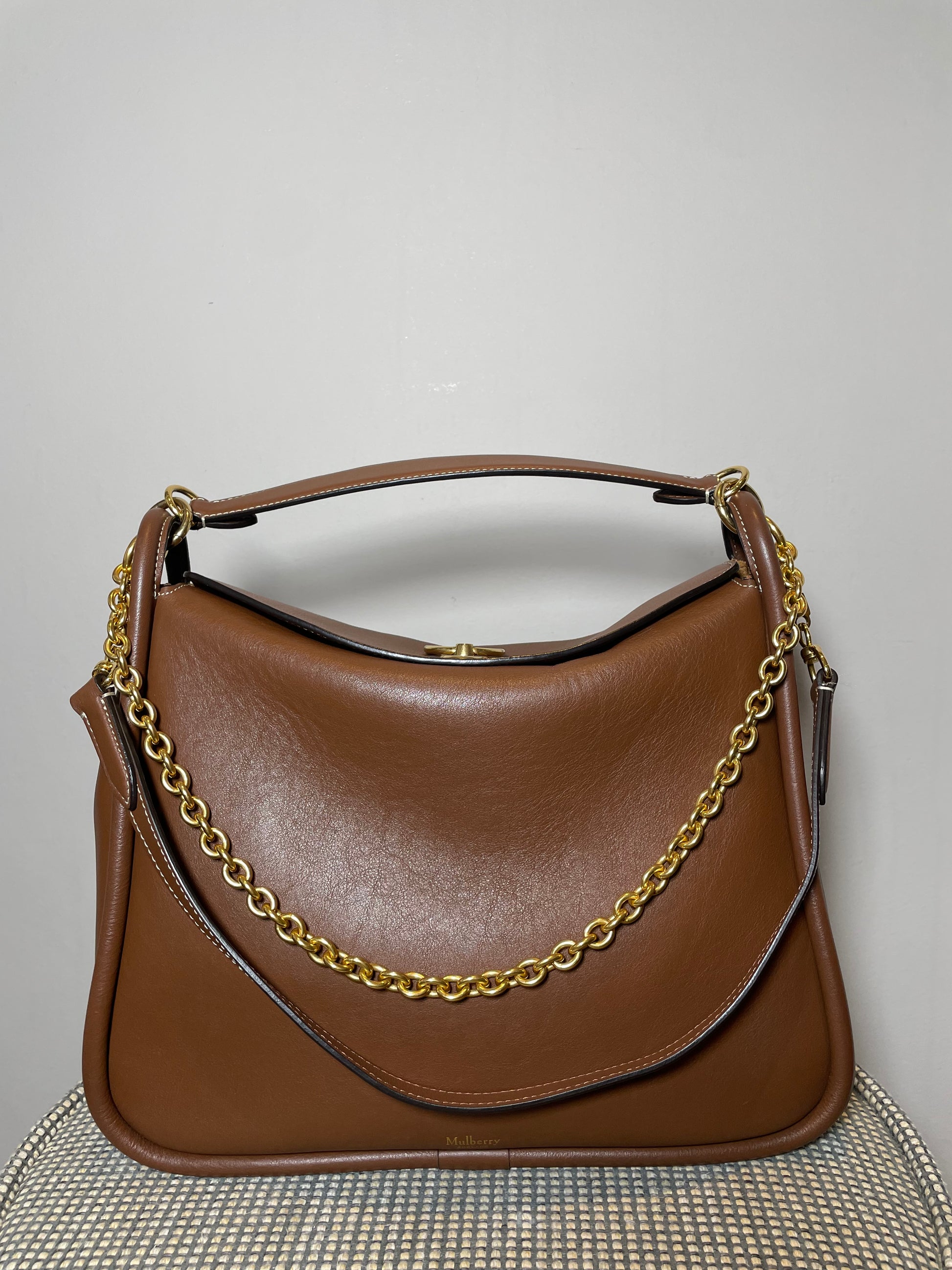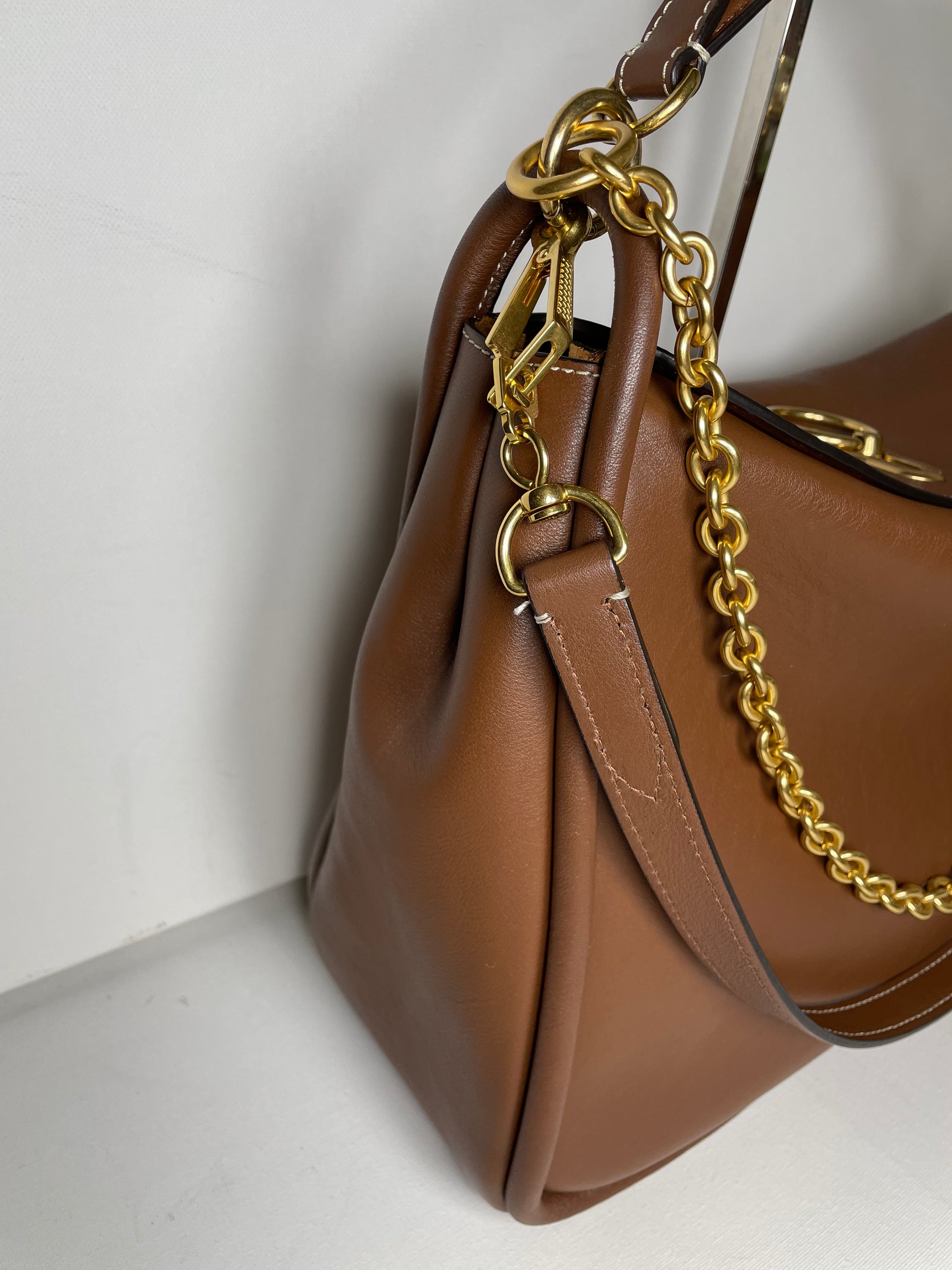 This is a beautiful and elegant Mulberry Medium Leighton in grainy tan brown leather . The bag is sleekly constructed with a modern slouchy silhouette. Lined in luxurious suede and features a classic top handle and two longer straps, one in leather and one in brass chain, and all can be removed as desired to switch between style and carry options. Finished with the signature equestrian-inspired Rider's lock.