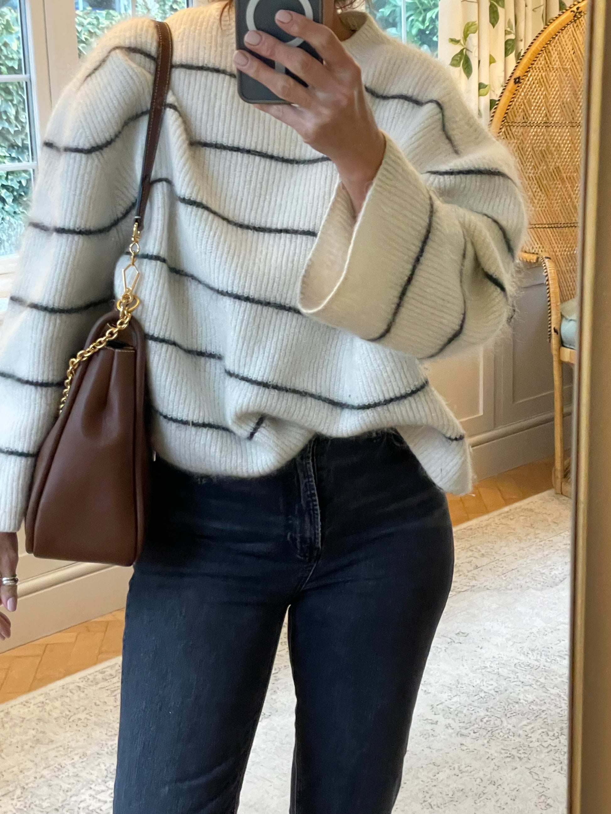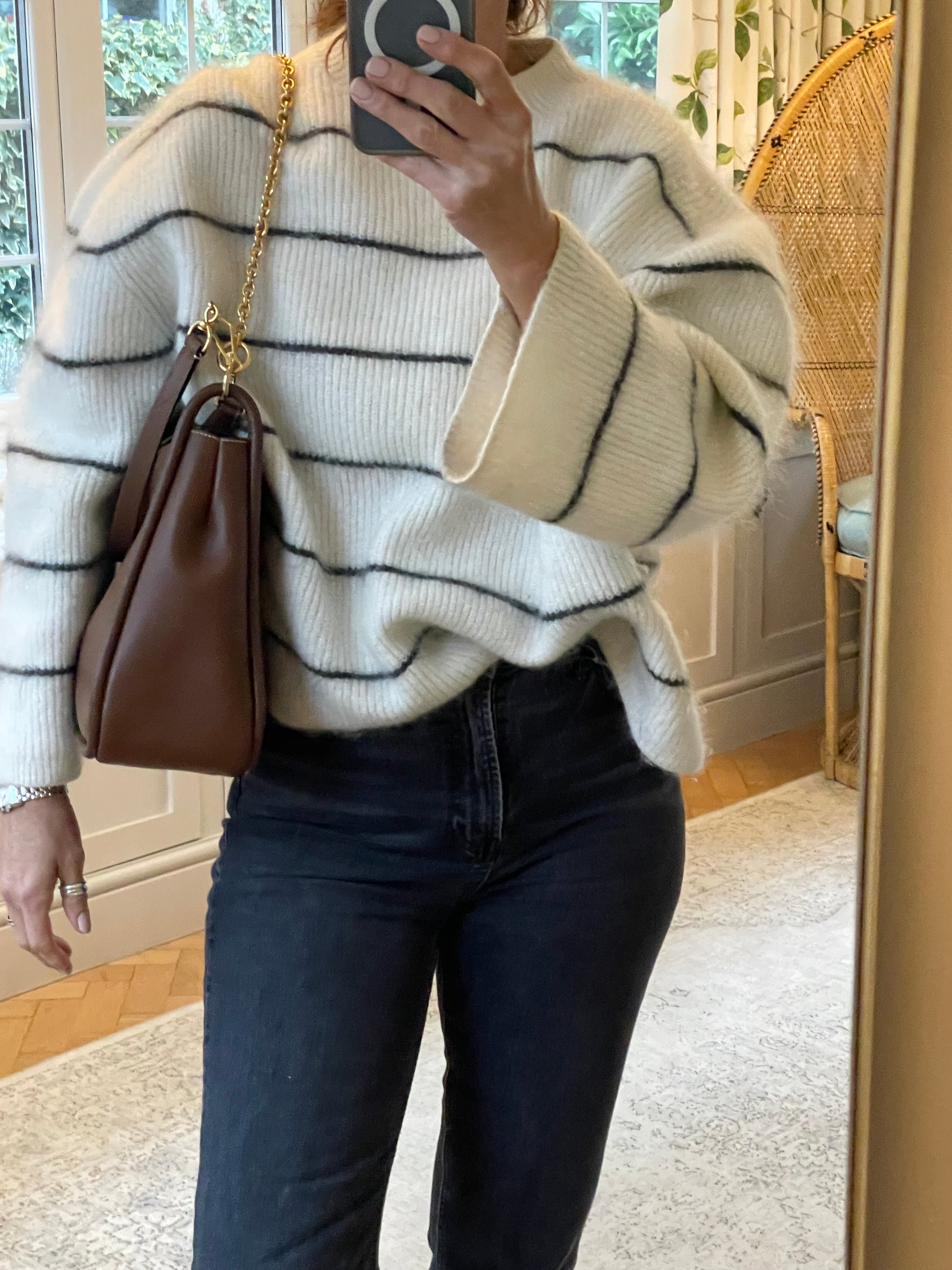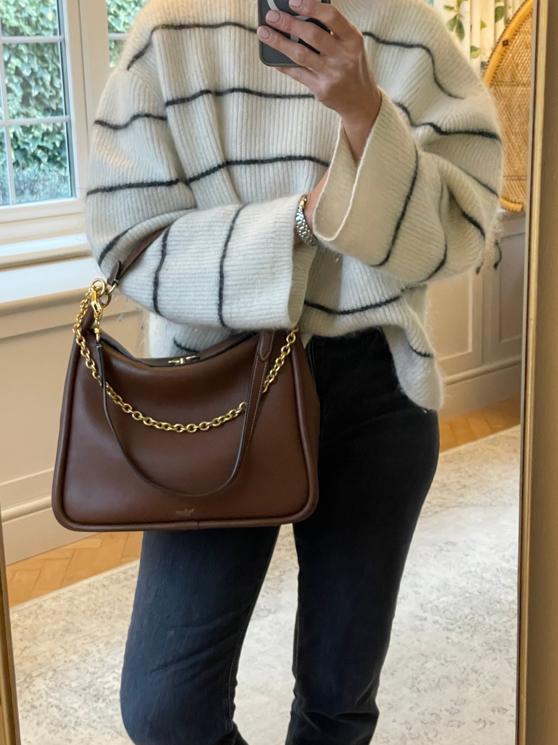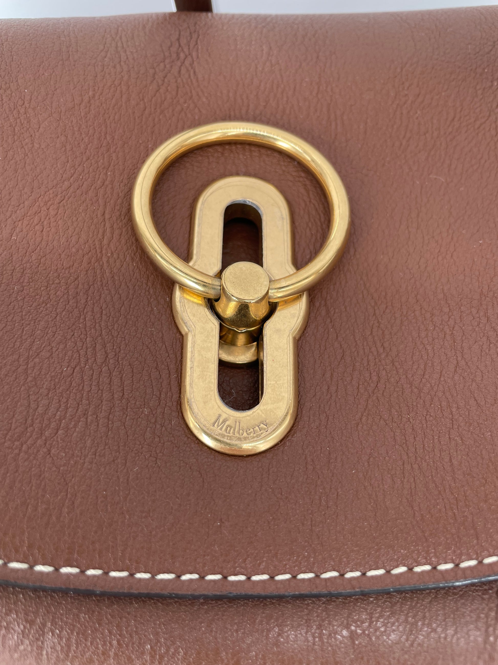 This is a beautiful and elegant Mulberry Medium Leighton in grainy tan brown leather . The bag is sleekly constructed with a modern slouchy silhouette. Lined in luxurious suede and features a classic top handle and two longer straps, one in leather and one in brass chain, and all can be removed as desired to switch between style and carry options. Finished with the signature equestrian-inspired Rider's lock.