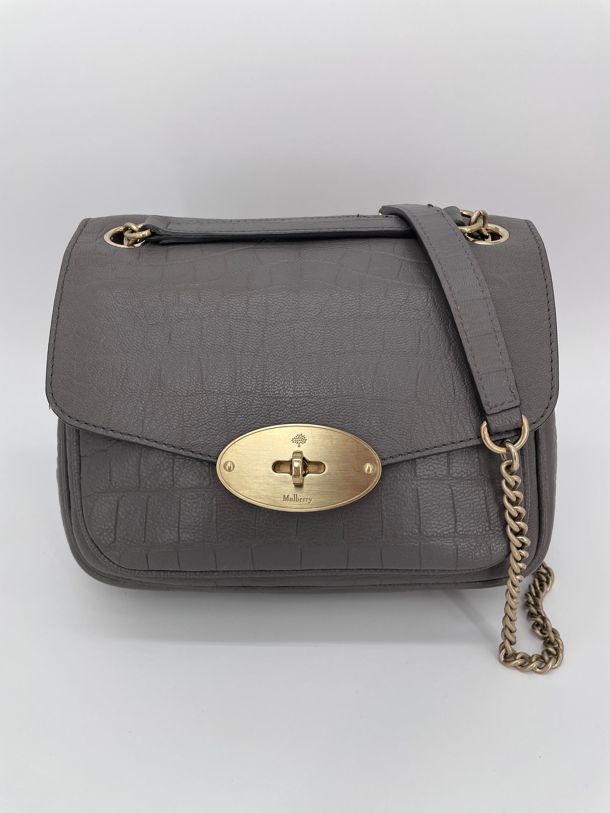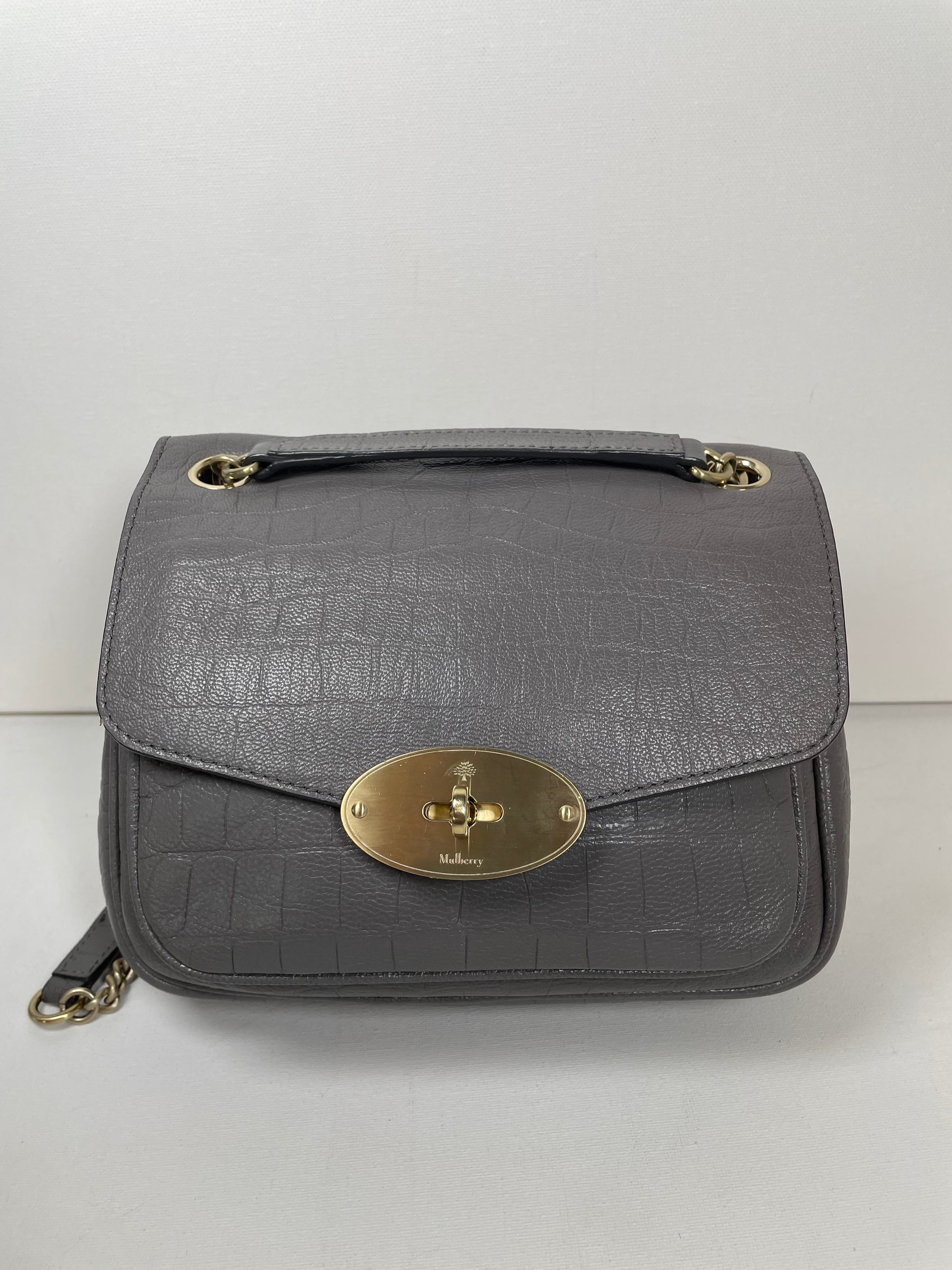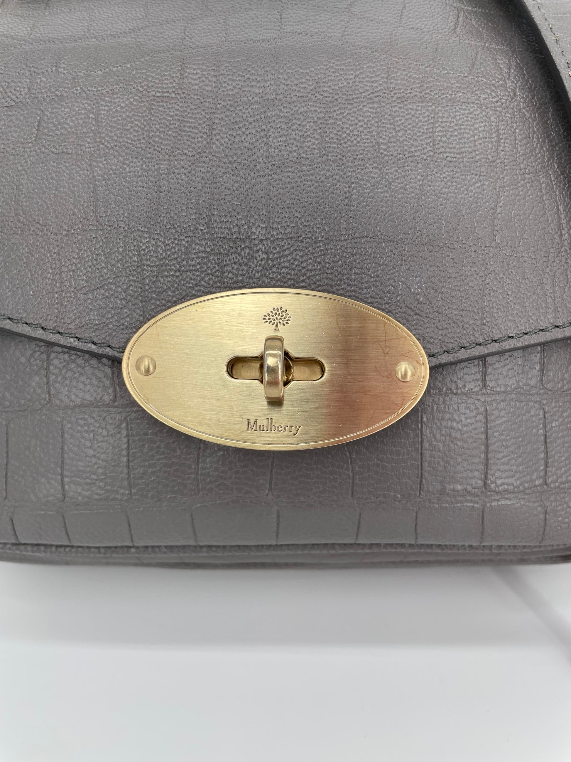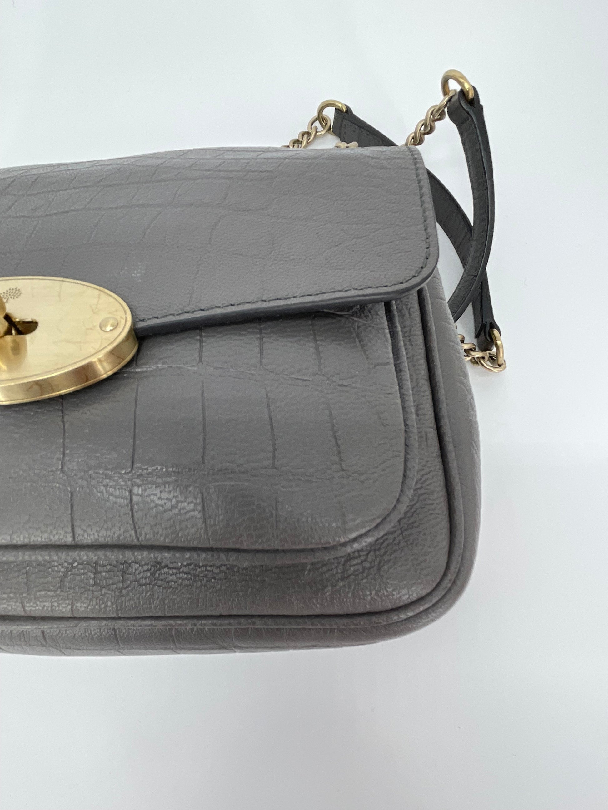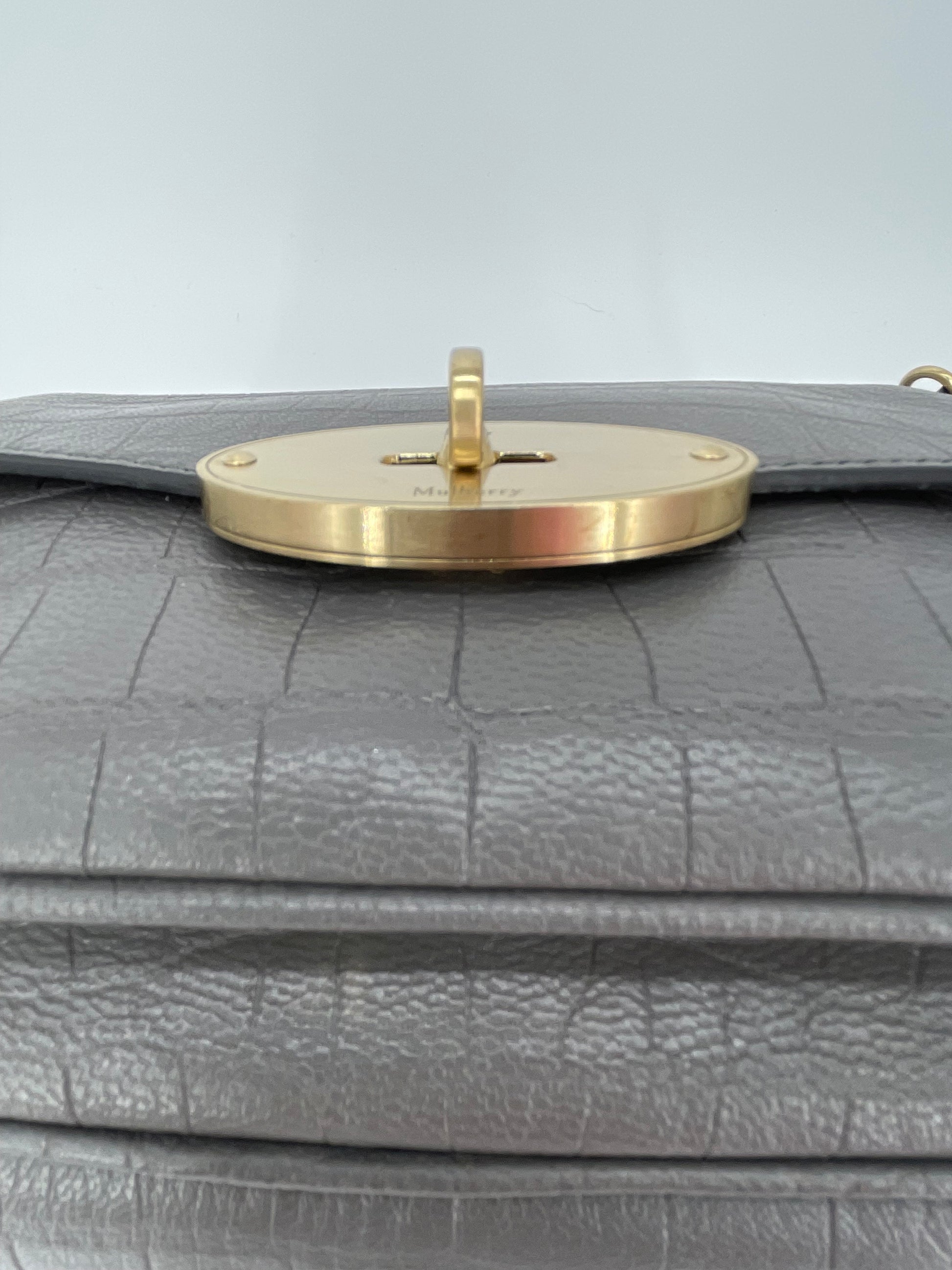 This is a stunning Mulberry soft Darley Shoulder Bag in small and in a moc croc leather. This bag offers a refined updated version of the classic Darley, celebrating the iconic Postmans Lock in a contemporary silhouette . The colour is a dark grey (Charcoal) with light goldtone hardware.