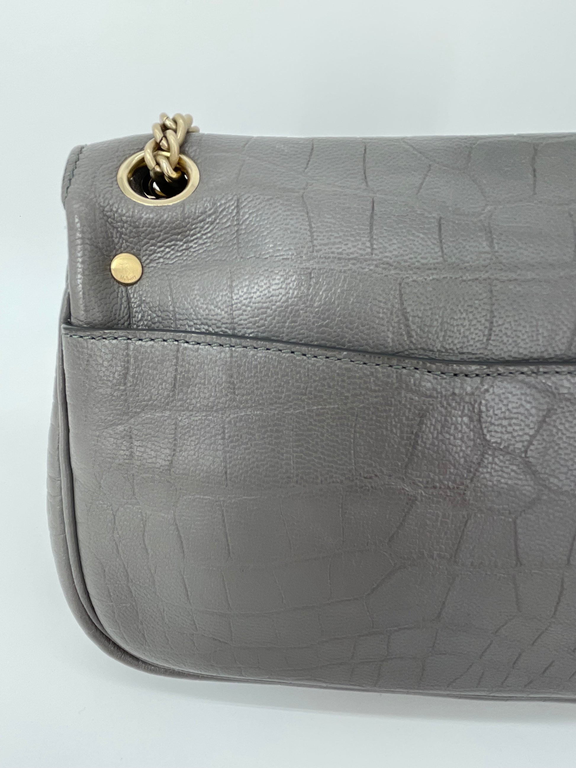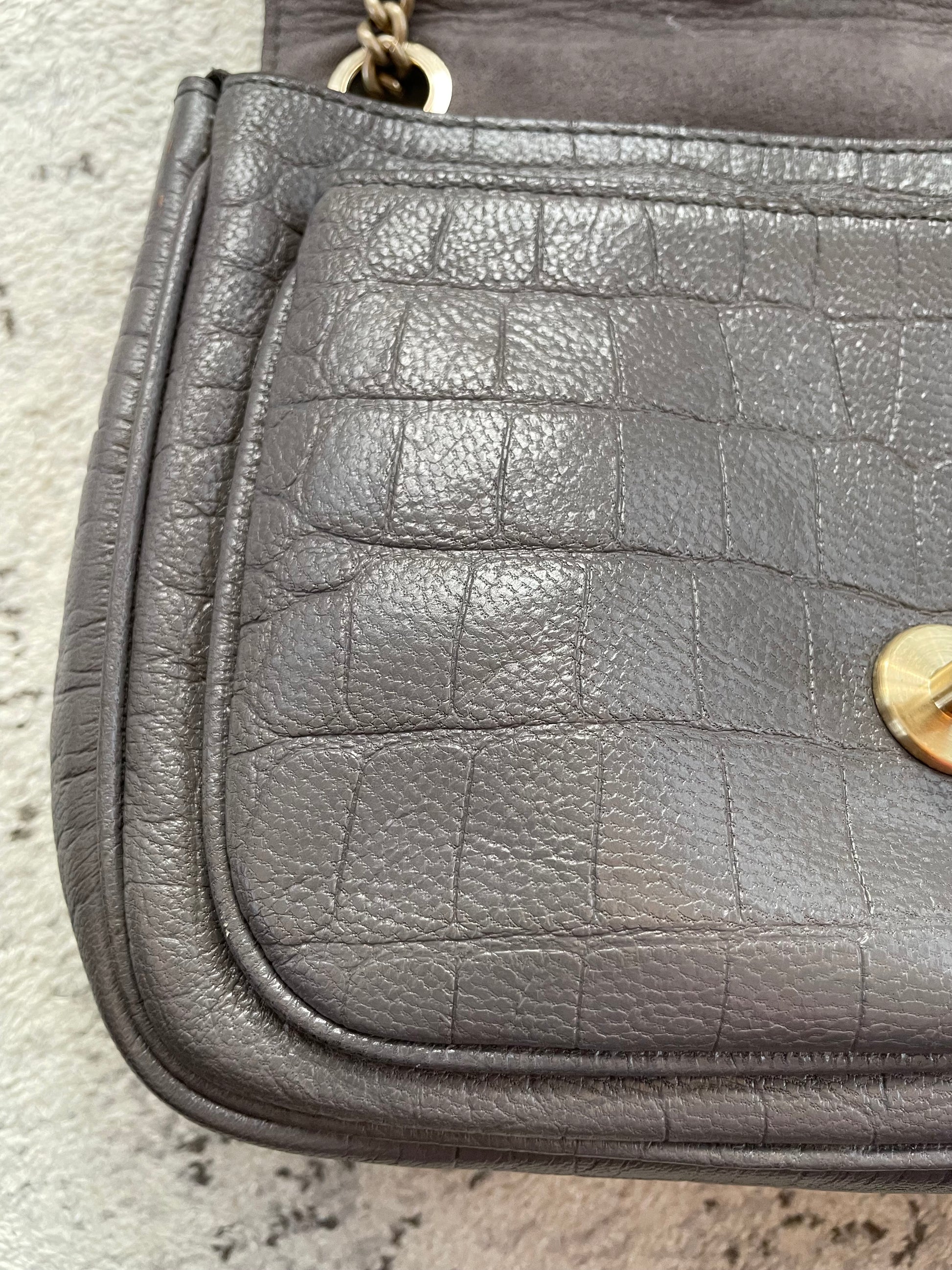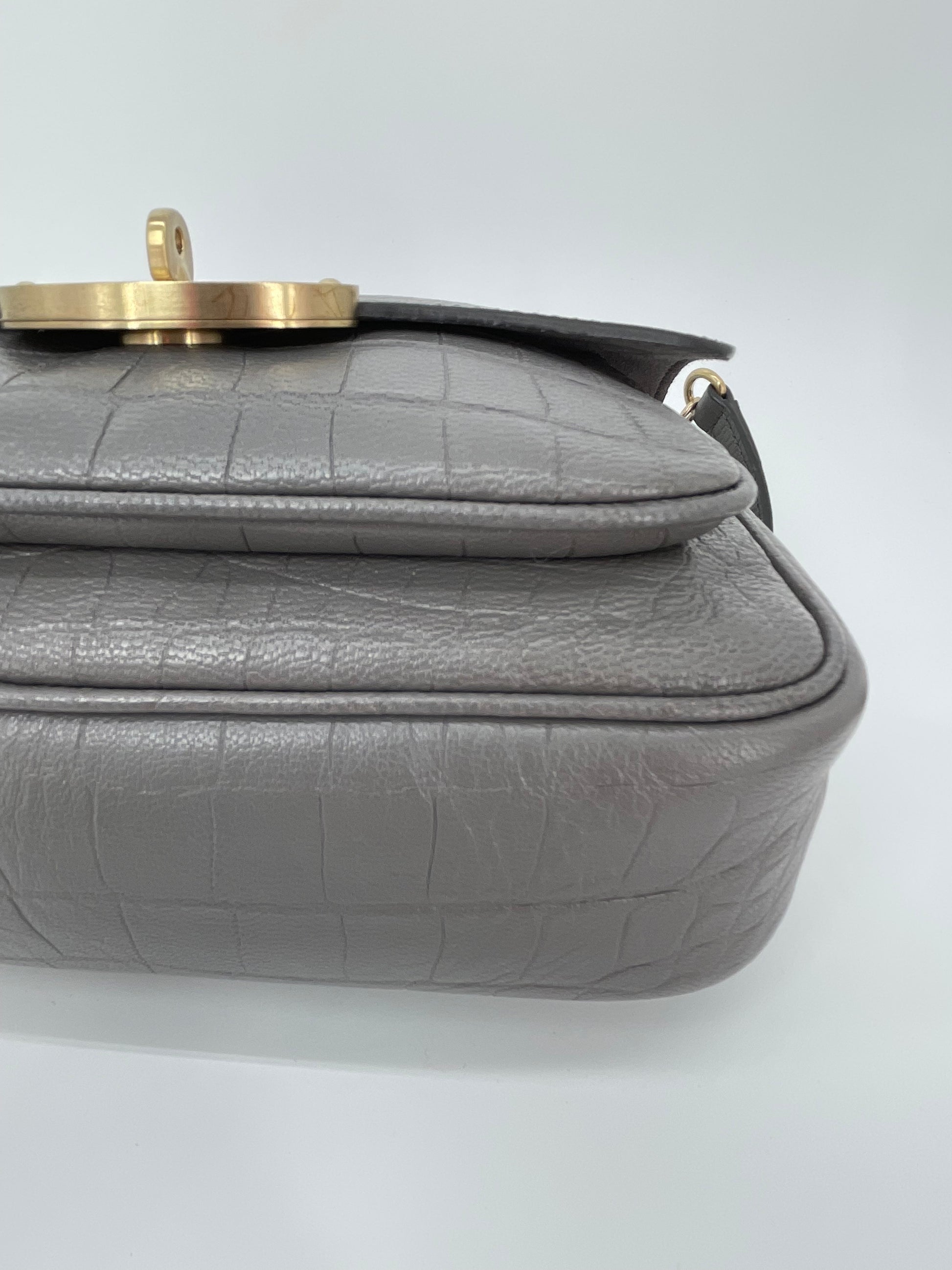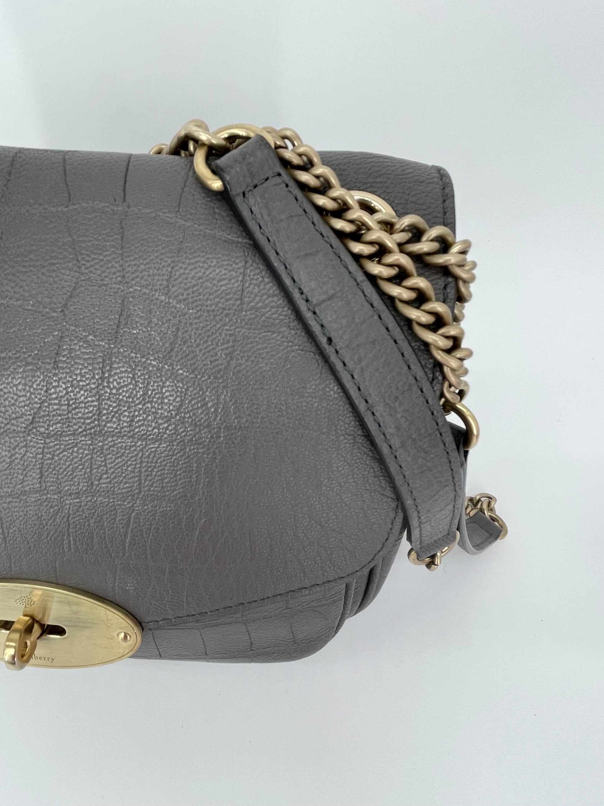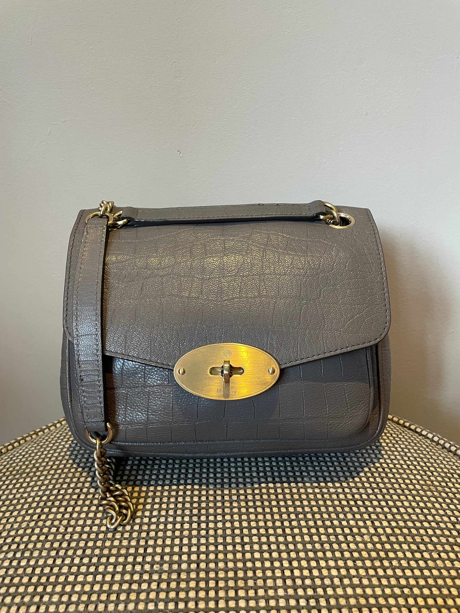 This is a stunning Mulberry soft Darley Shoulder Bag in small and in a moc croc leather. This bag offers a refined updated version of the classic Darley, celebrating the iconic Postmans Lock in a contemporary silhouette . The colour is a dark grey (Charcoal) with light goldtone hardware.