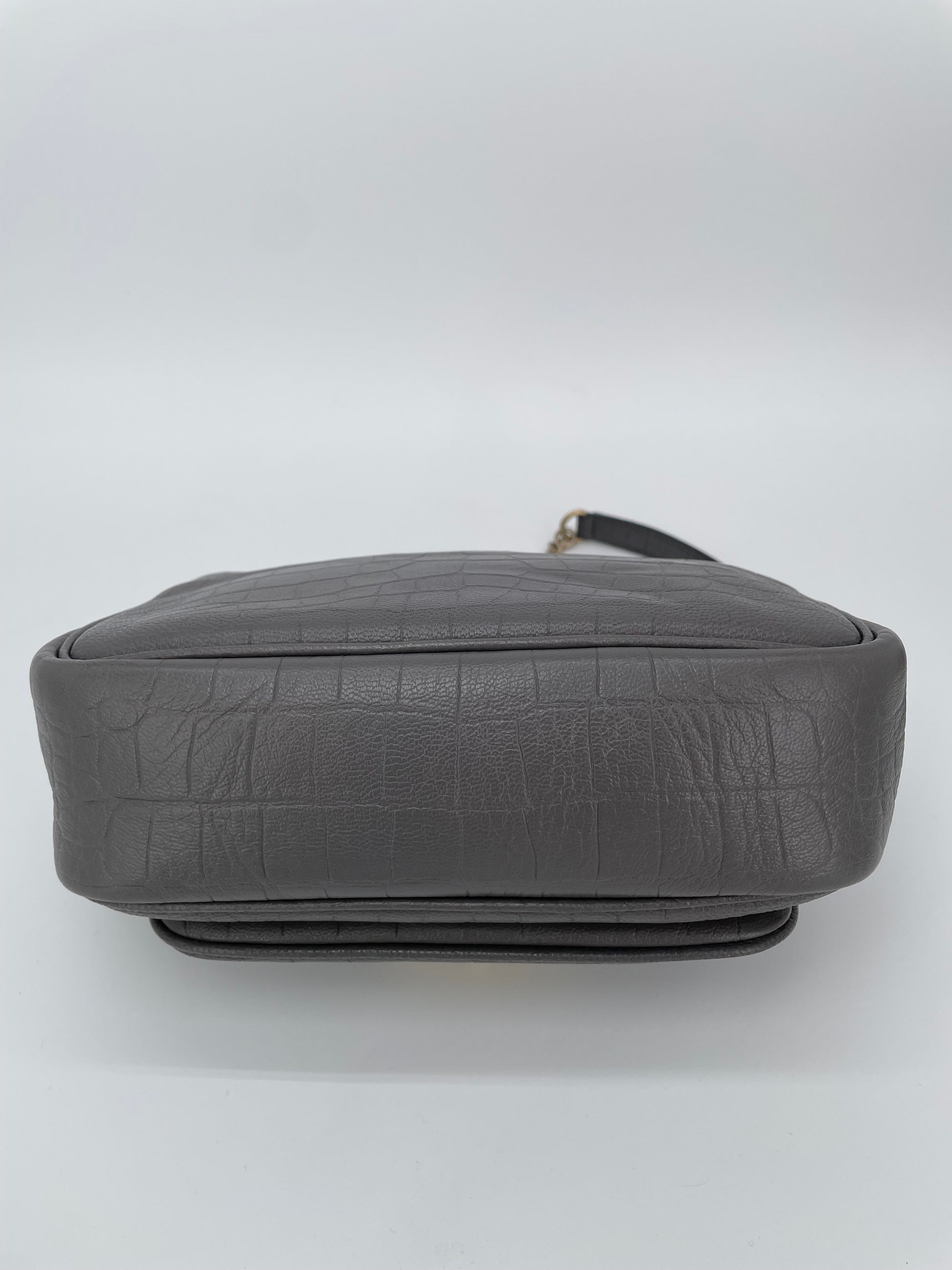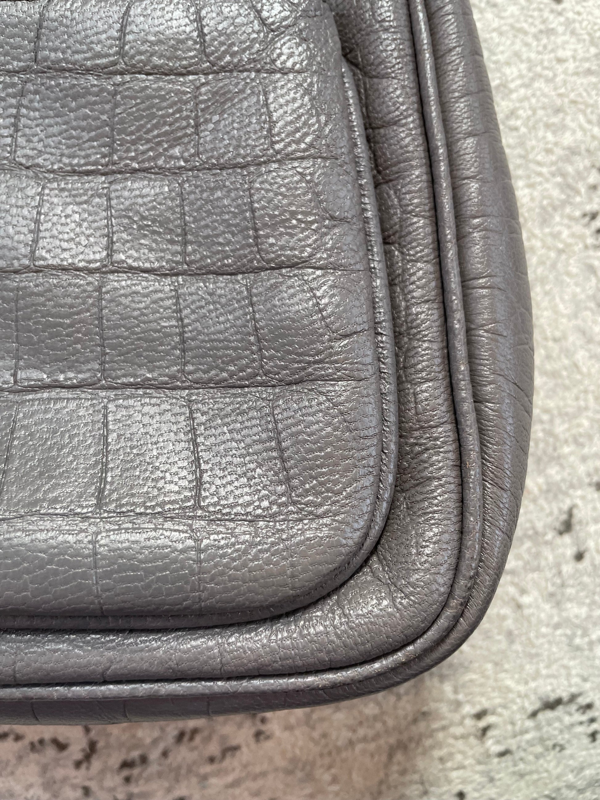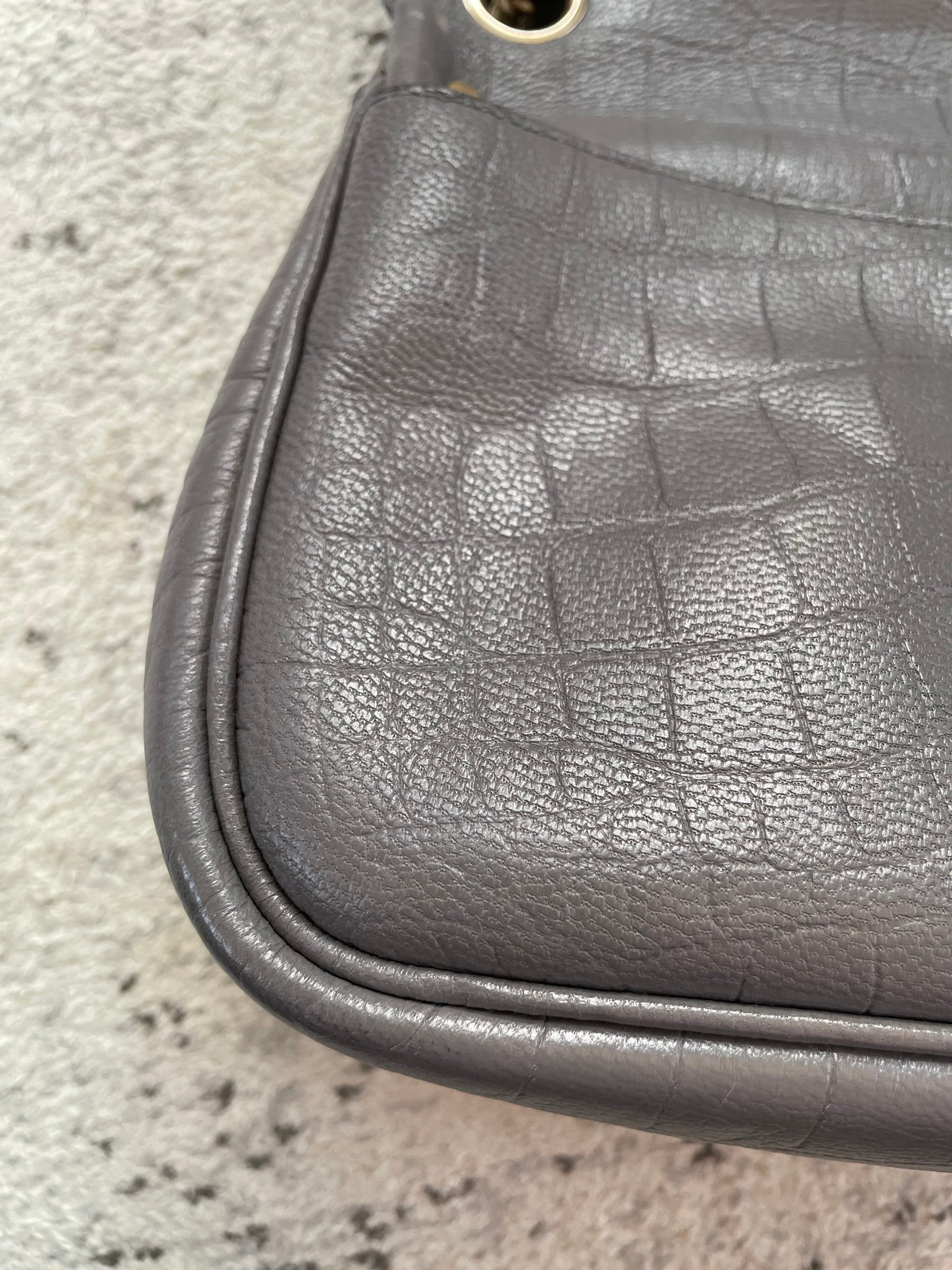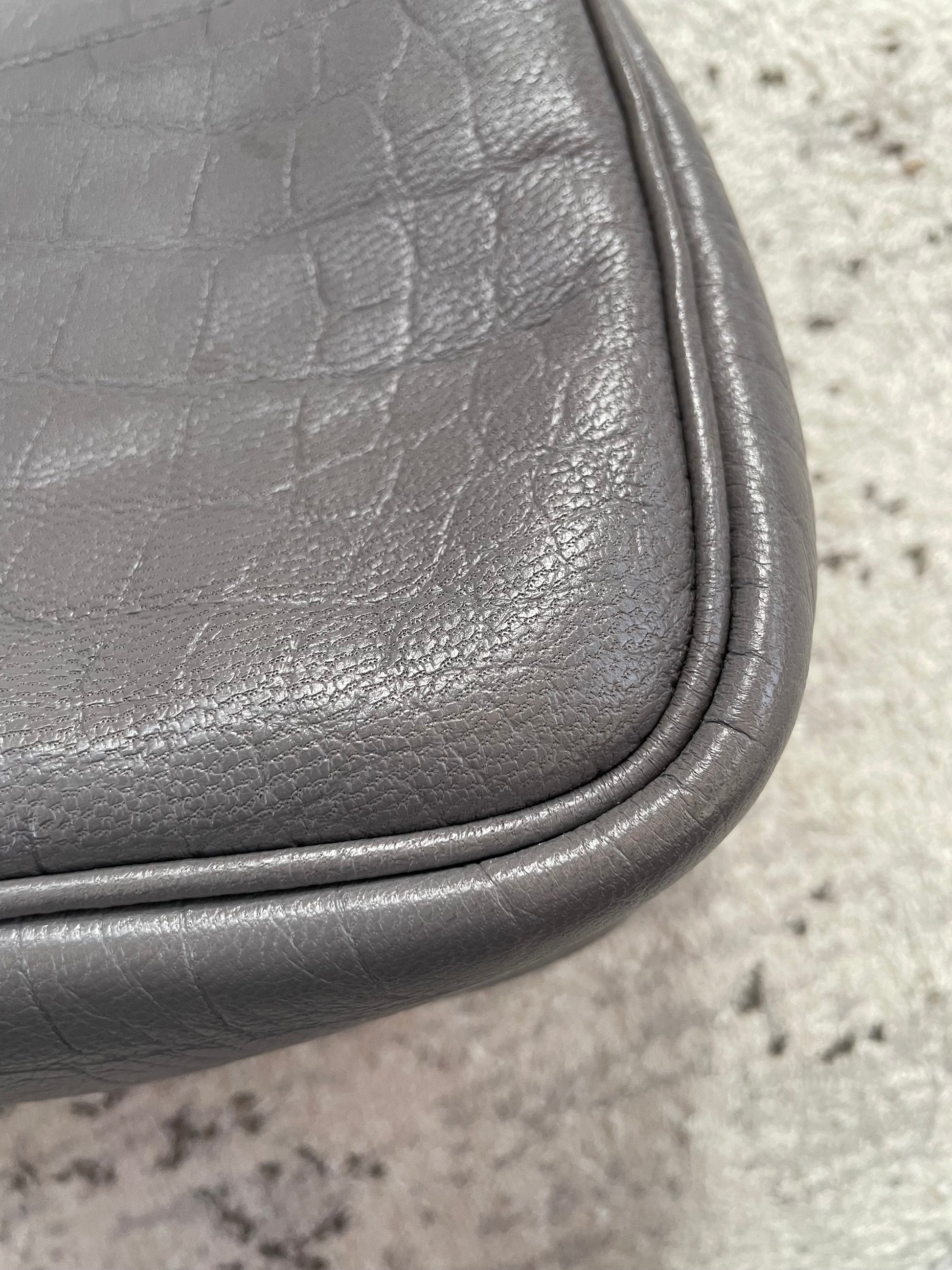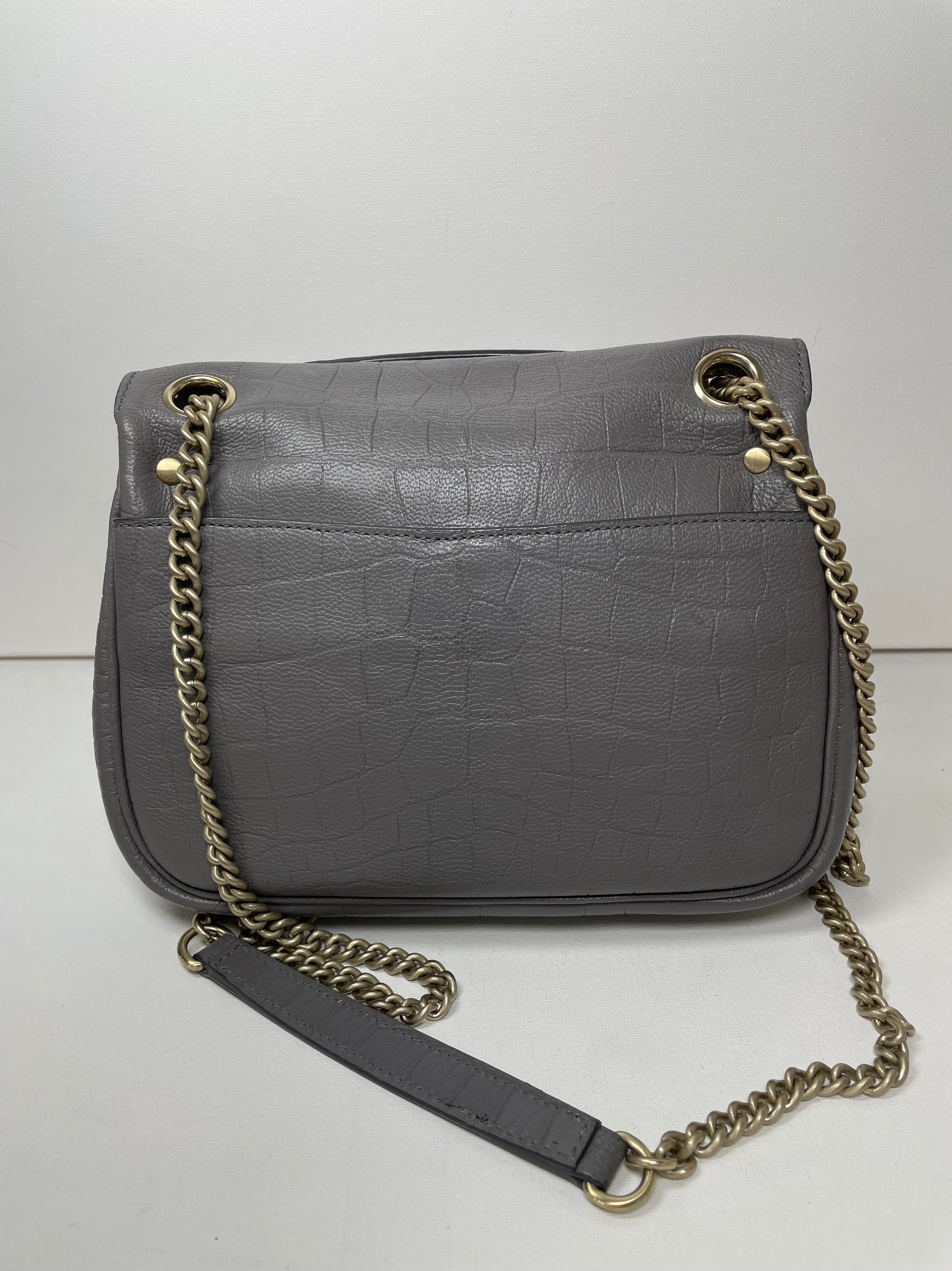 This is a stunning Mulberry soft Darley Shoulder Bag in small and in a moc croc leather. This bag offers a refined updated version of the classic Darley, celebrating the iconic Postmans Lock in a contemporary silhouette . The colour is a dark grey (Charcoal) with light goldtone hardware.