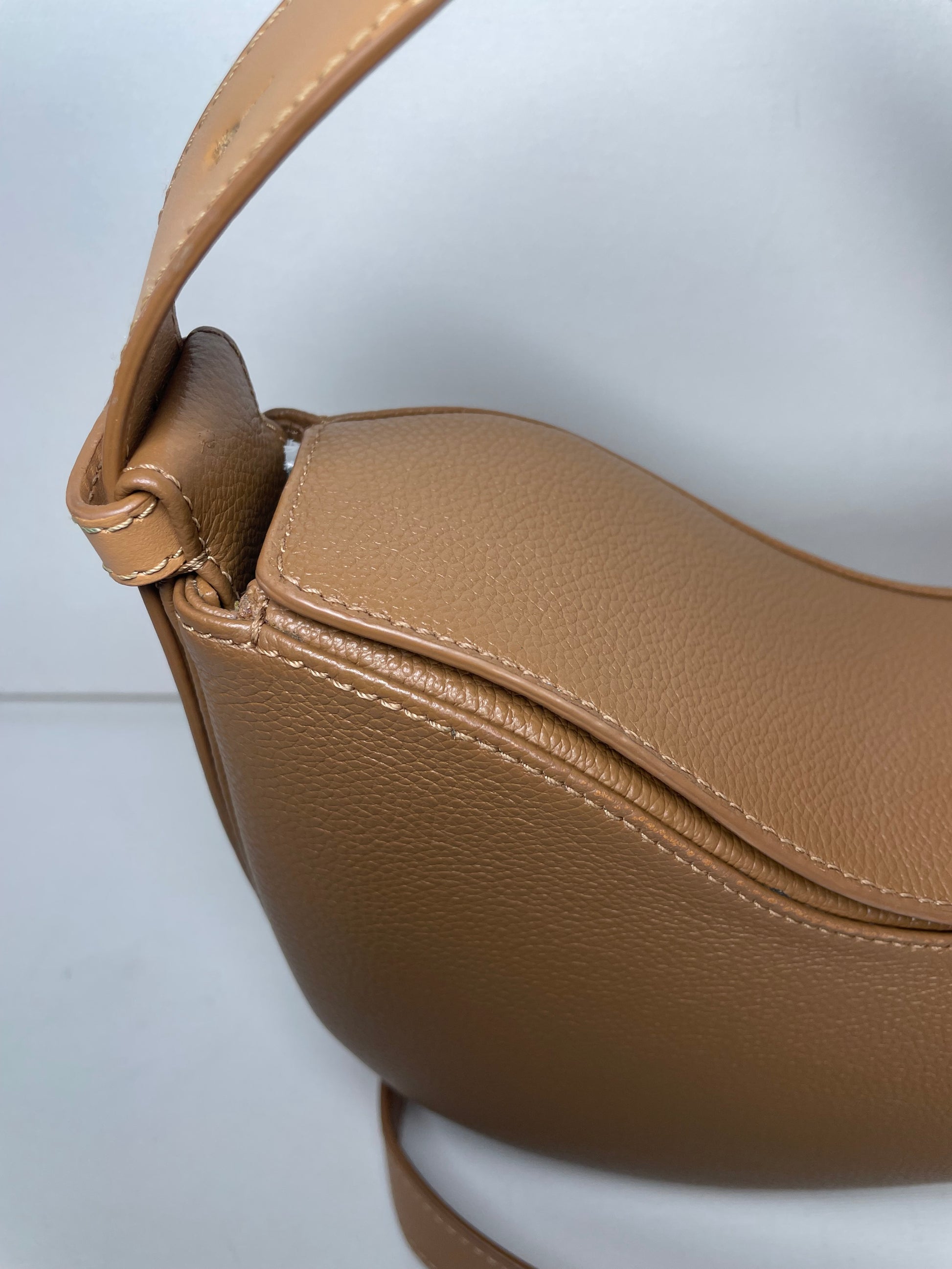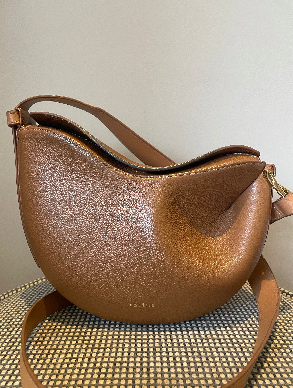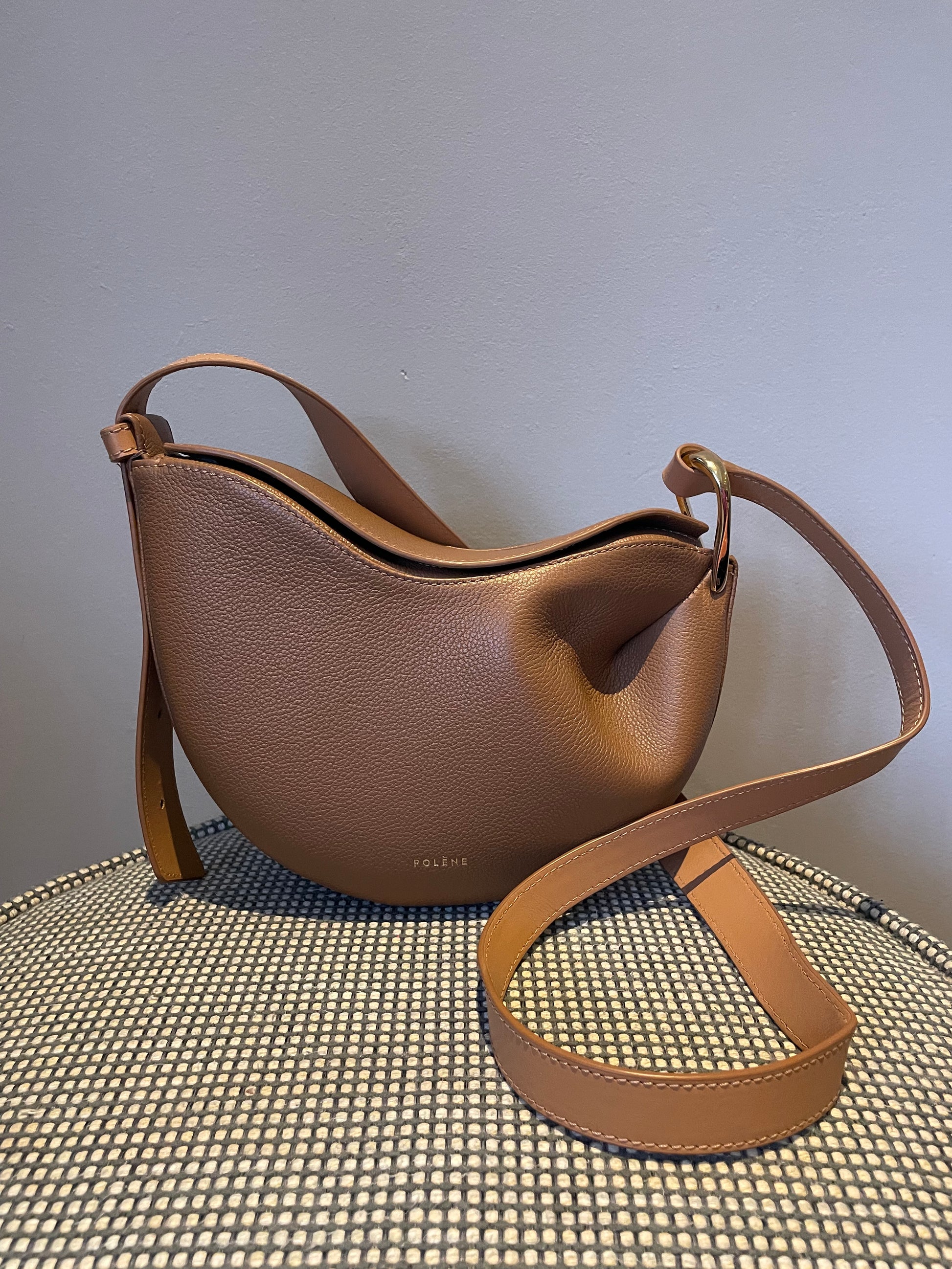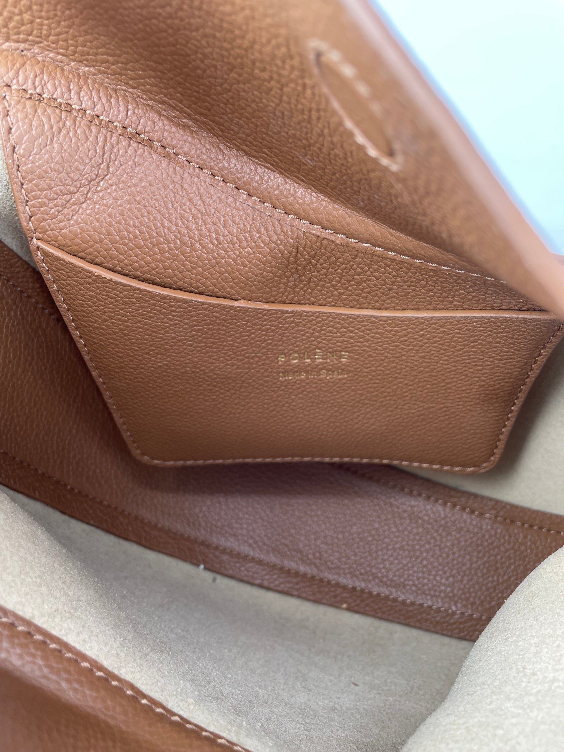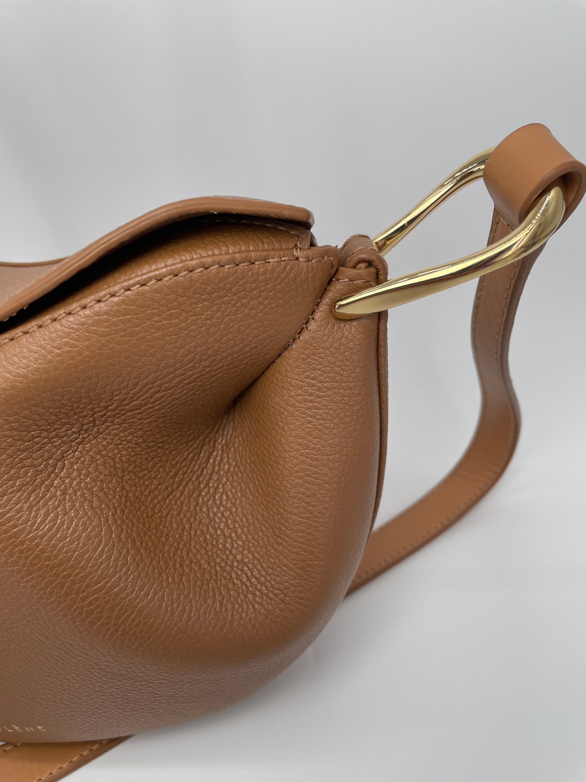 Polene create elegant, sophisticated and bags that are extremely high quality. The Polene Tonca bag is a simple, stylish bag that is undeniably feminine with its sensual curves. The grainy Camel brown coloured leather creates a soft profile. The shoulder strap is made from a smooth contrasting leather. This crossbody bag has a magnetic top closing flap that opens to good size interior and open slip pocket.