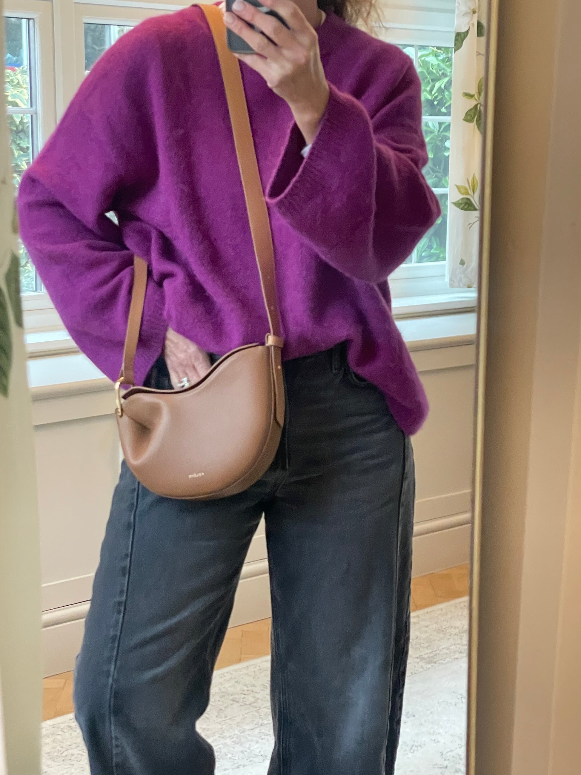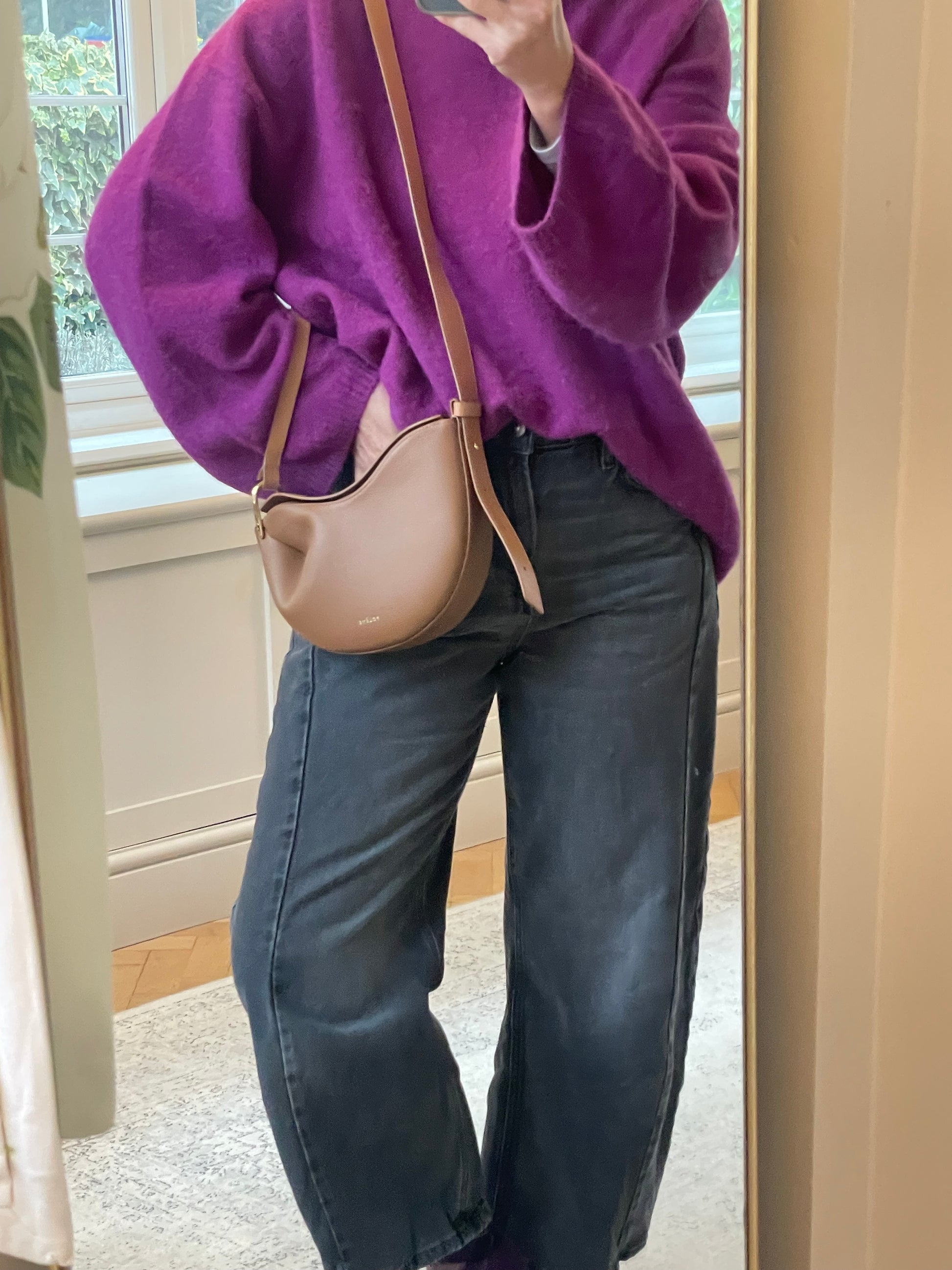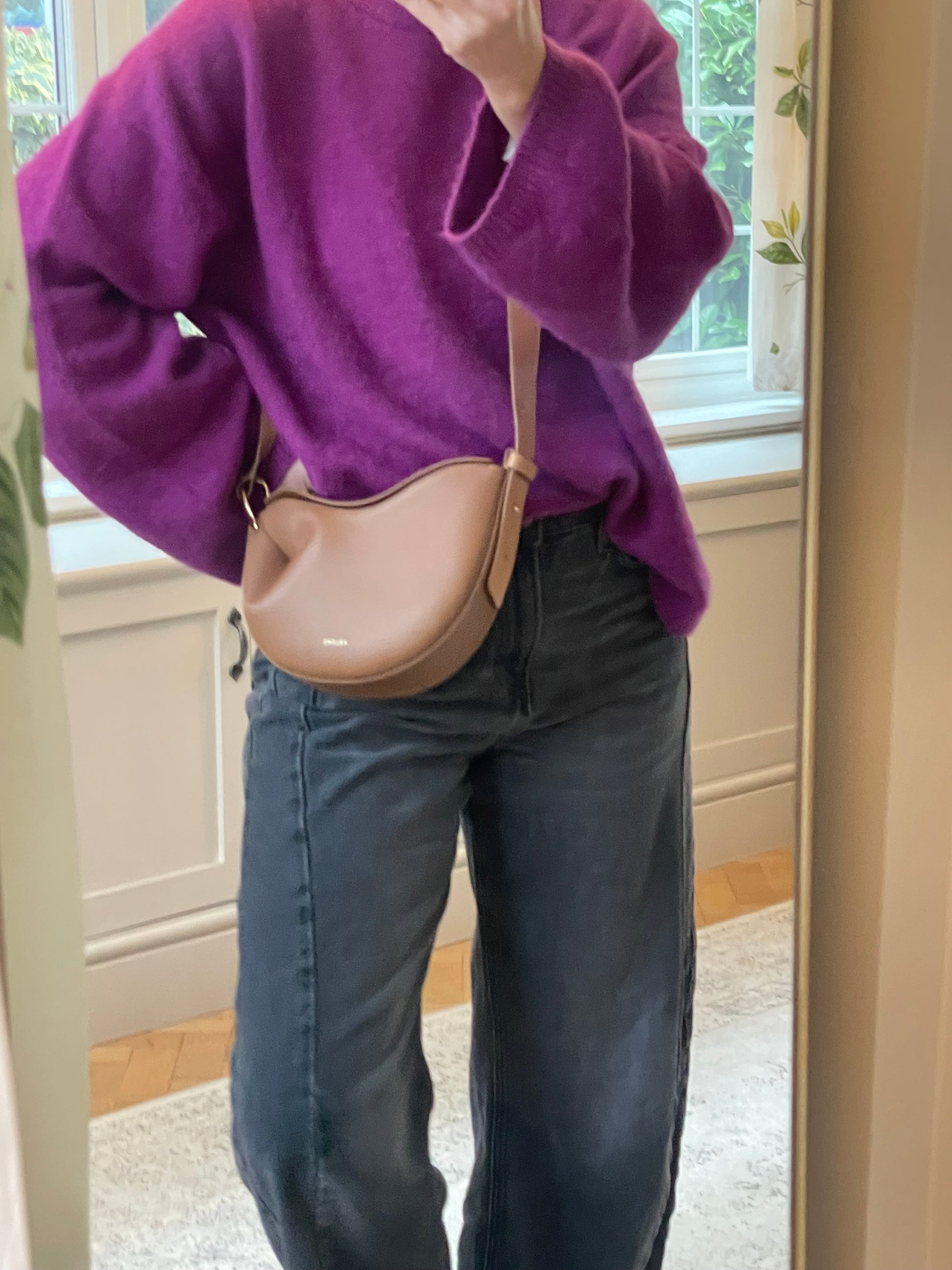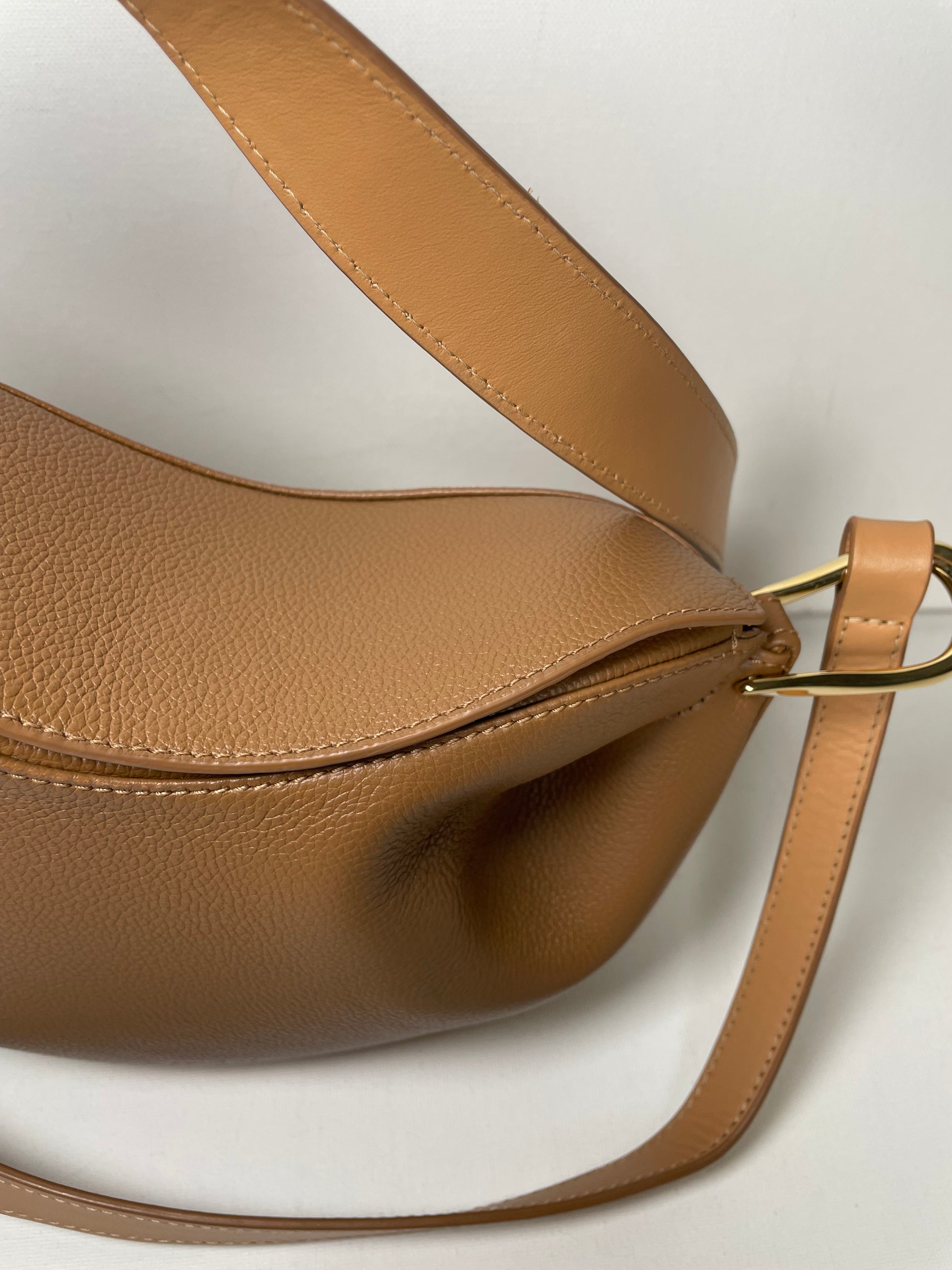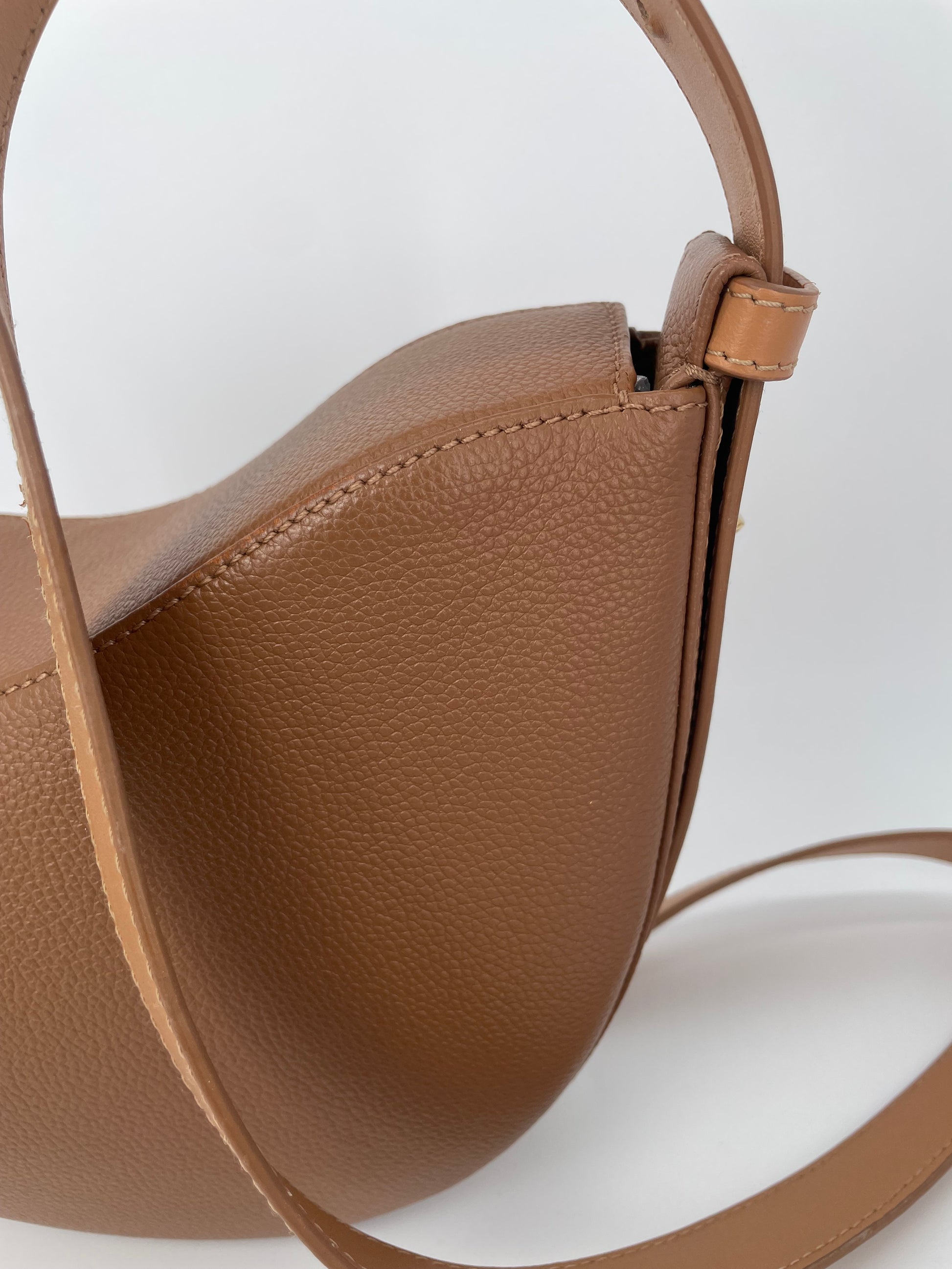 Polene create elegant, sophisticated and bags that are extremely high quality. The Polene Tonca bag is a simple, stylish bag that is undeniably feminine with its sensual curves. The grainy Camel brown coloured leather creates a soft profile. The shoulder strap is made from a smooth contrasting leather. This crossbody bag has a magnetic top closing flap that opens to good size interior and open slip pocket.