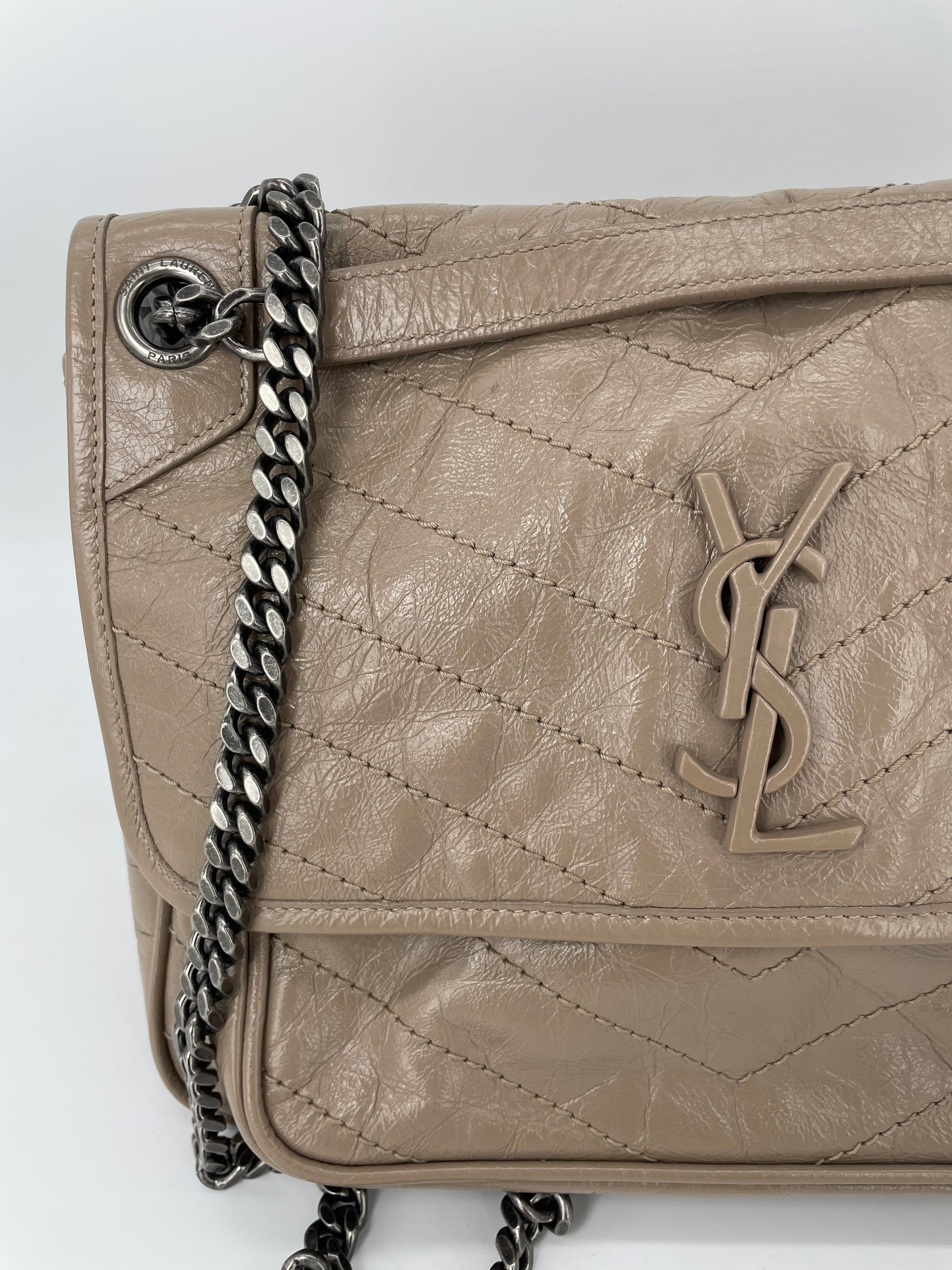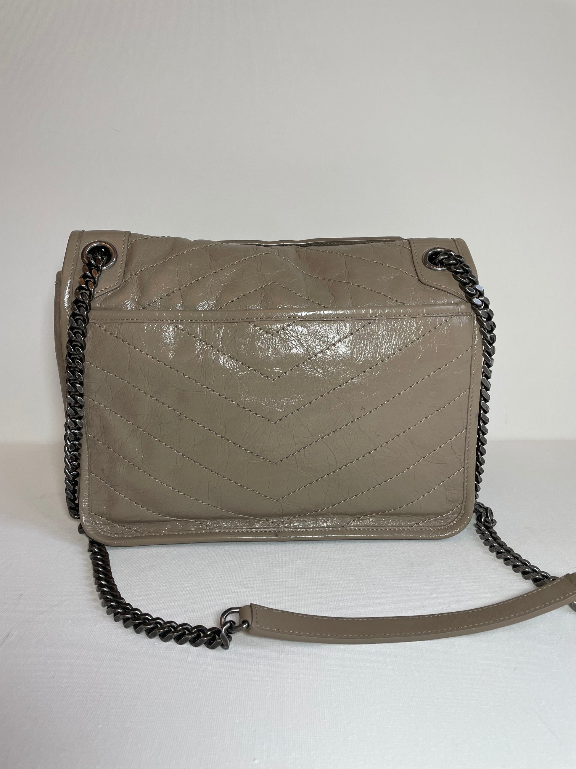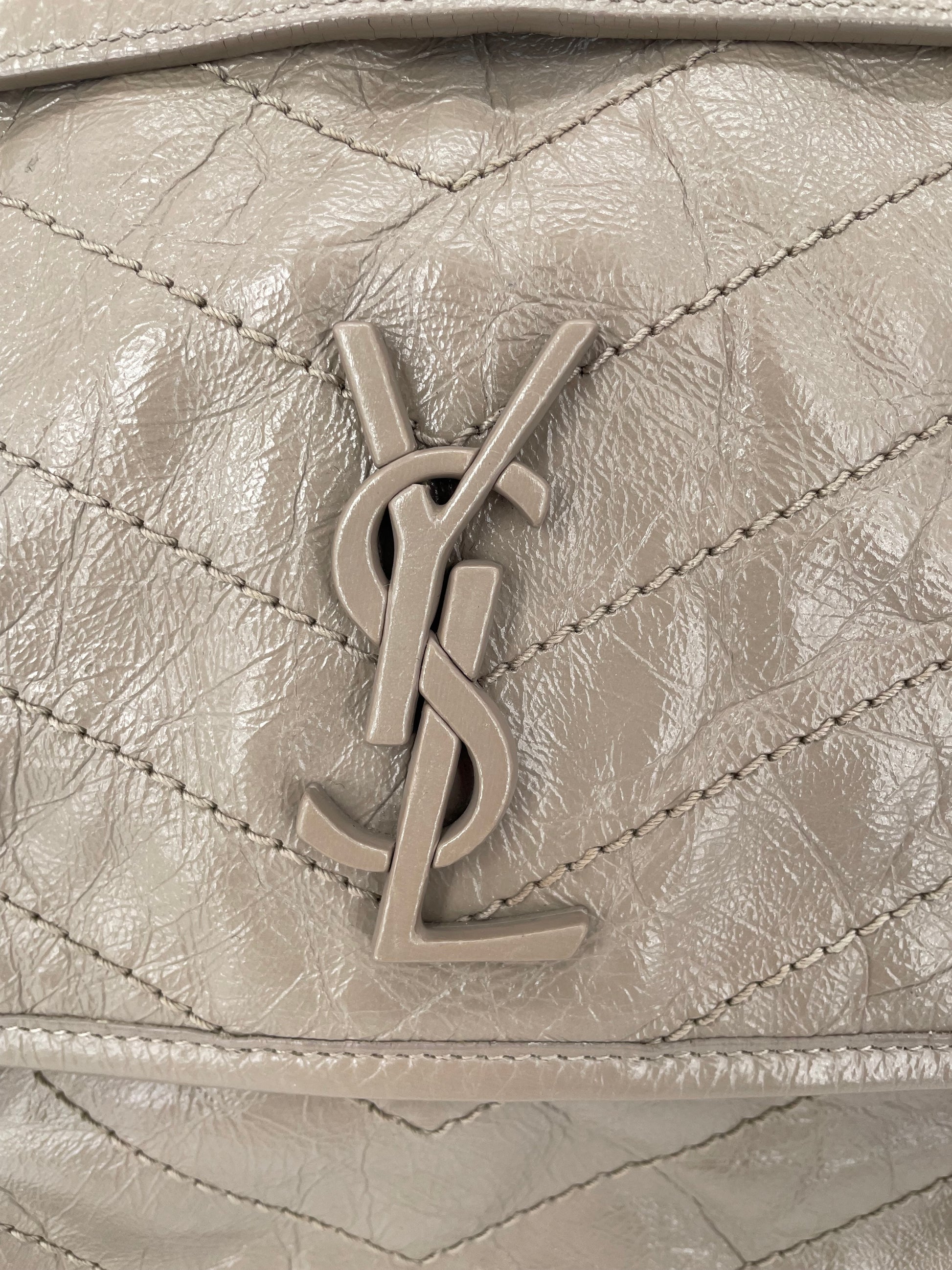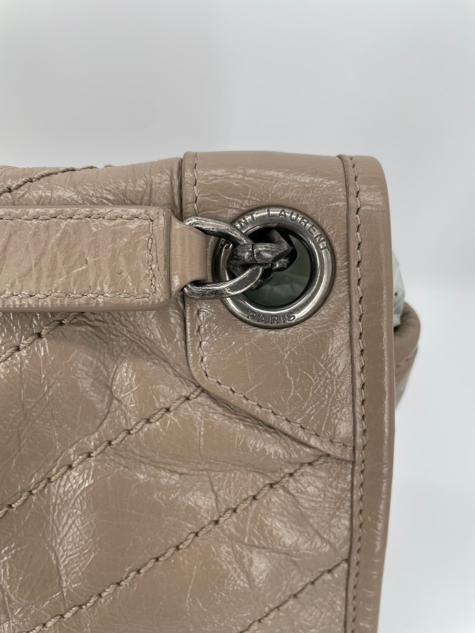 This is a stunning Medium Saint Laurent Quilted Crinkle Leather Niki bag . It features crinkled leather in a greyish, beige and can be worn on the shoulder or crossbody. The iconic initials in raised coated metal sit in the centre on the front. The gunmetal grey chain strap can be carried long or doubled to sit on the shoulder. The interior is large enough to fit all your essentials. Under the opening flap Is a small open pocket and behind that is the main compartment, a large zip pocket to the back and a small slip pocket.