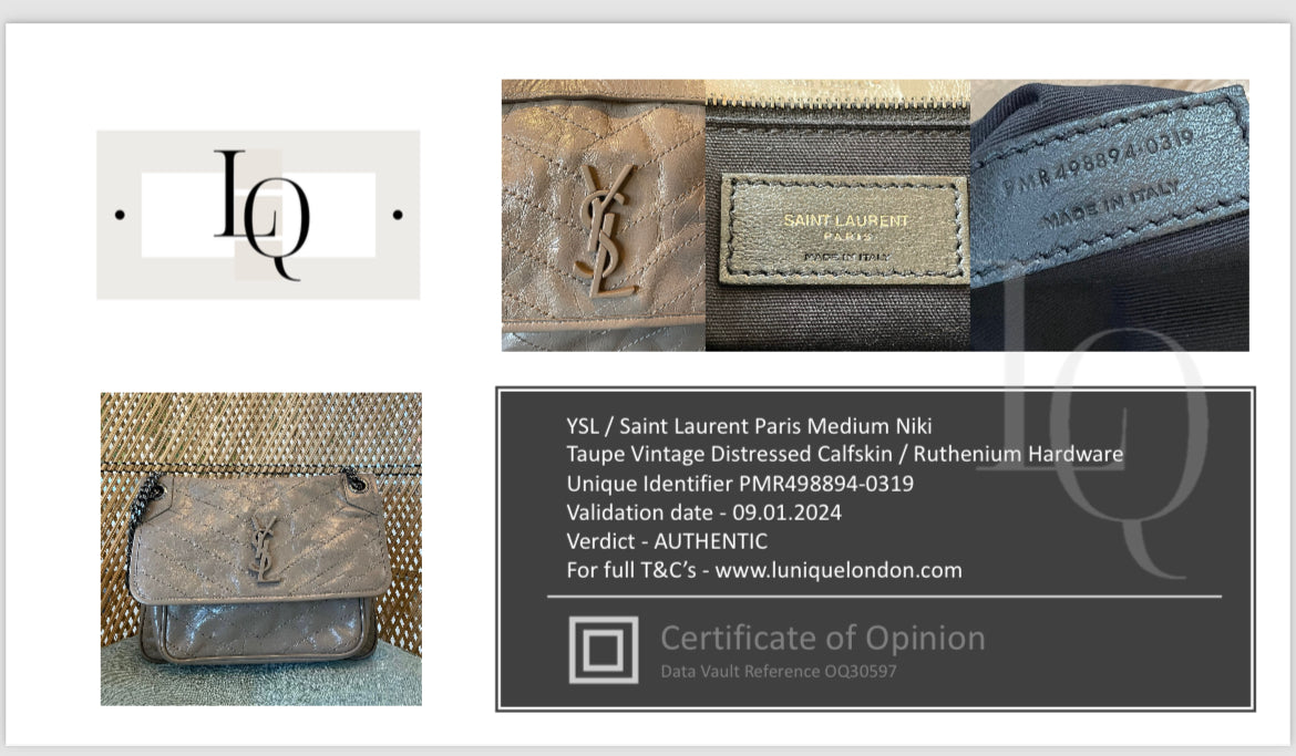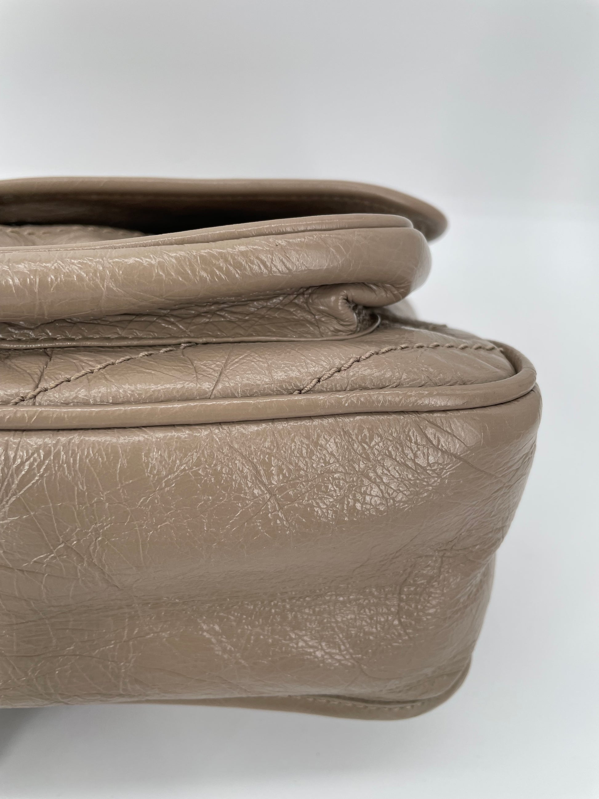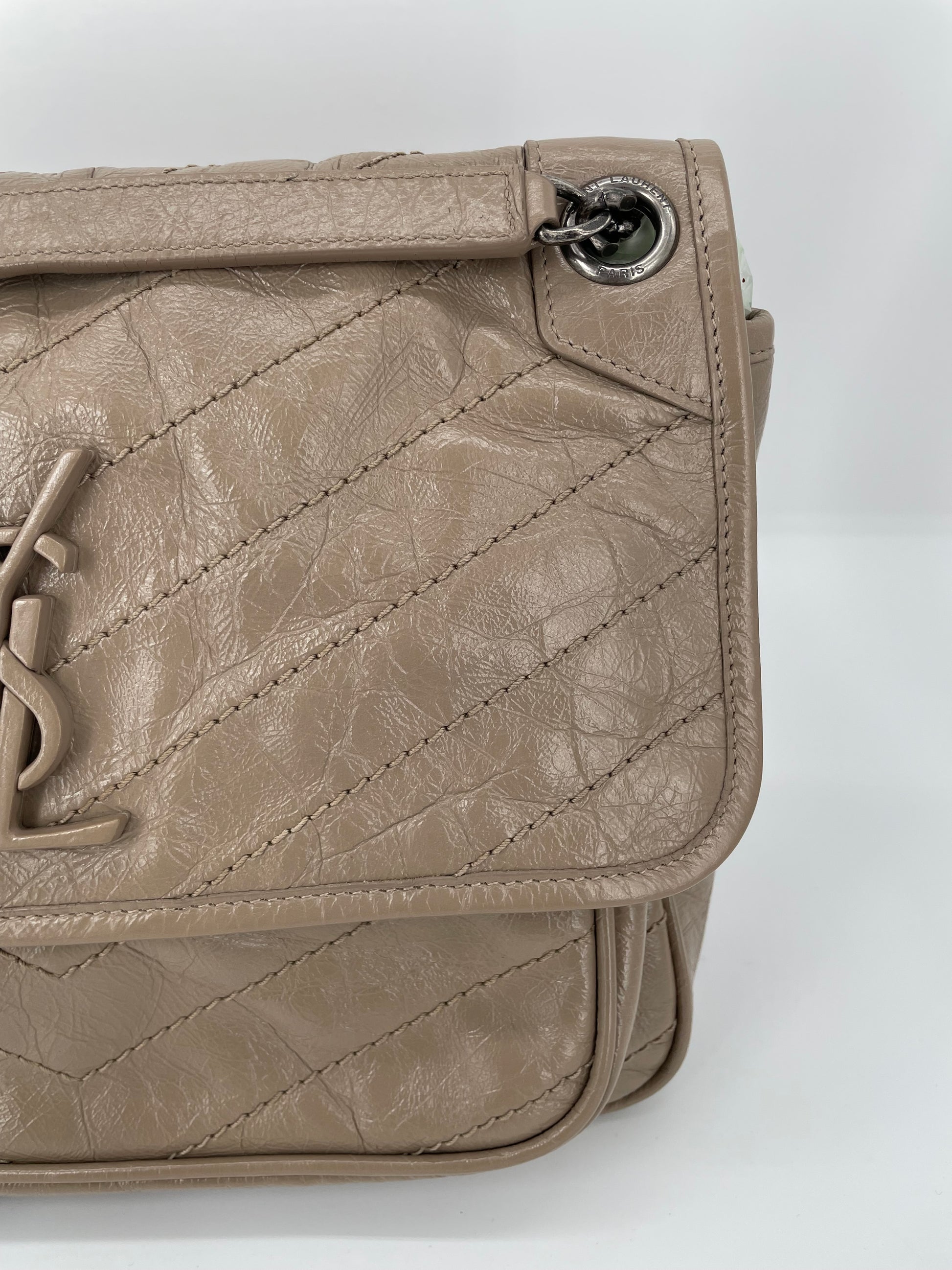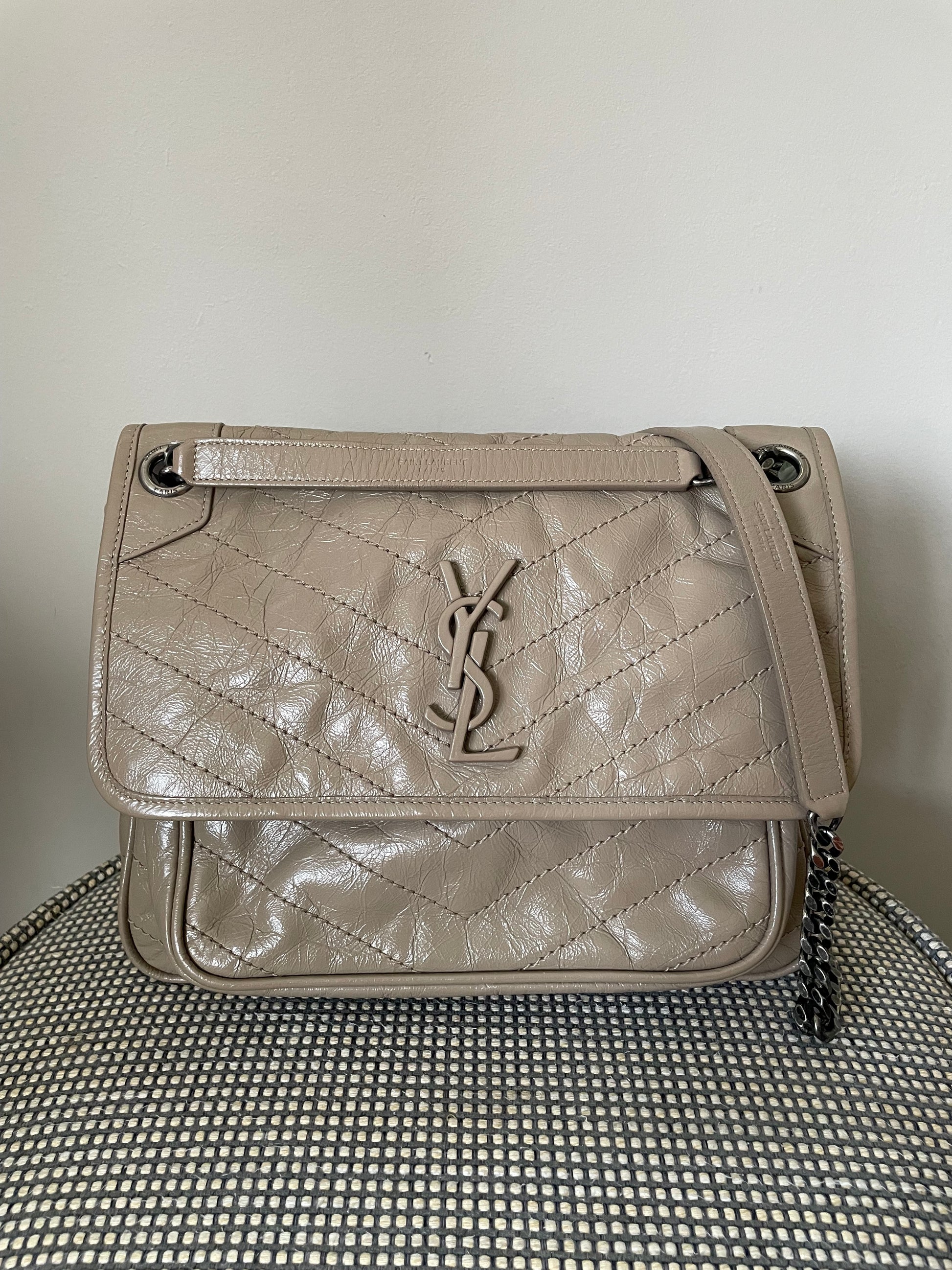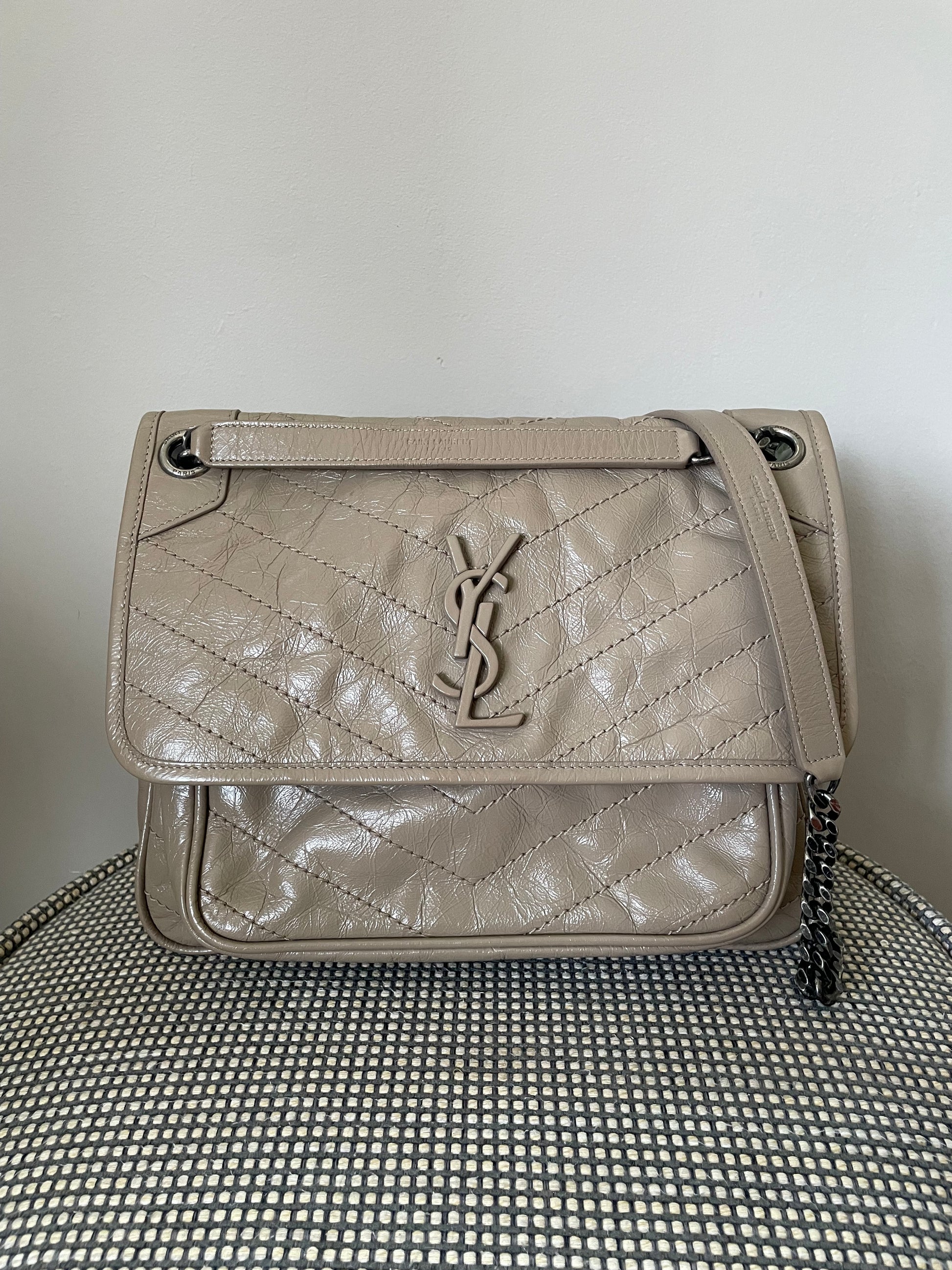 This is a stunning Medium Saint Laurent Quilted Crinkle Leather Niki bag . It features crinkled leather in a greyish, beige and can be worn on the shoulder or crossbody. The iconic initials in raised coated metal sit in the centre on the front. The gunmetal grey chain strap can be carried long or doubled to sit on the shoulder. The interior is large enough to fit all your essentials. Under the opening flap Is a small open pocket and behind that is the main compartment, a large zip pocket to the back and a small slip pocket.