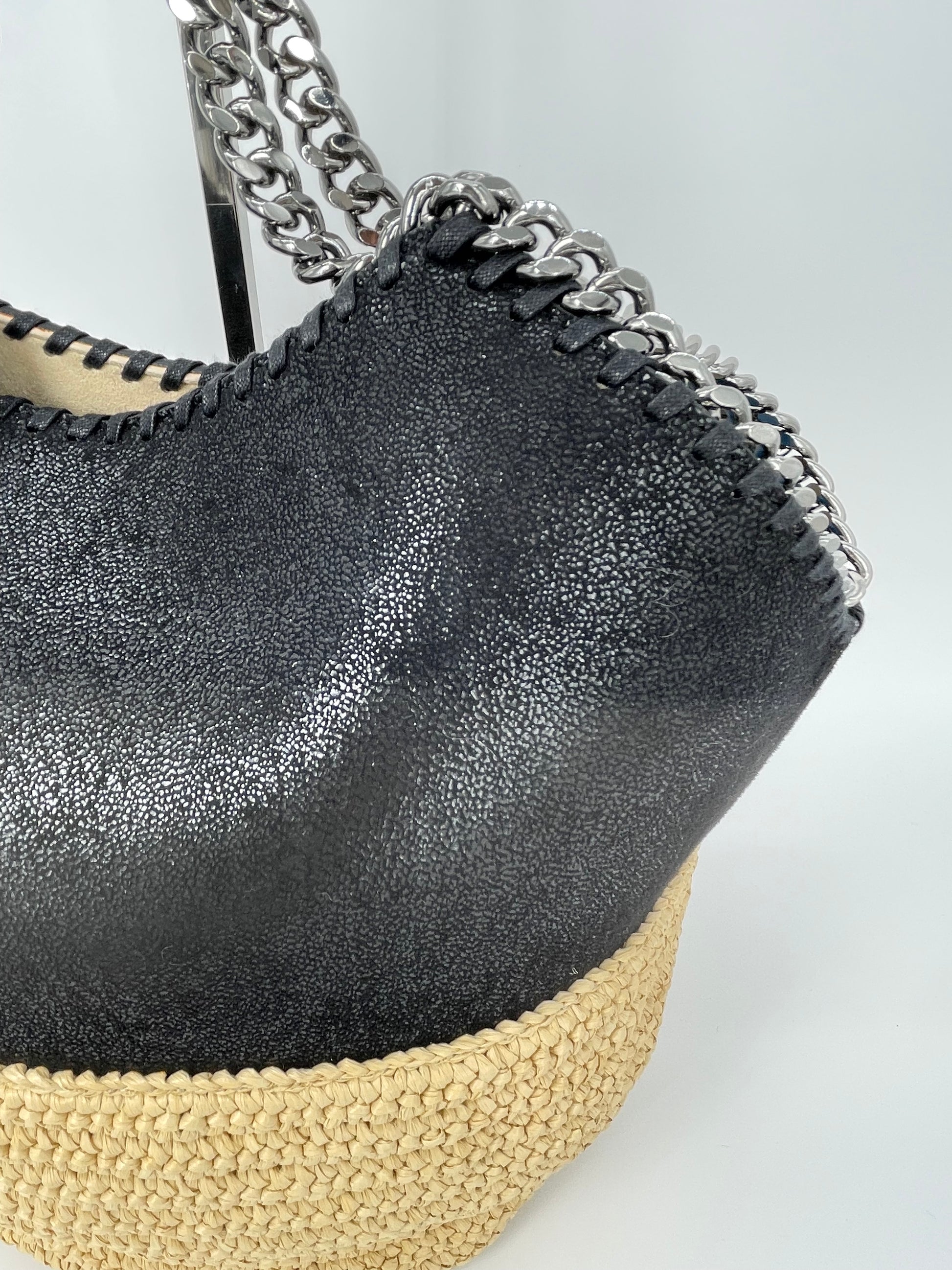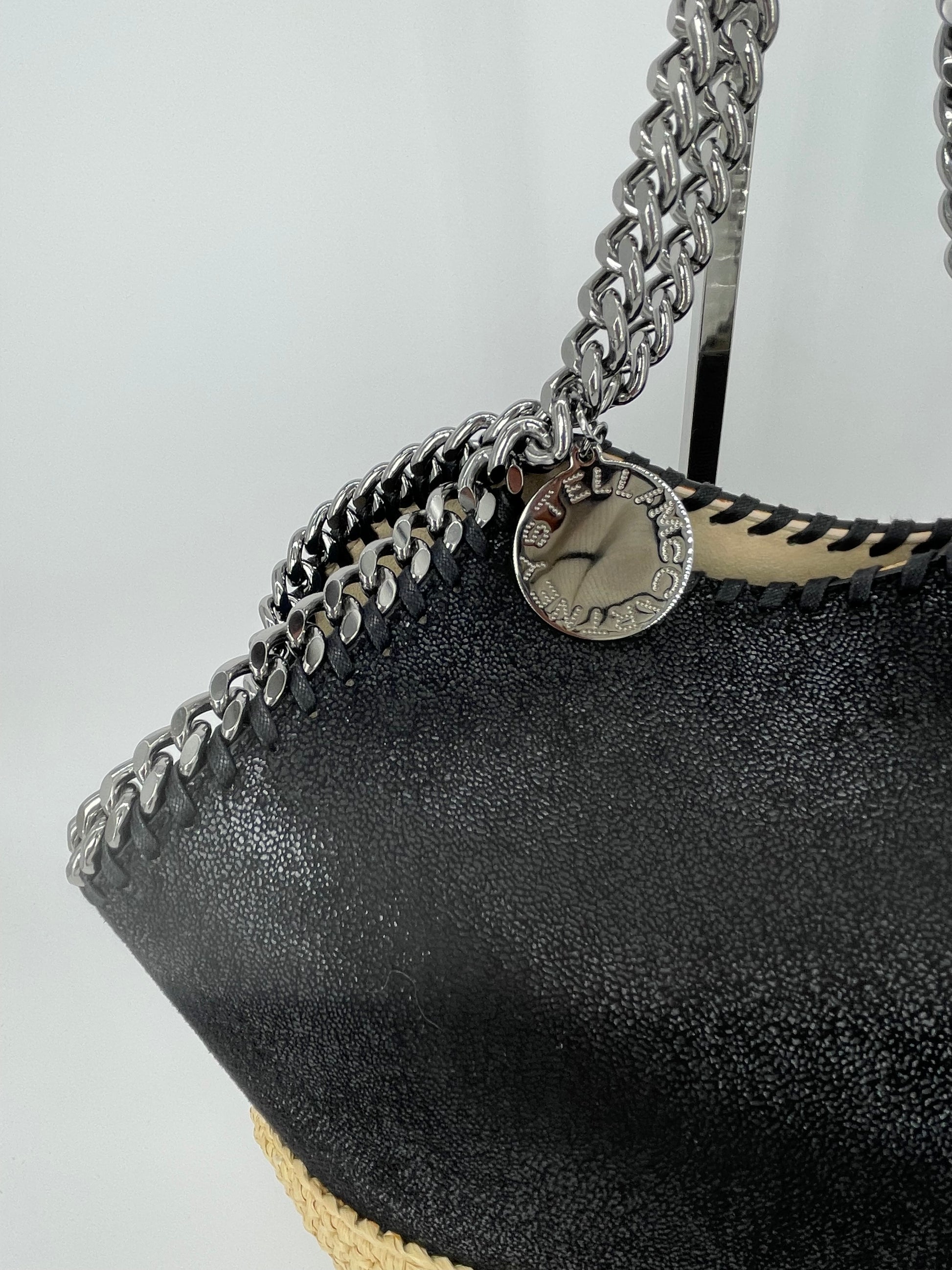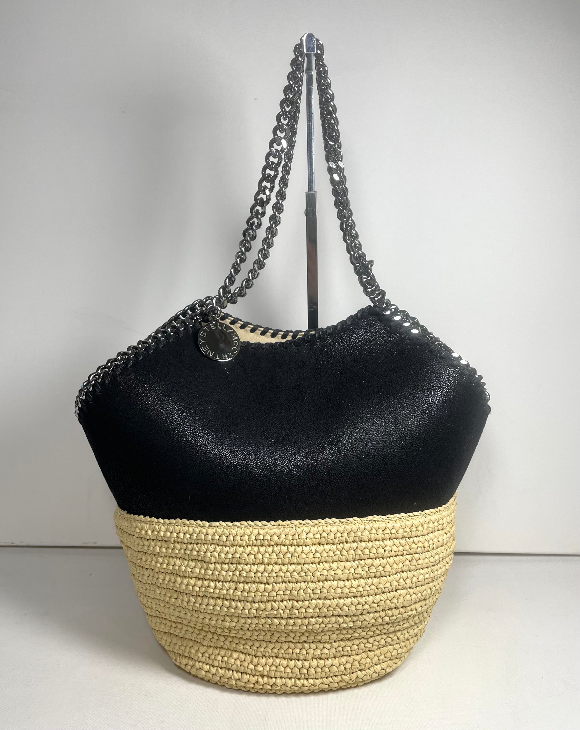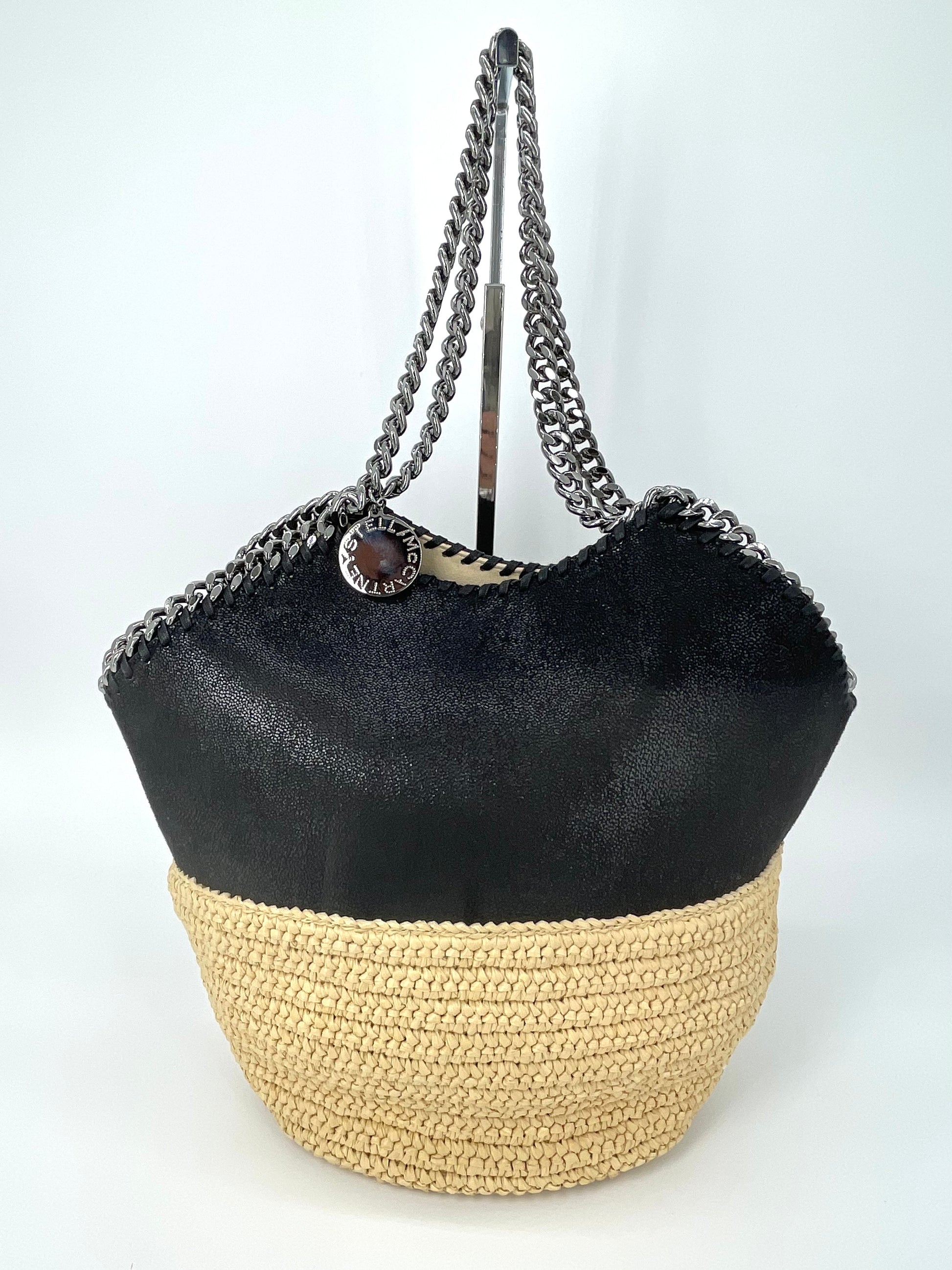 This is a striking and eye catching Stella McCartney Falabella in a textured Vegan Leather And Raffia. This tote bag is in a tactile black and soft cream woven raffia along with shiny goldtone hardware. The shape creates an elegant small tote bag and looks beautiful dressed up or down.