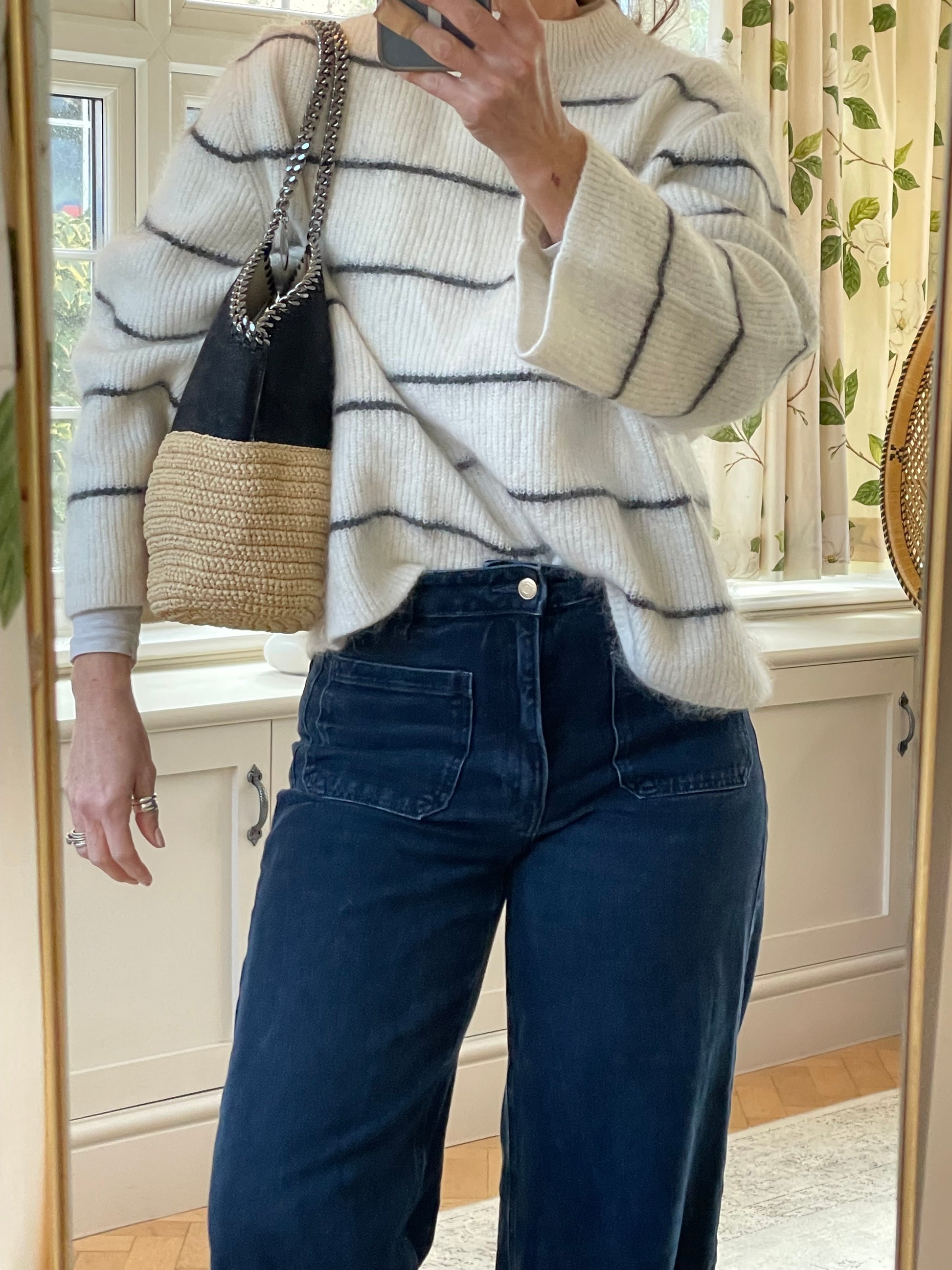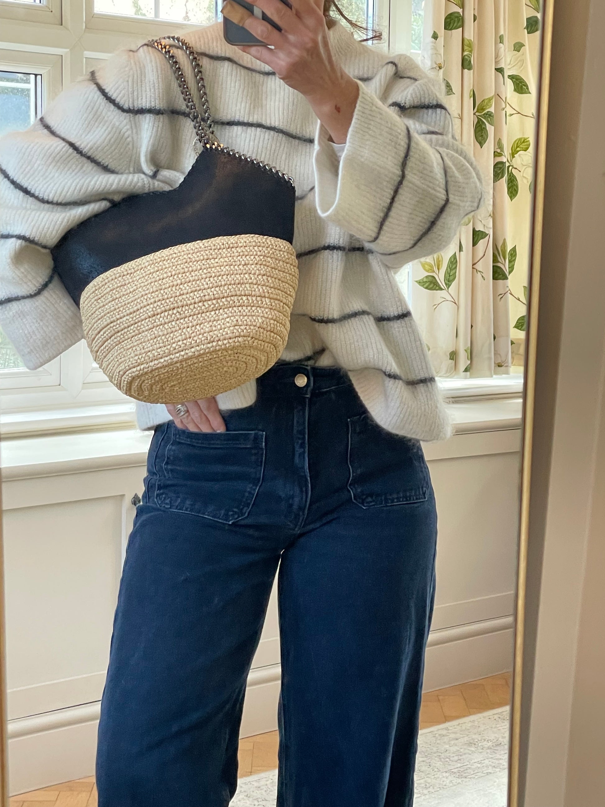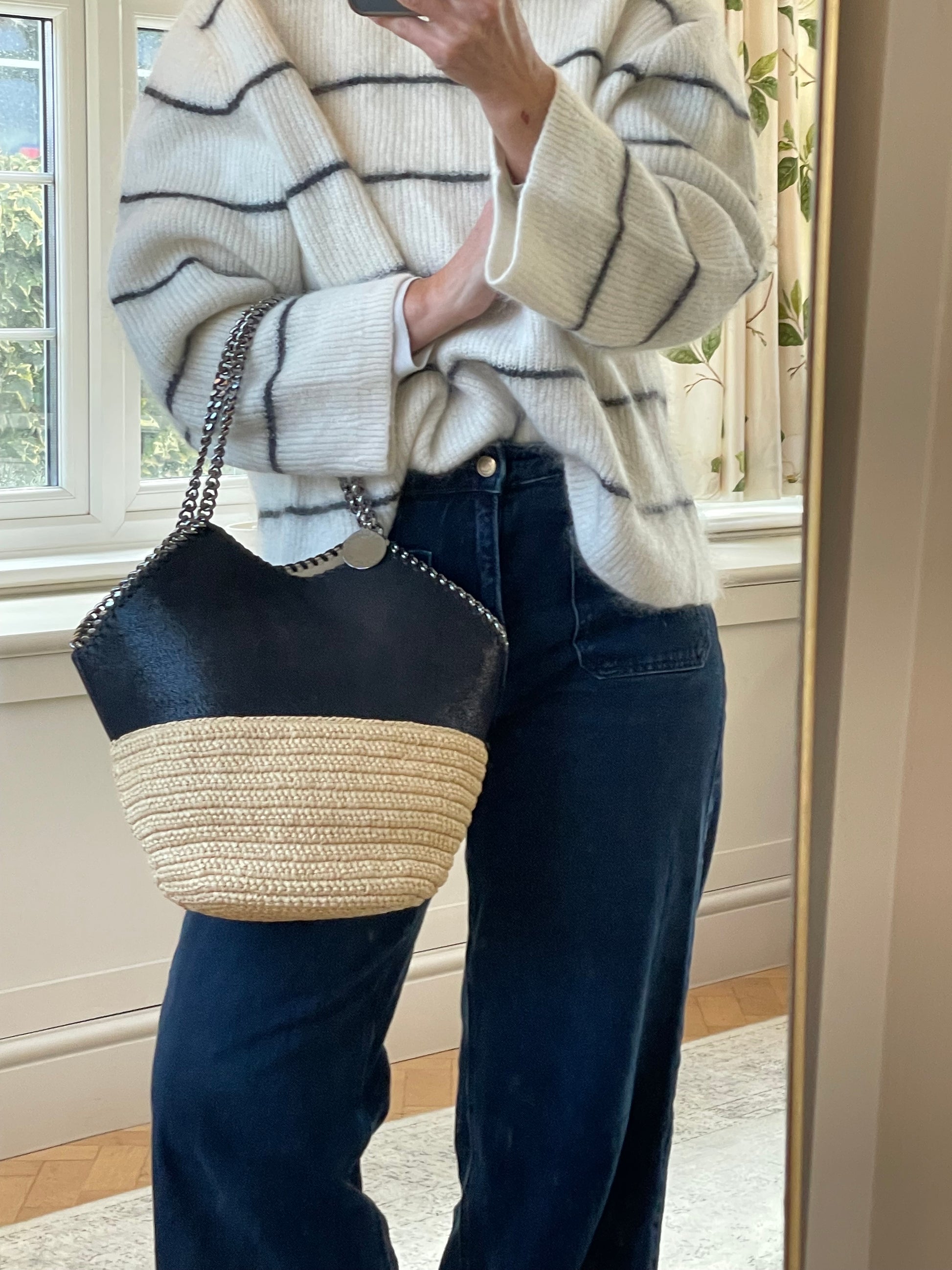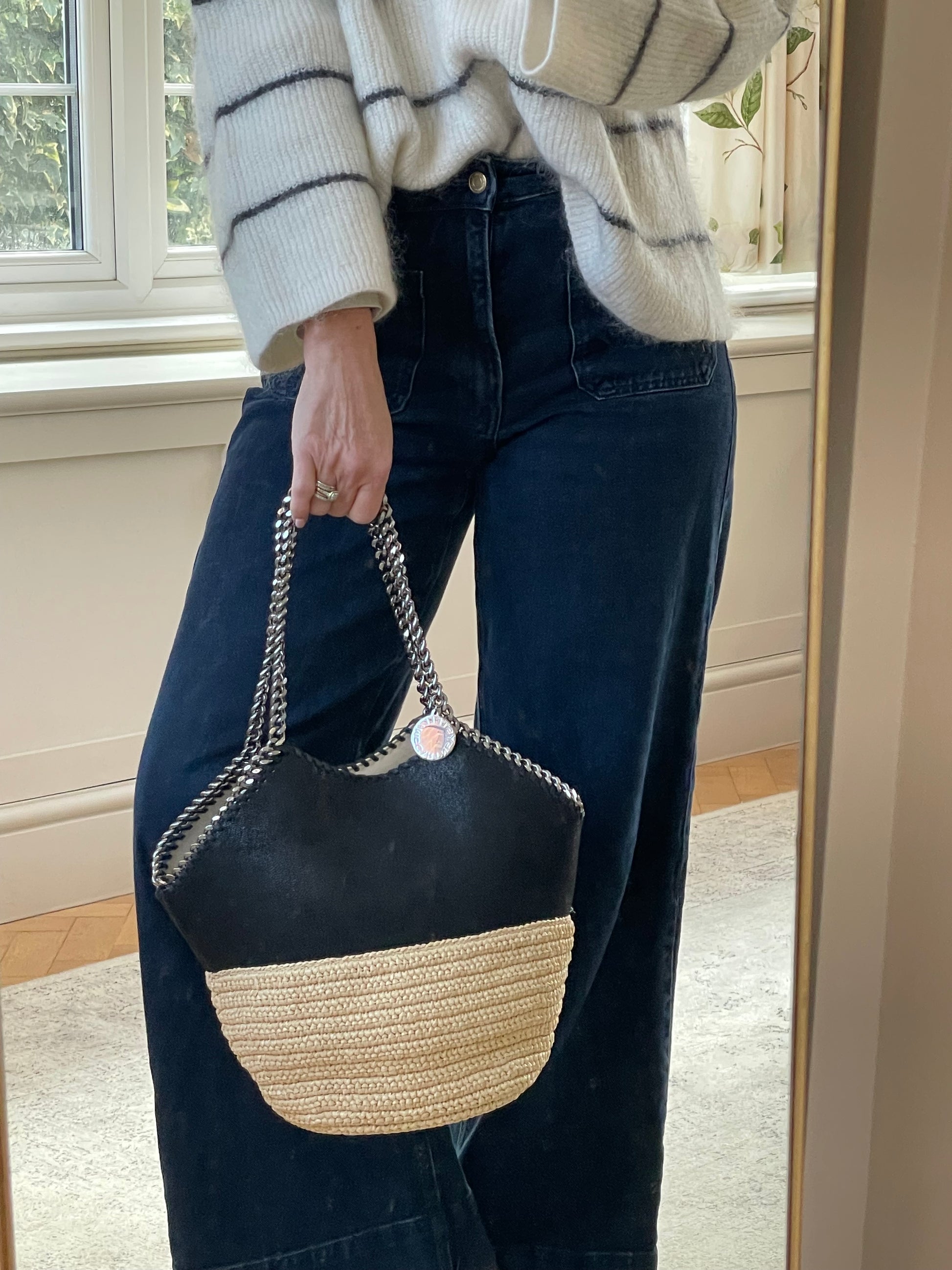 This is a striking and eye catching Stella McCartney Falabella in a textured Vegan Leather And Raffia. This tote bag is in a tactile black and soft cream woven raffia along with shiny goldtone hardware. The shape creates an elegant small tote bag and looks beautiful dressed up or down.