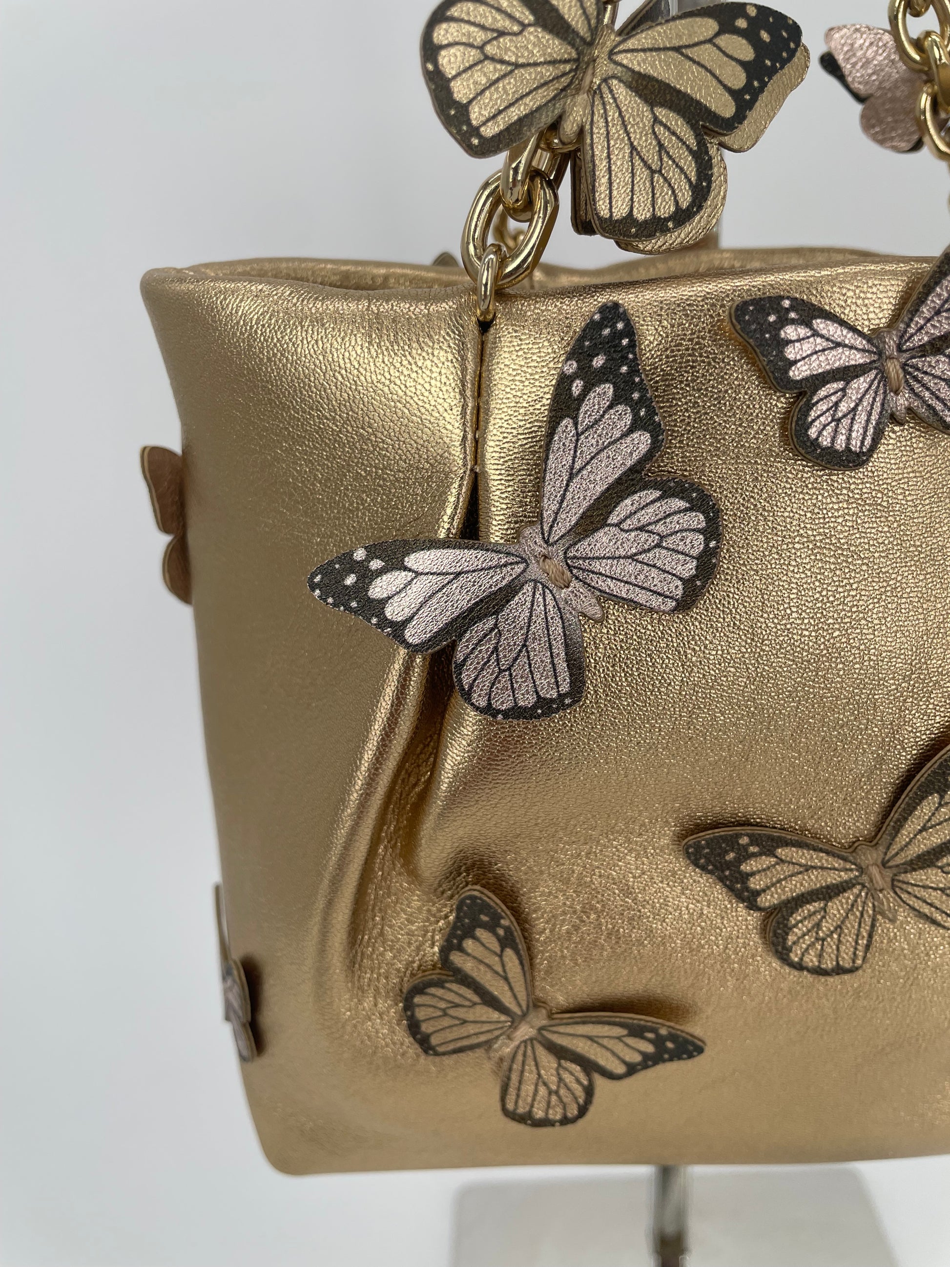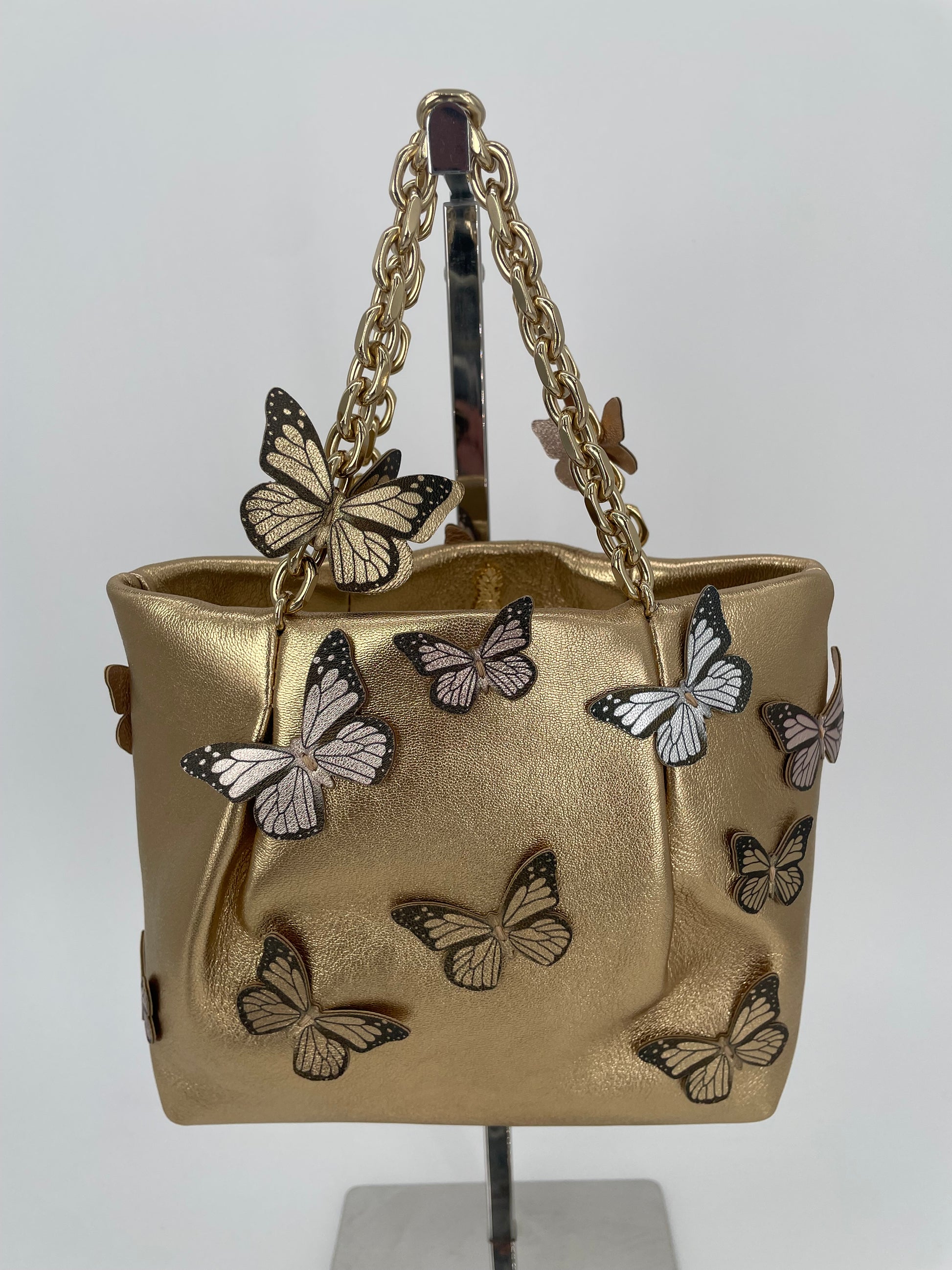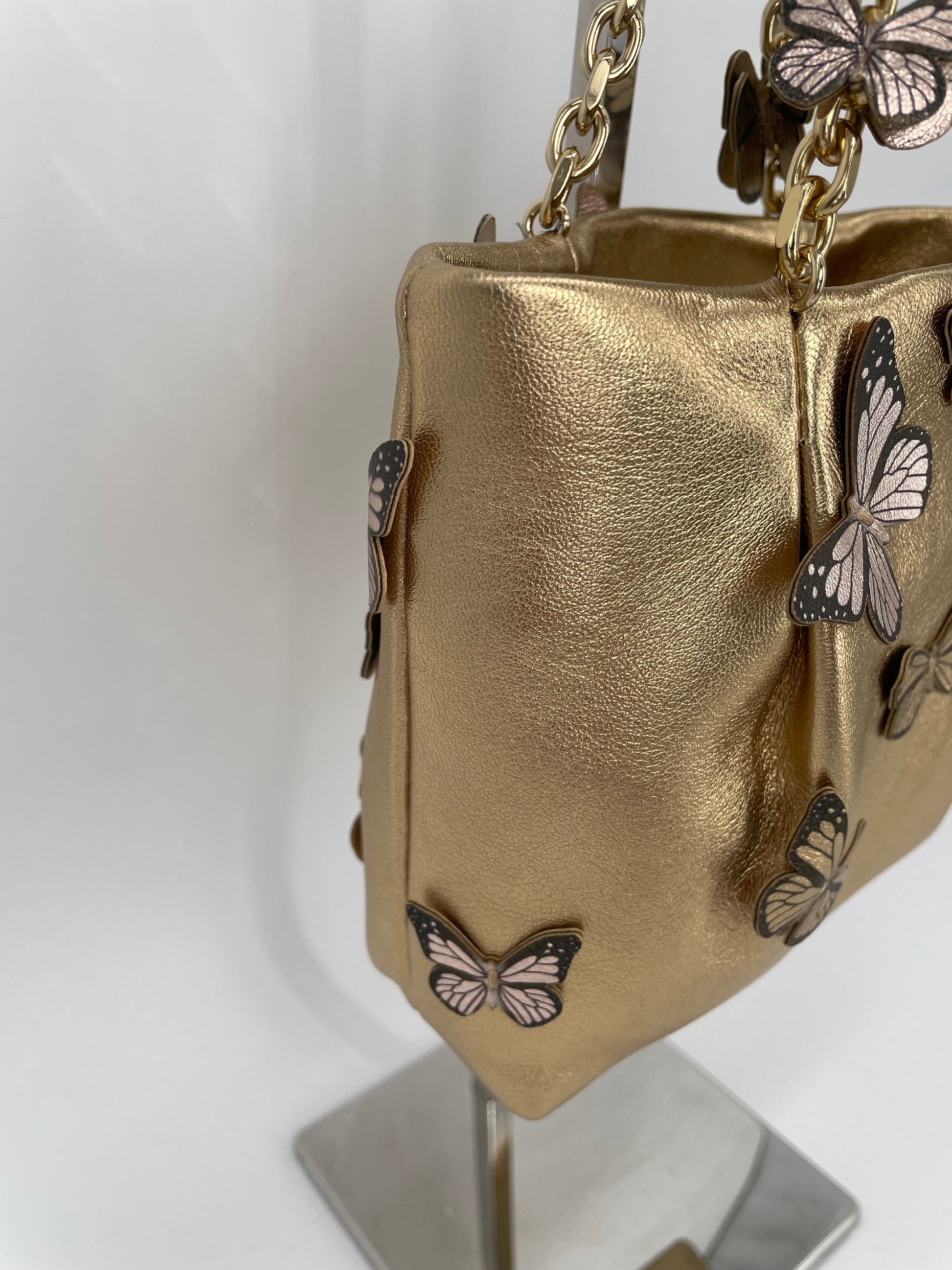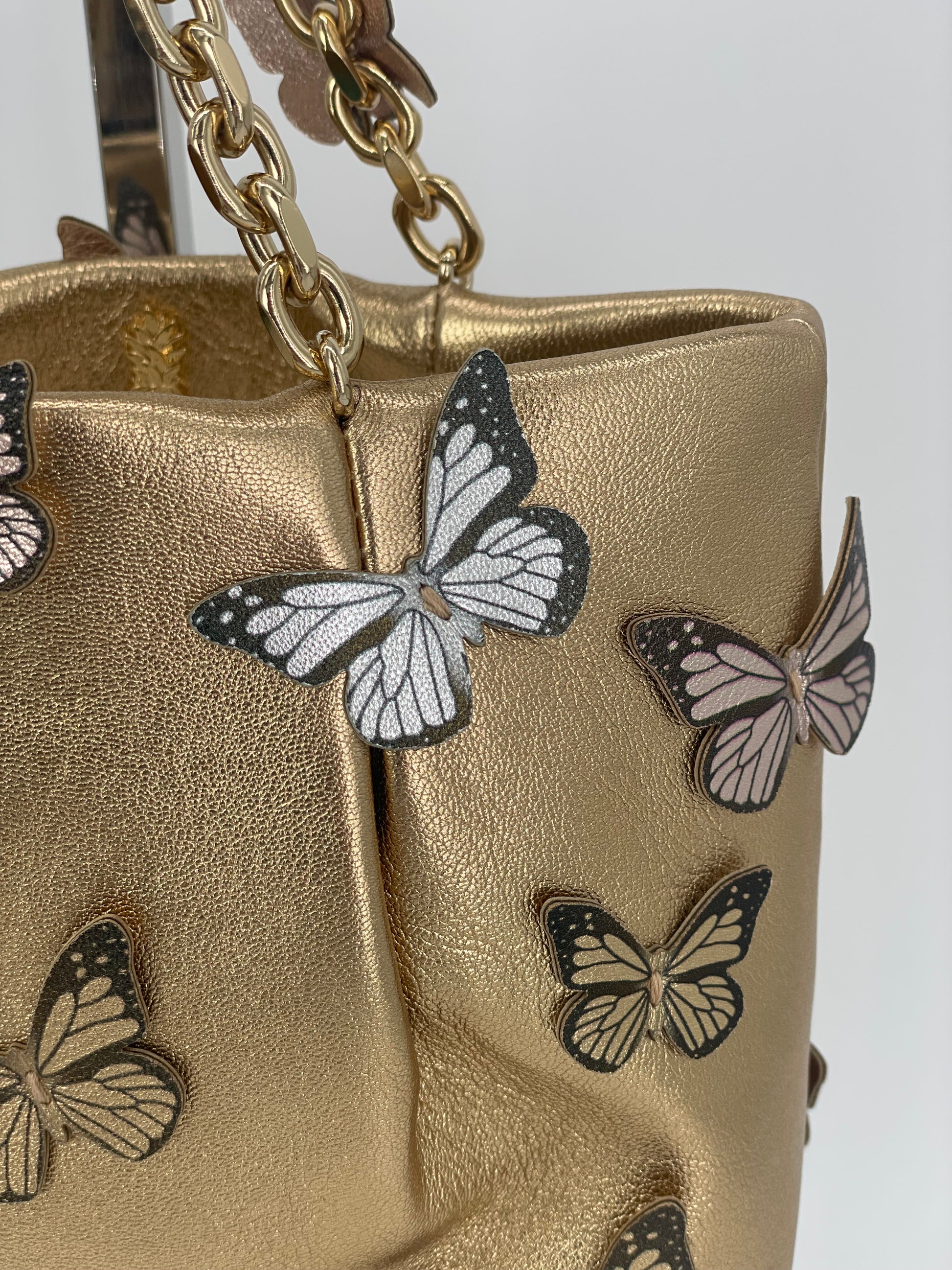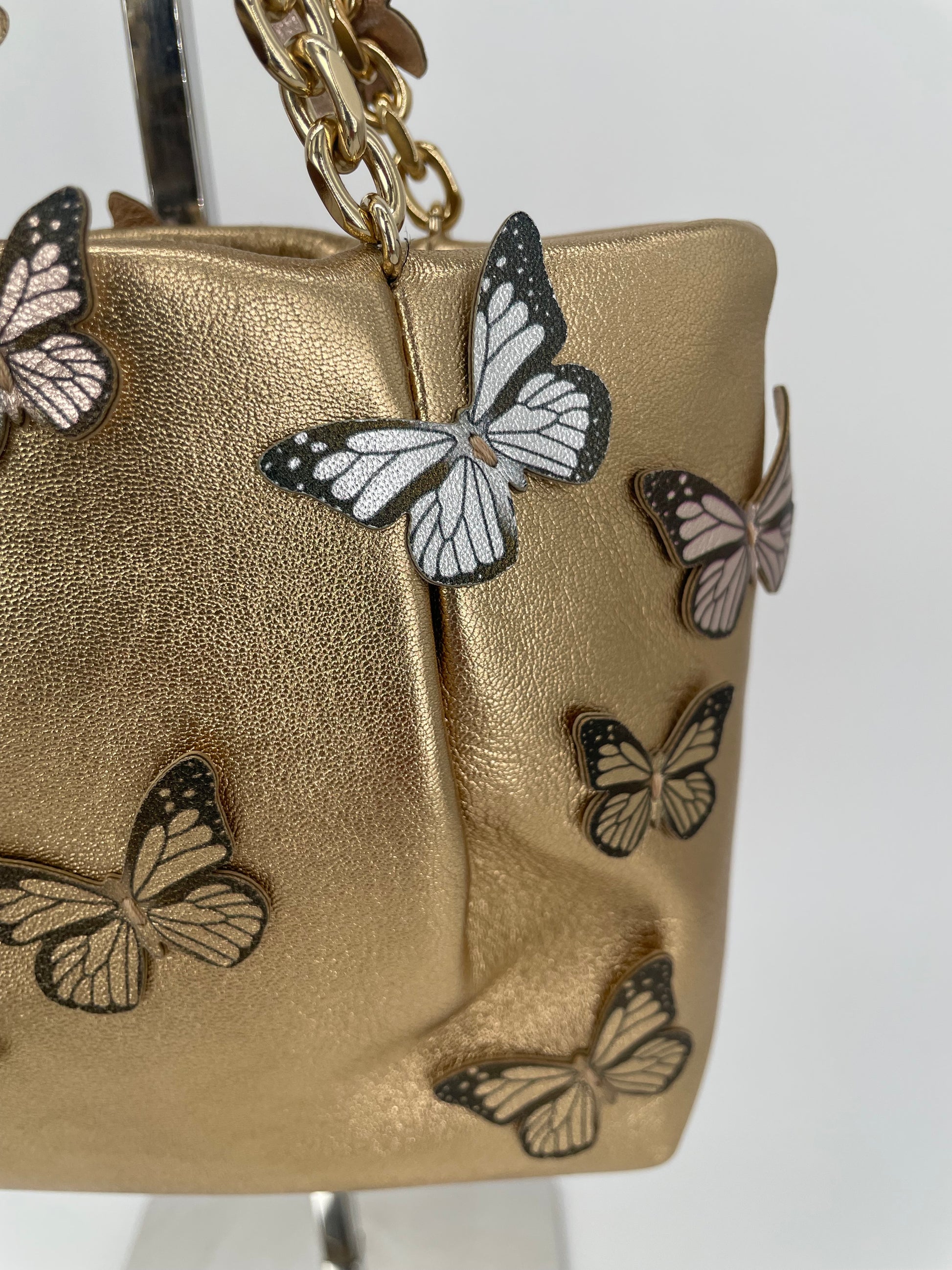 This is an absolutely beautiful Aquazzura, Papillion (Butterfly) mini tote. This soft tote bag is crafted from metallic leather and scattered with pastel-toned butterflies, bringing a whimsical feel to a timeless shape. The delicate, carefully crafted butterflies create a bag that is also most a piece of art. This bag is made from soft leather with a tonal chain top handles.