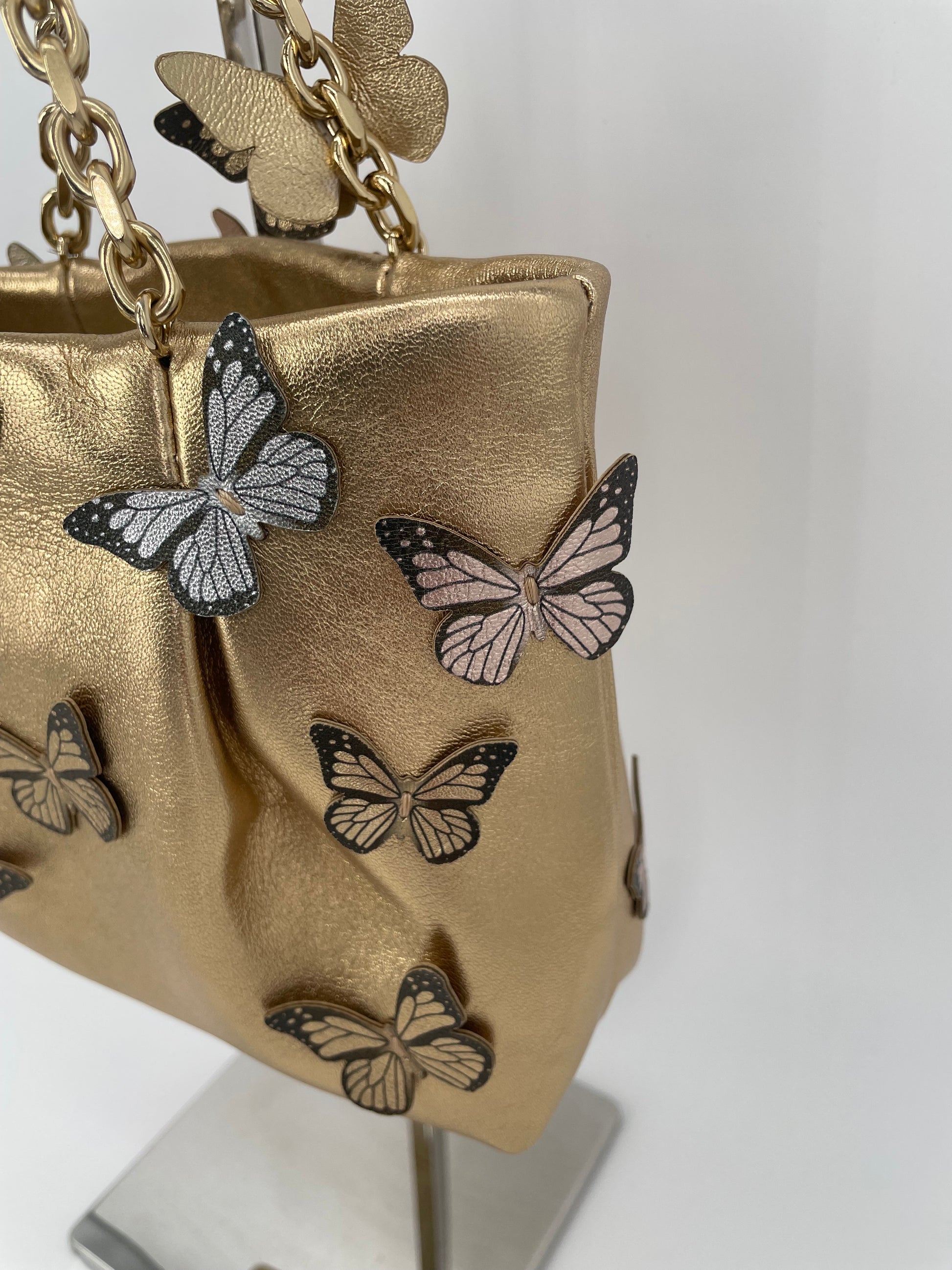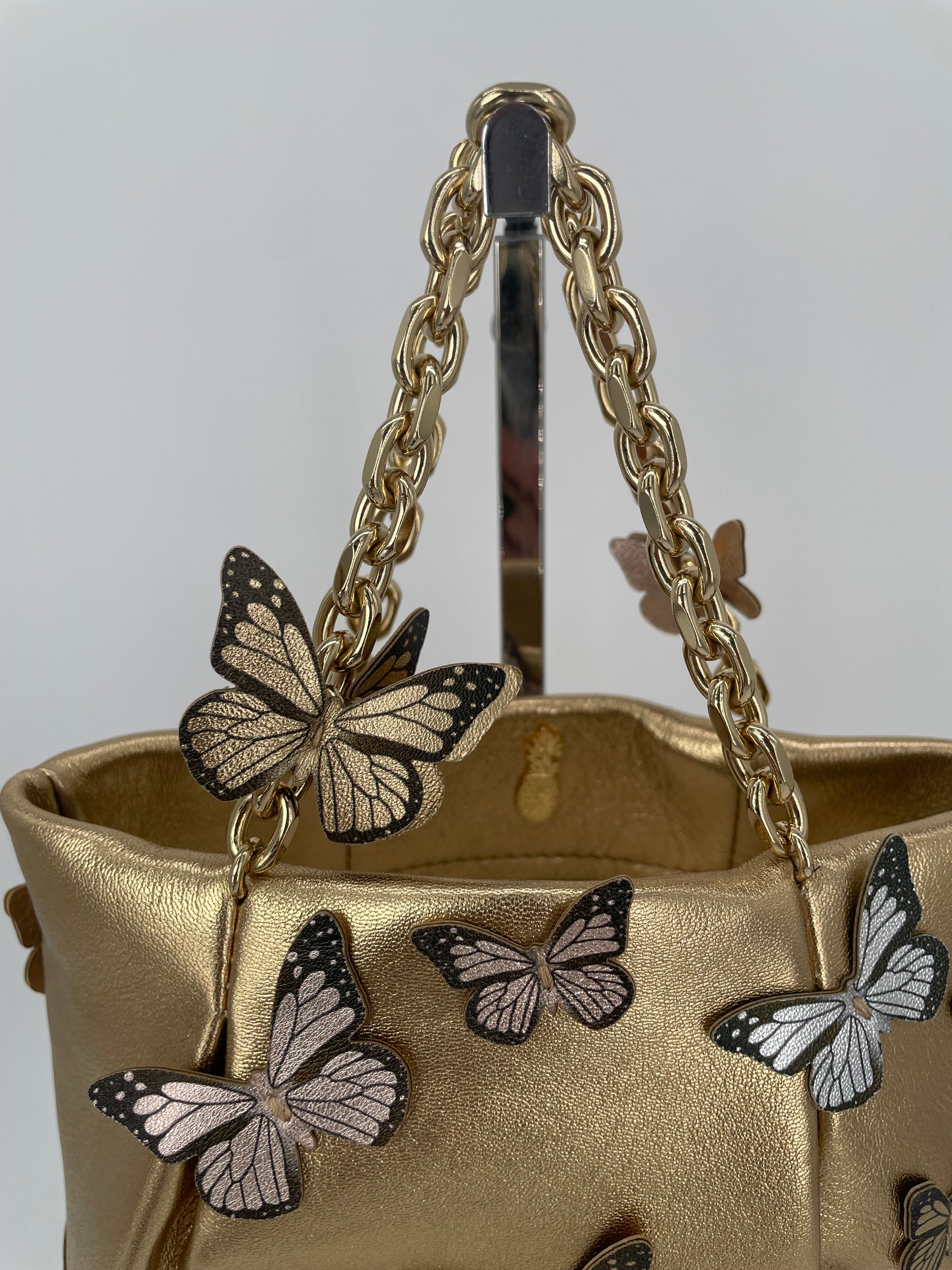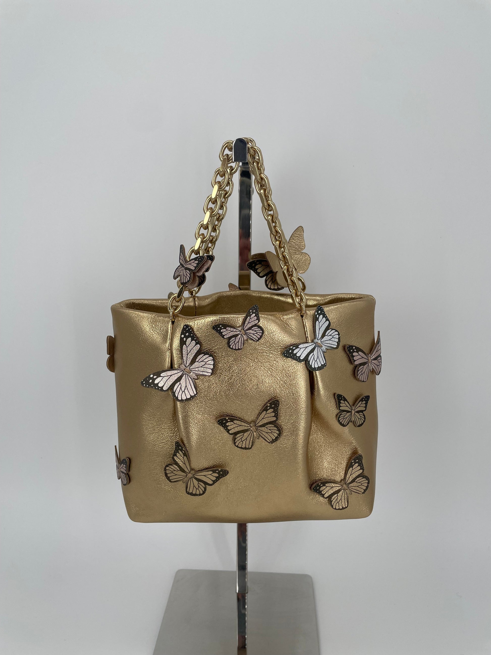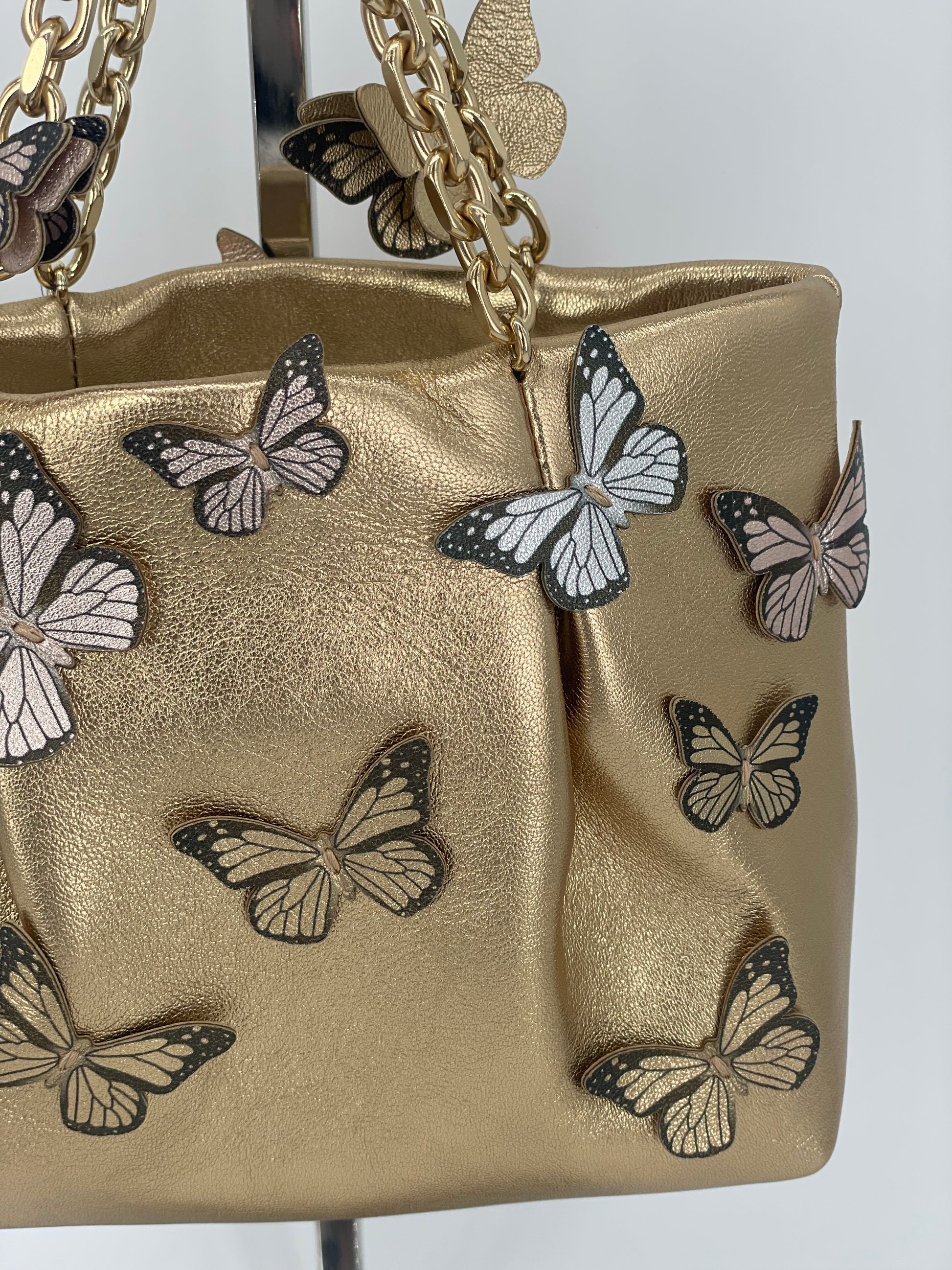 This is an absolutely beautiful Aquazzura, Papillion (Butterfly) mini tote. This soft tote bag is crafted from metallic leather and scattered with pastel-toned butterflies, bringing a whimsical feel to a timeless shape. The delicate, carefully crafted butterflies create a bag that is also most a piece of art. This bag is made from soft leather with a tonal chain top handles.