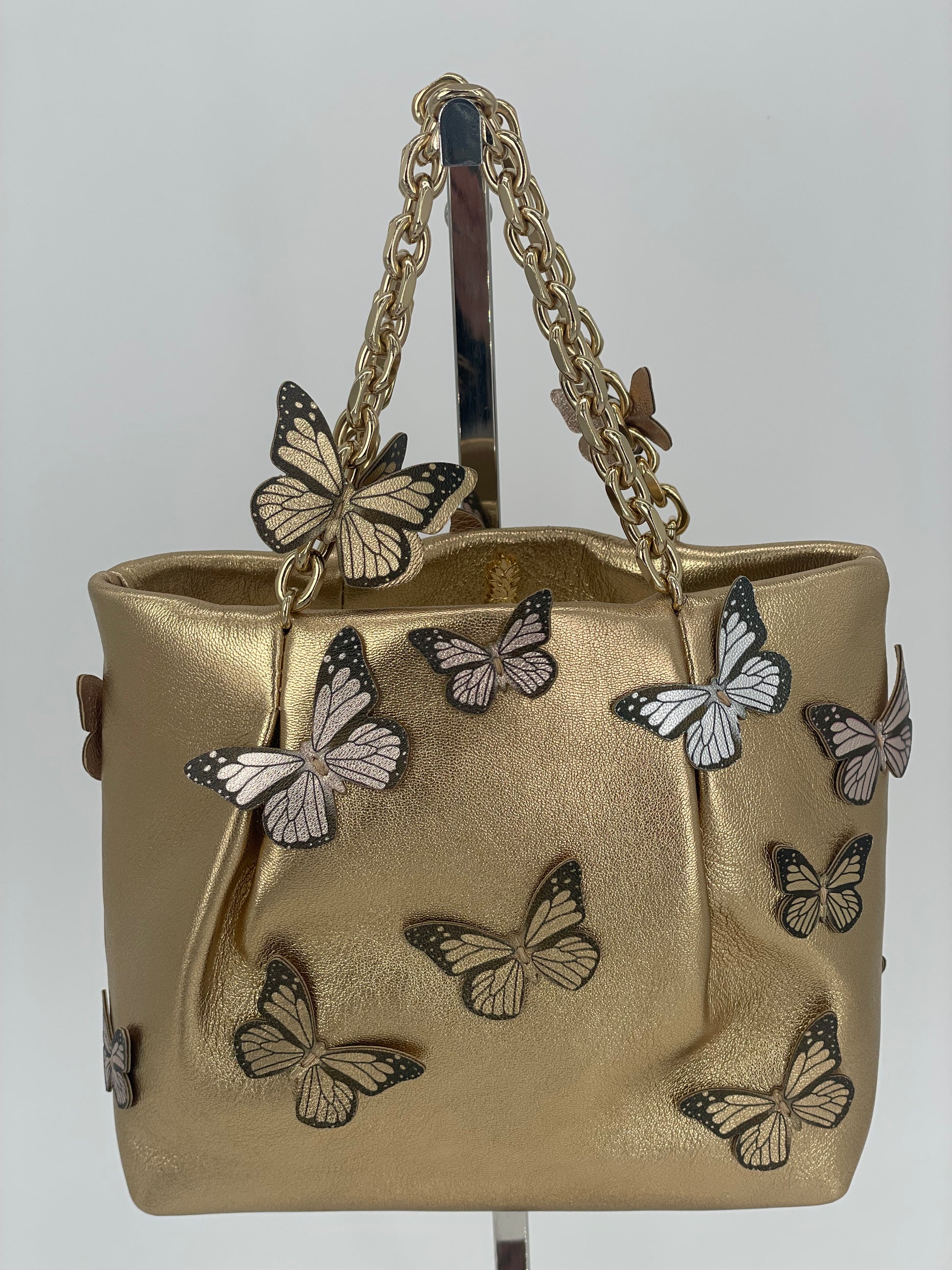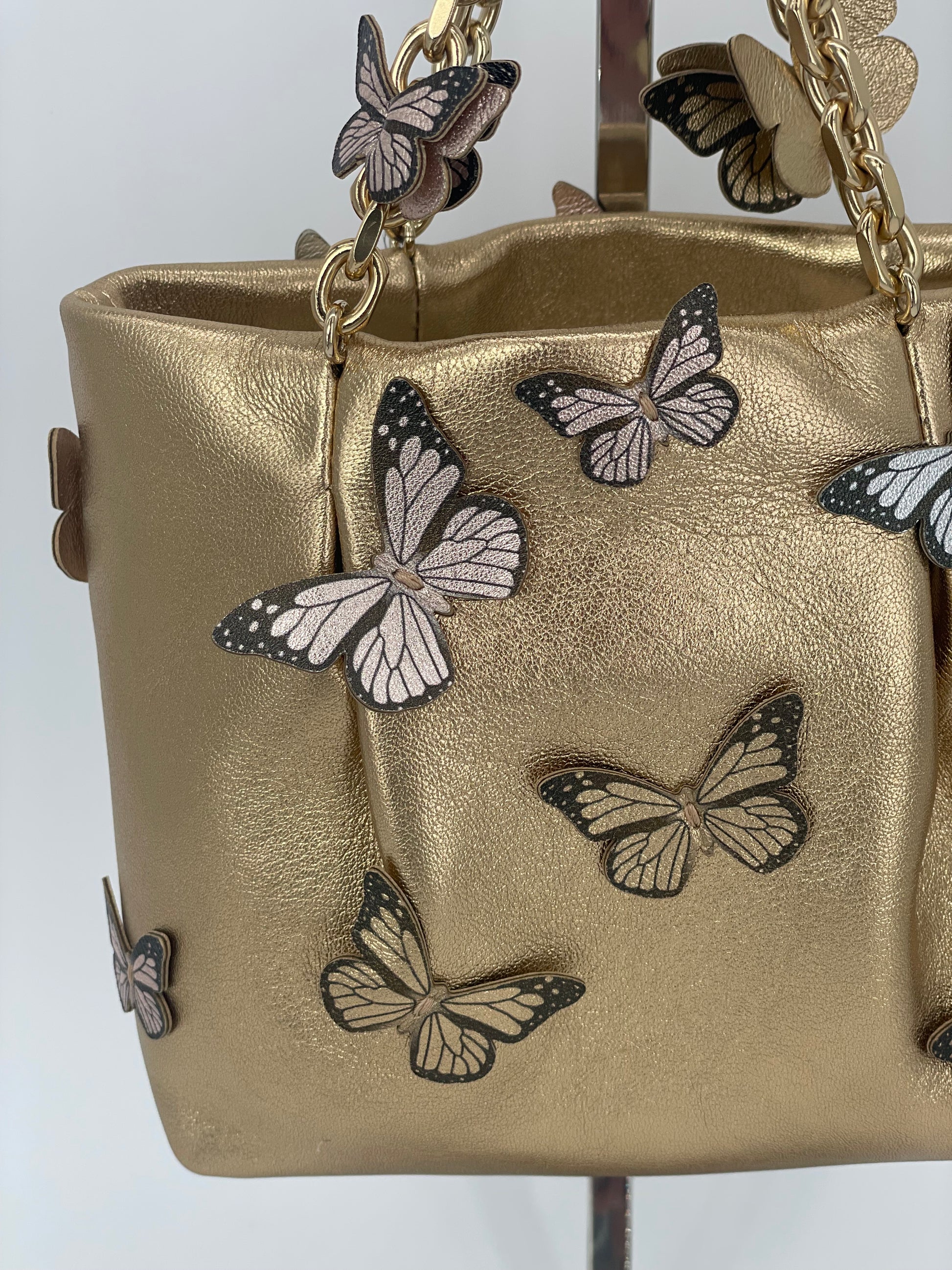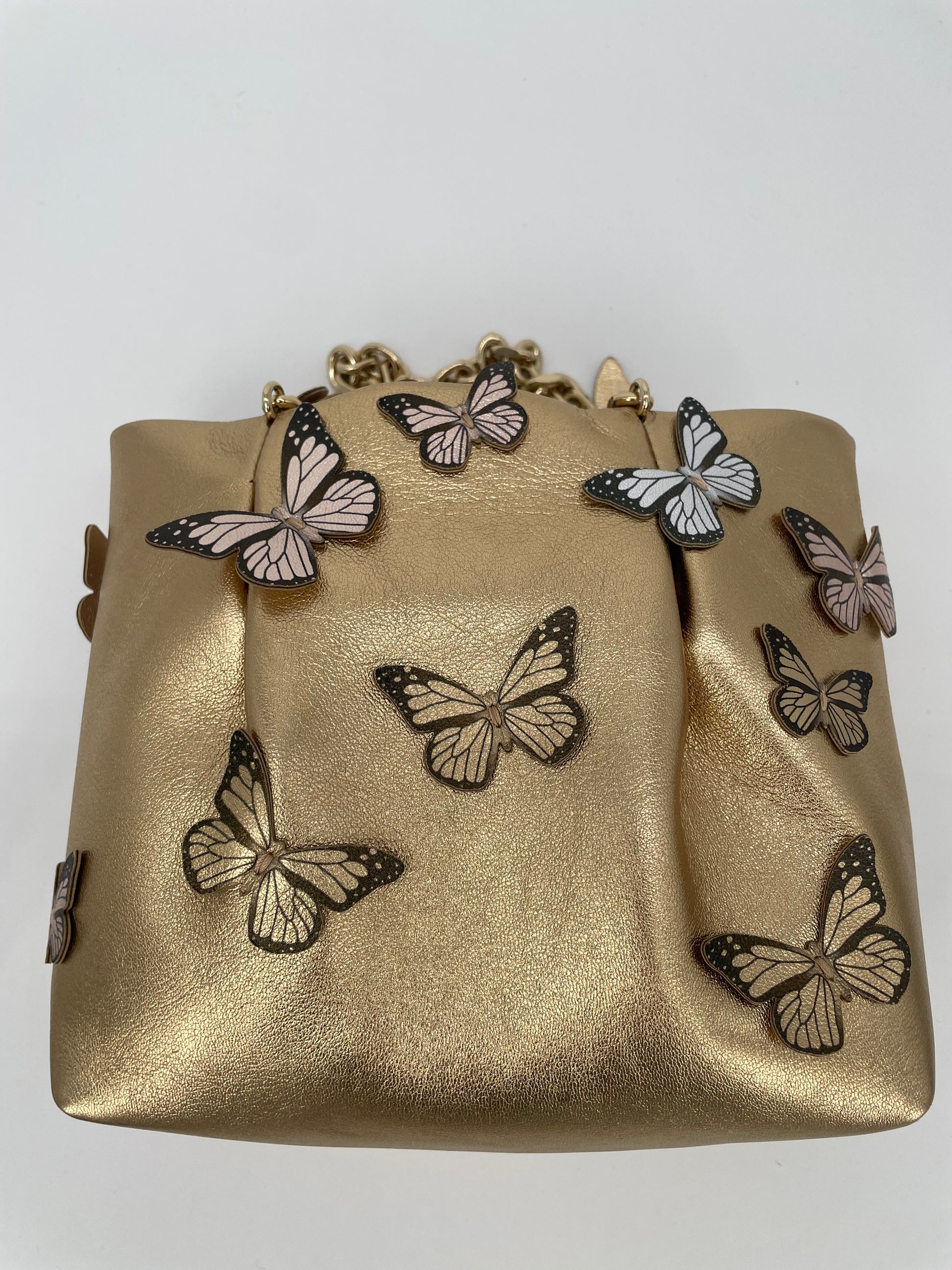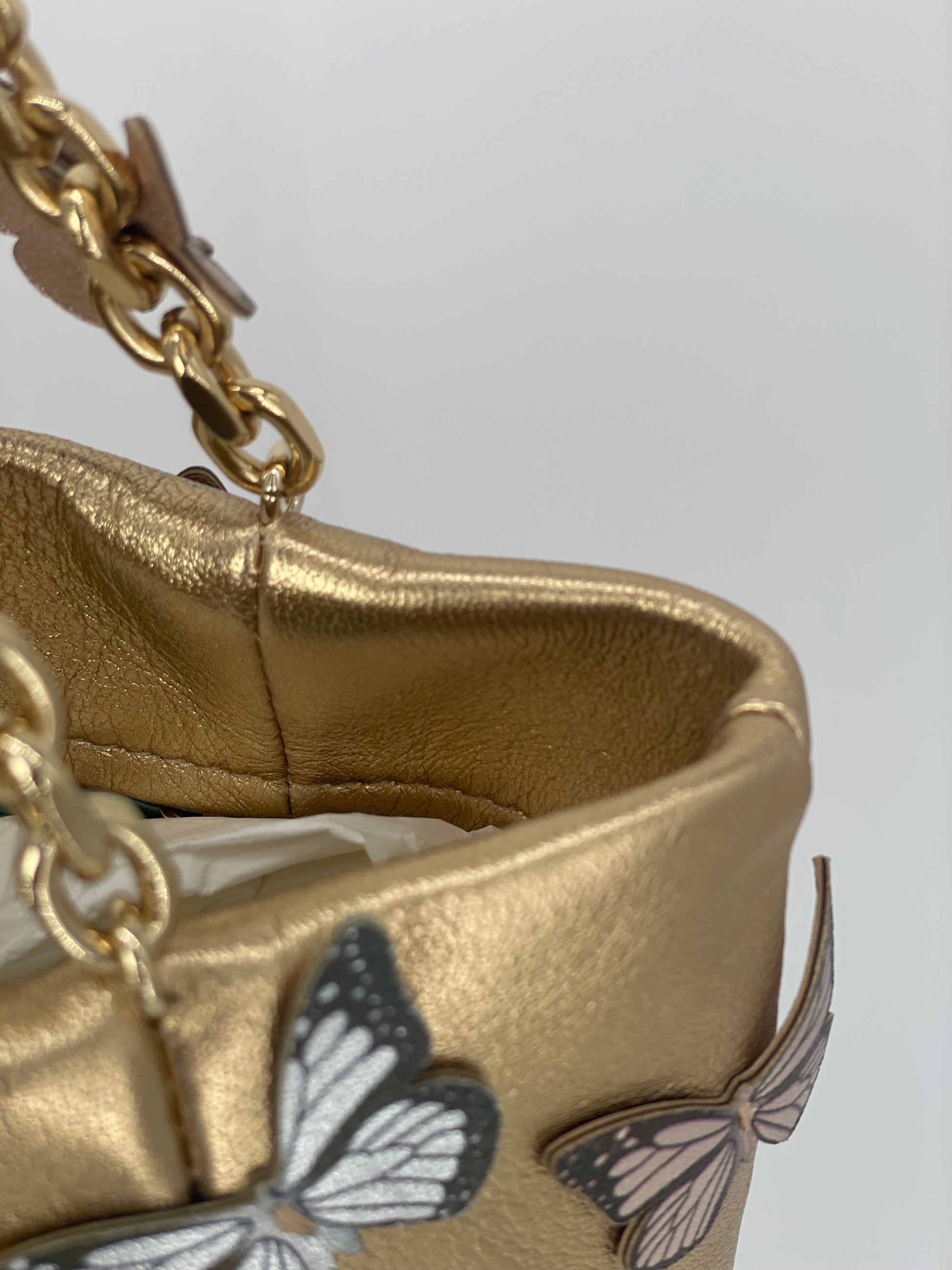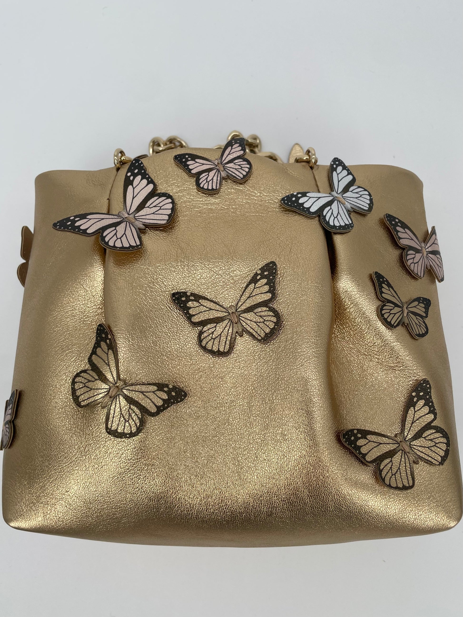 This is an absolutely beautiful Aquazzura, Papillion (Butterfly) mini tote. This soft tote bag is crafted from metallic leather and scattered with pastel-toned butterflies, bringing a whimsical feel to a timeless shape. The delicate, carefully crafted butterflies create a bag that is also most a piece of art. This bag is made from soft leather with a tonal chain top handles.