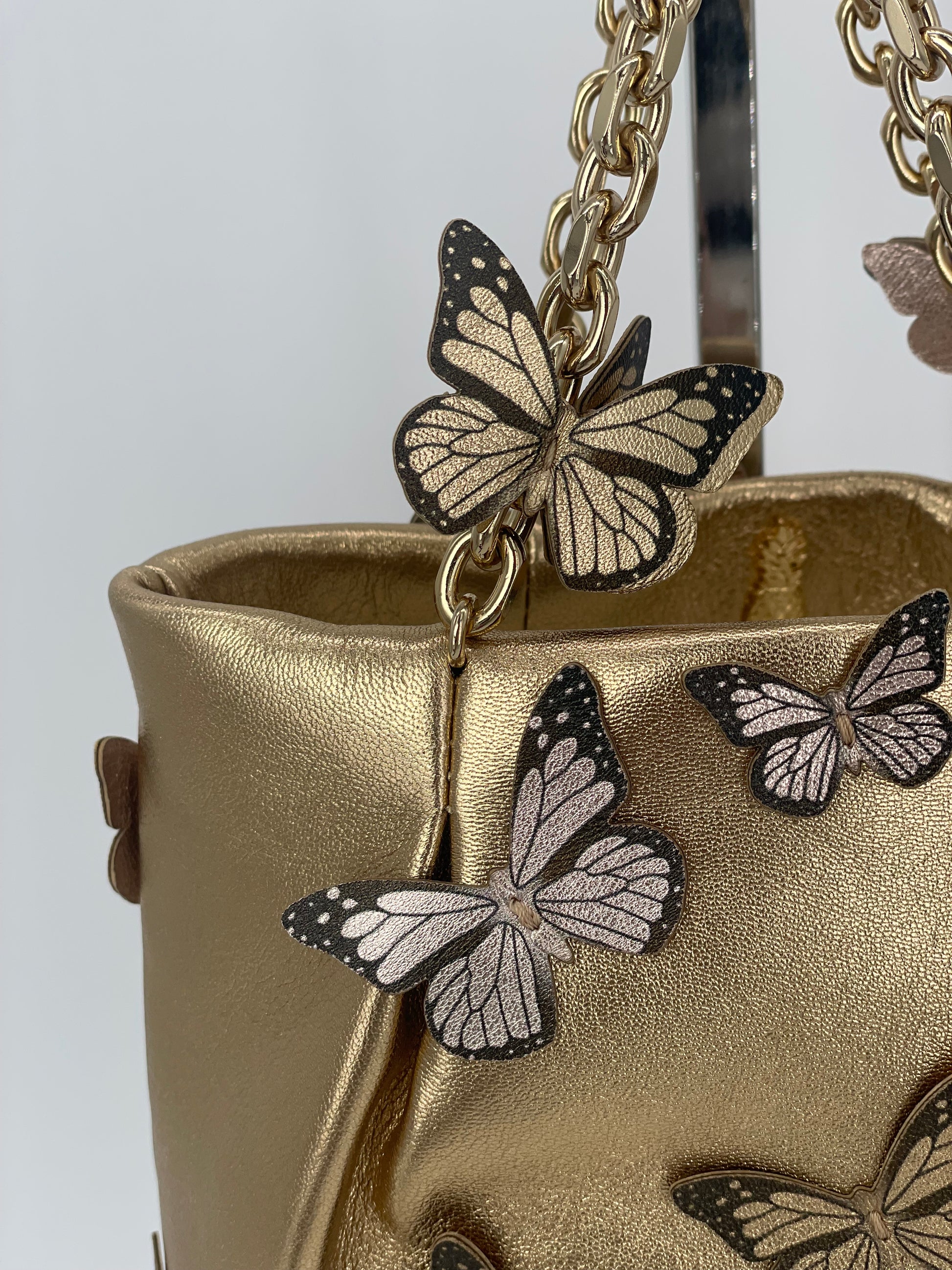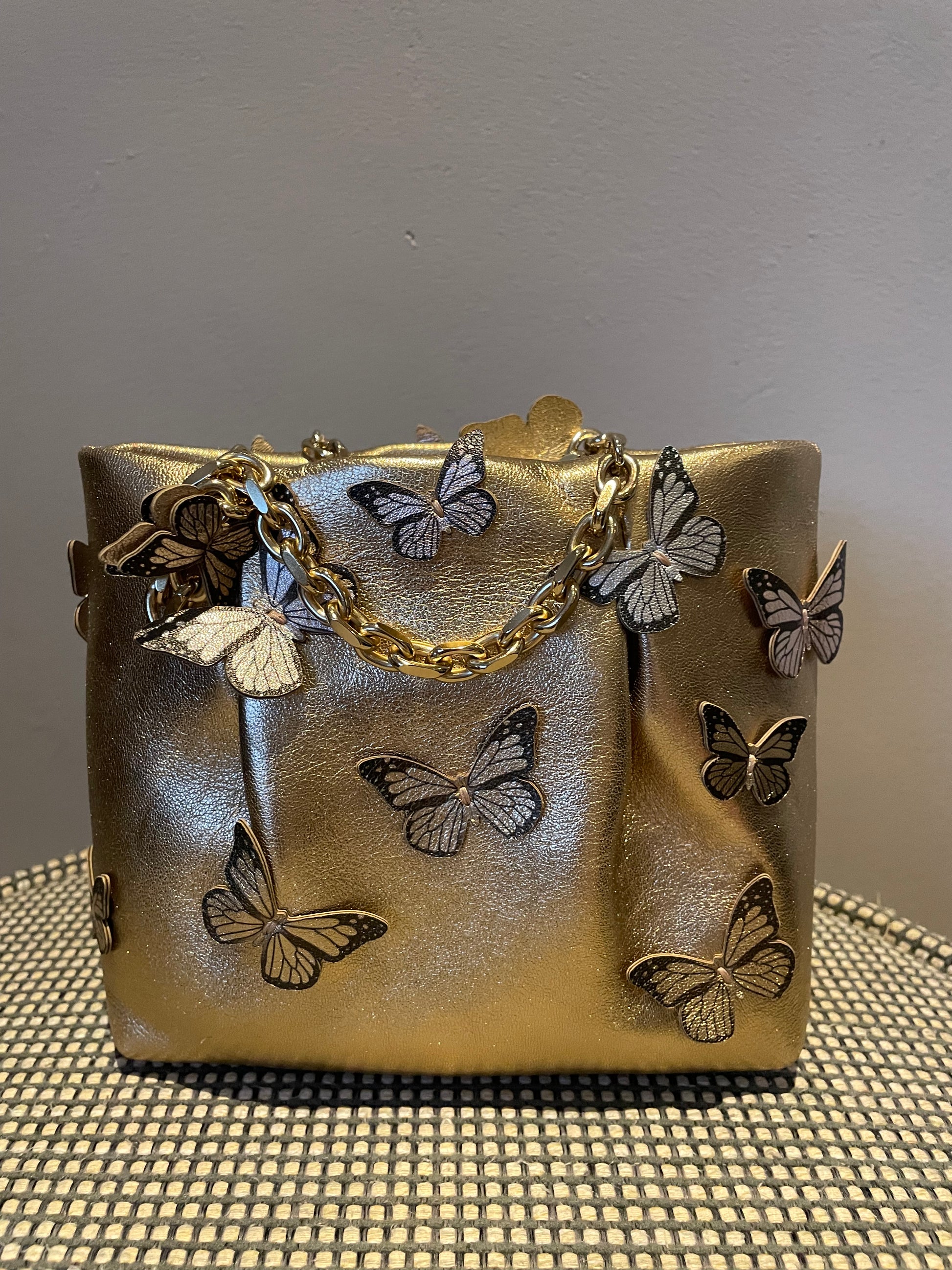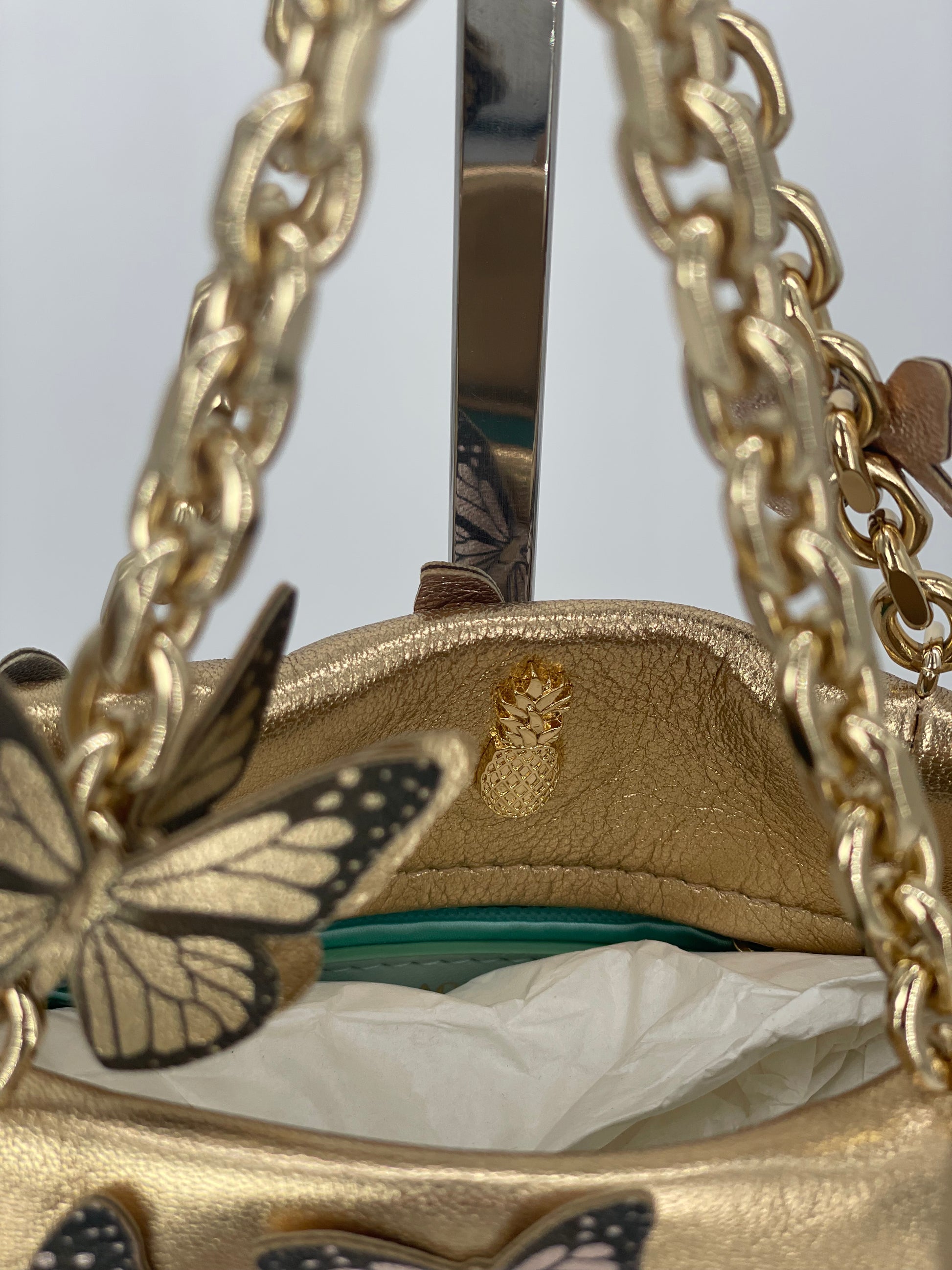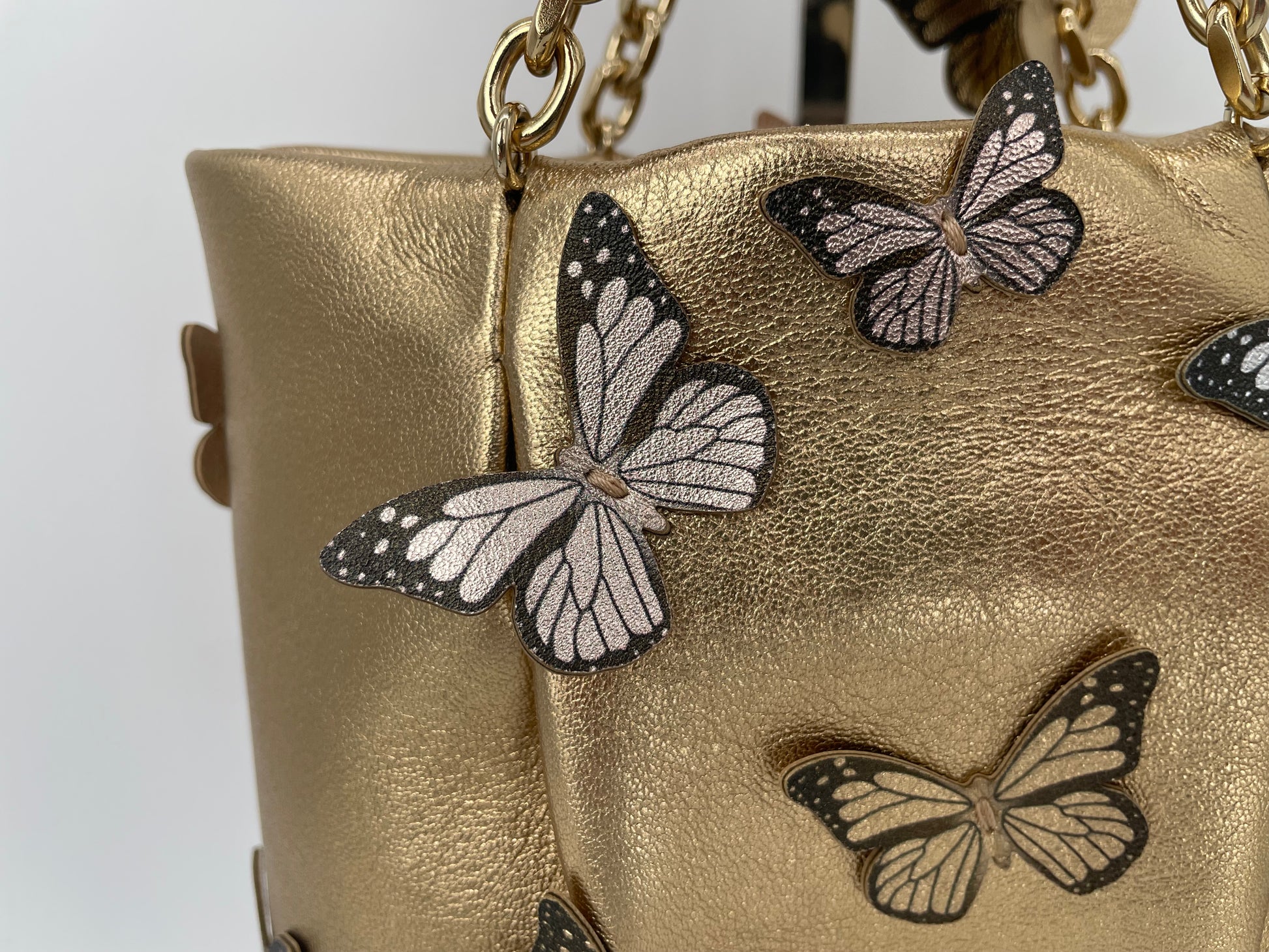 This is an absolutely beautiful Aquazzura, Papillion (Butterfly) mini tote. This soft tote bag is crafted from metallic leather and scattered with pastel-toned butterflies, bringing a whimsical feel to a timeless shape. The delicate, carefully crafted butterflies create a bag that is also most a piece of art. This bag is made from soft leather with a tonal chain top handles.