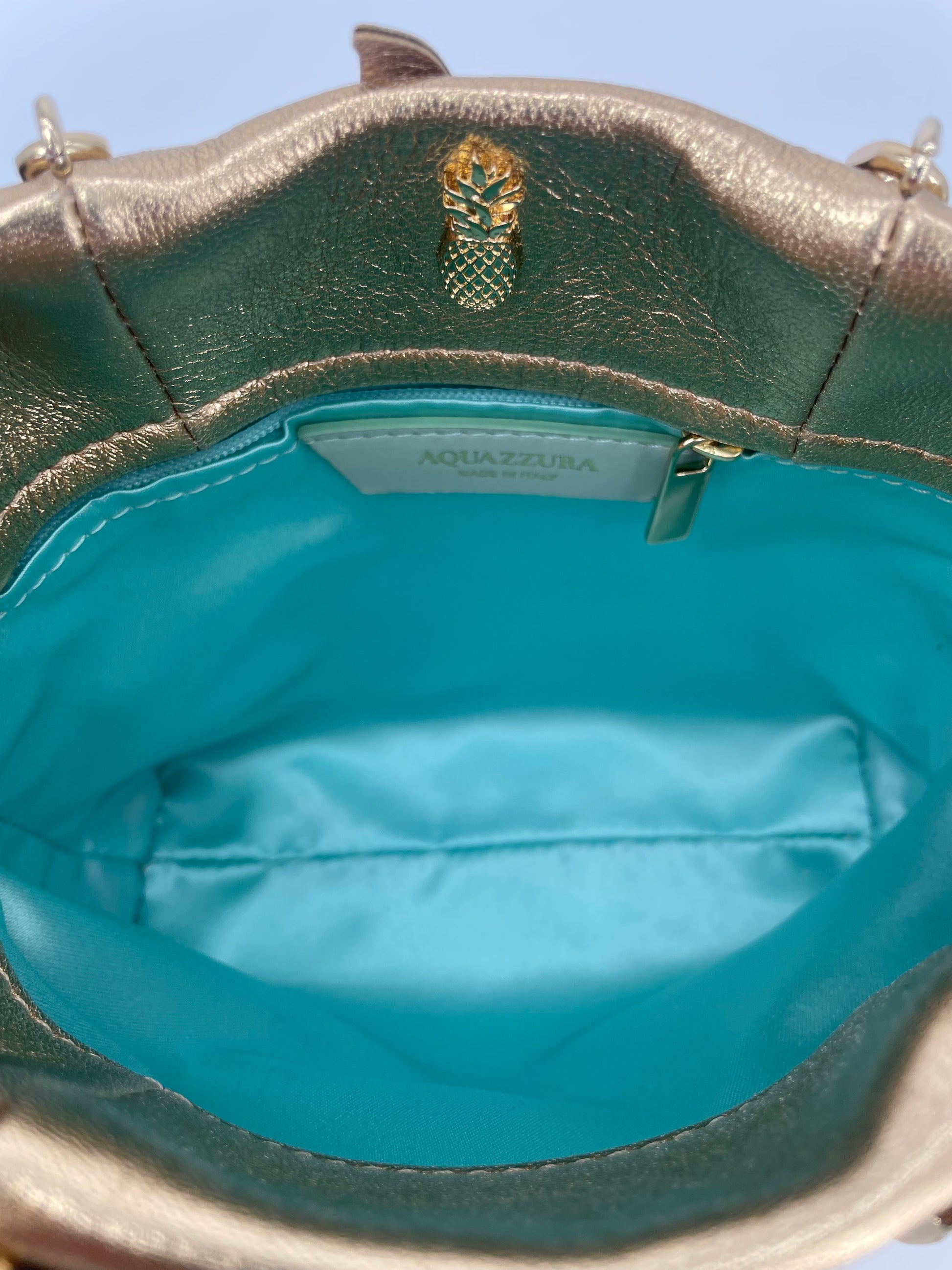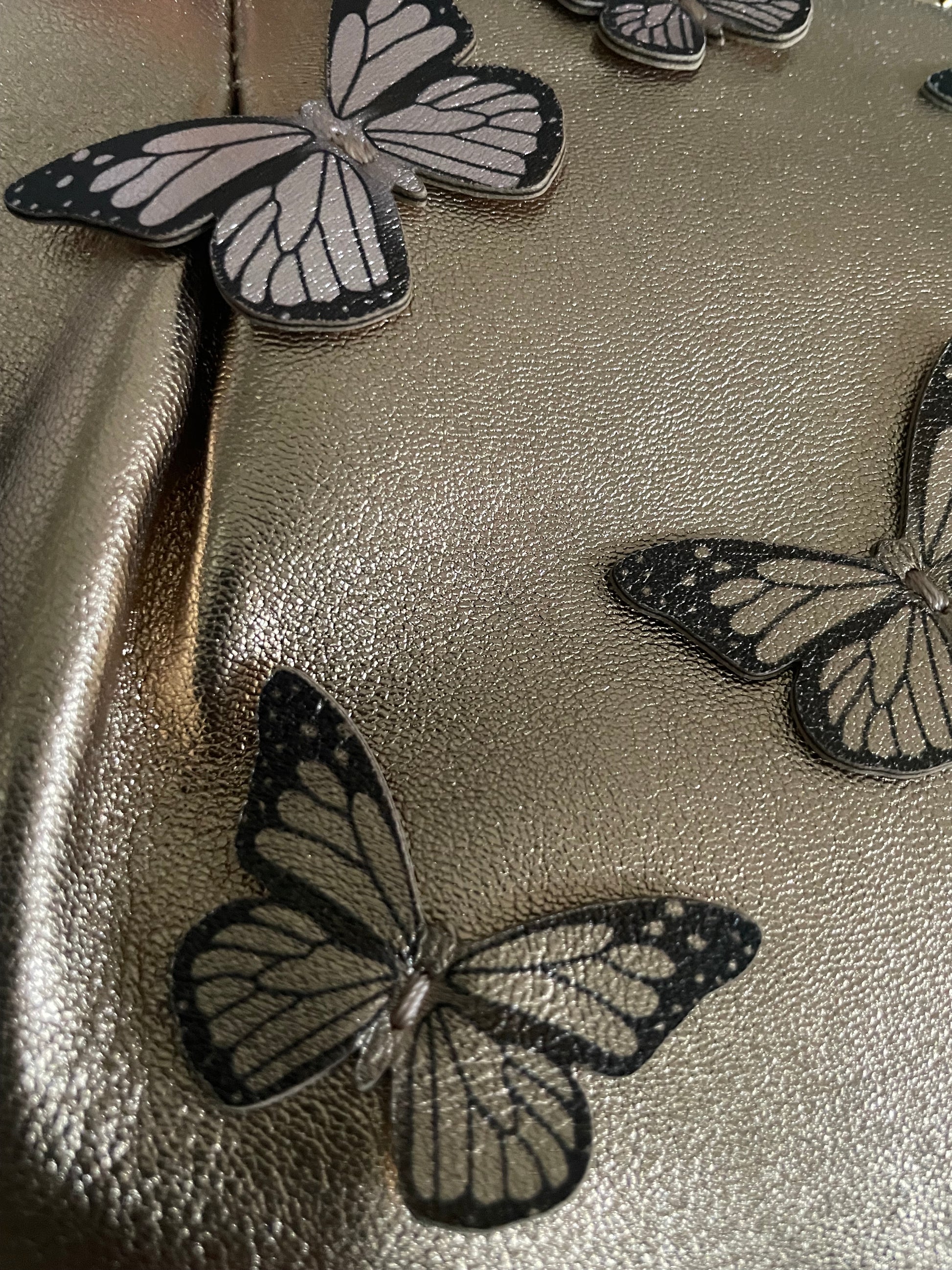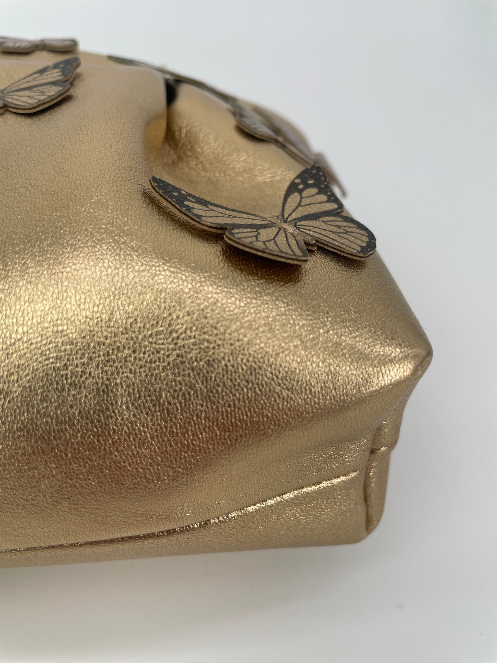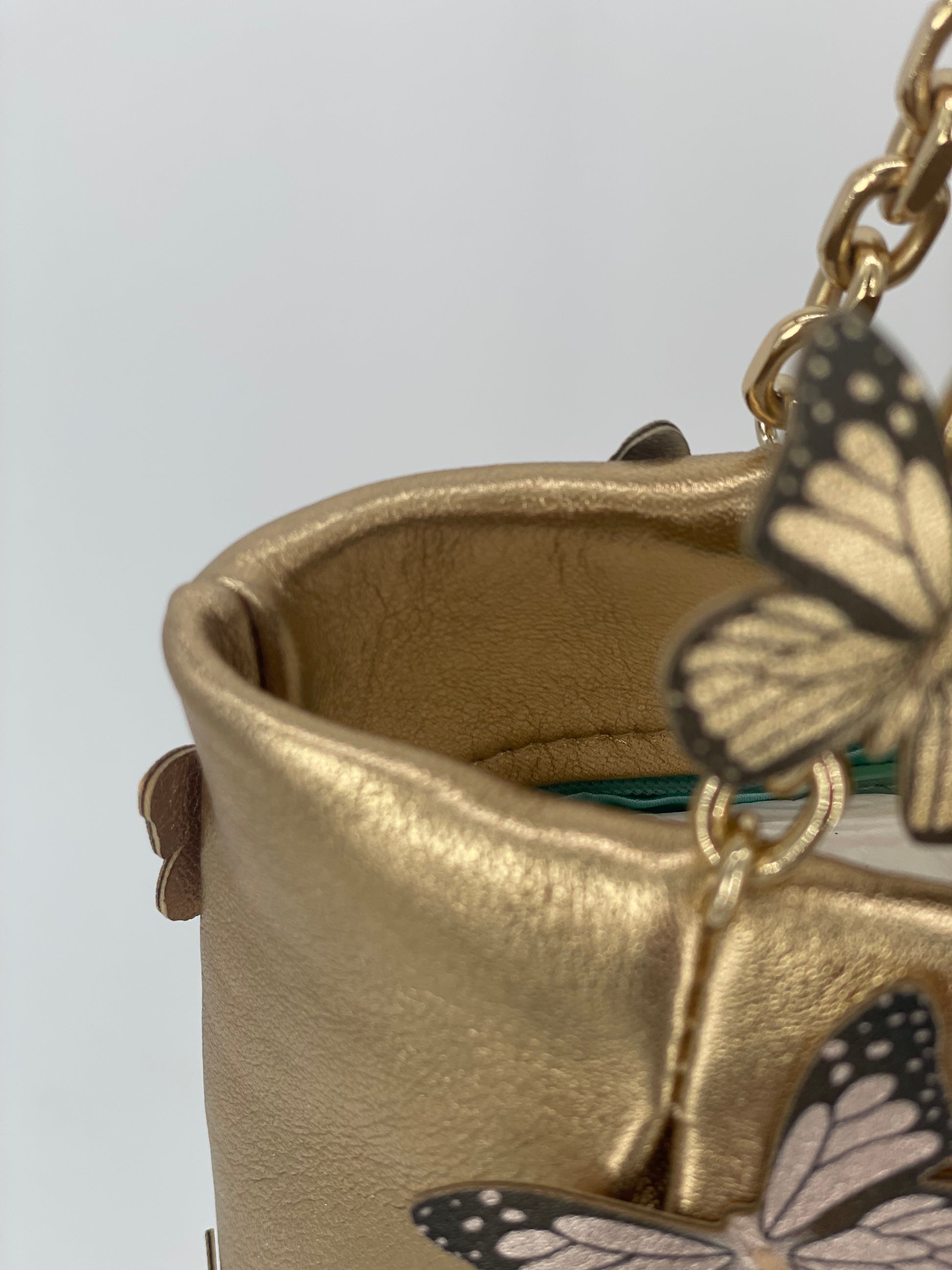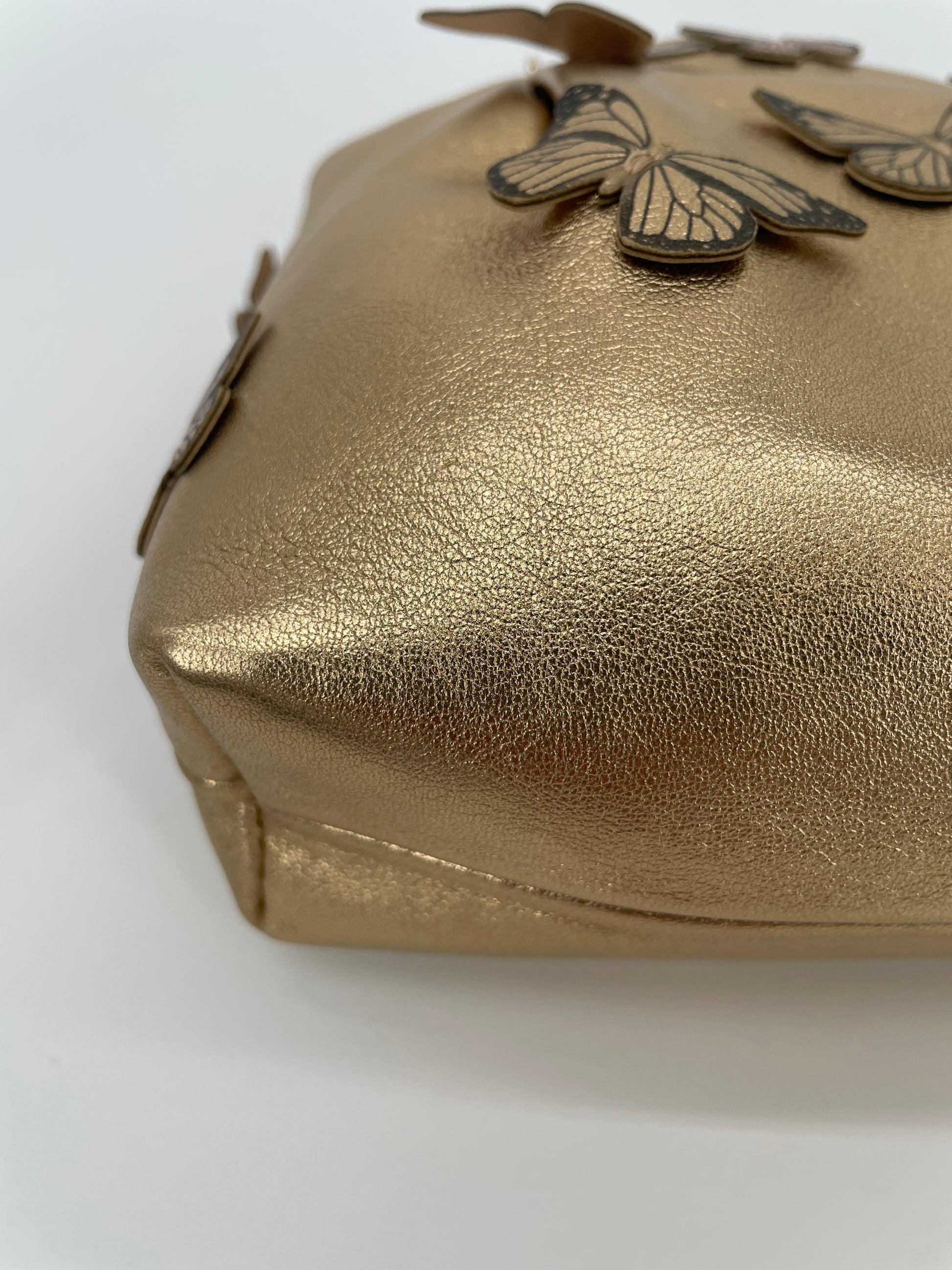 This is an absolutely beautiful Aquazzura, Papillion (Butterfly) mini tote. This soft tote bag is crafted from metallic leather and scattered with pastel-toned butterflies, bringing a whimsical feel to a timeless shape. The delicate, carefully crafted butterflies create a bag that is also most a piece of art. This bag is made from soft leather with a tonal chain top handles.