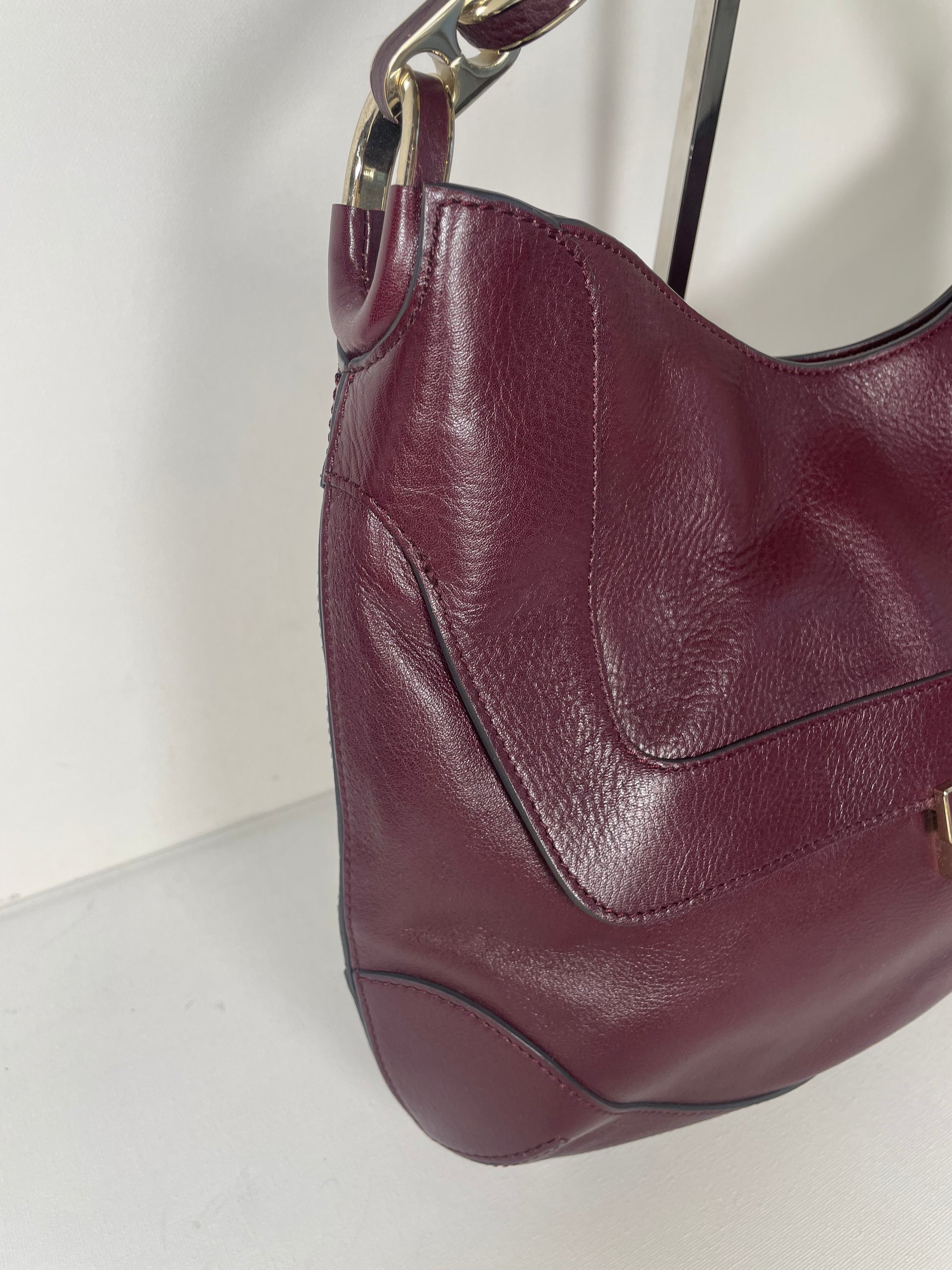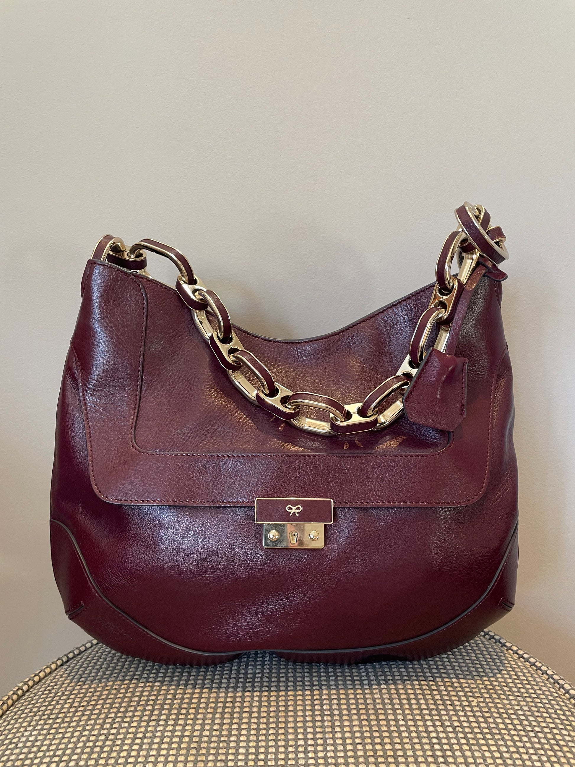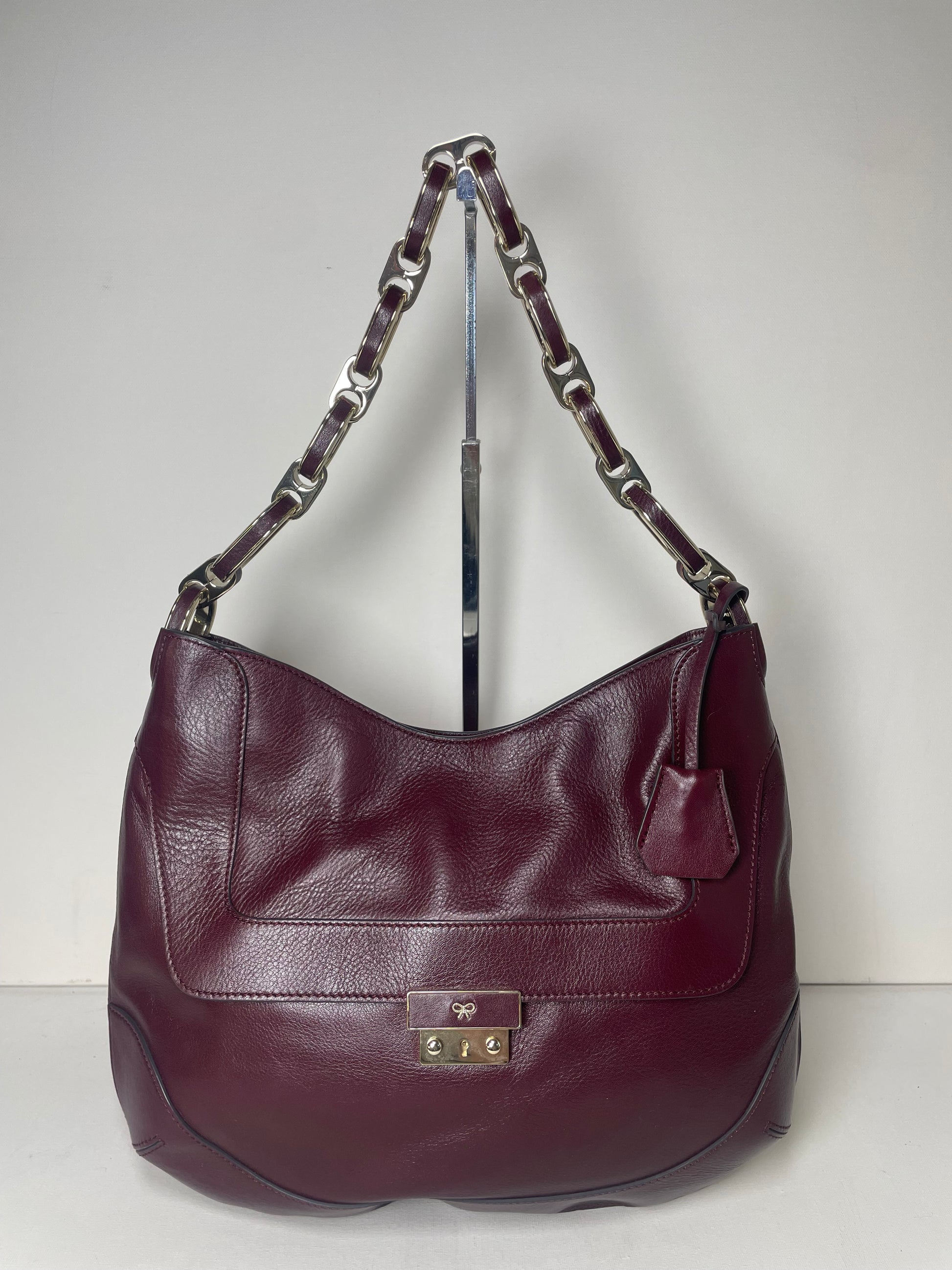 This is a robust and beautifully made Anya Hindmarch medium Berwick Hobo. This shoulder bag is made from glossy leather in a deep wine colour with light goldtone hardware. There is a front pocket that is opened with a push lock and the top main compartment is secured with magnetic closure. Inside there is a secure zip close pocket along with open slip pockets. The chain link carry strap is goldtone with leather detailing.