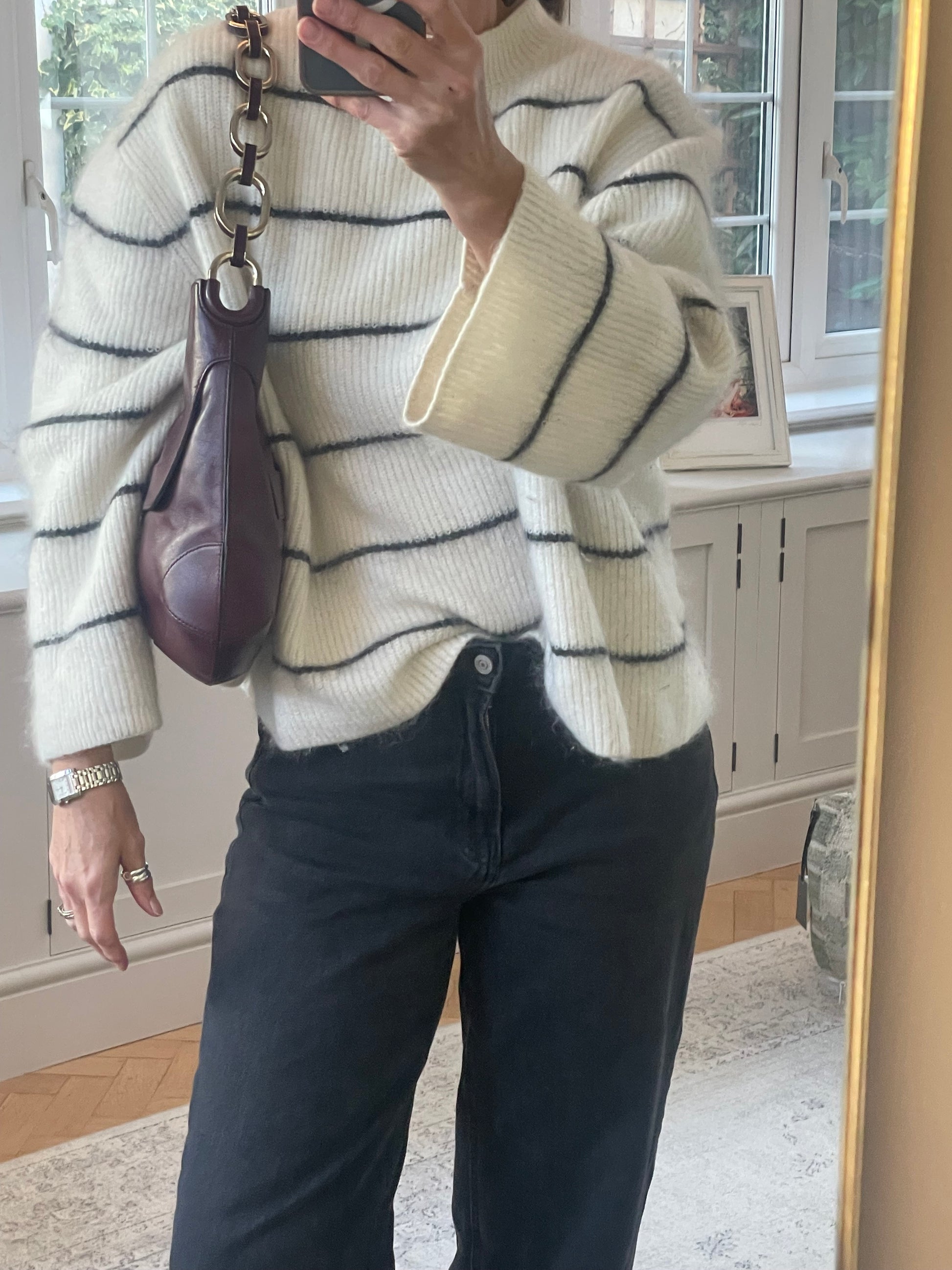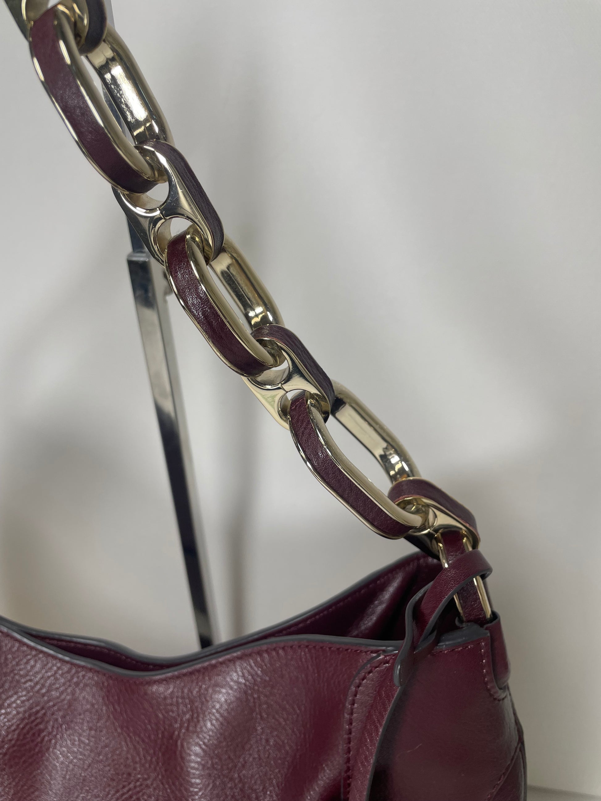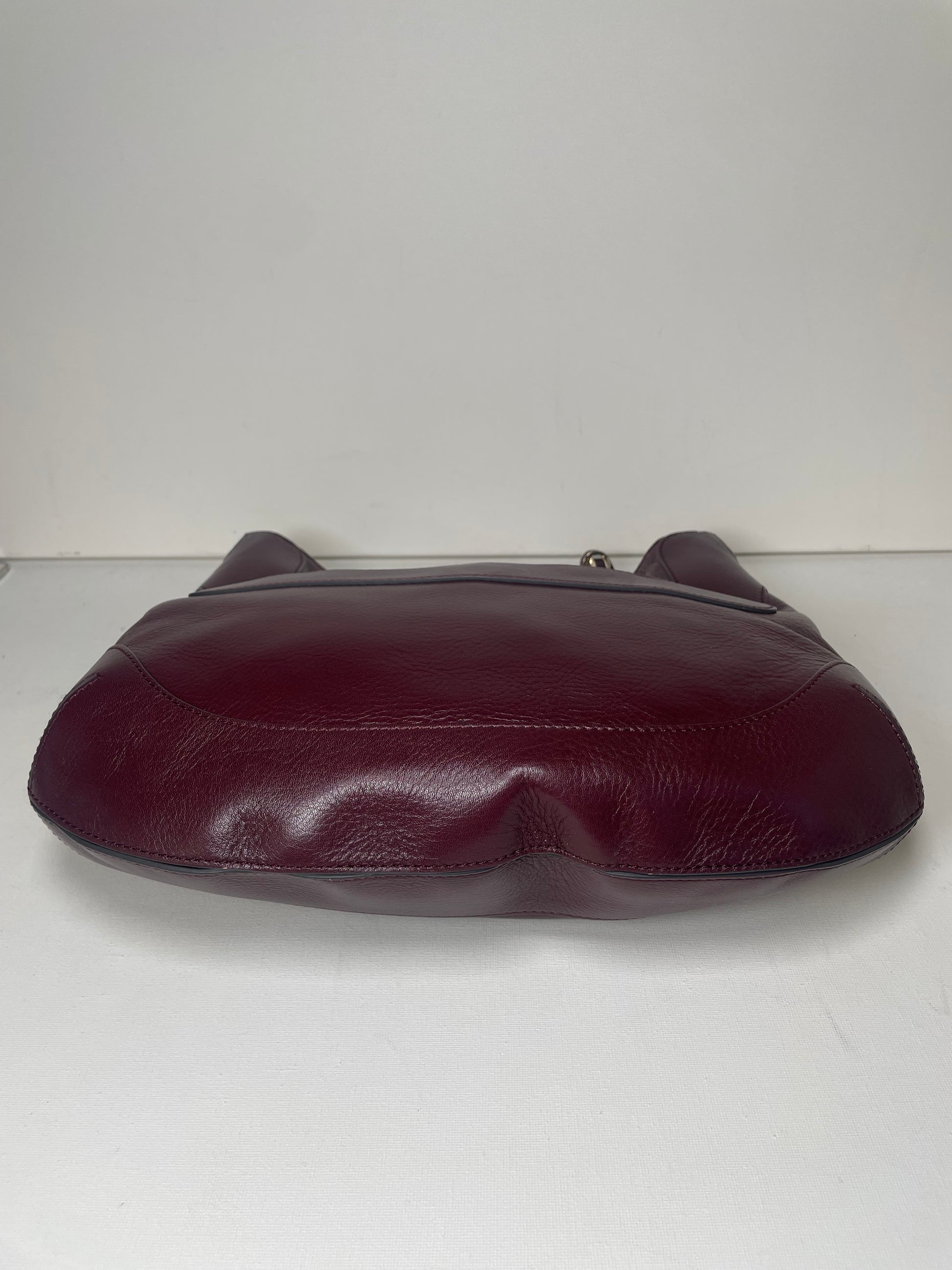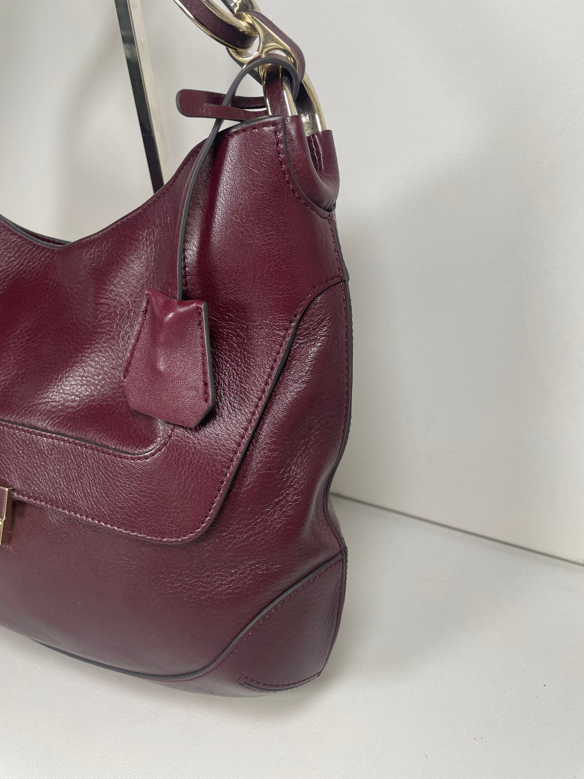 This is a robust and beautifully made Anya Hindmarch medium Berwick Hobo. This shoulder bag is made from glossy leather in a deep wine colour with light goldtone hardware. There is a front pocket that is opened with a push lock and the top main compartment is secured with magnetic closure. Inside there is a secure zip close pocket along with open slip pockets. The chain link carry strap is goldtone with leather detailing.