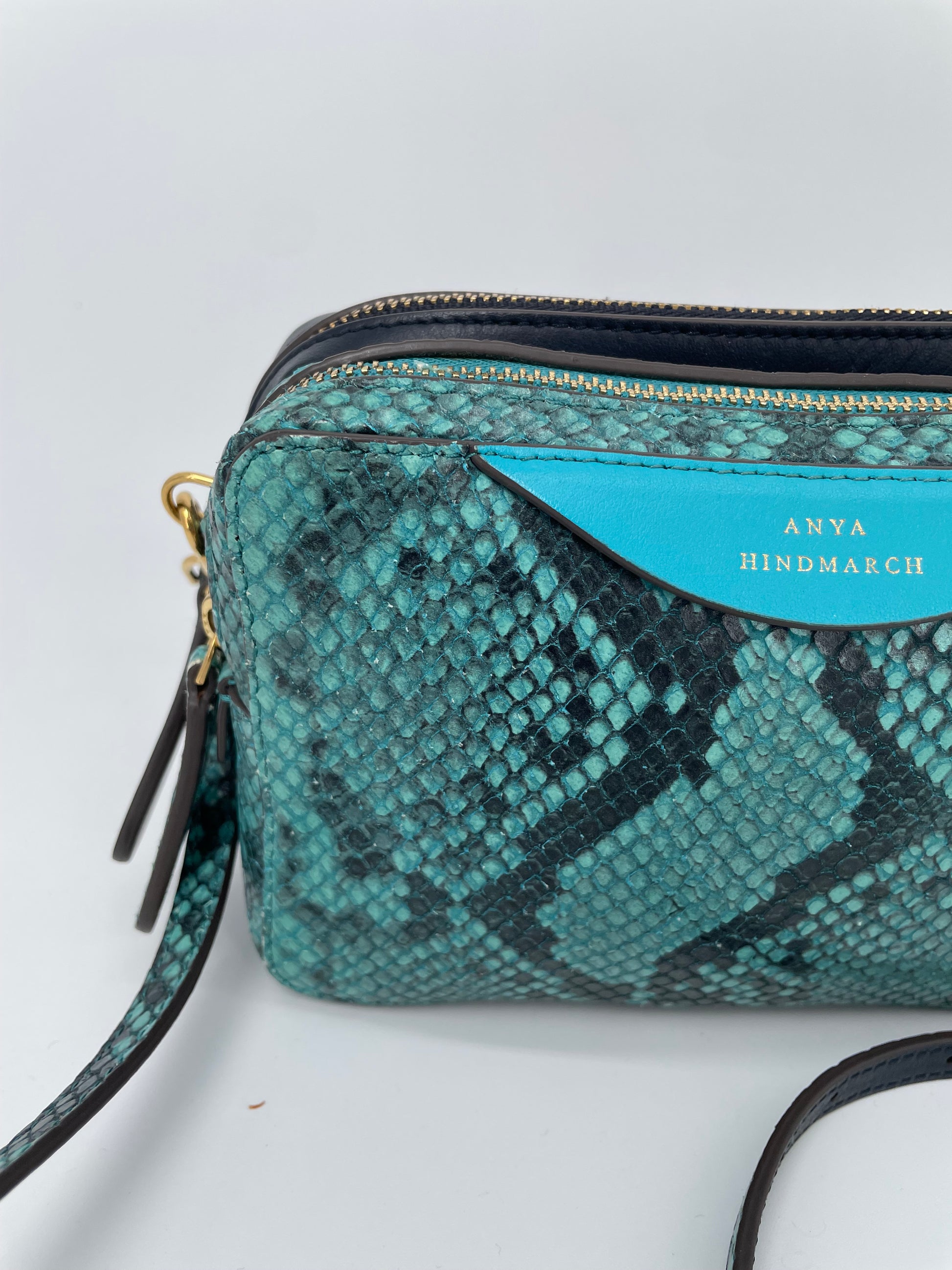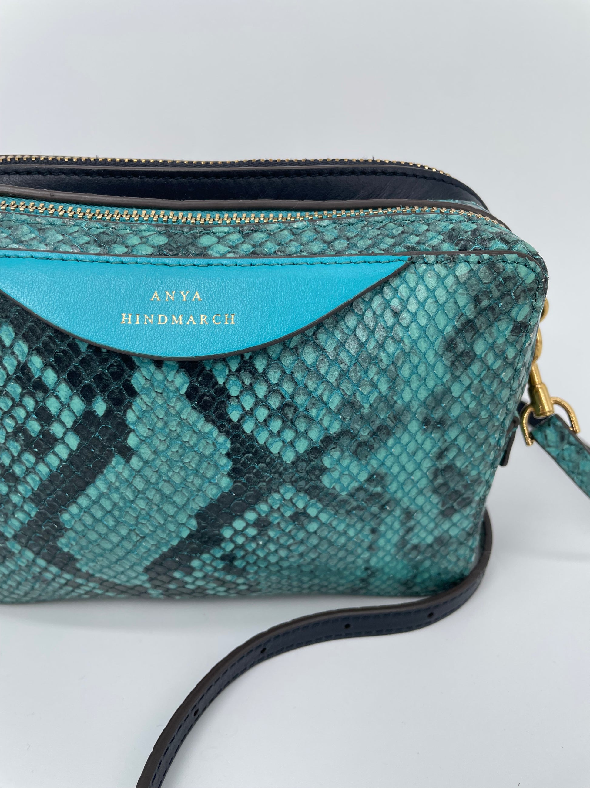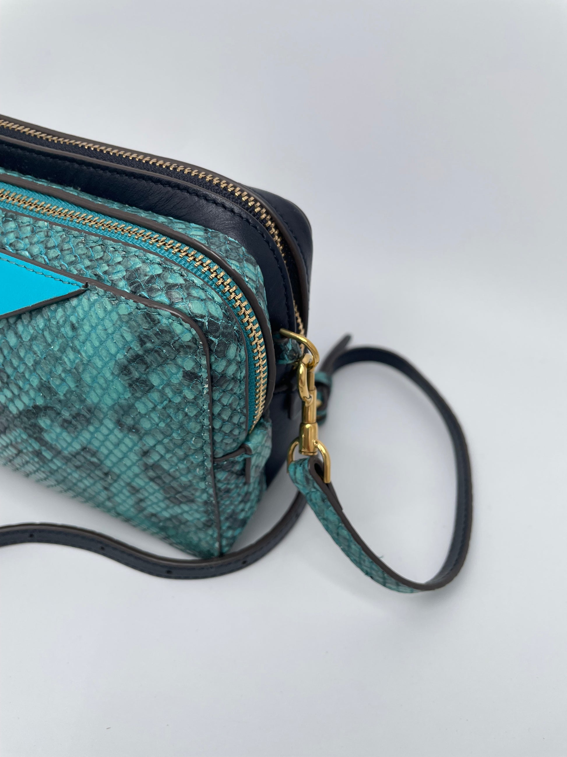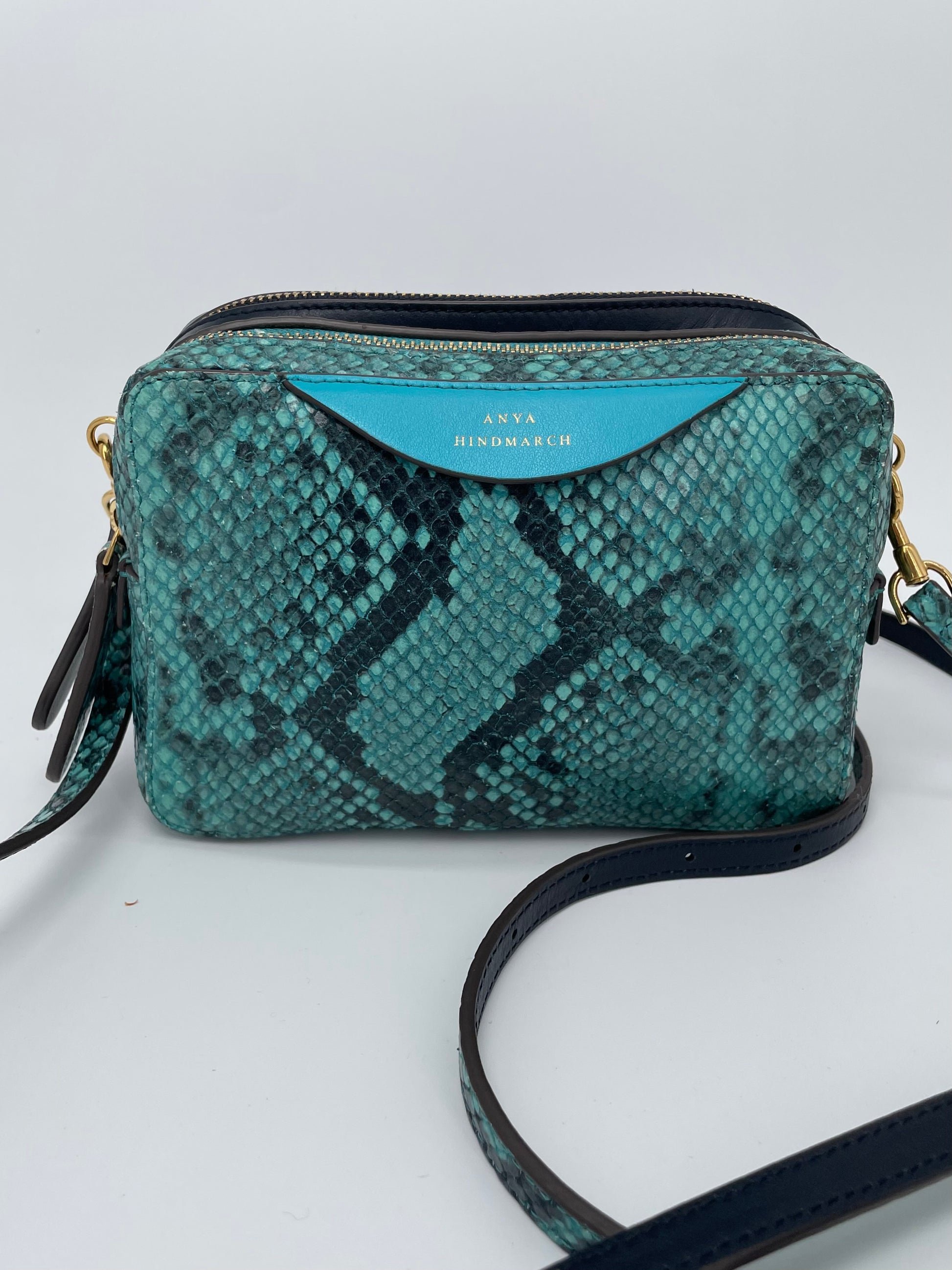 This is a lovely Anya Hindmarch small double zip Cross-Body bag With separate snake print pocket in turquoise and a smooth leather pocket in navy leather. Inside both sides have open slip pockets and credit card slip pockets. This light and compact cross-body bag can be worn two ways either as a clutch or with the crossbody strap.