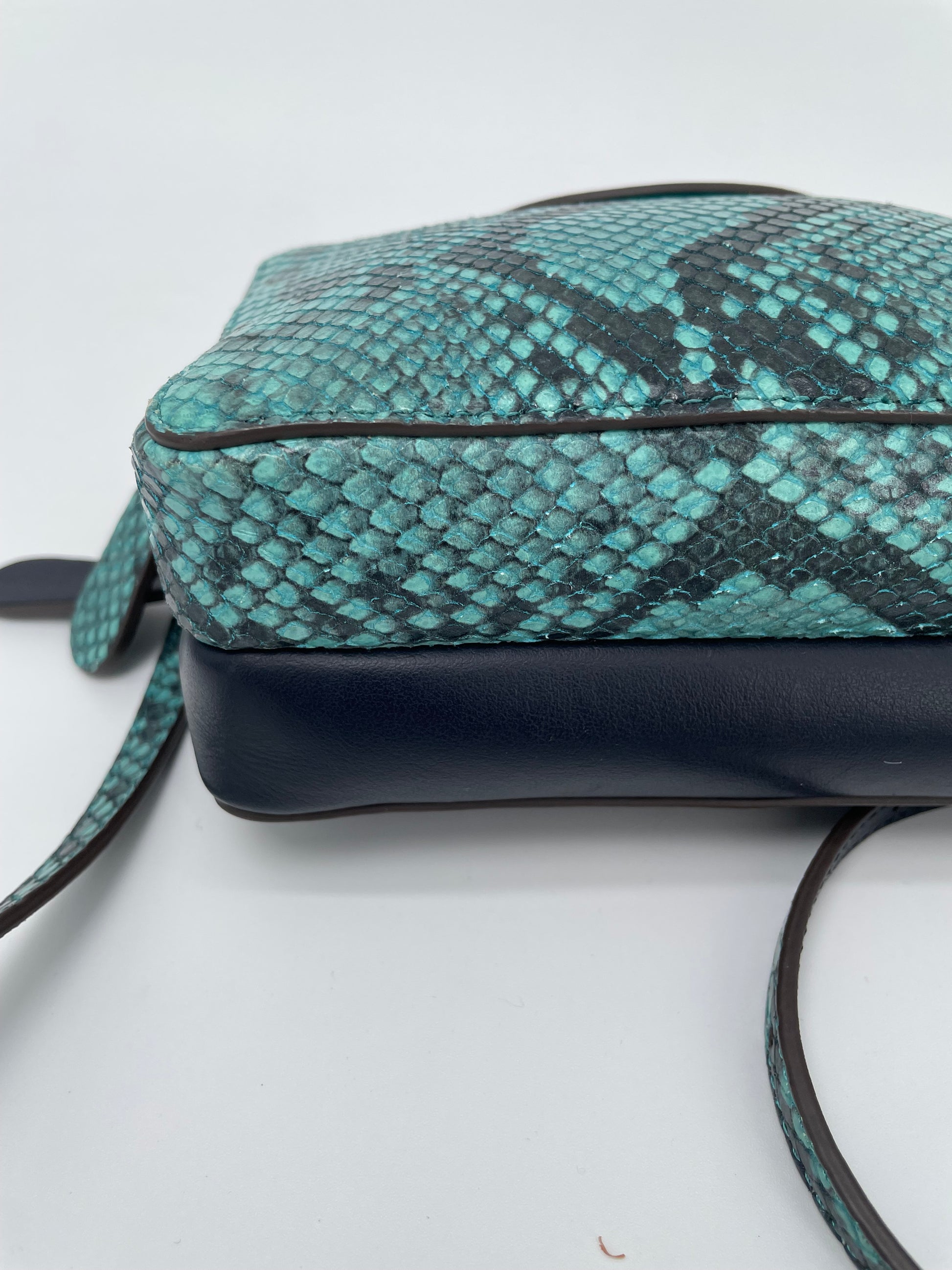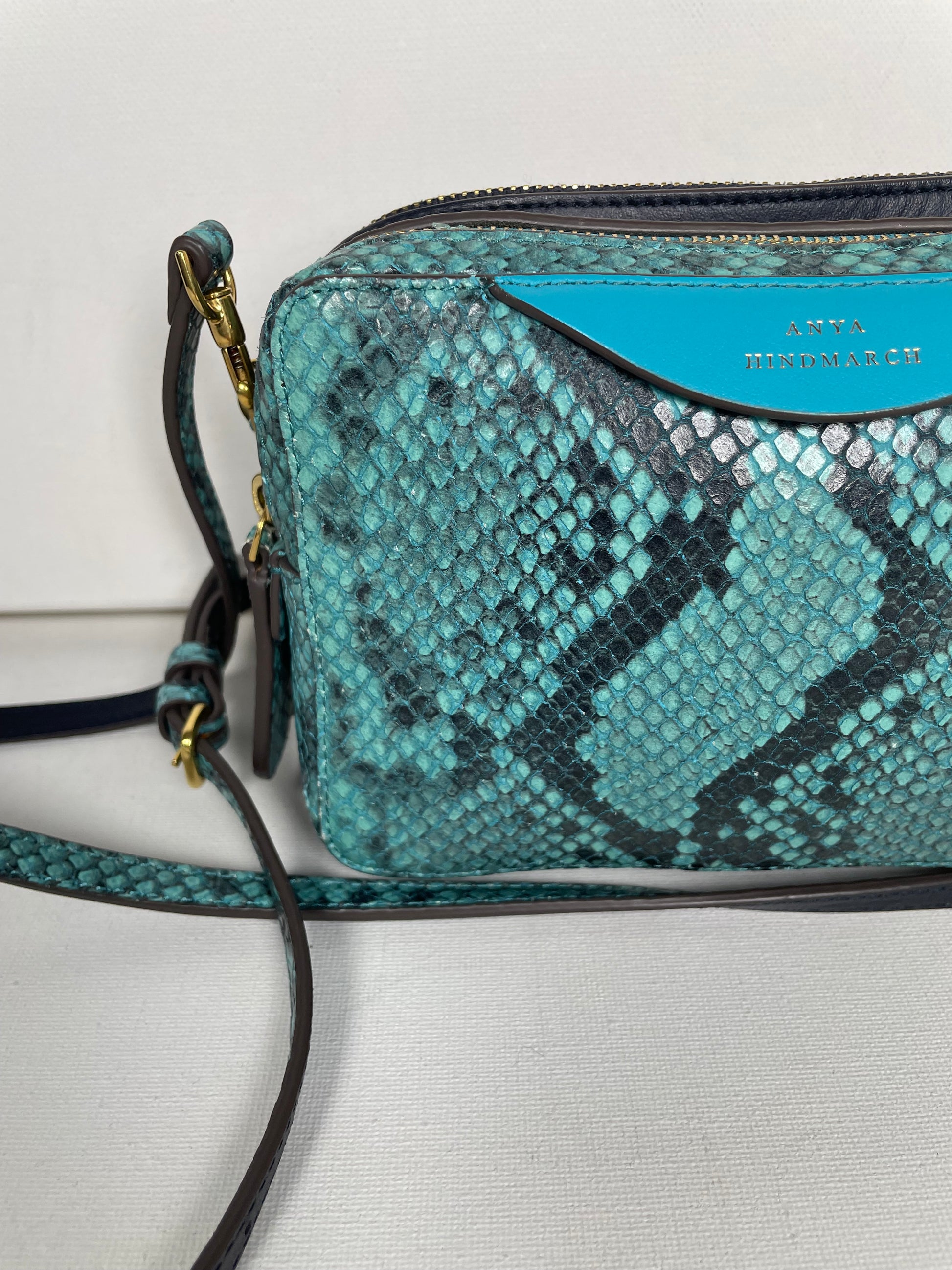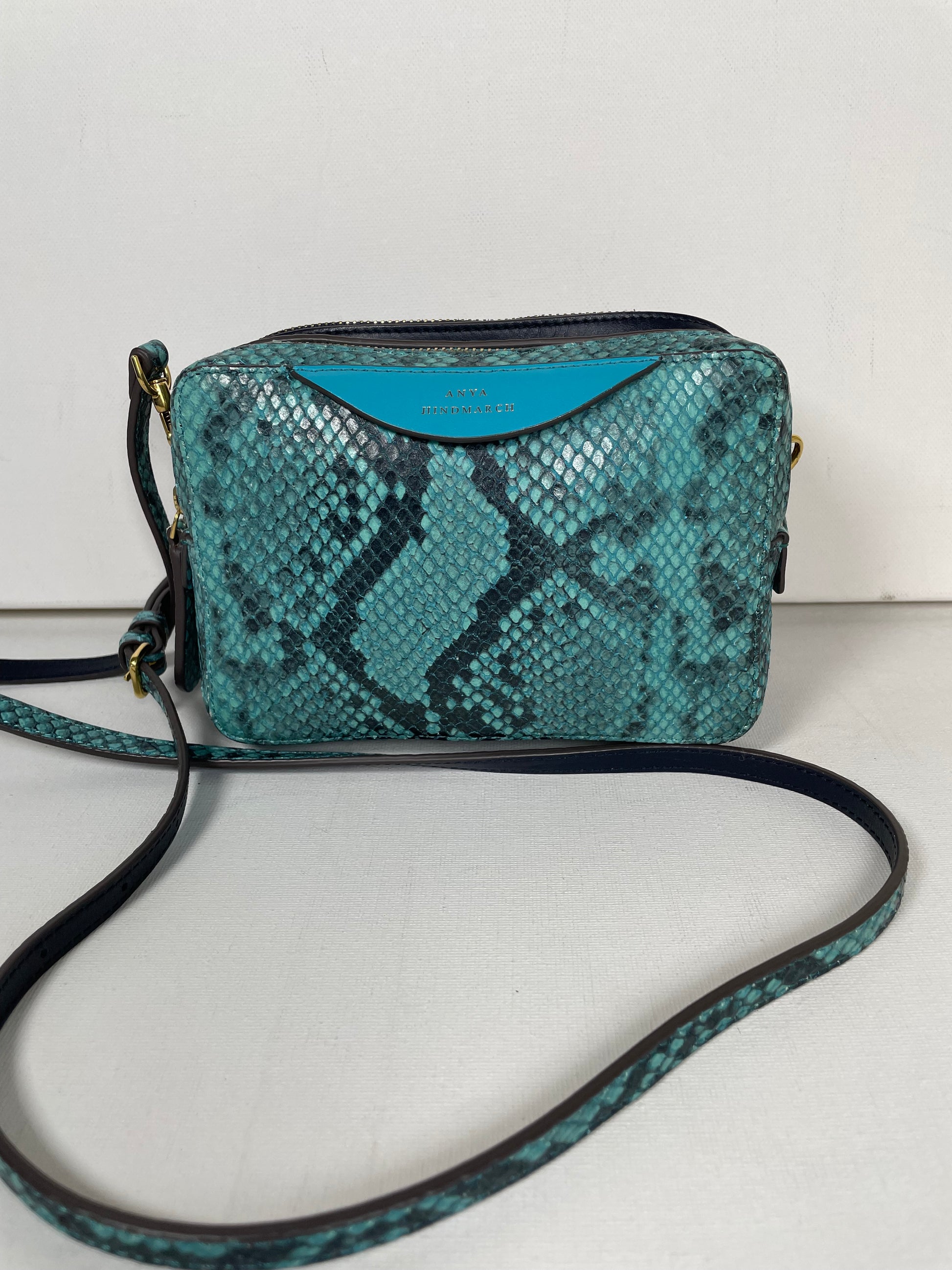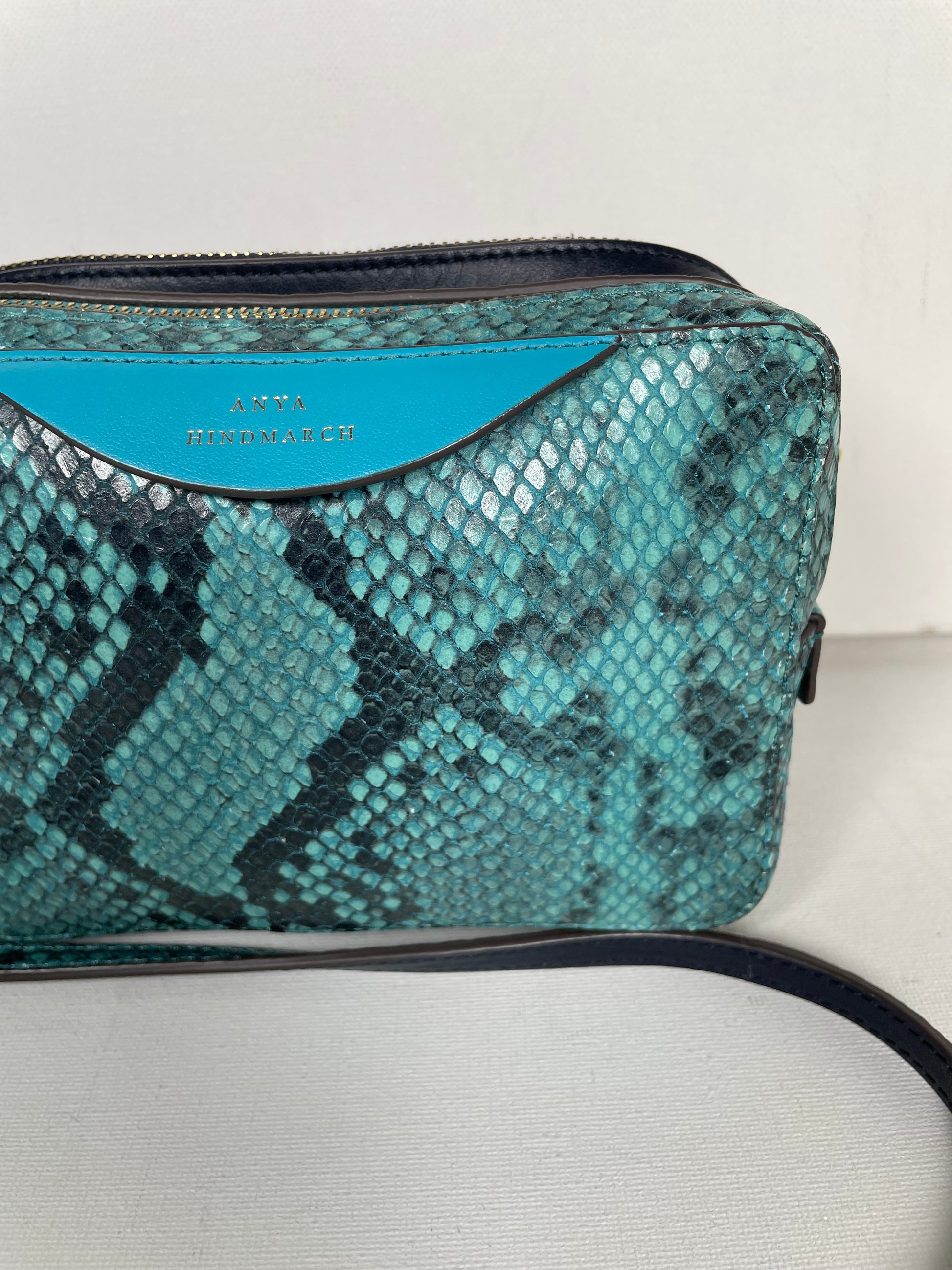 This is a lovely Anya Hindmarch small double zip Cross-Body bag With separate snake print pocket in turquoise and a smooth leather pocket in navy leather. Inside both sides have open slip pockets and credit card slip pockets. This light and compact cross-body bag can be worn two ways either as a clutch or with the crossbody strap.