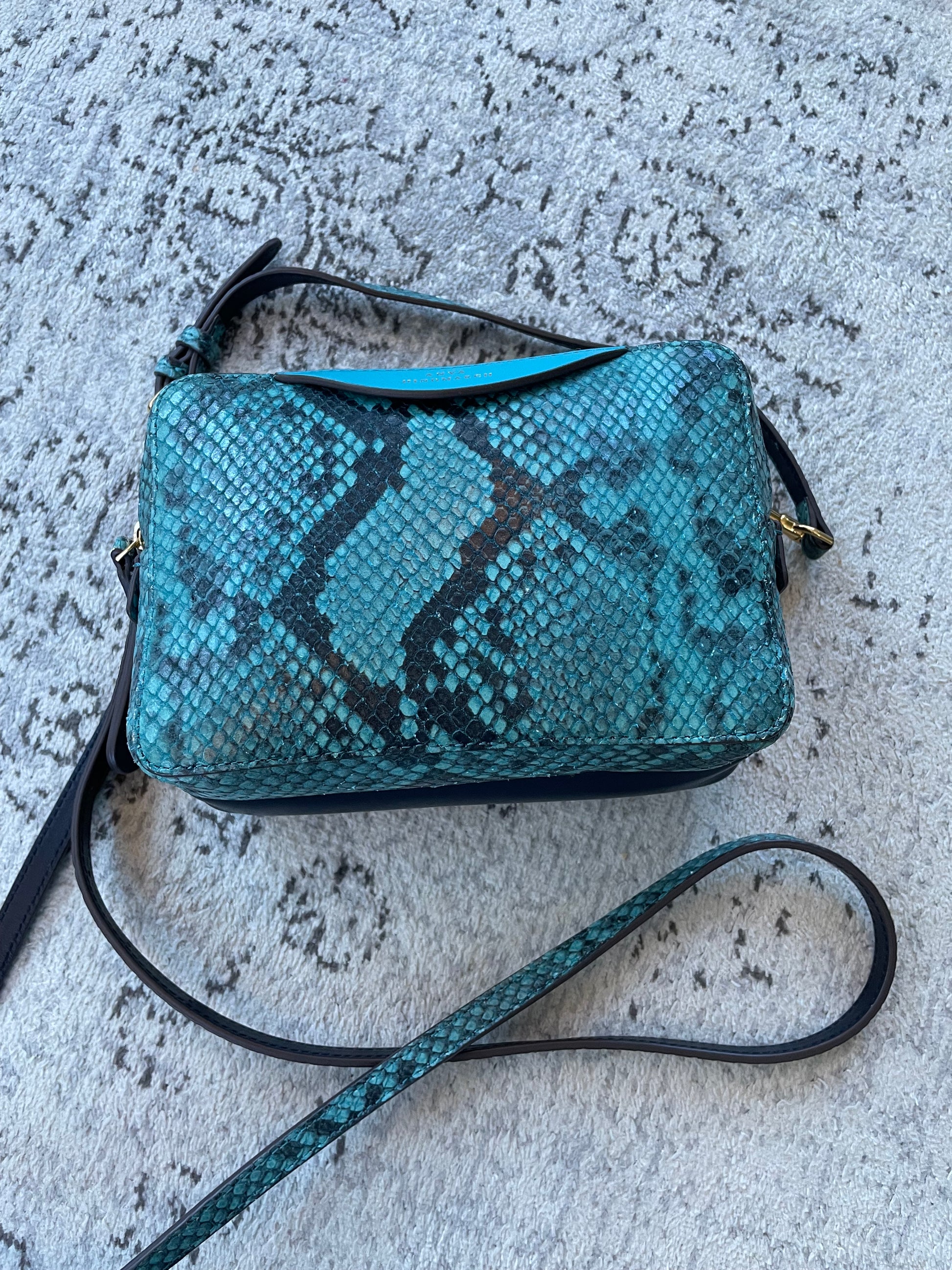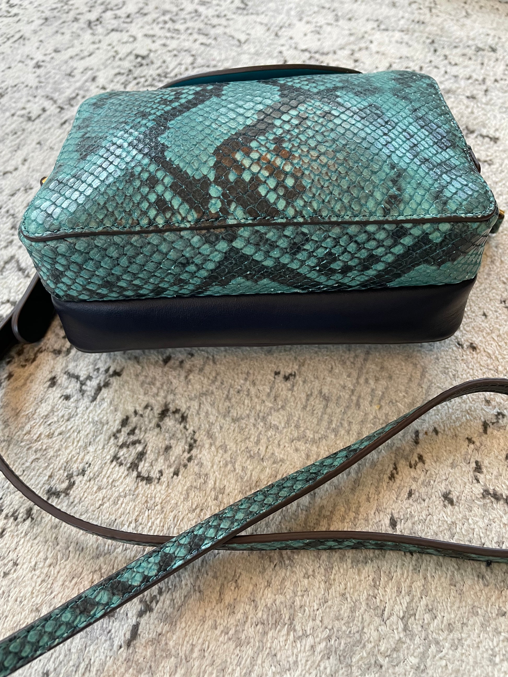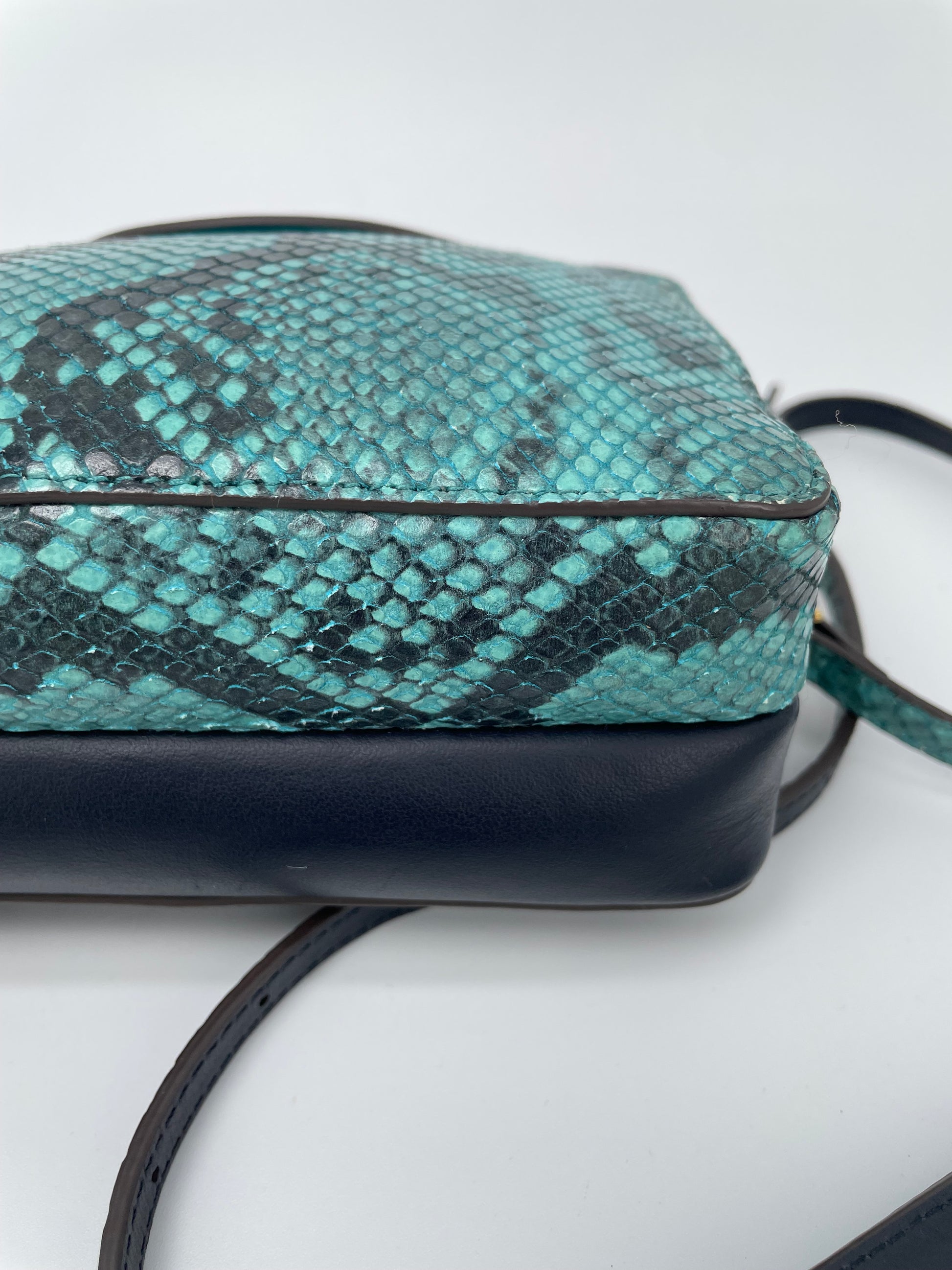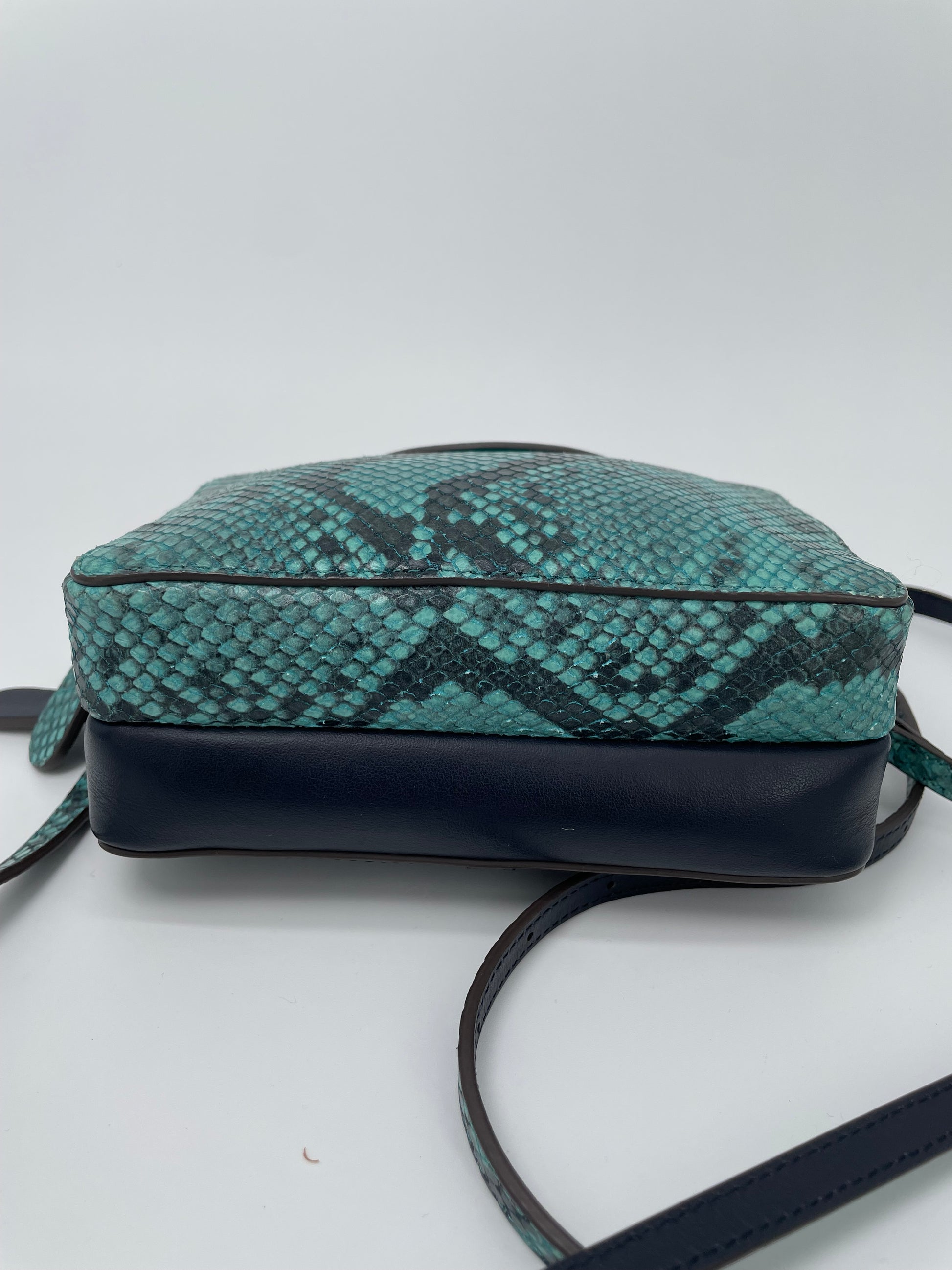 This is a lovely Anya Hindmarch small double zip Cross-Body bag With separate snake print pocket in turquoise and a smooth leather pocket in navy leather. Inside both sides have open slip pockets and credit card slip pockets. This light and compact cross-body bag can be worn two ways either as a clutch or with the crossbody strap.