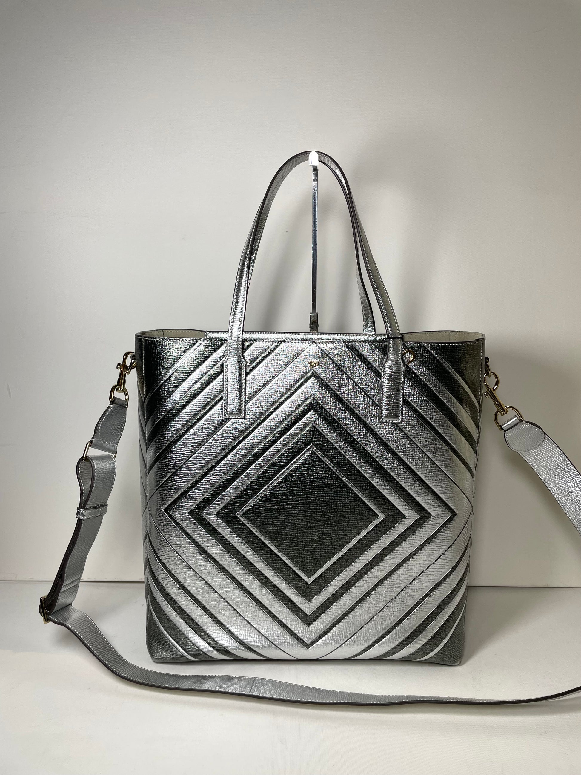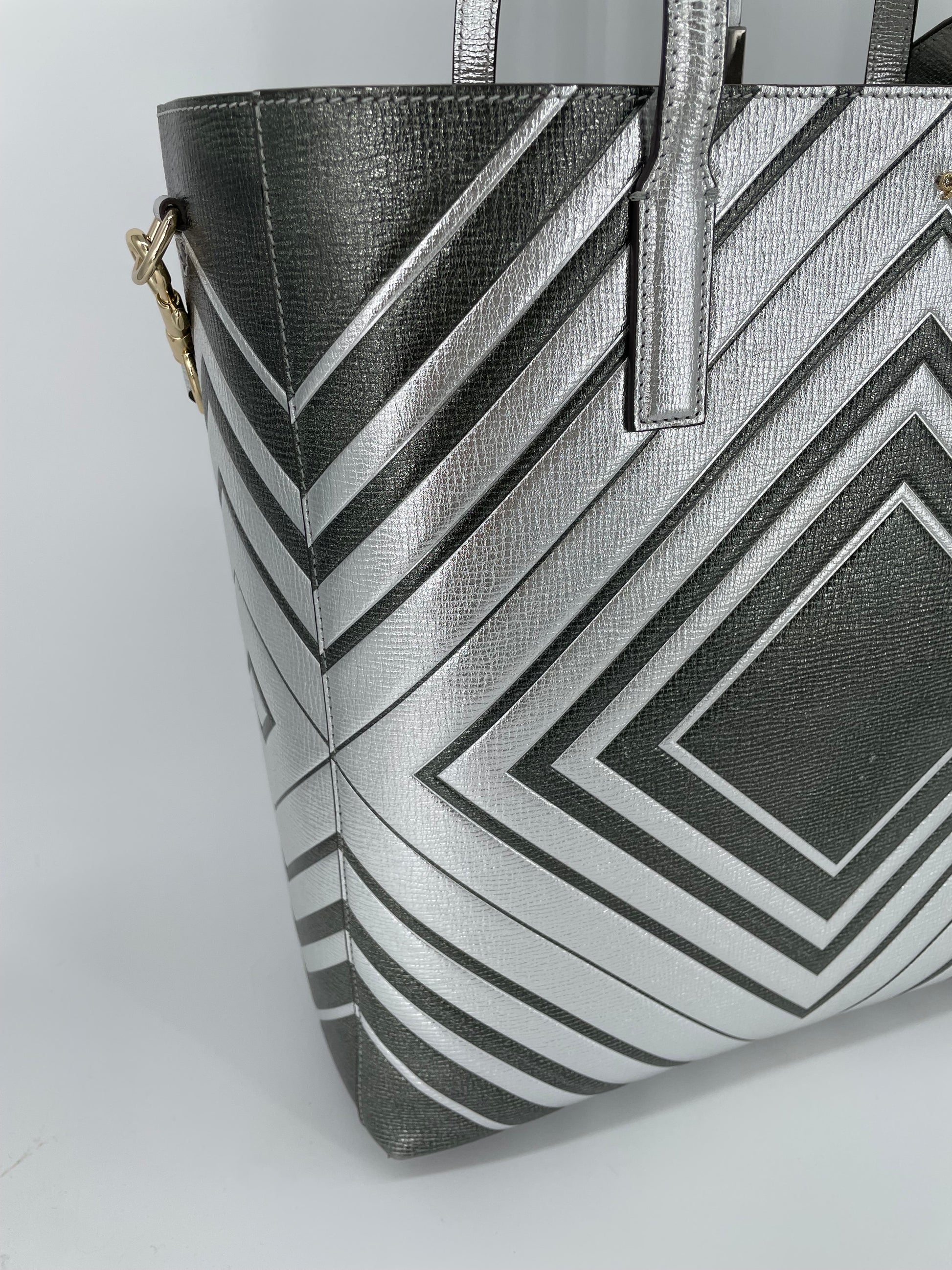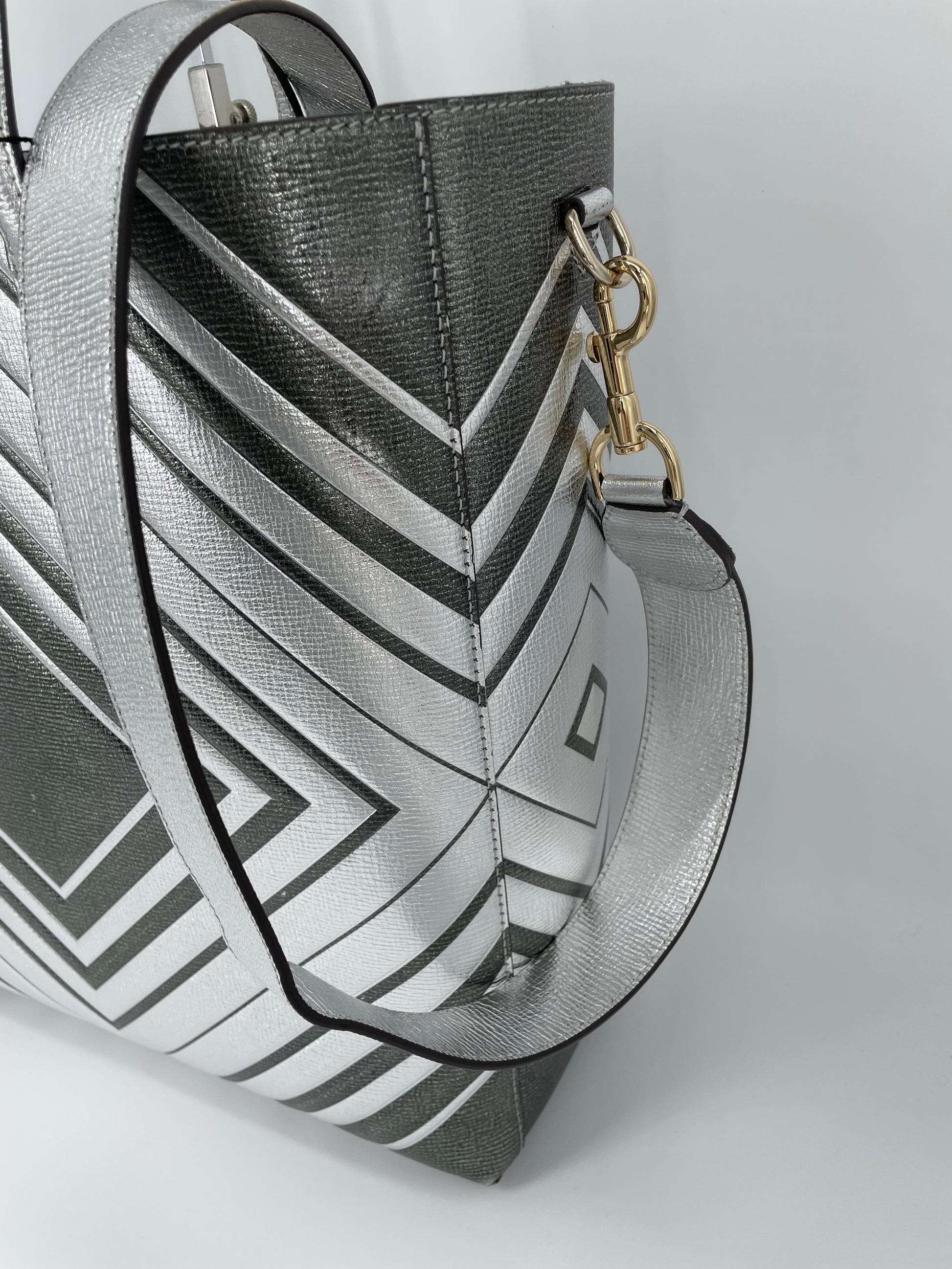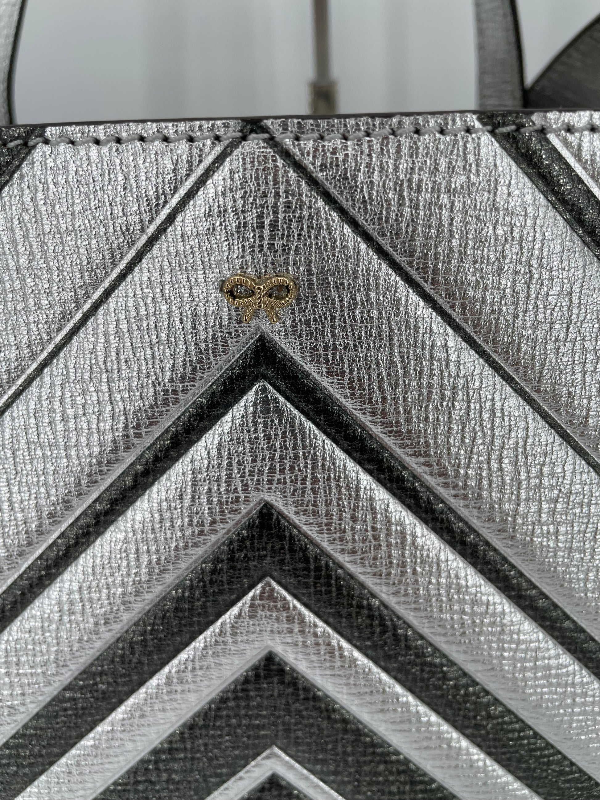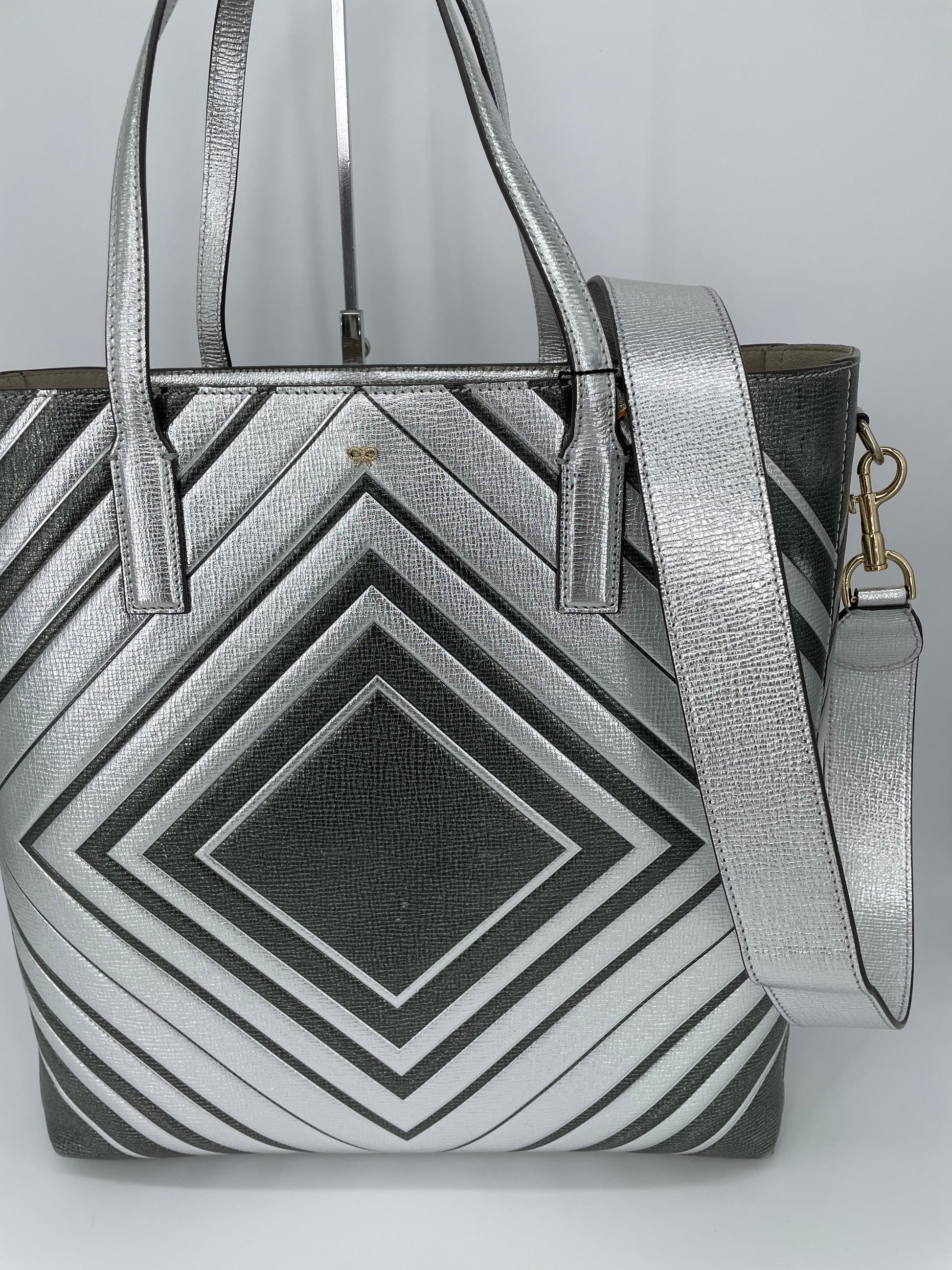 This is a beautiful Anya Hindmarch Ebury Tote bag in Silver Geometric print. One internal pocket, hooks to attach a long strap. Tie close to top. Very spacious, eye catching tote .